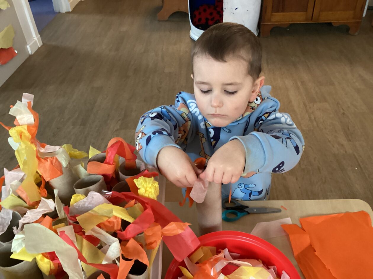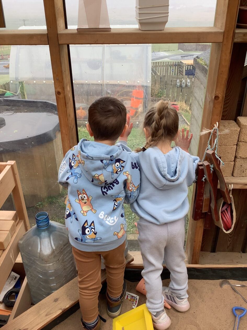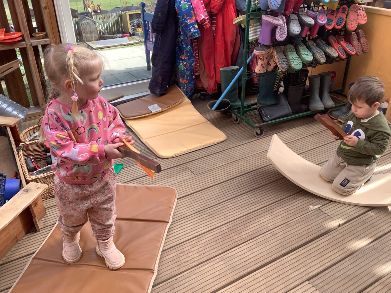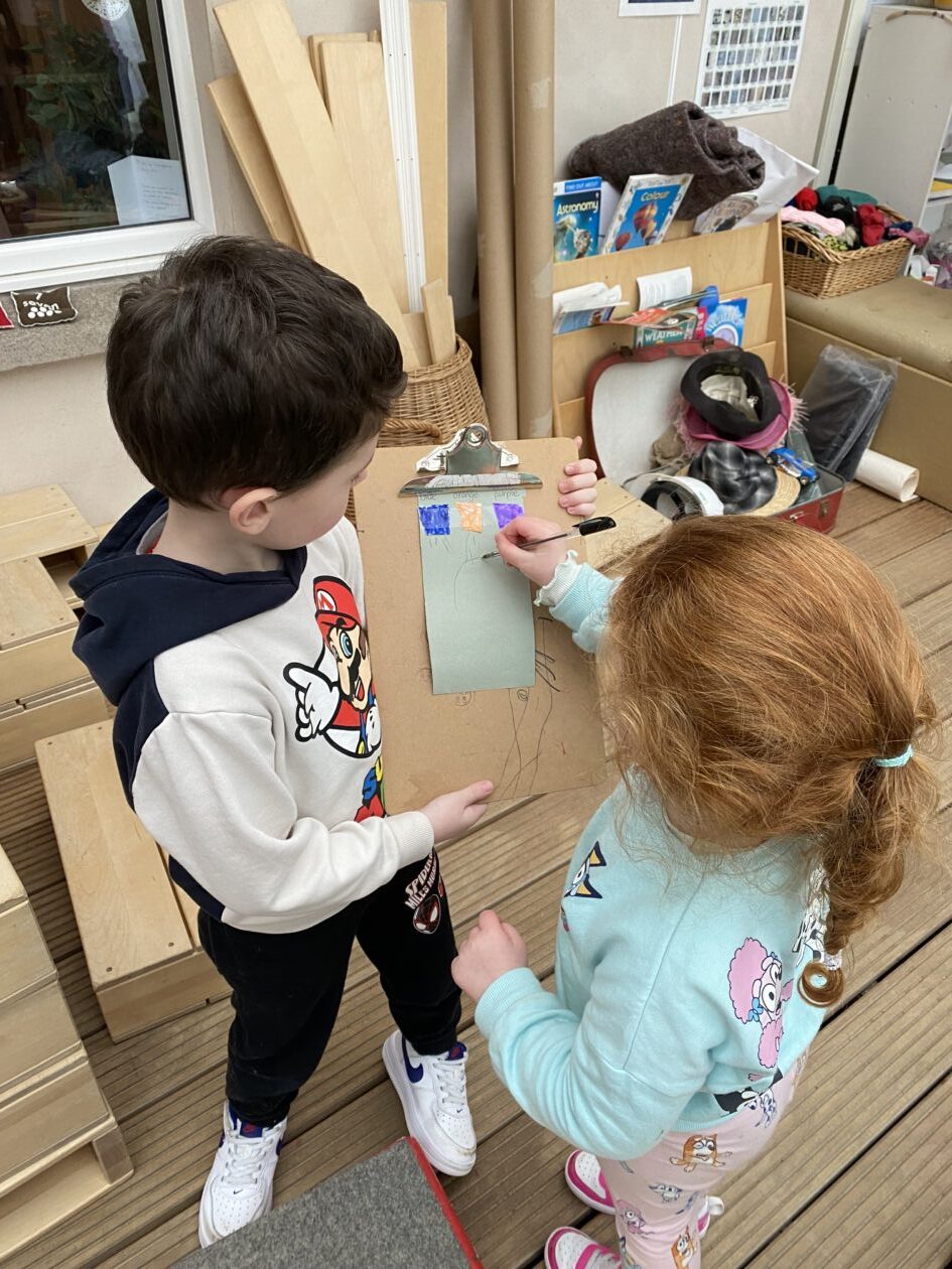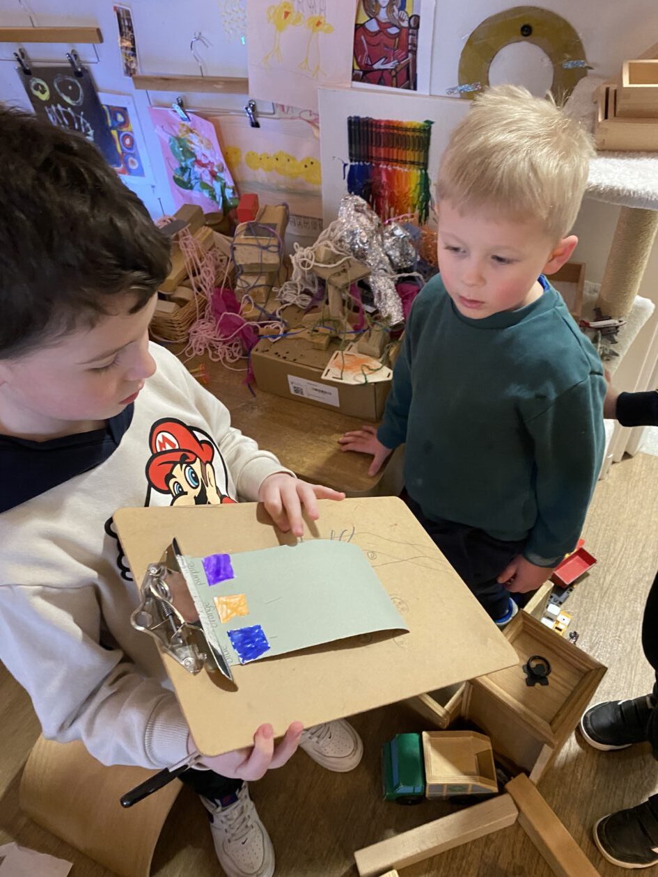 The outdoor room is always a popular choice and a great place to observe schemas (a repeated action used to explore and test theories in play). The bairns have used positioning, transporting, trajectory, enveloping, rotation and enclosure schemas in their play this week. They made paper aeroplanes and then built a platform to launch their planes from, watching how far they flew. They have also been engaged in imaginative play using the large hollow blocks and cable drums as fishing boats. “He is da een dat goes in da water. He is da fishing een and I’m da Captain.”