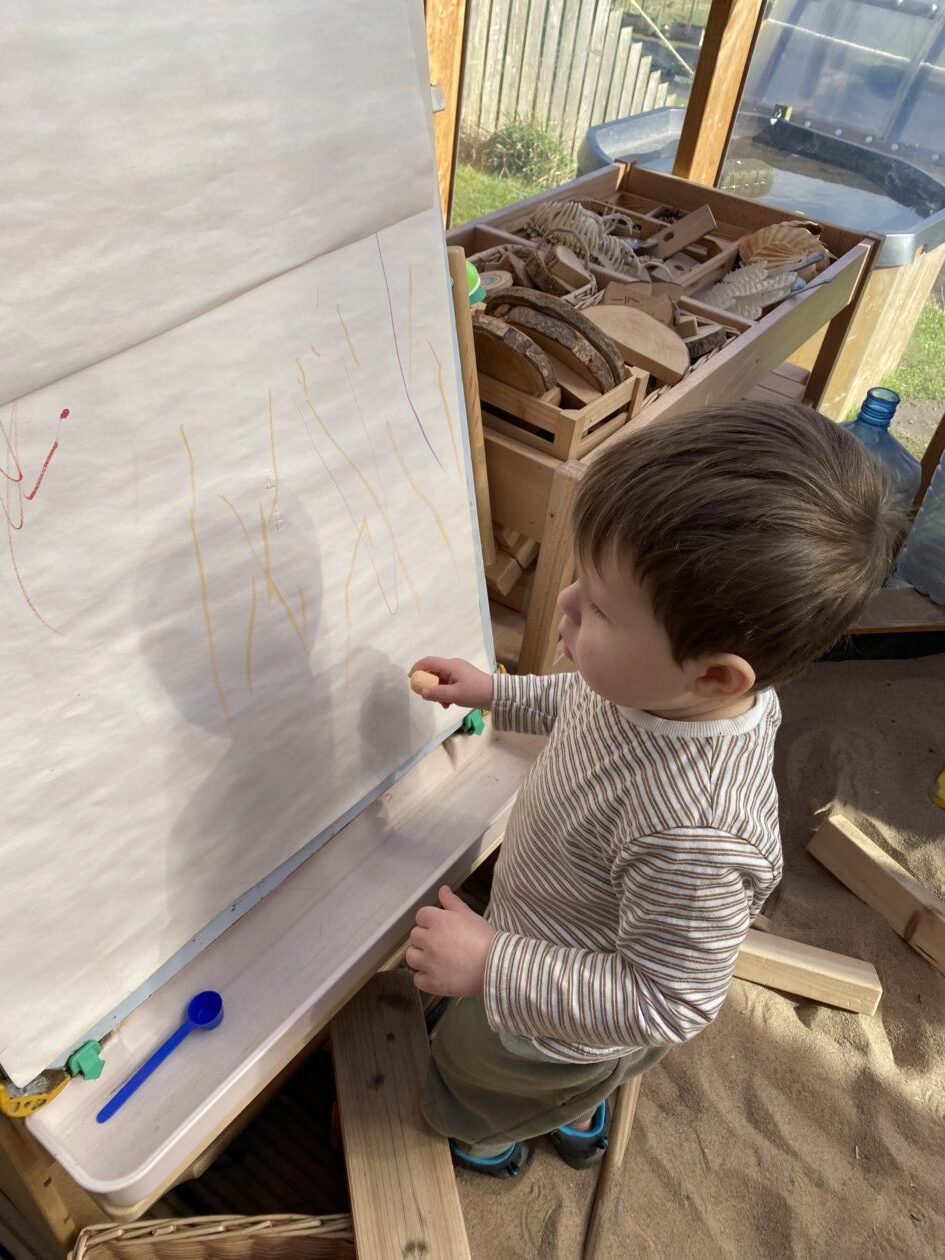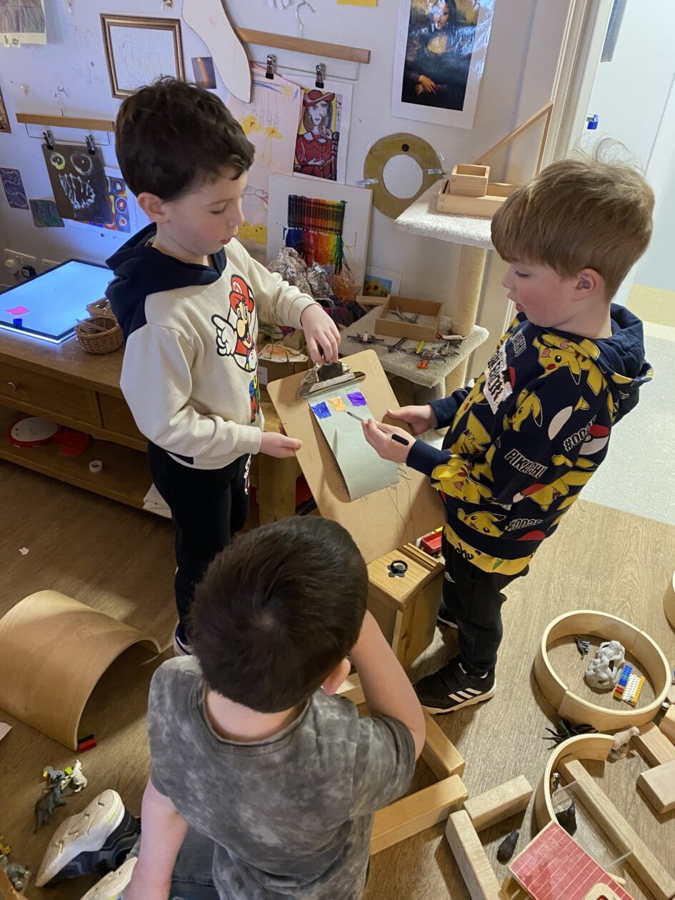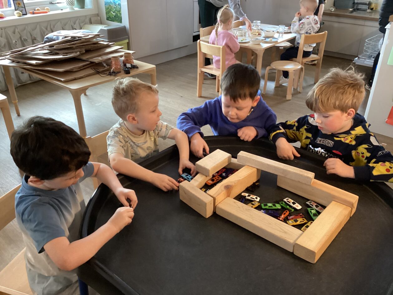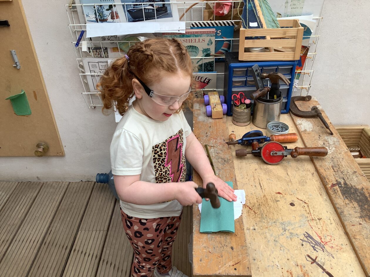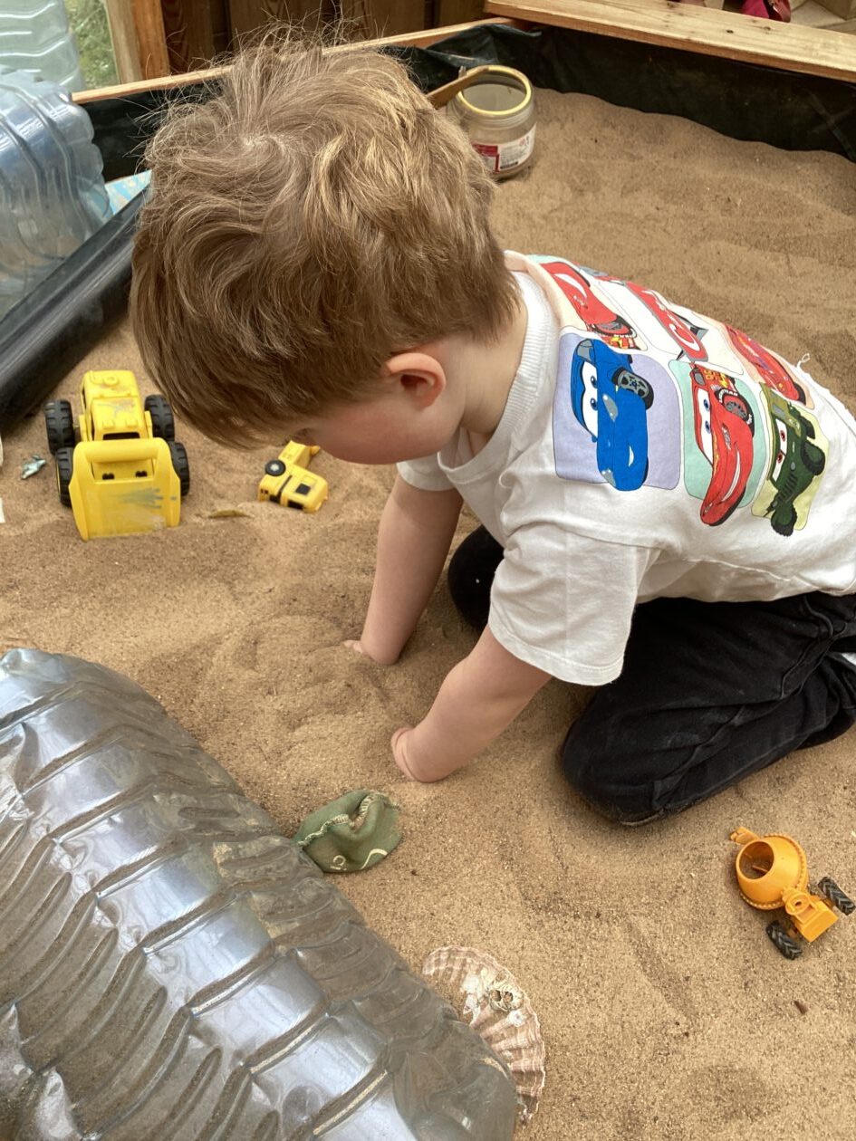 The outdoor room is always a popular choice and a great place to observe schemas (a repeated action used to explore and test theories in play). The bairns have used positioning, transporting, trajectory, enveloping, rotation and enclosure schemas in their play this week. They made paper aeroplanes and then built a platform to launch their planes from, watching how far they flew. They have also been engaged in imaginative play using the large hollow blocks and cable drums as fishing boats. “He is da een dat goes in da water. He is da fishing een and I’m da Captain.”