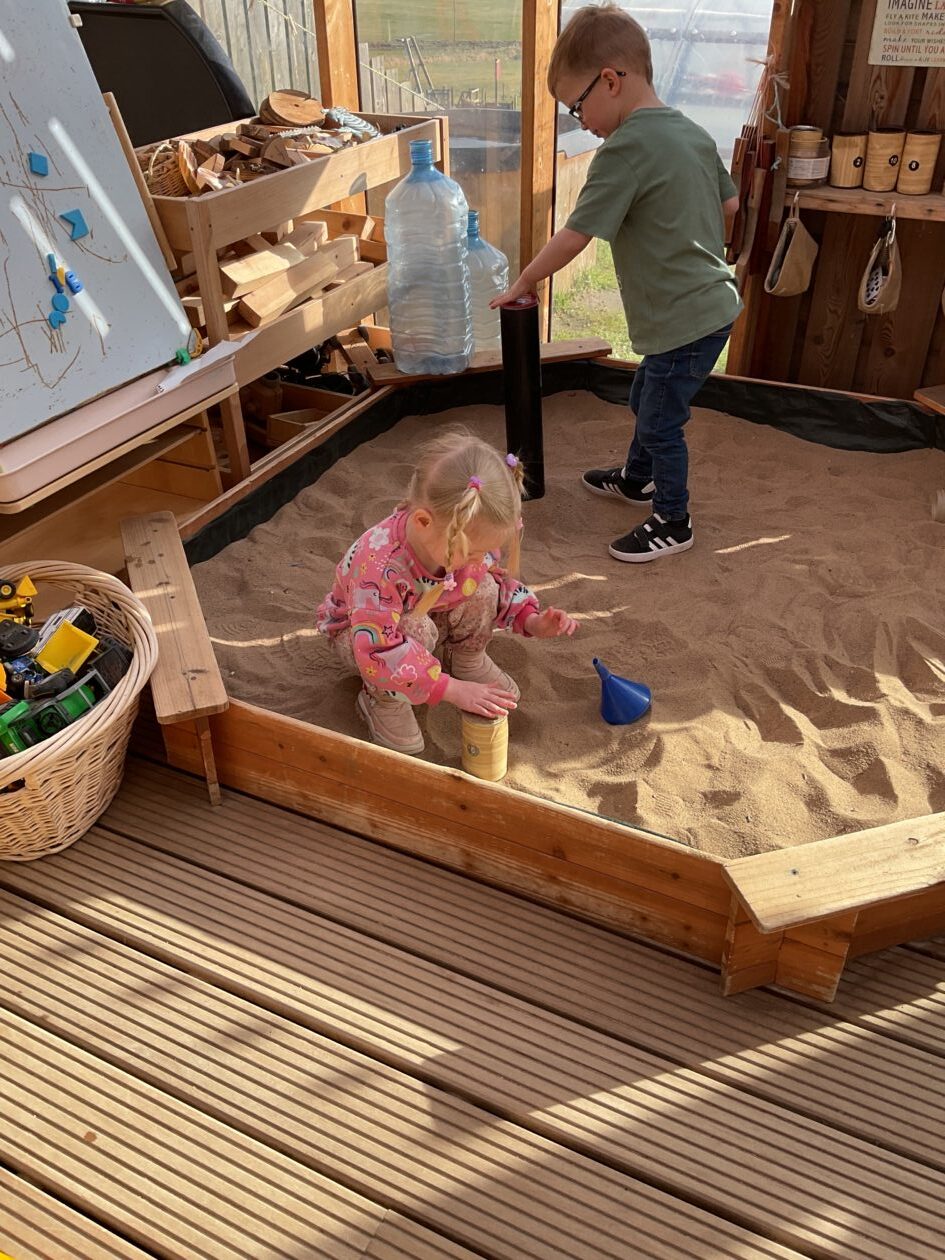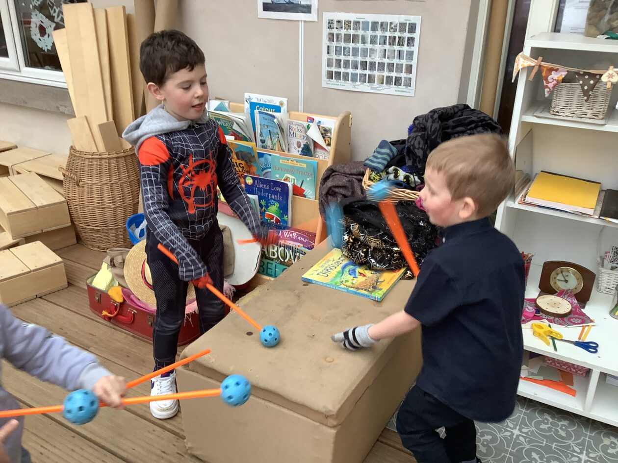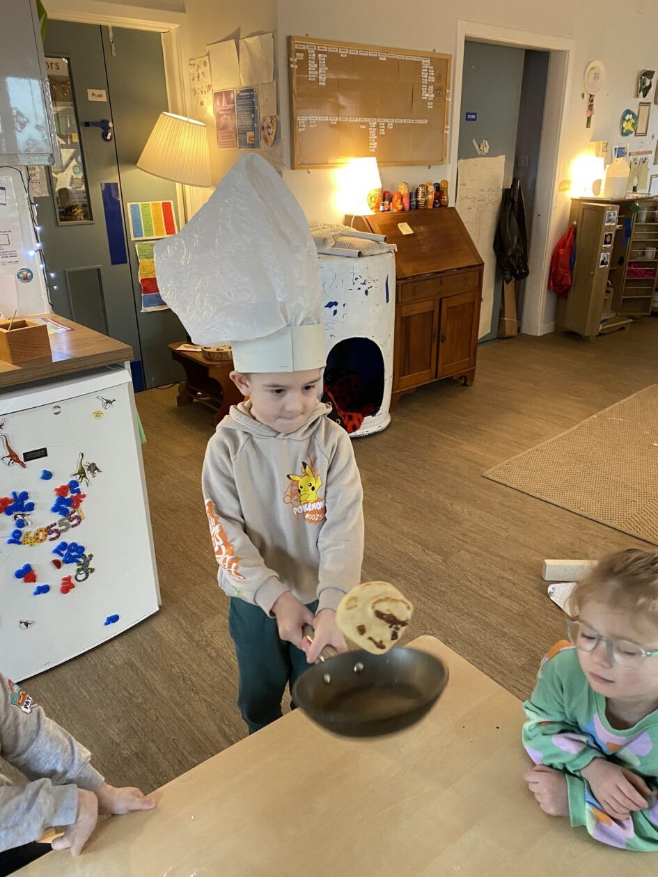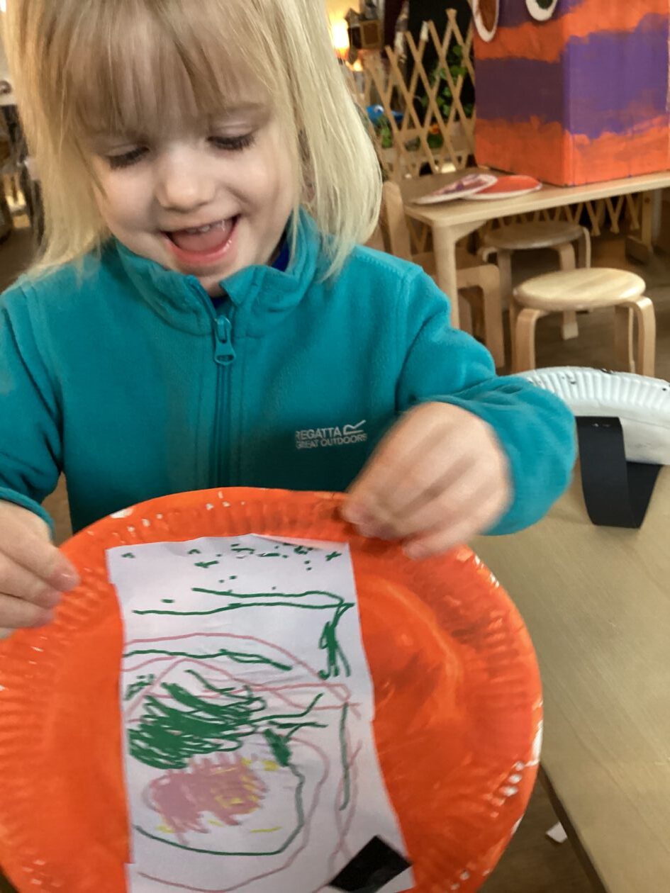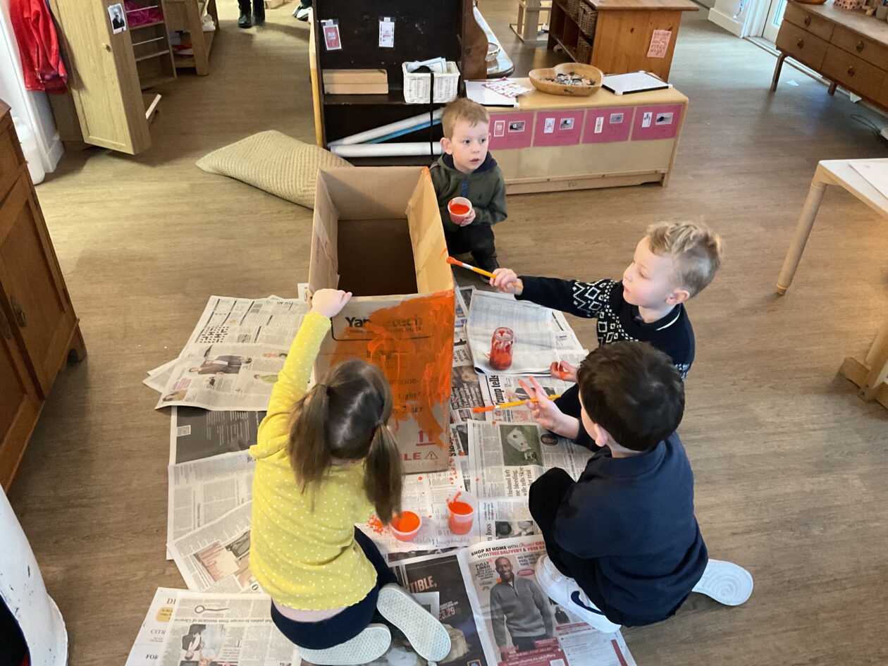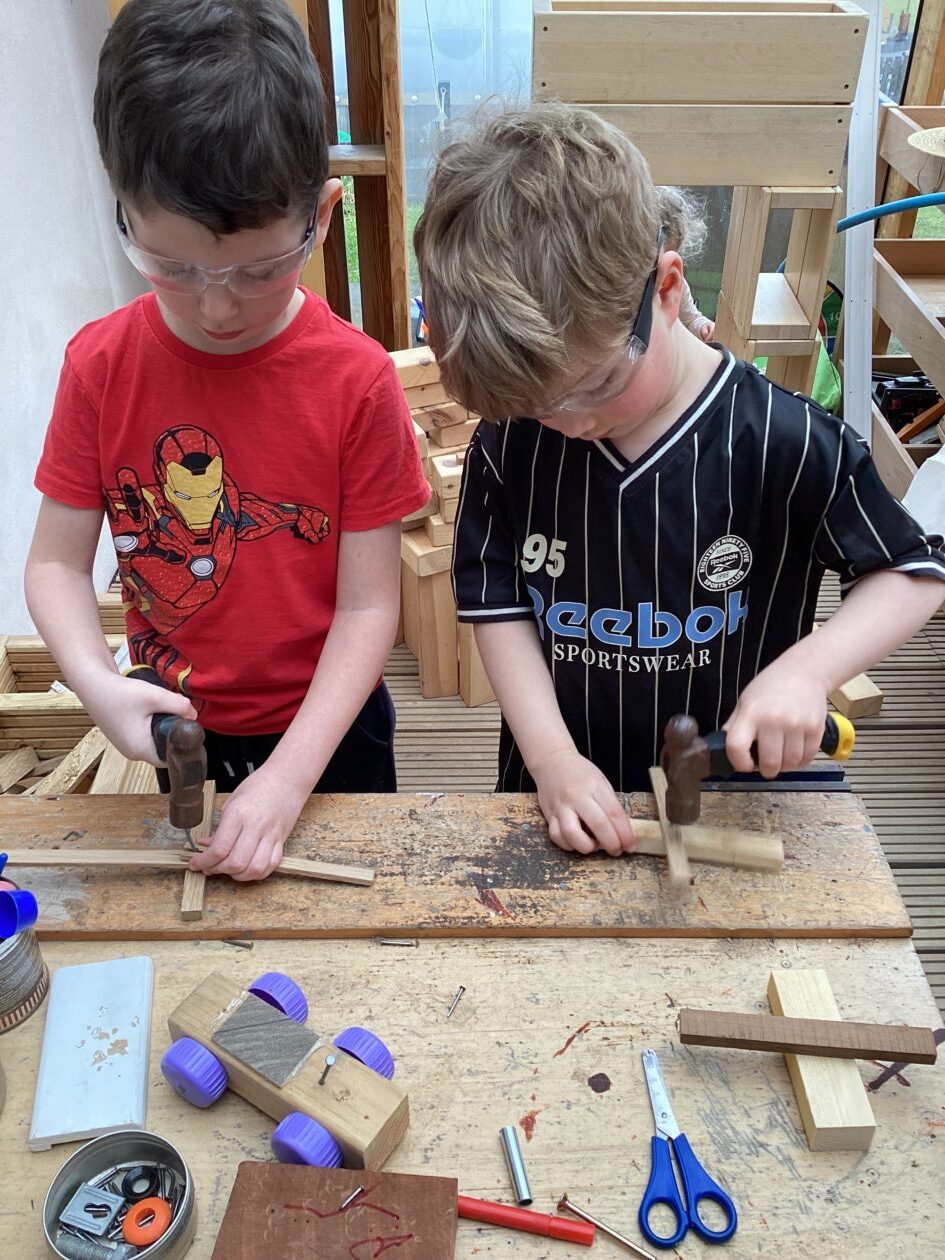 The outdoor room is always a popular choice and a great place to observe schemas (a repeated action used to explore and test theories in play). The bairns have used positioning, transporting, trajectory, enveloping, rotation and enclosure schemas in their play this week. They made paper aeroplanes and then built a platform to launch their planes from, watching how far they flew. They have also been engaged in imaginative play using the large hollow blocks and cable drums as fishing boats. “He is da een dat goes in da water. He is da fishing een and I’m da Captain.”