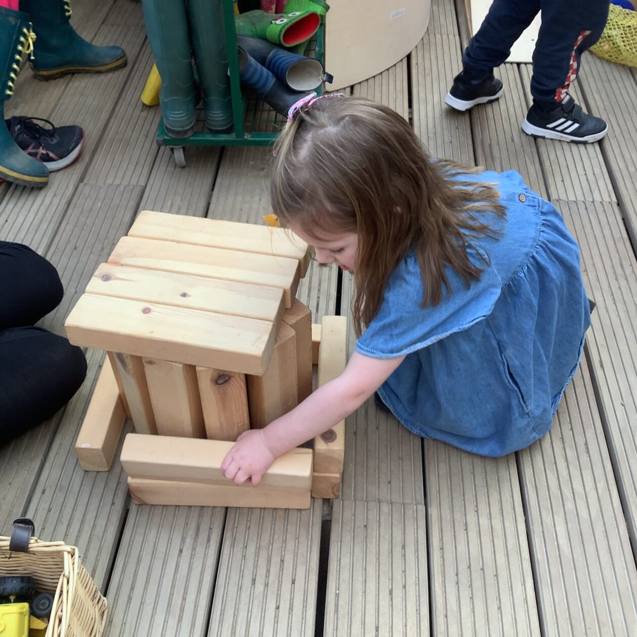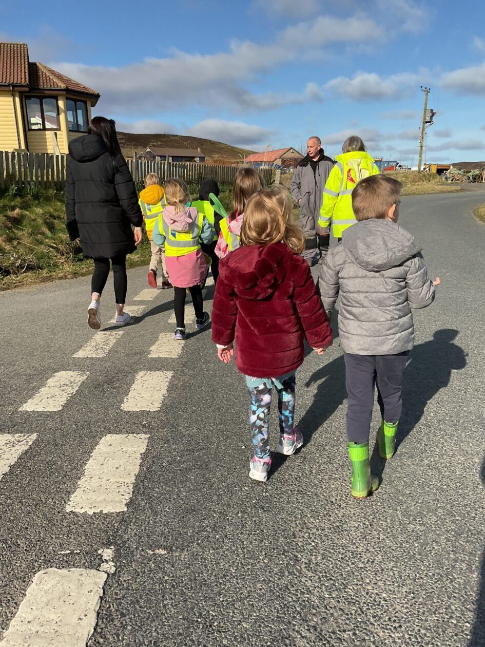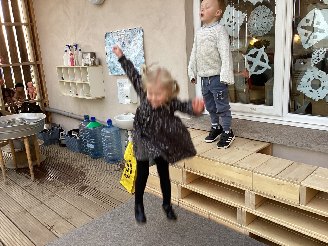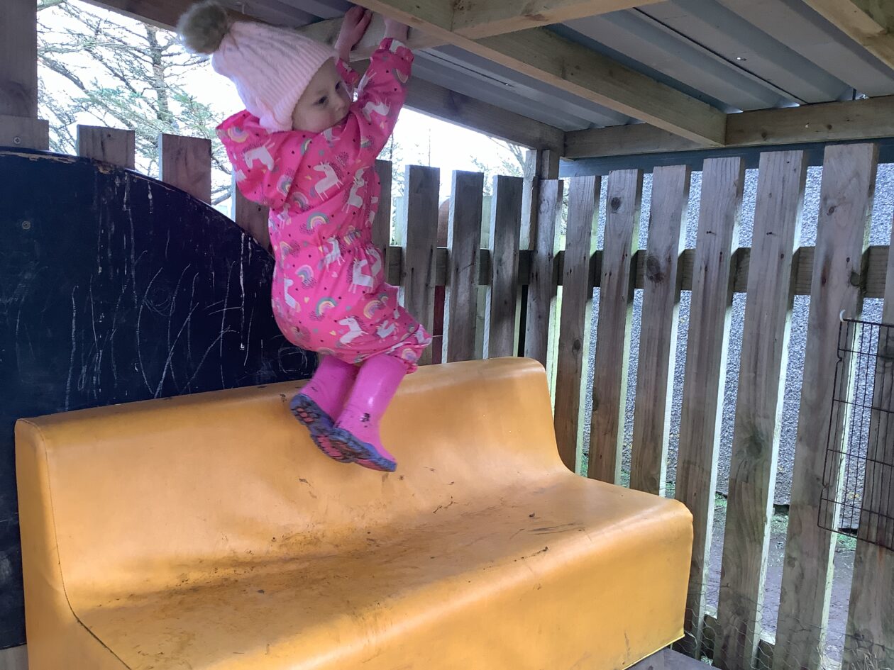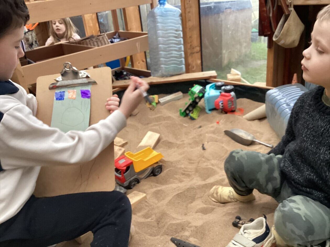 The outdoor room is always a popular choice and a great place to observe schemas (a repeated action used to explore and test theories in play). The bairns have used positioning, transporting, trajectory, enveloping, rotation and enclosure schemas in their play this week. They made paper aeroplanes and then built a platform to launch their planes from, watching how far they flew. They have also been engaged in imaginative play using the large hollow blocks and cable drums as fishing boats. “He is da een dat goes in da water. He is da fishing een and I’m da Captain.”
