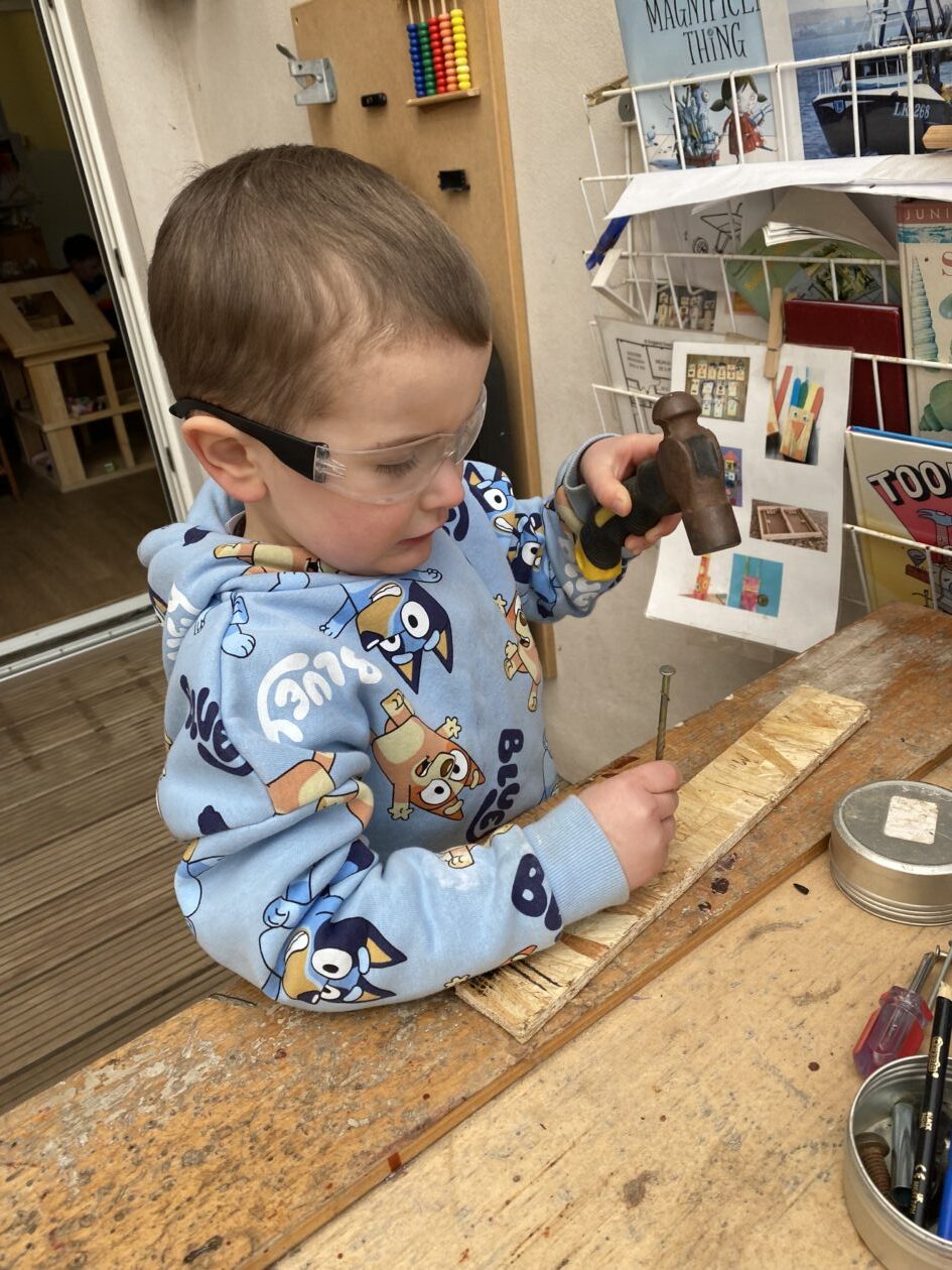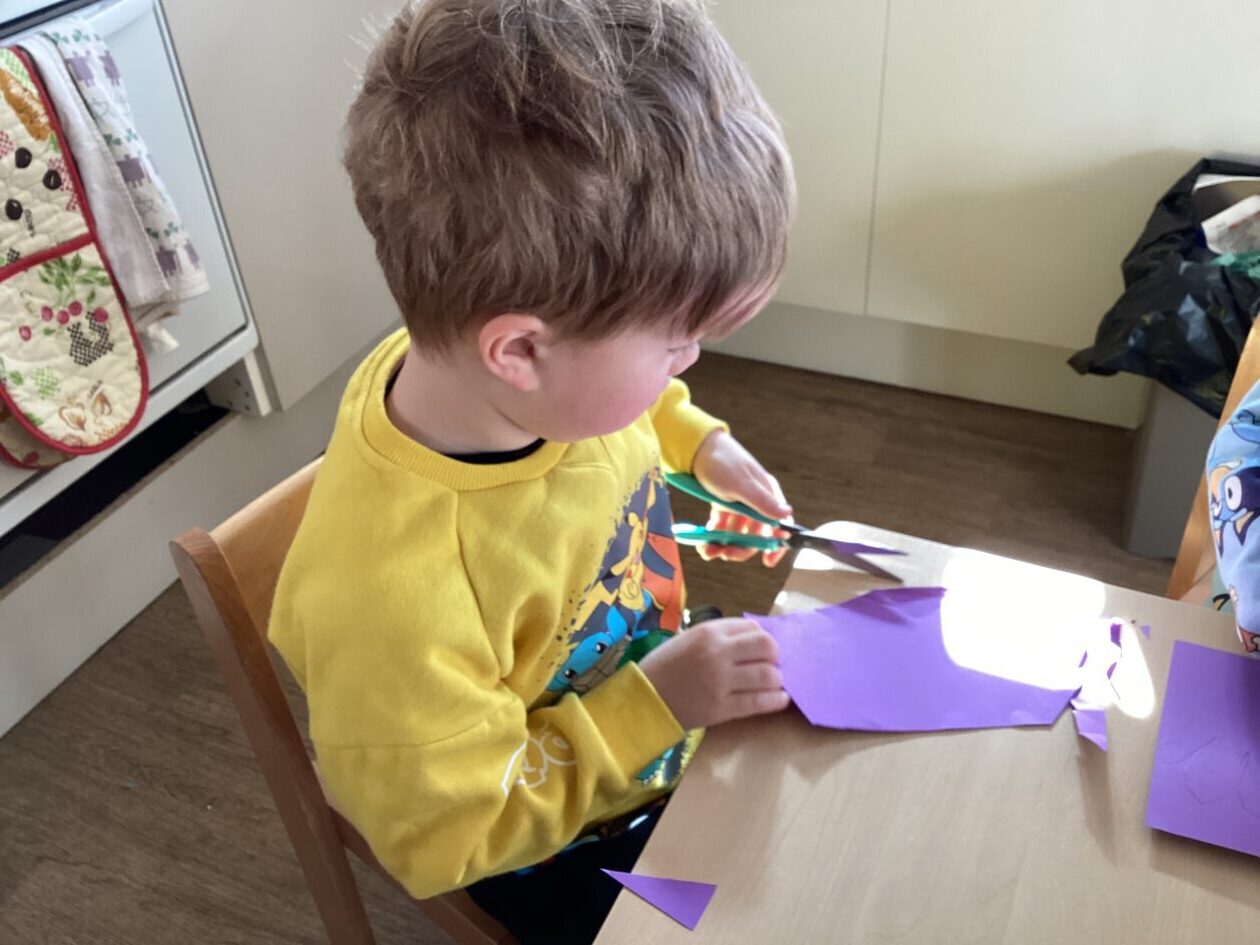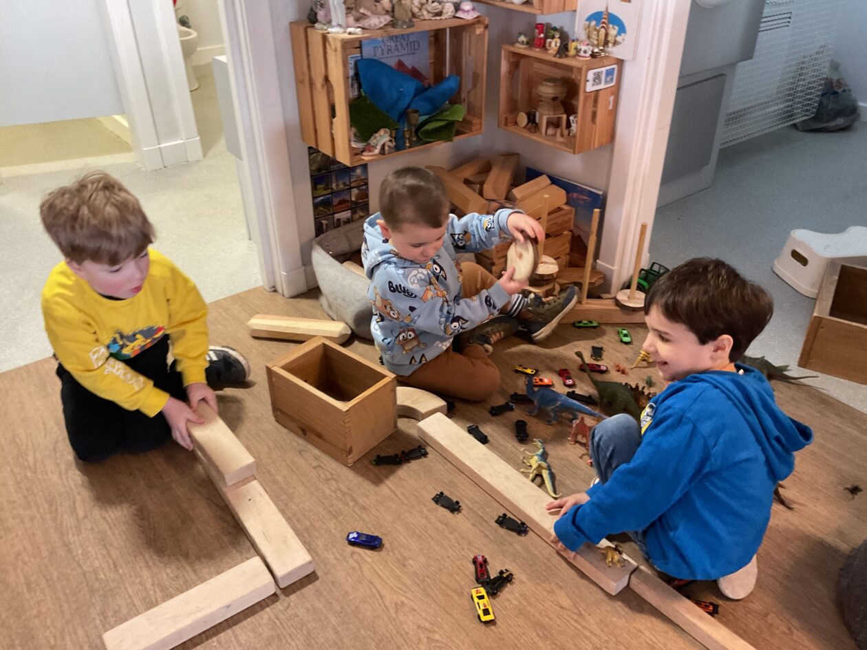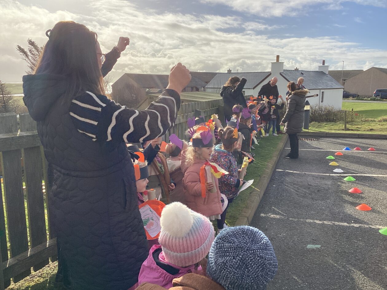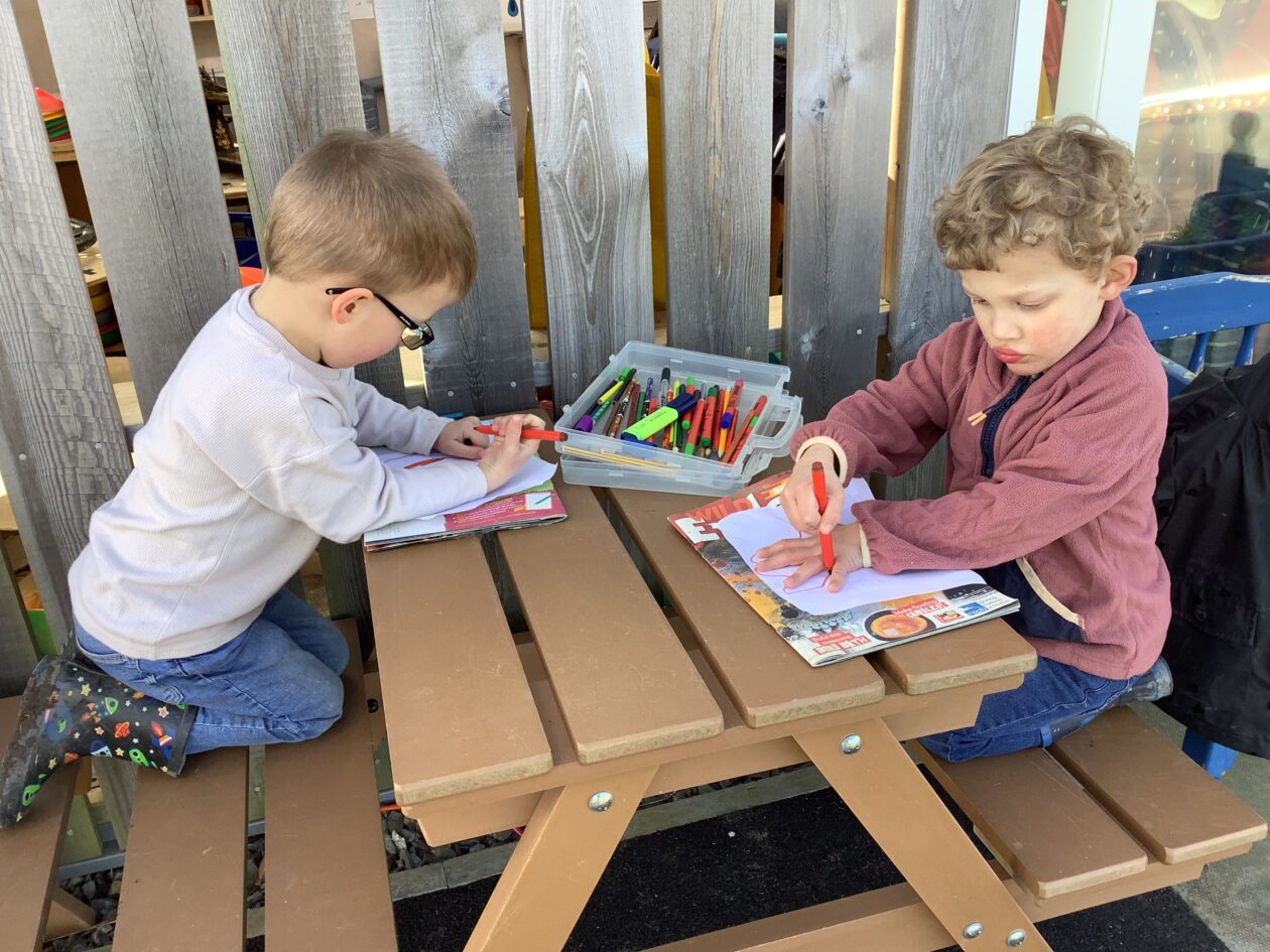 The outdoor room is always a popular choice and a great place to observe schemas (a repeated action used to explore and test theories in play). The bairns have used positioning, transporting, trajectory, enveloping, rotation and enclosure schemas in their play this week. They made paper aeroplanes and then built a platform to launch their planes from, watching how far they flew. They have also been engaged in imaginative play using the large hollow blocks and cable drums as fishing boats. “He is da een dat goes in da water. He is da fishing een and I’m da Captain.”