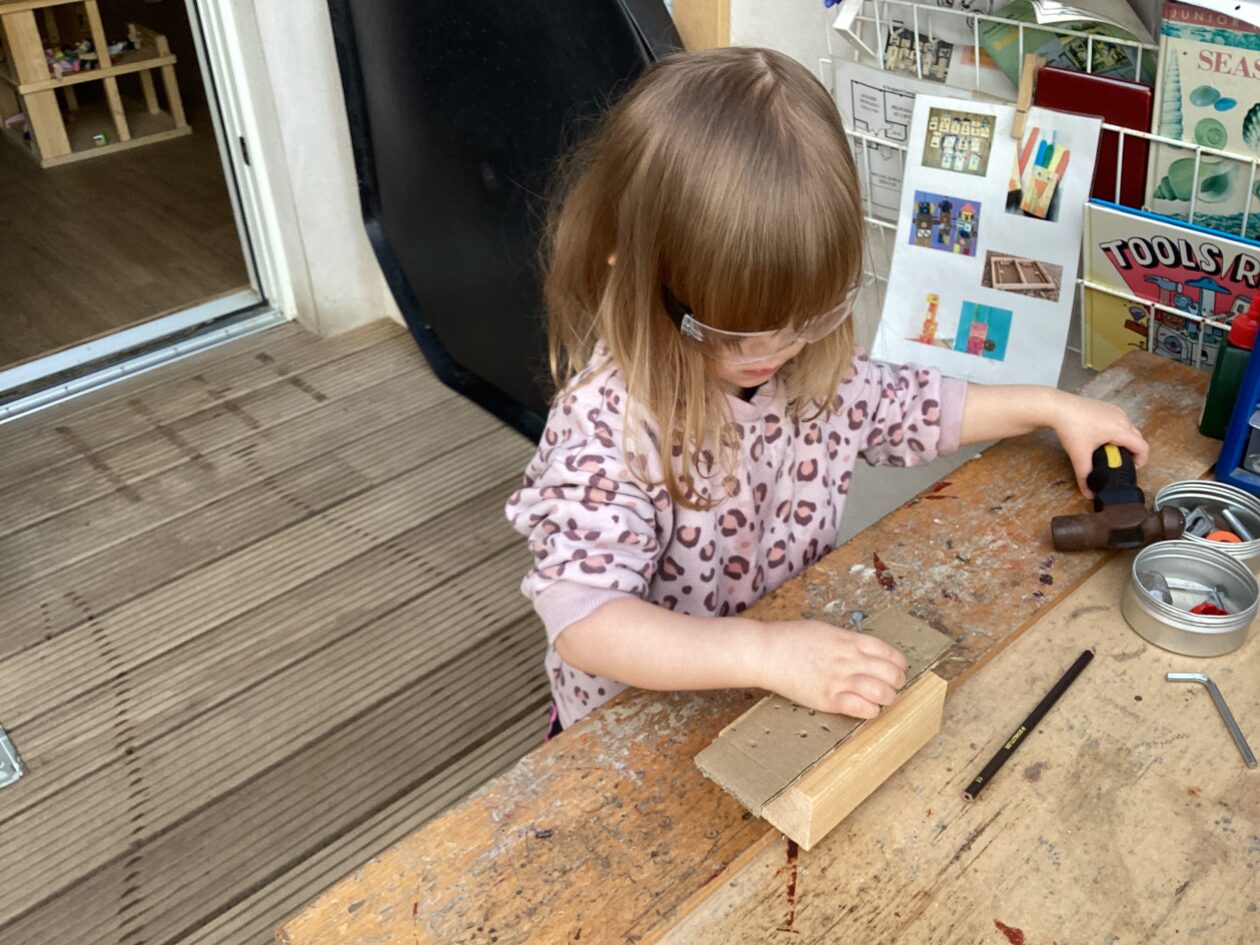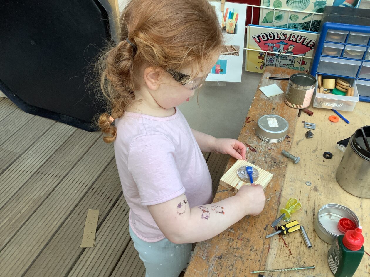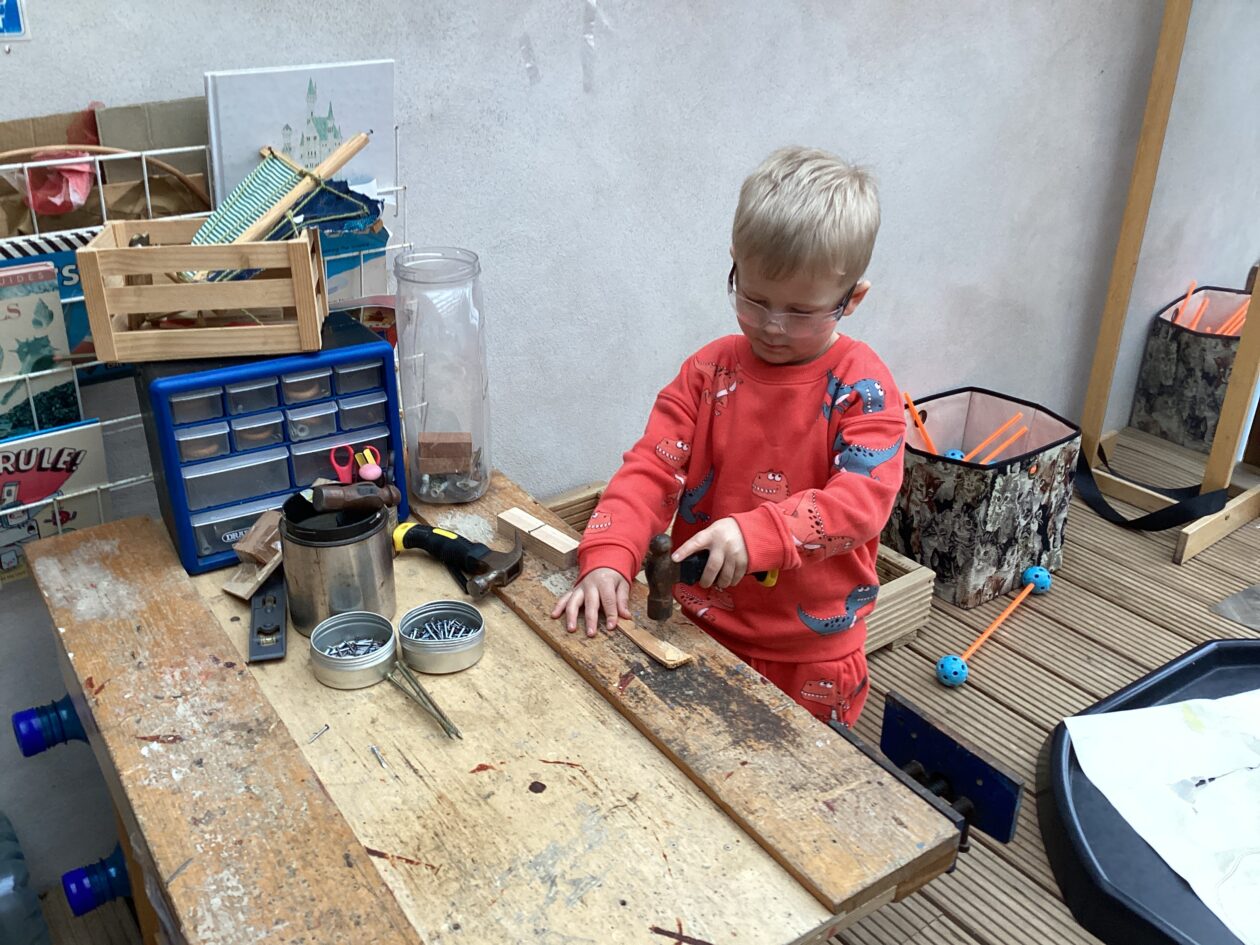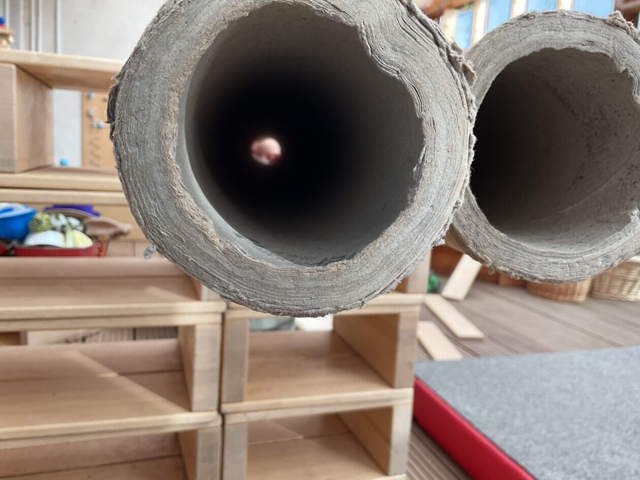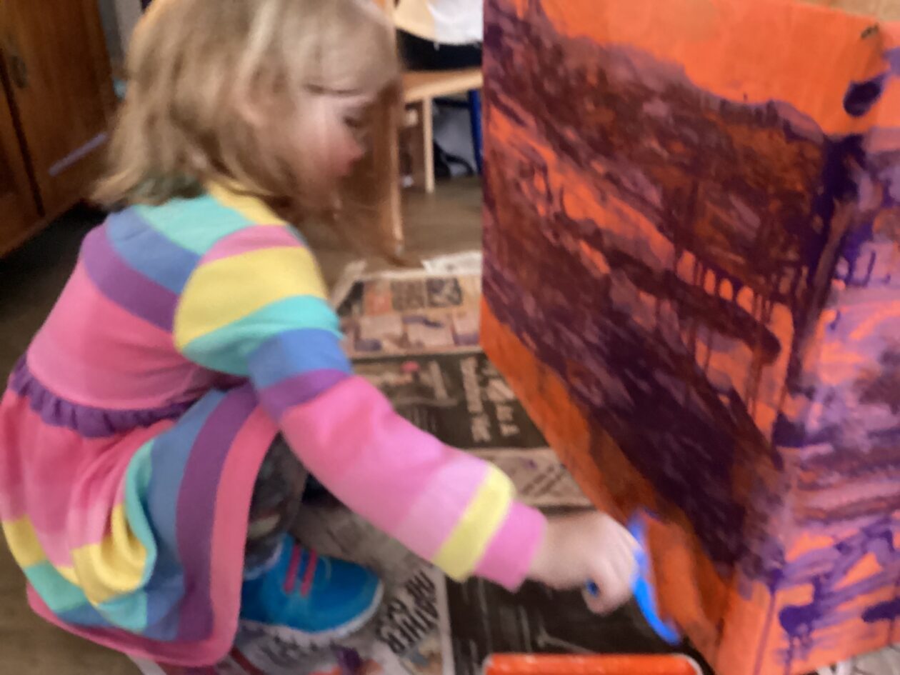 The outdoor room is always a popular choice and a great place to observe schemas (a repeated action used to explore and test theories in play). The bairns have used positioning, transporting, trajectory, enveloping, rotation and enclosure schemas in their play this week. They made paper aeroplanes and then built a platform to launch their planes from, watching how far they flew. They have also been engaged in imaginative play using the large hollow blocks and cable drums as fishing boats. “He is da een dat goes in da water. He is da fishing een and I’m da Captain.”