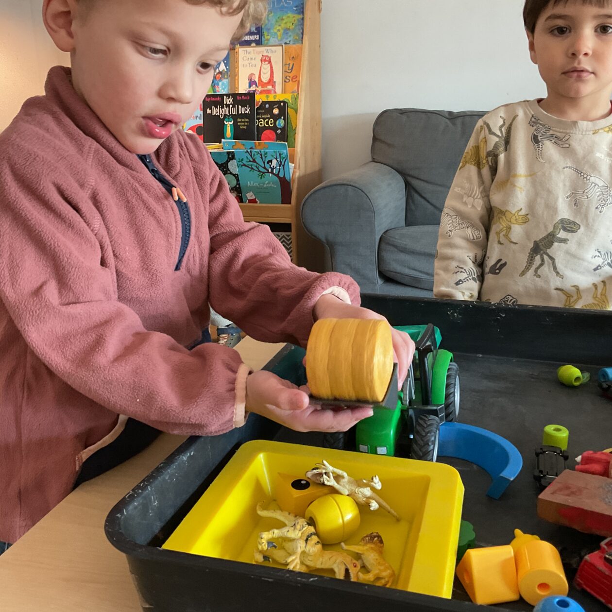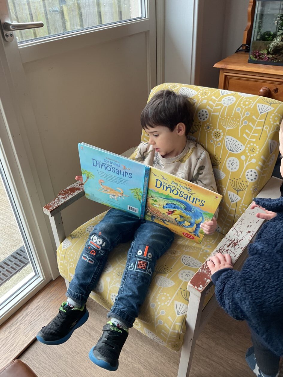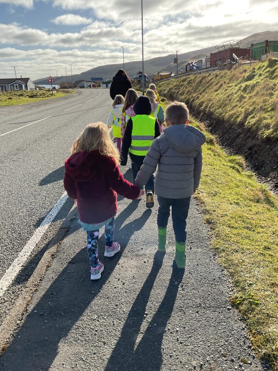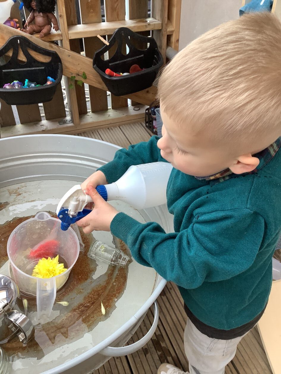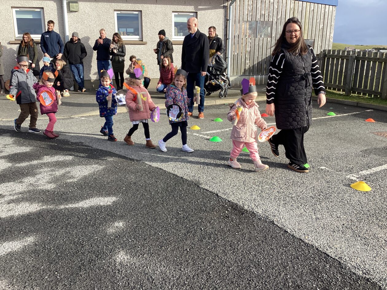 The outdoor room is always a popular choice and a great place to observe schemas (a repeated action used to explore and test theories in play). The bairns have used positioning, transporting, trajectory, enveloping, rotation and enclosure schemas in their play this week. They made paper aeroplanes and then built a platform to launch their planes from, watching how far they flew. They have also been engaged in imaginative play using the large hollow blocks and cable drums as fishing boats. “He is da een dat goes in da water. He is da fishing een and I’m da Captain.”