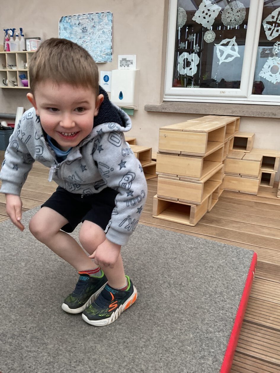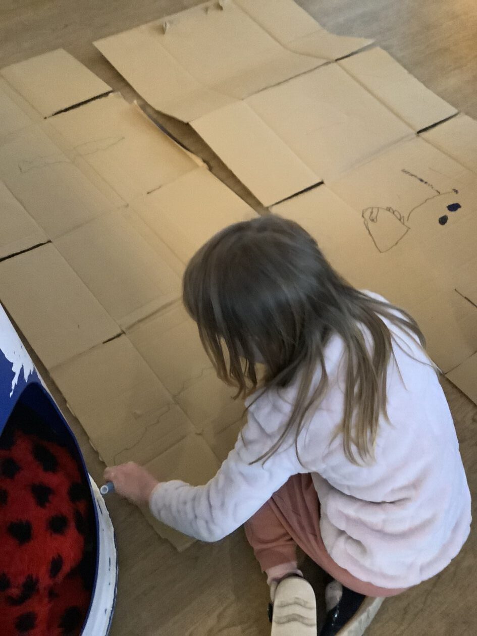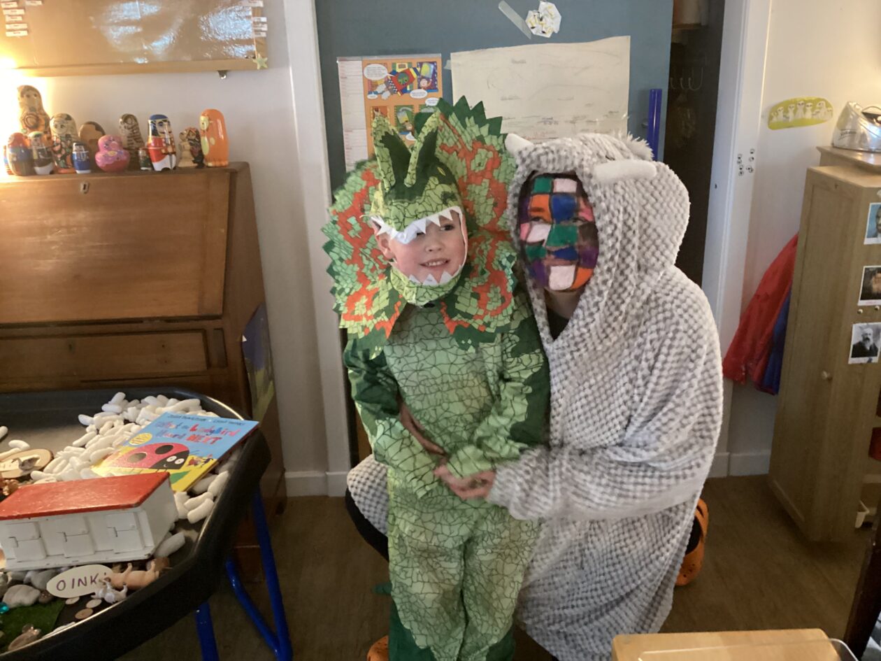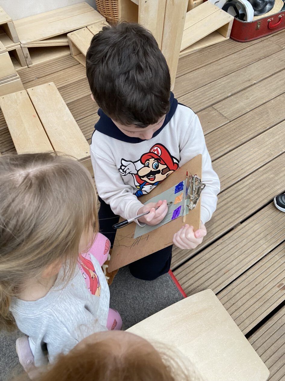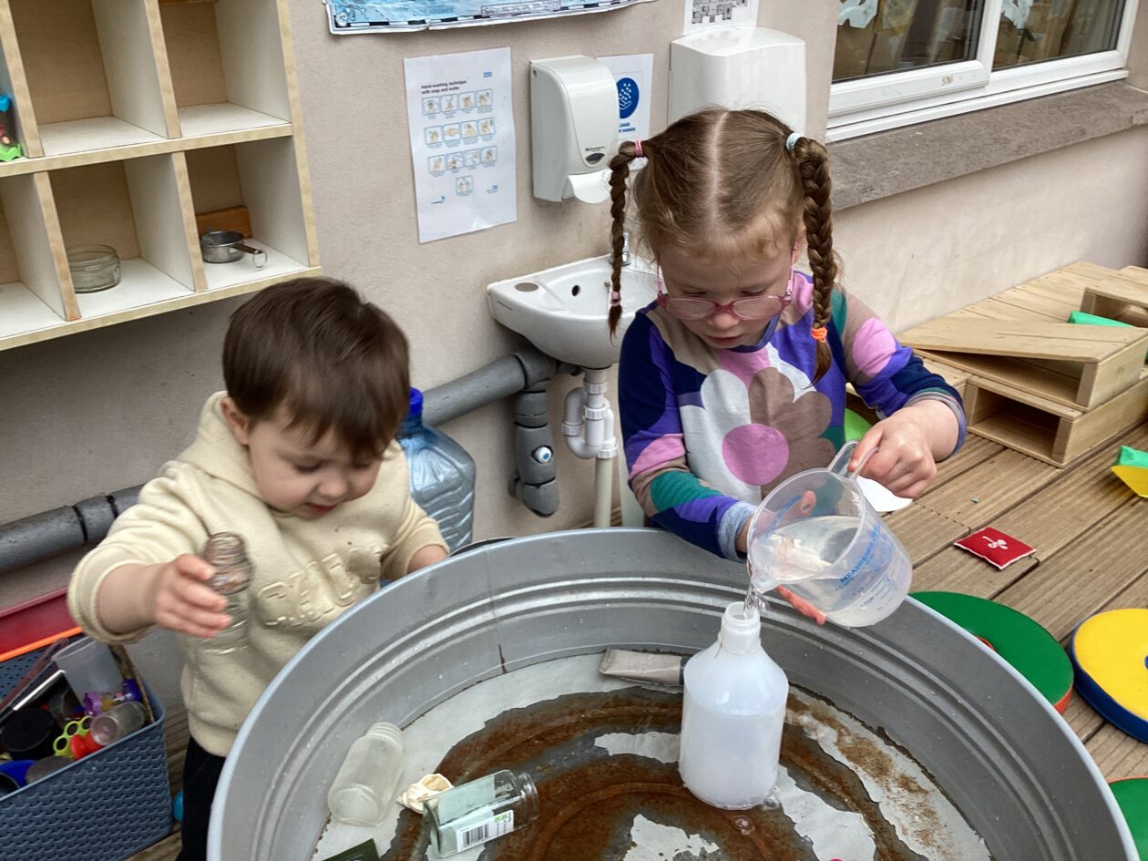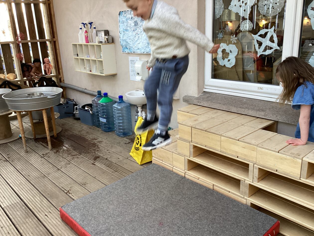 The outdoor room is always a popular choice and a great place to observe schemas (a repeated action used to explore and test theories in play). The bairns have used positioning, transporting, trajectory, enveloping, rotation and enclosure schemas in their play this week. They made paper aeroplanes and then built a platform to launch their planes from, watching how far they flew. They have also been engaged in imaginative play using the large hollow blocks and cable drums as fishing boats. “He is da een dat goes in da water. He is da fishing een and I’m da Captain.”