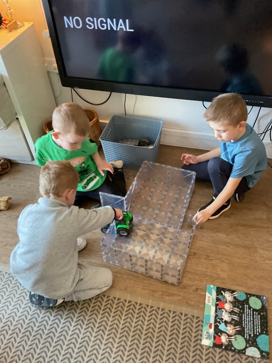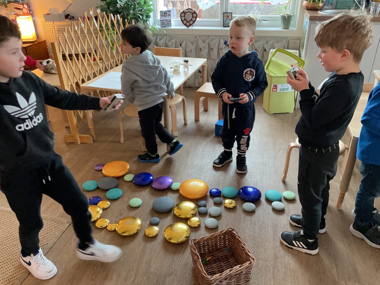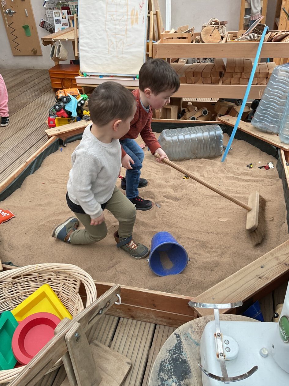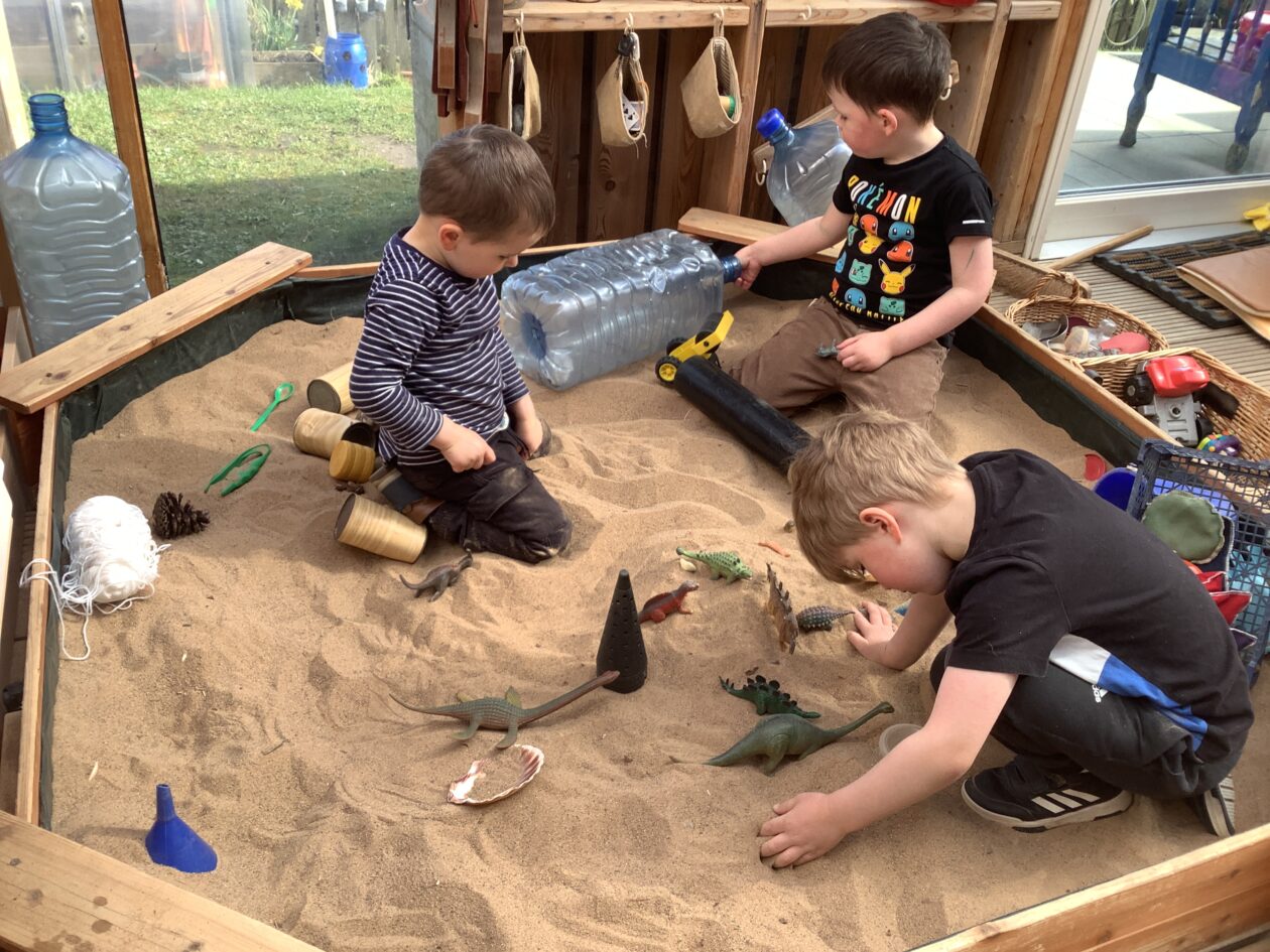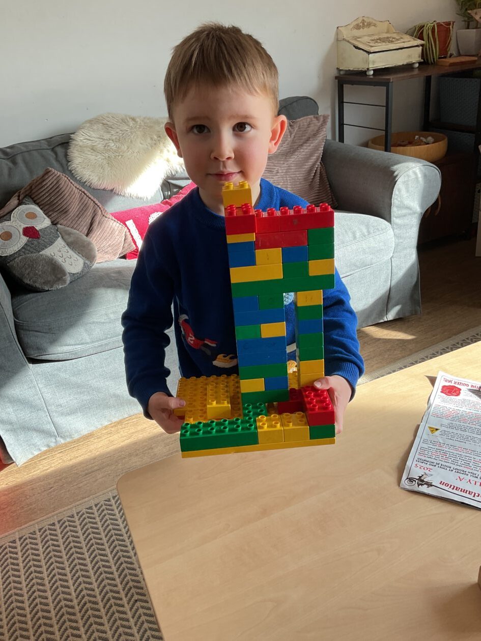 The outdoor room is always a popular choice and a great place to observe schemas (a repeated action used to explore and test theories in play). The bairns have used positioning, transporting, trajectory, enveloping, rotation and enclosure schemas in their play this week. They made paper aeroplanes and then built a platform to launch their planes from, watching how far they flew. They have also been engaged in imaginative play using the large hollow blocks and cable drums as fishing boats. “He is da een dat goes in da water. He is da fishing een and I’m da Captain.”