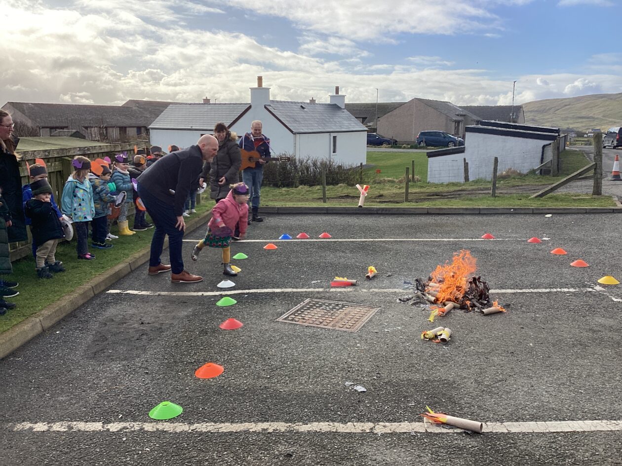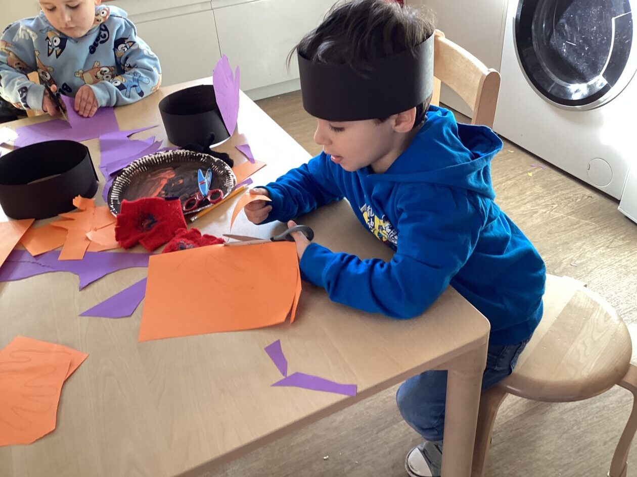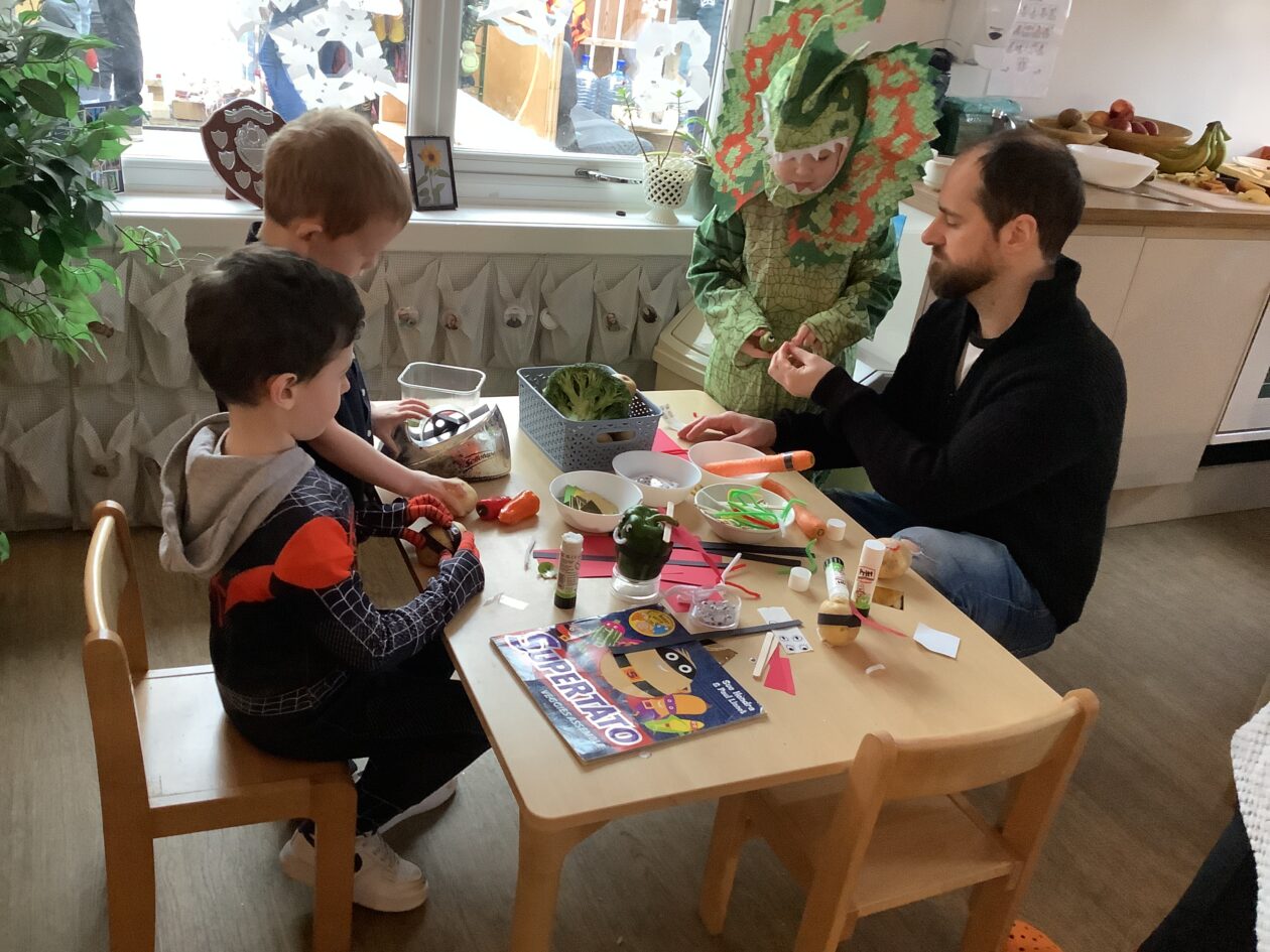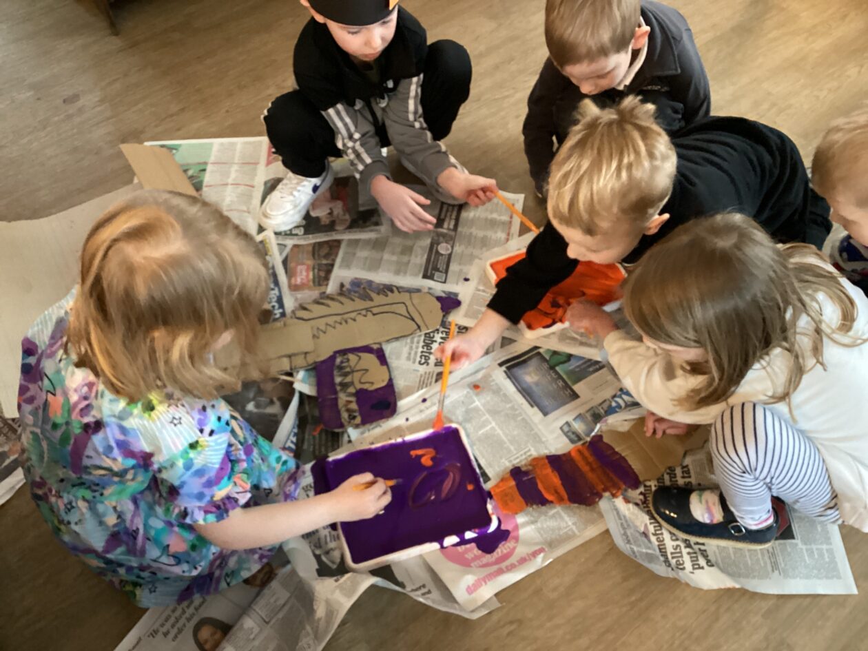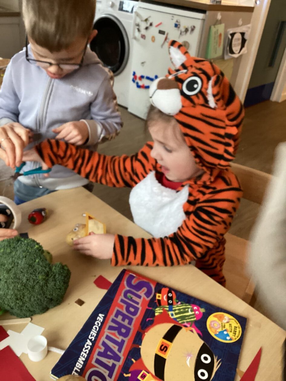 The outdoor room is always a popular choice and a great place to observe schemas (a repeated action used to explore and test theories in play). The bairns have used positioning, transporting, trajectory, enveloping, rotation and enclosure schemas in their play this week. They made paper aeroplanes and then built a platform to launch their planes from, watching how far they flew. They have also been engaged in imaginative play using the large hollow blocks and cable drums as fishing boats. “He is da een dat goes in da water. He is da fishing een and I’m da Captain.”