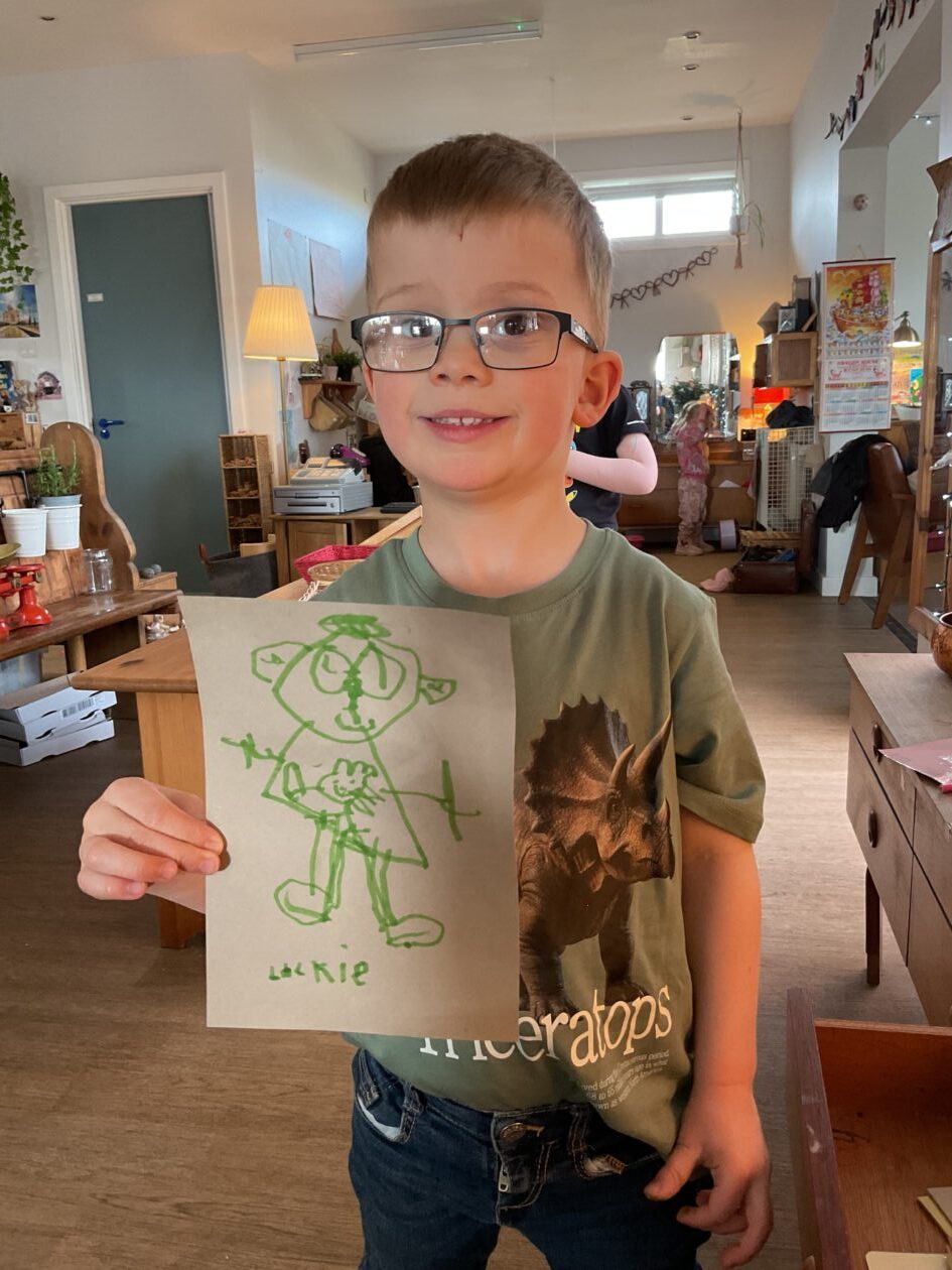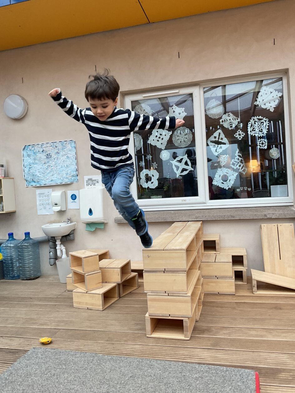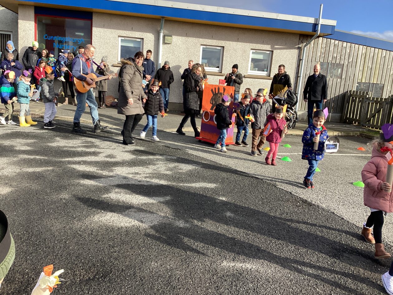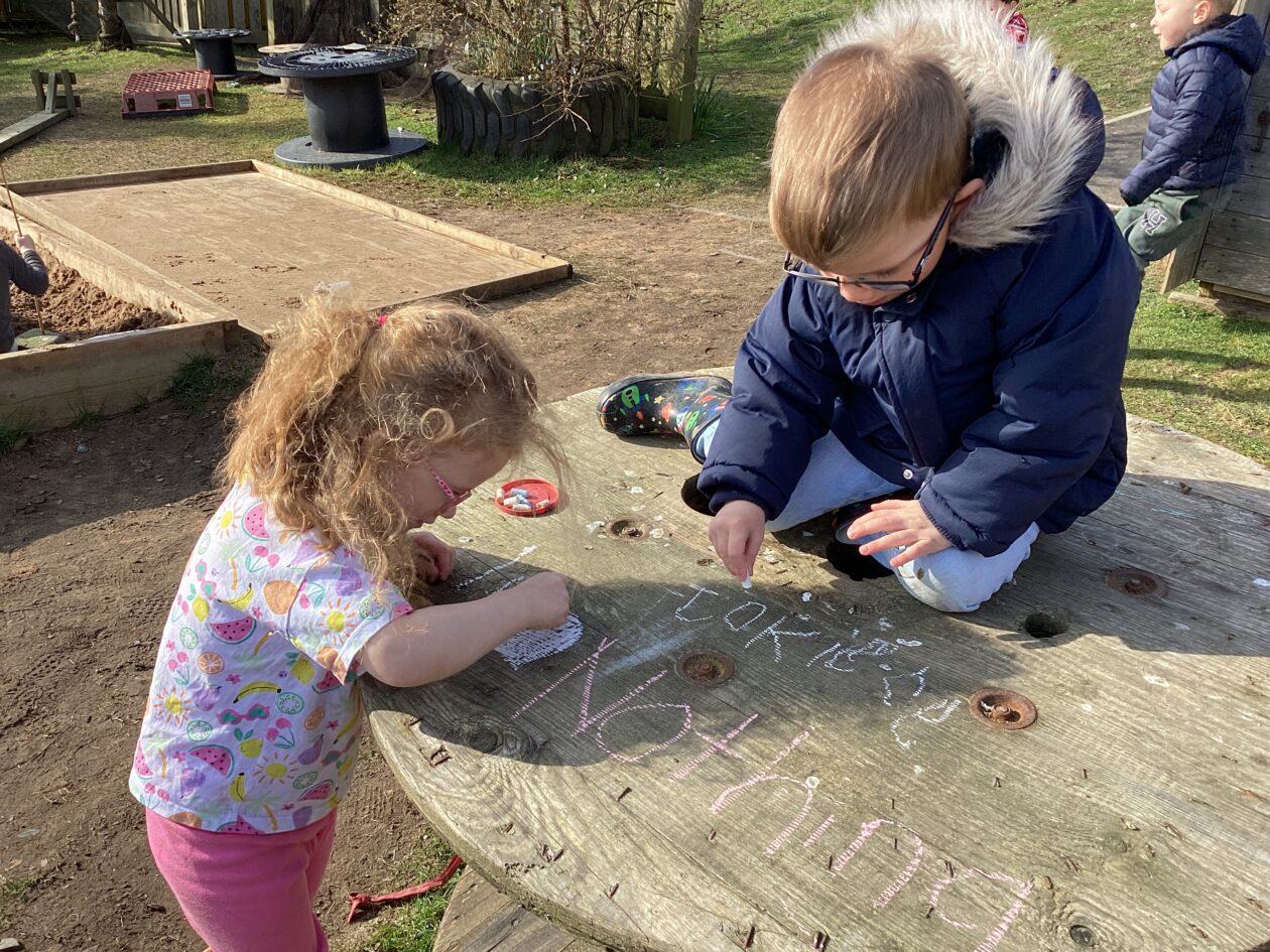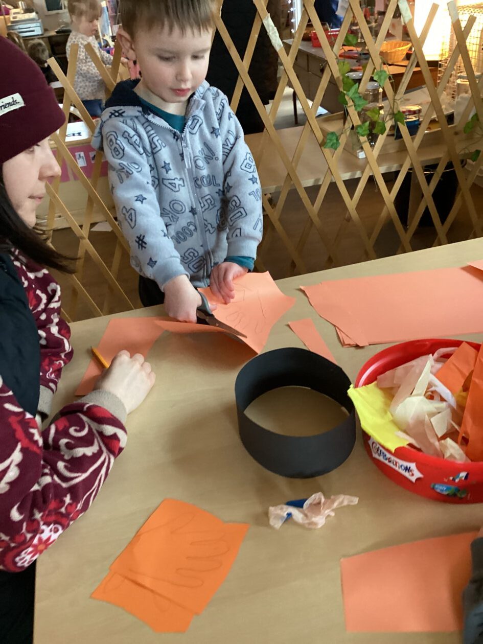 The outdoor room is always a popular choice and a great place to observe schemas (a repeated action used to explore and test theories in play). The bairns have used positioning, transporting, trajectory, enveloping, rotation and enclosure schemas in their play this week. They made paper aeroplanes and then built a platform to launch their planes from, watching how far they flew. They have also been engaged in imaginative play using the large hollow blocks and cable drums as fishing boats. “He is da een dat goes in da water. He is da fishing een and I’m da Captain.”