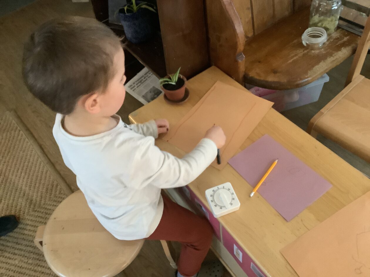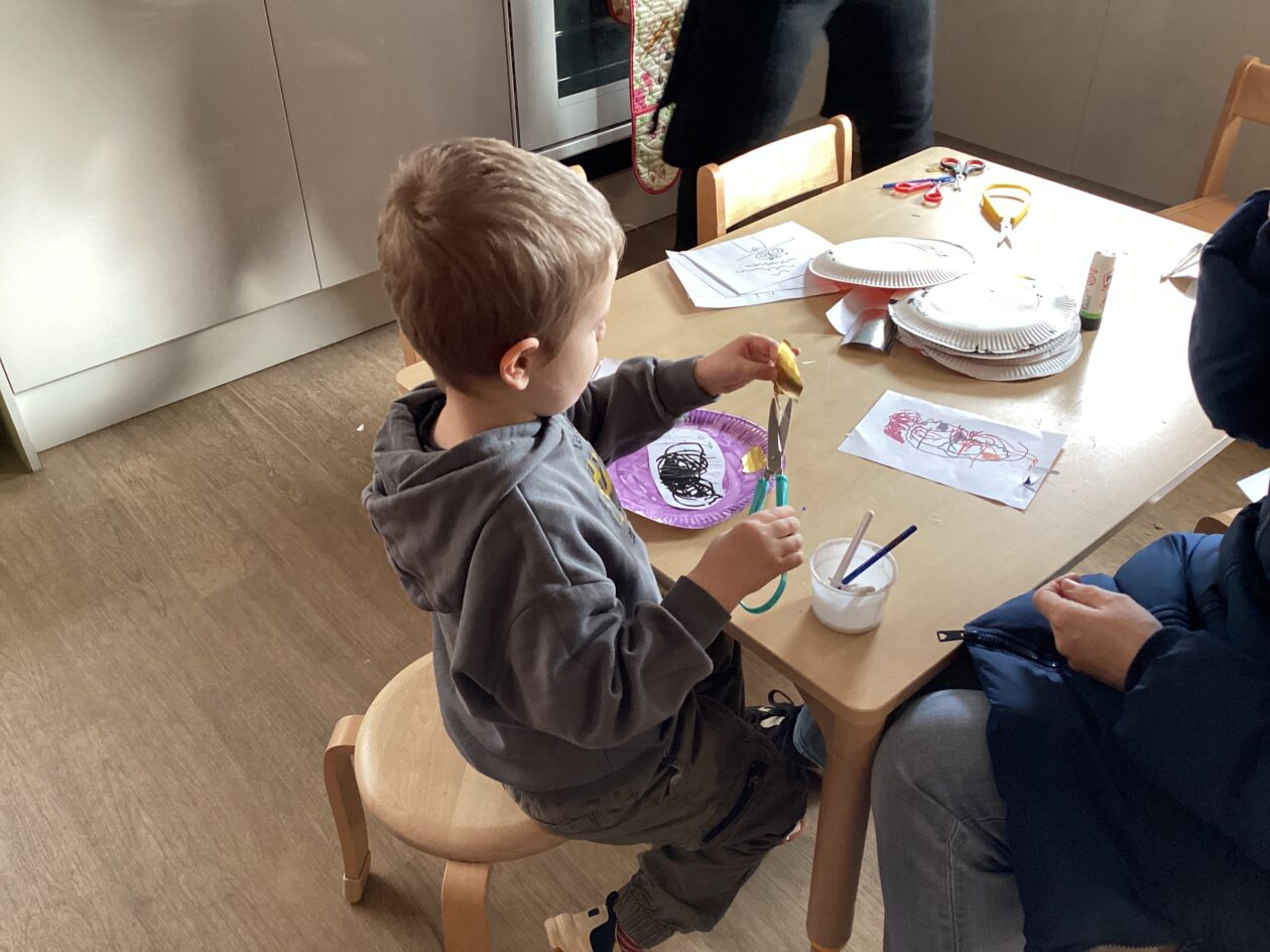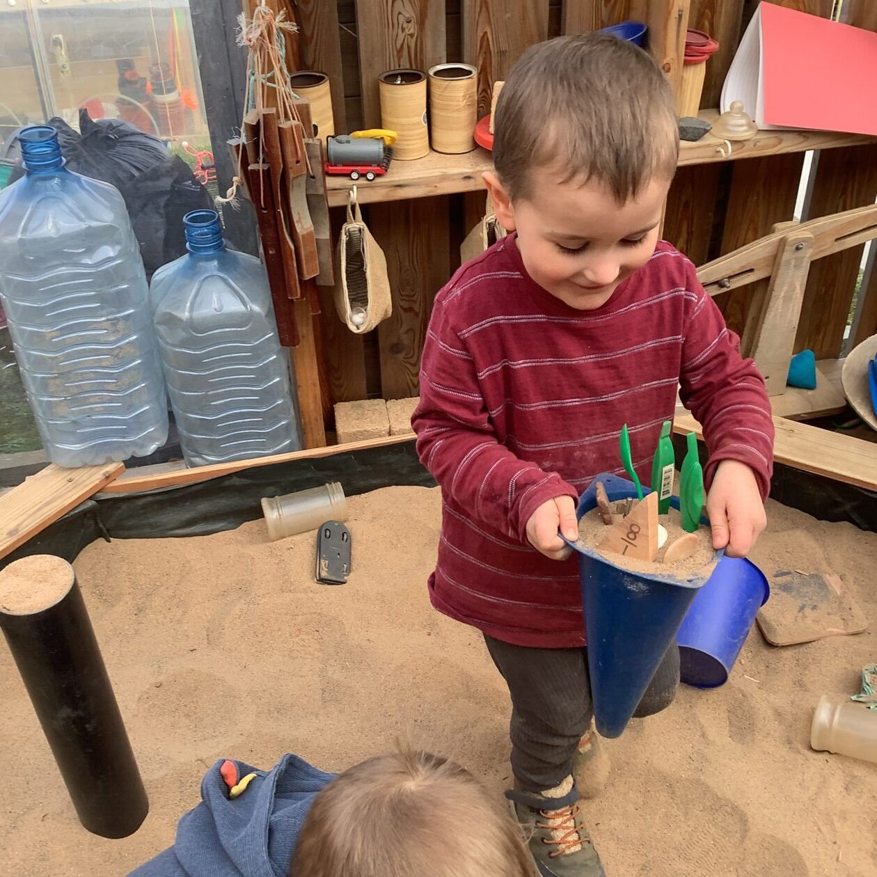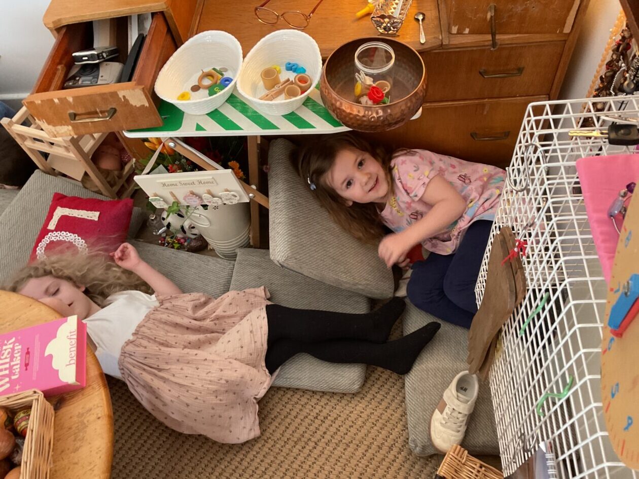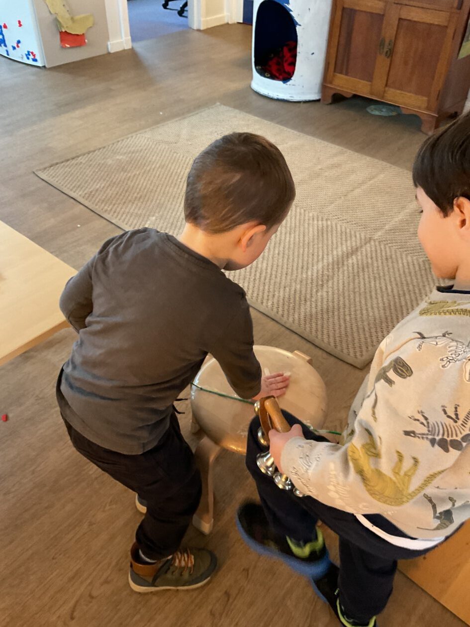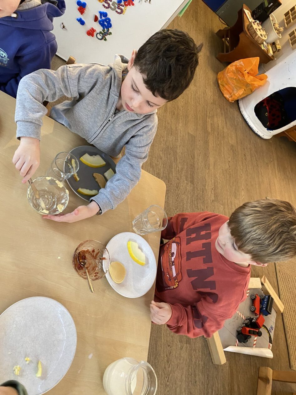 The outdoor room is always a popular choice and a great place to observe schemas (a repeated action used to explore and test theories in play). The bairns have used positioning, transporting, trajectory, enveloping, rotation and enclosure schemas in their play this week. They made paper aeroplanes and then built a platform to launch their planes from, watching how far they flew. They have also been engaged in imaginative play using the large hollow blocks and cable drums as fishing boats. “He is da een dat goes in da water. He is da fishing een and I’m da Captain.”