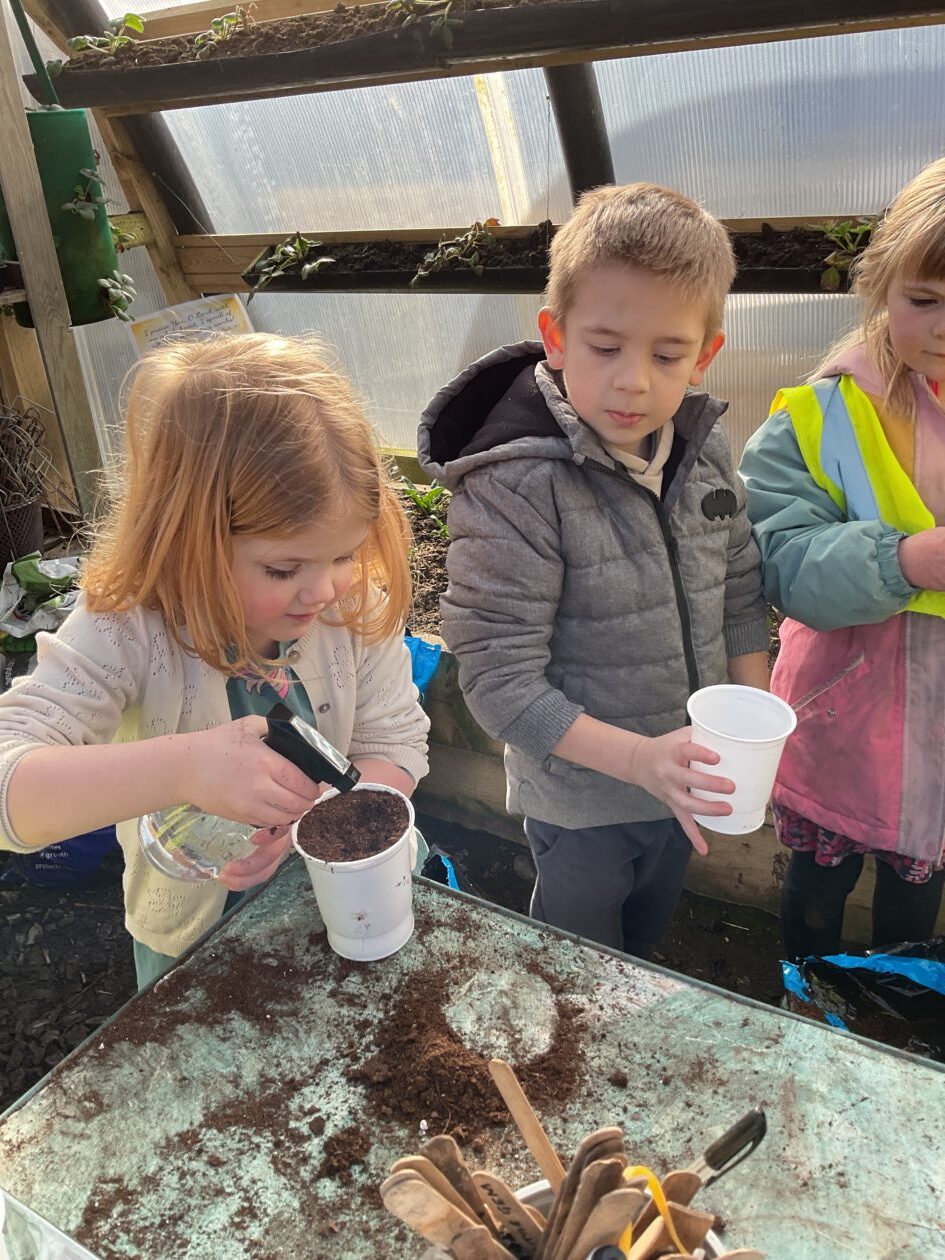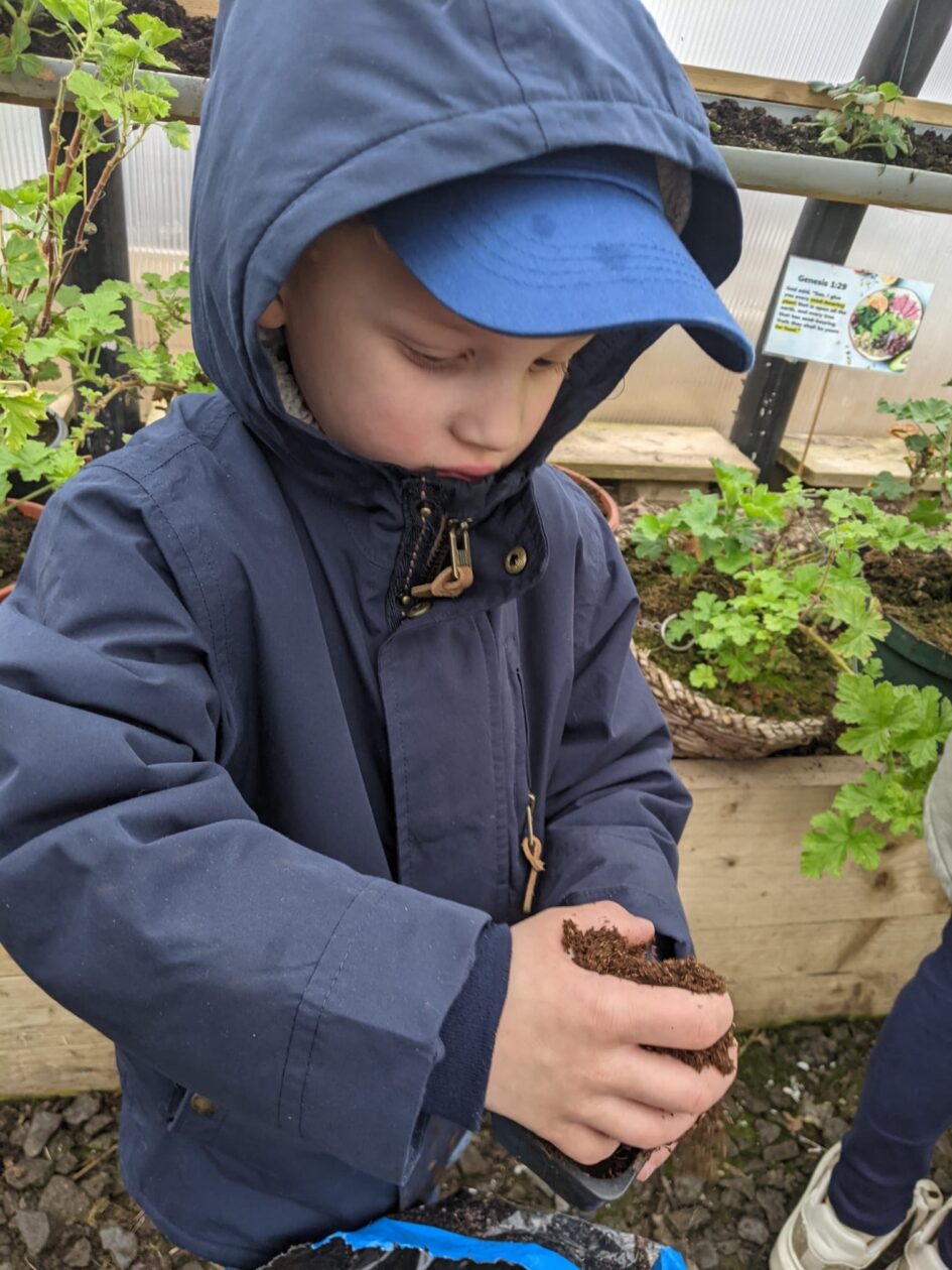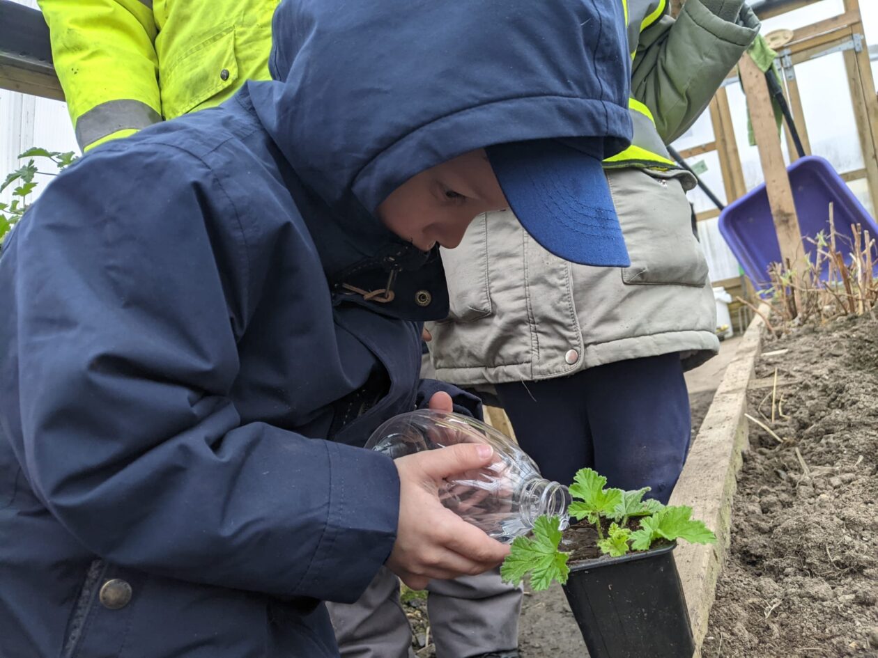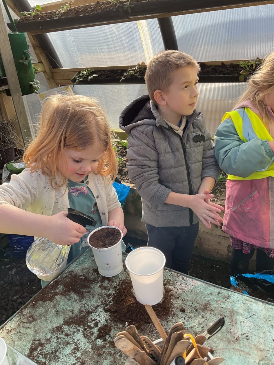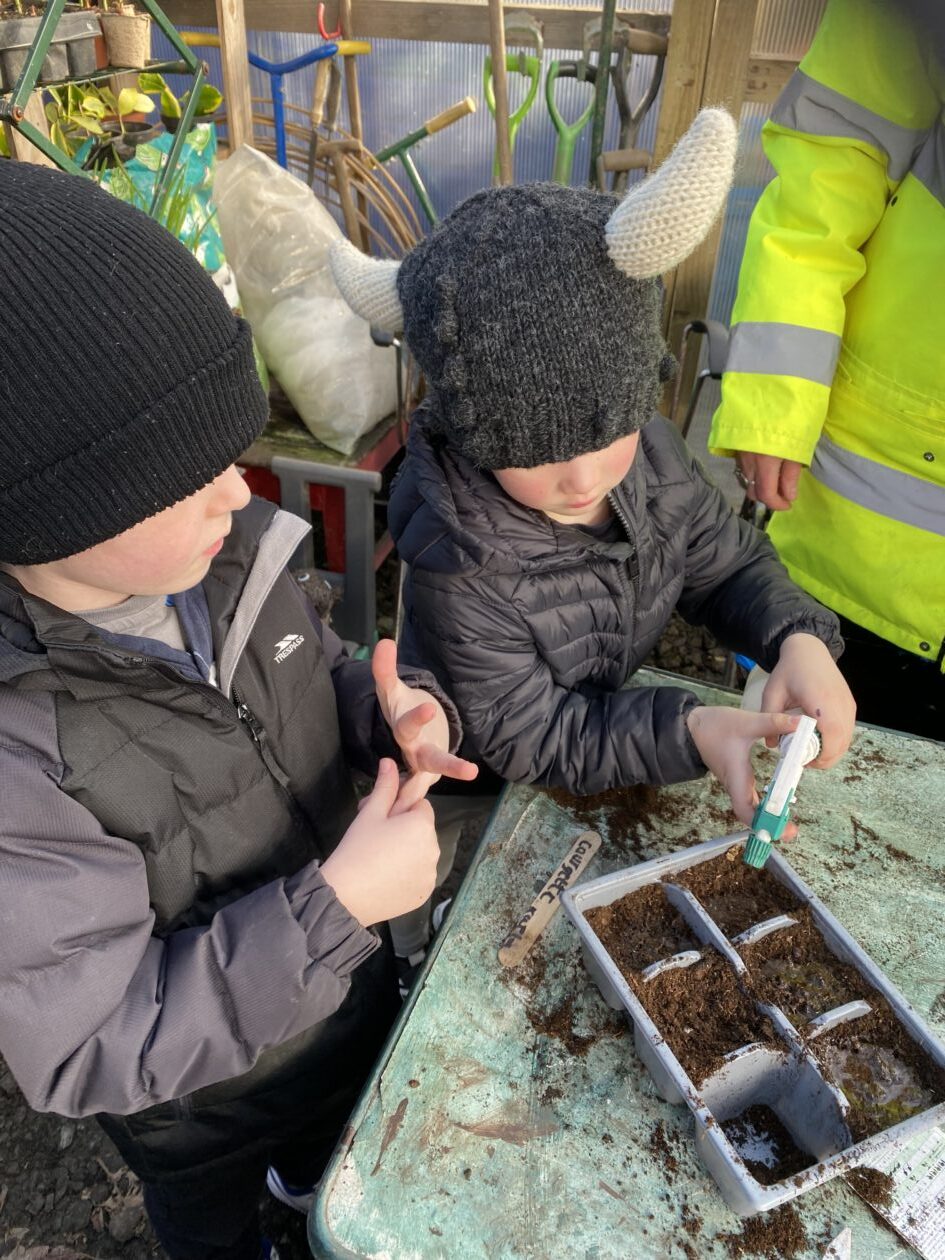 We noticed that some of the nursery plants had grown too big for their pots. The bairns put fresh soil into bigger pots and carefully repotted the plants. They gave them a big drink too.