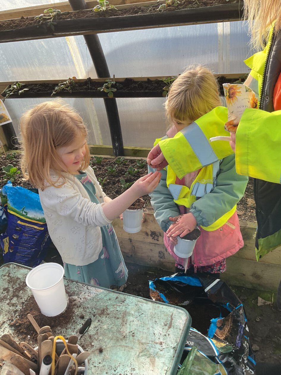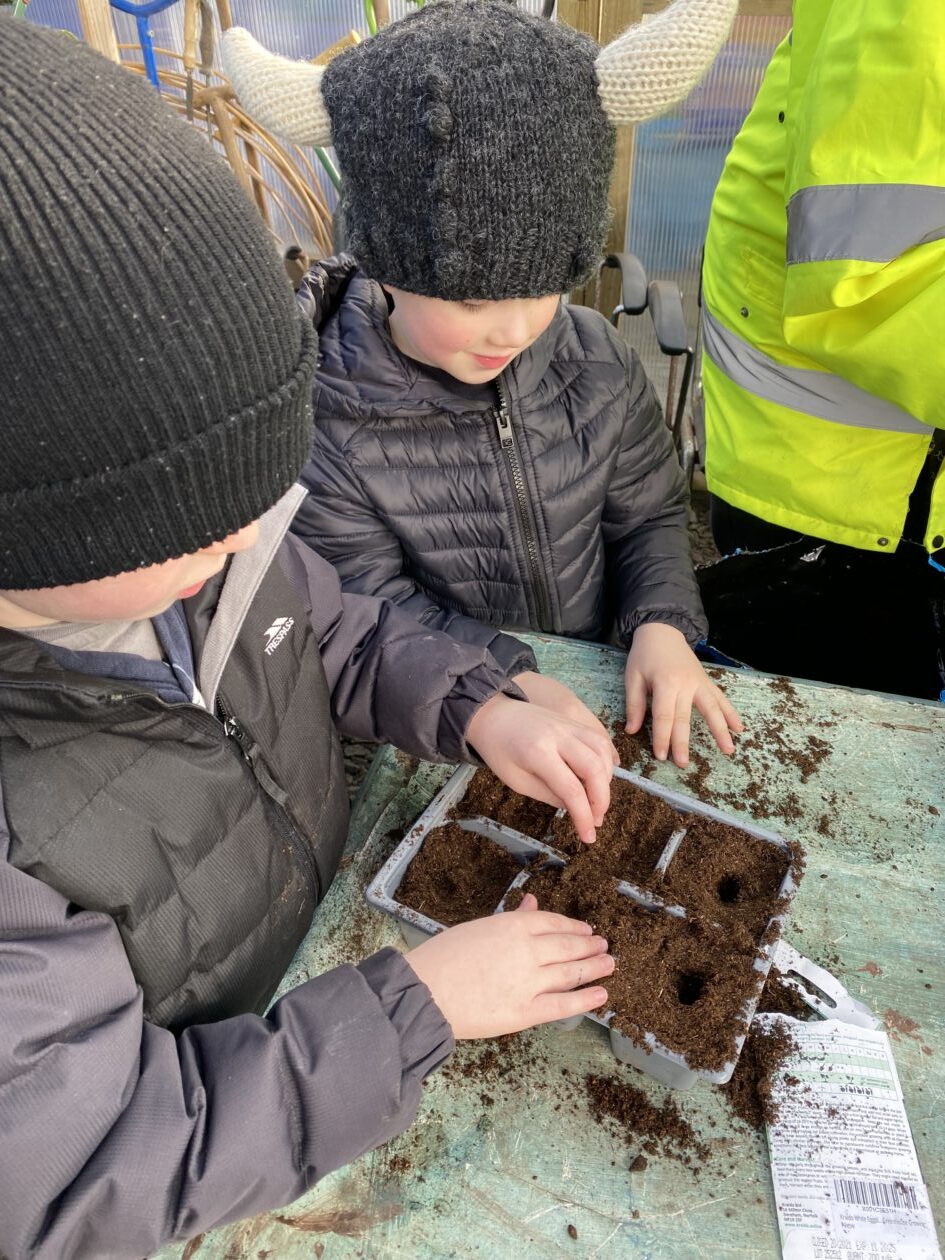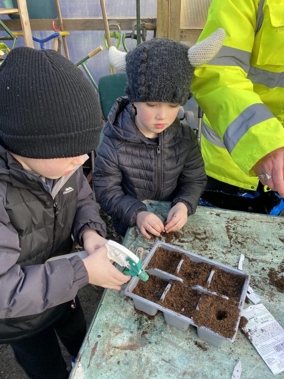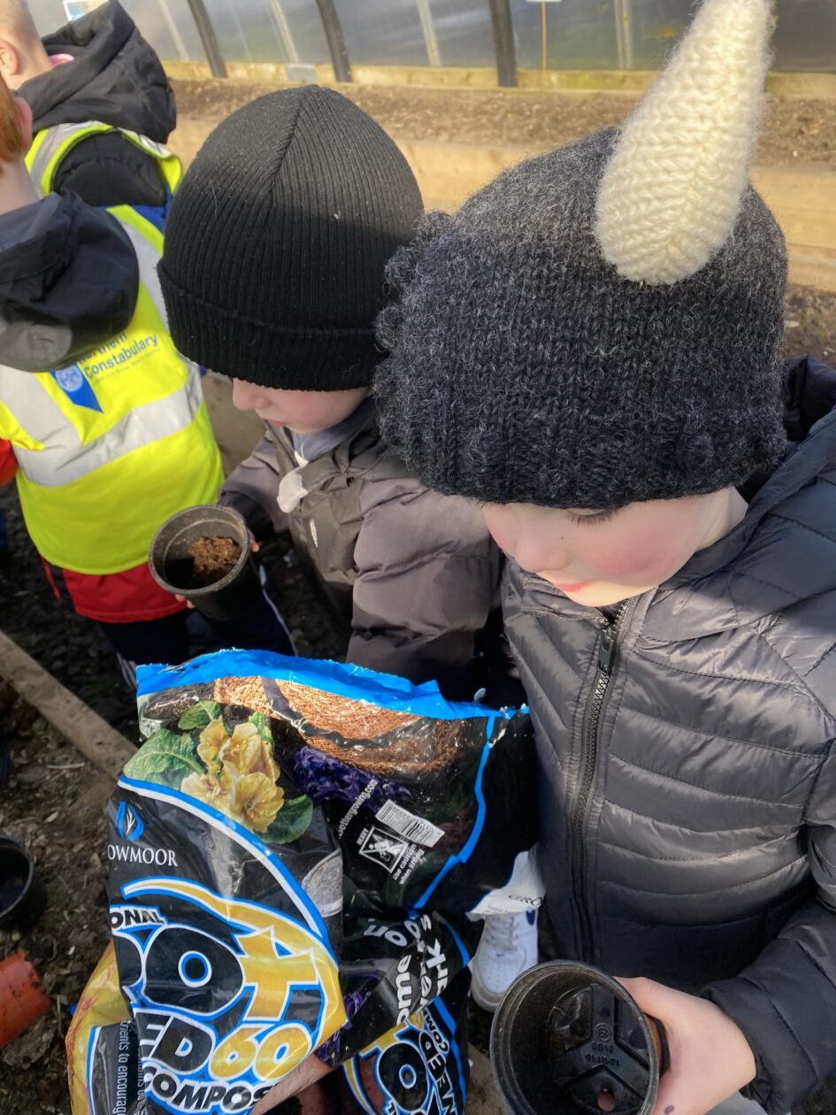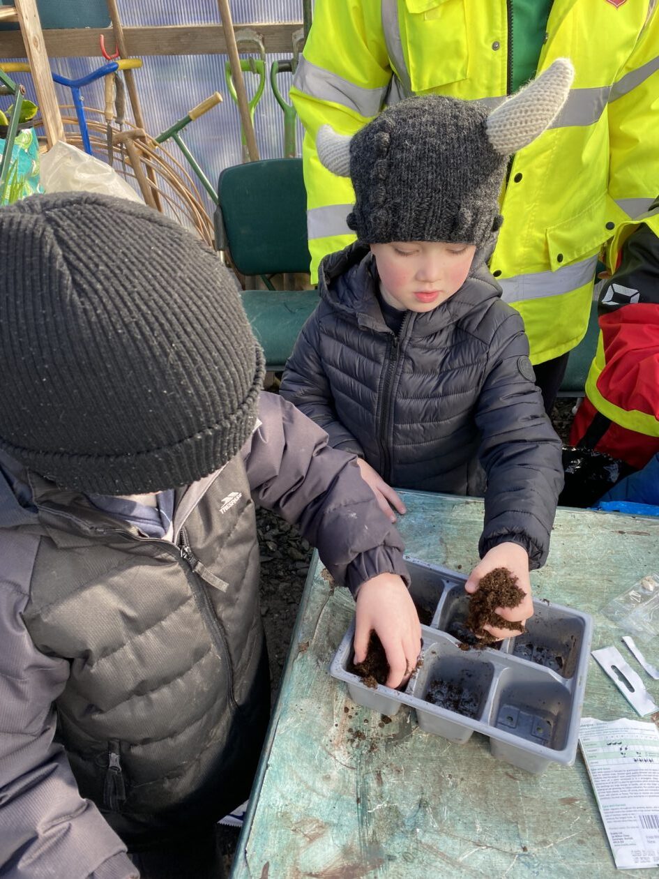 We noticed that some of the nursery plants had grown too big for their pots. The bairns put fresh soil into bigger pots and carefully repotted the plants. They gave them a big drink too.