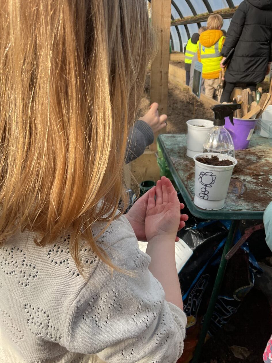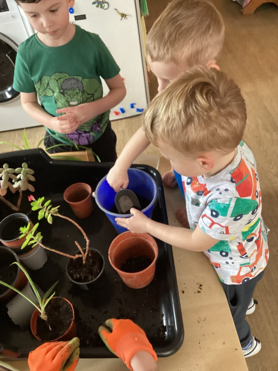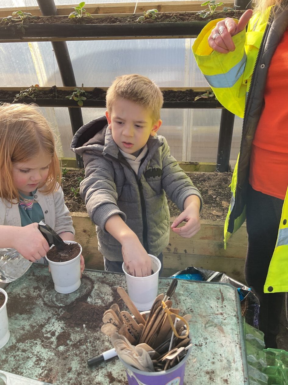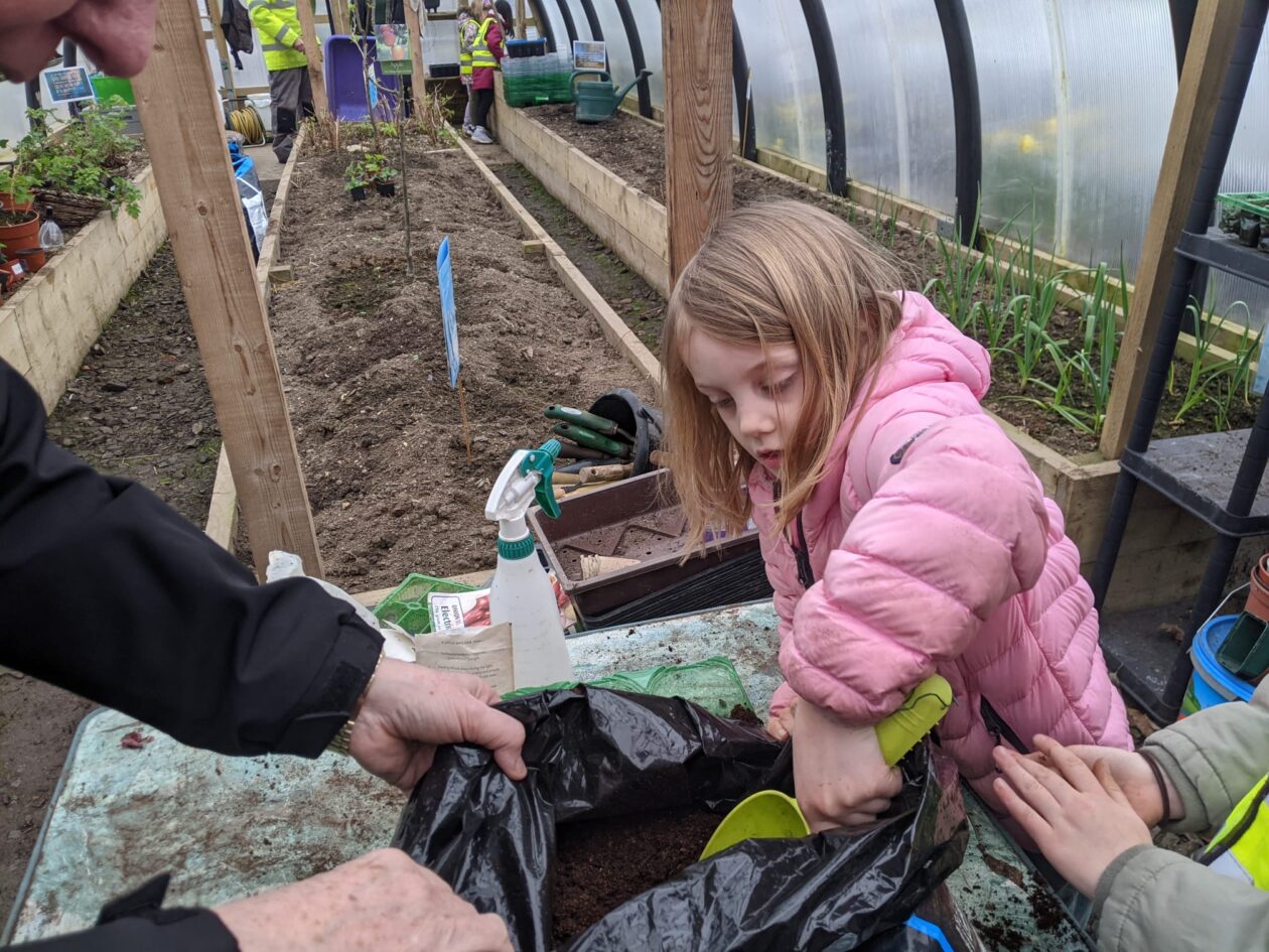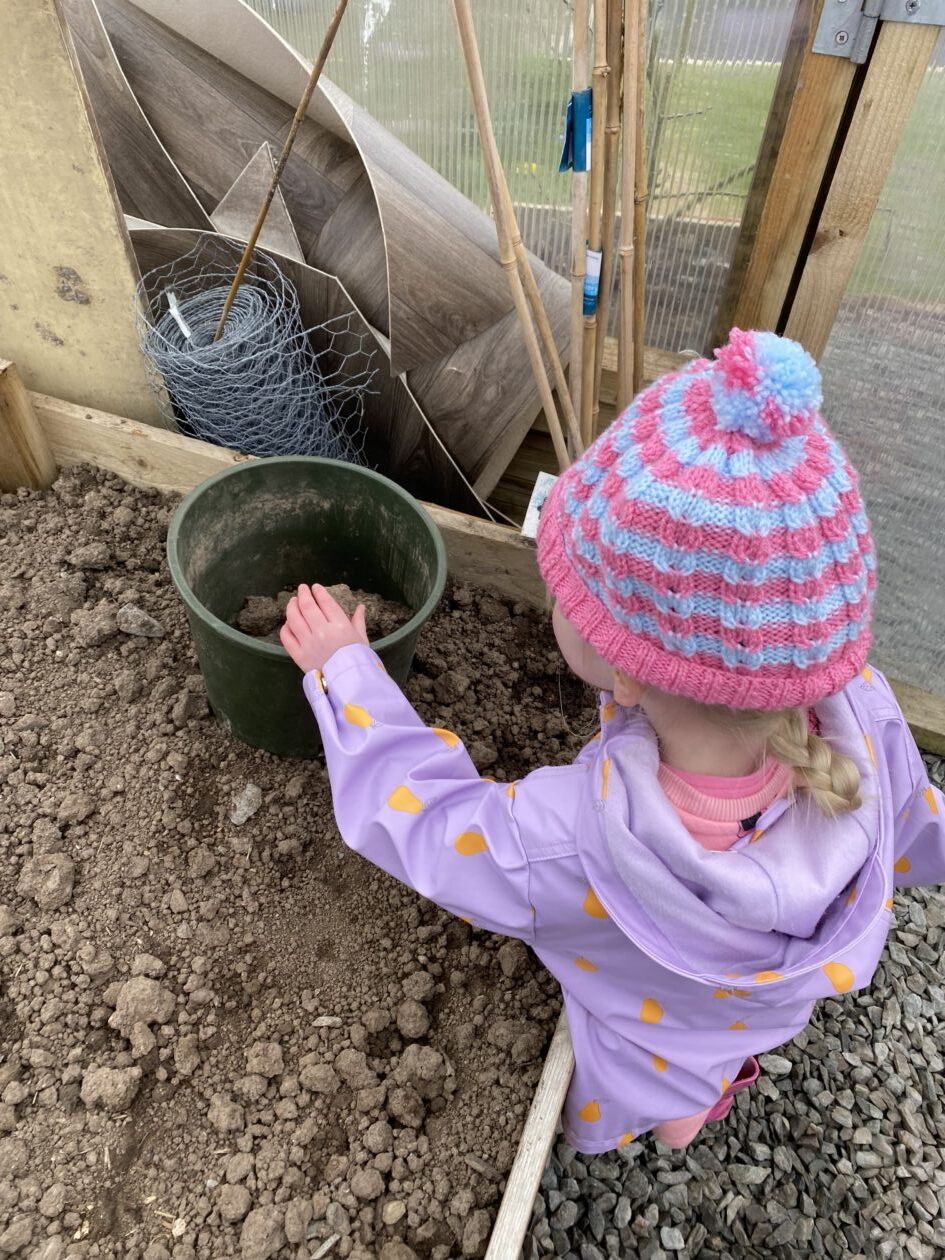 We noticed that some of the nursery plants had grown too big for their pots. The bairns put fresh soil into bigger pots and carefully repotted the plants. They gave them a big drink too.