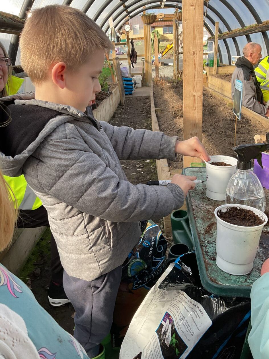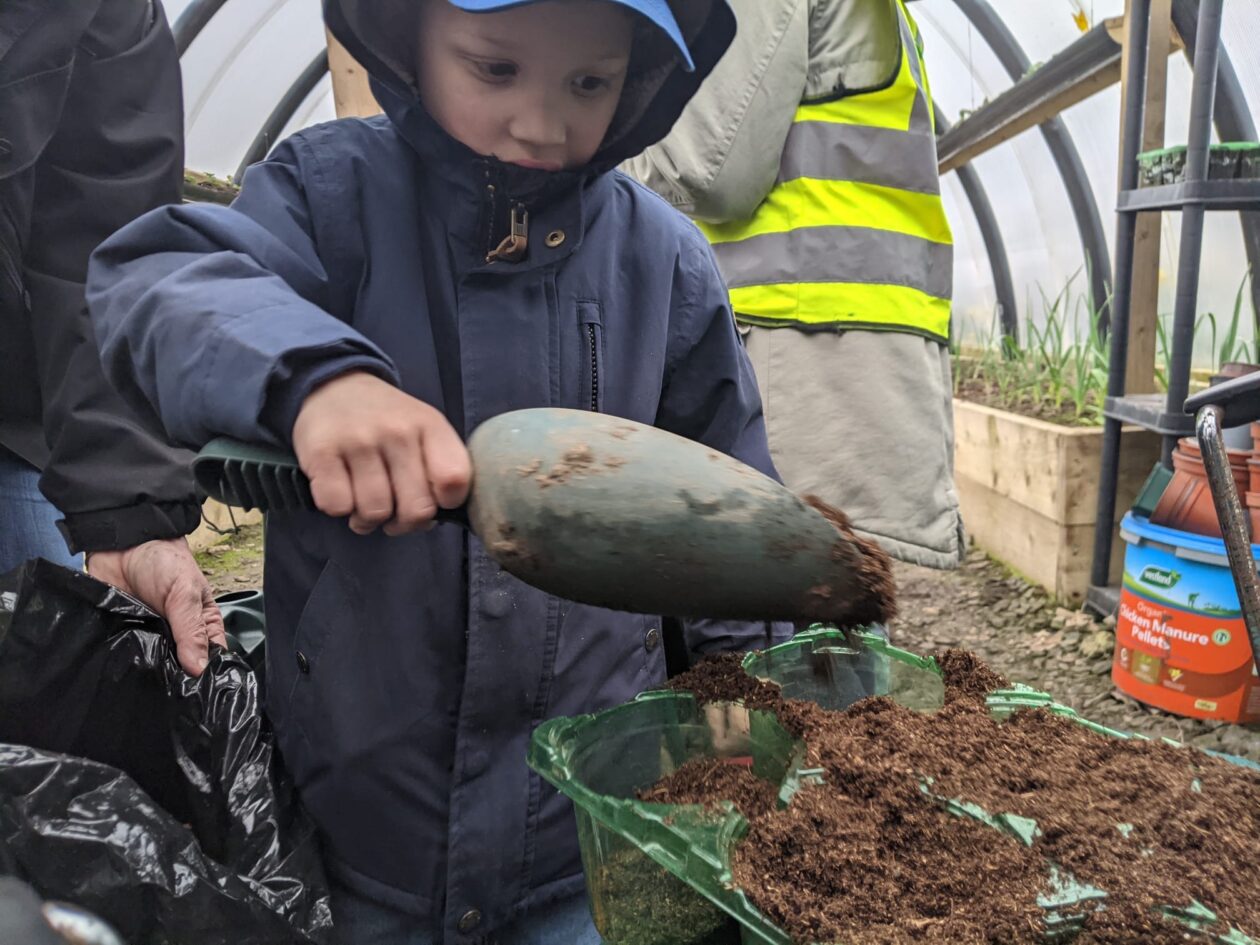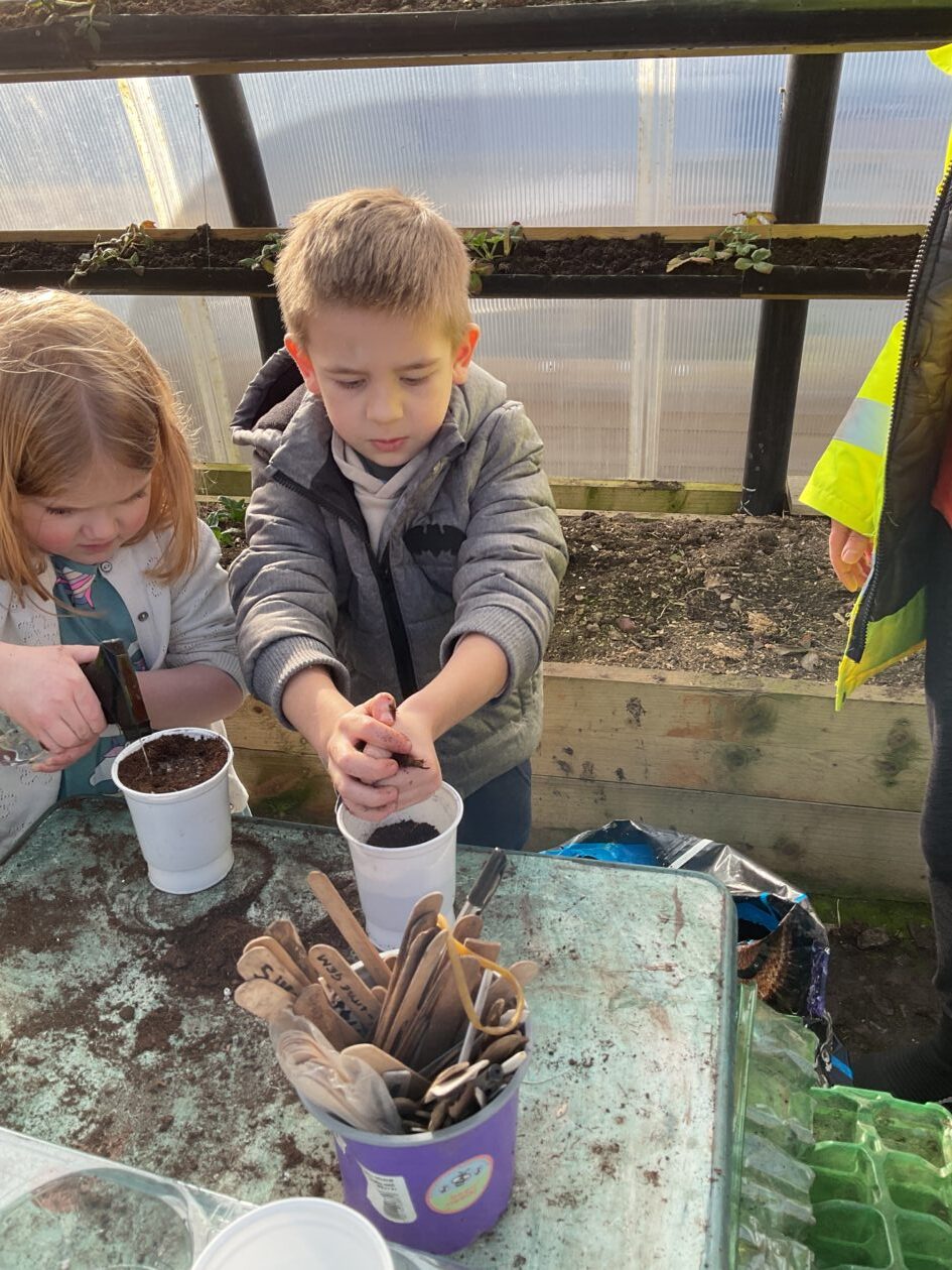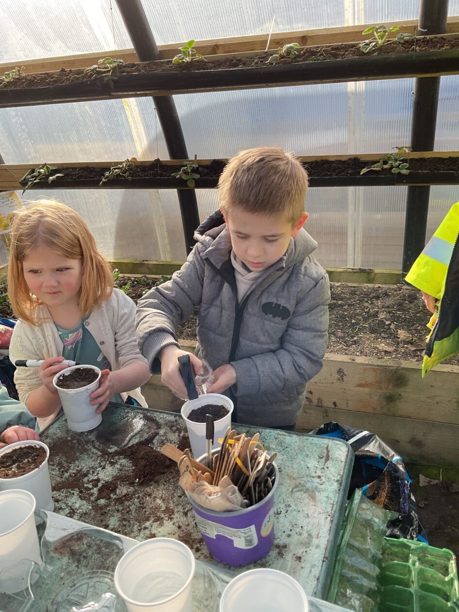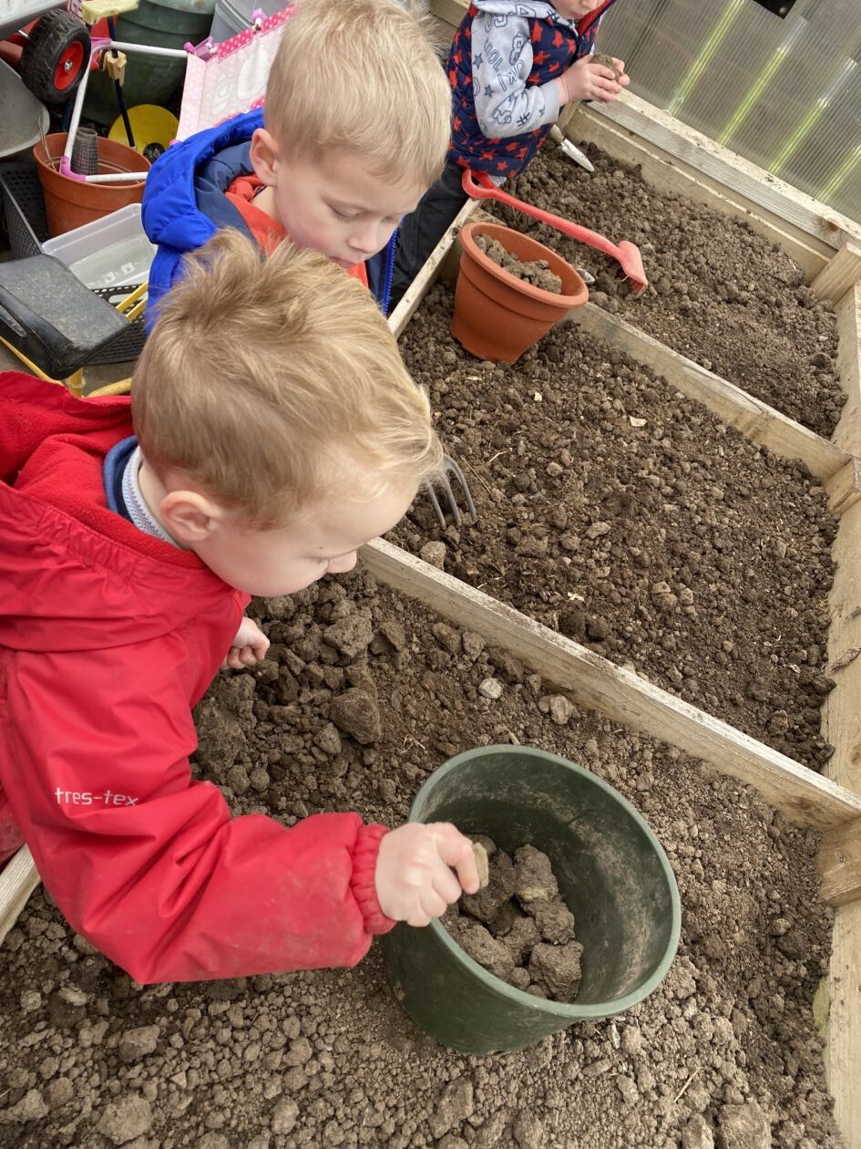 We noticed that some of the nursery plants had grown too big for their pots. The bairns put fresh soil into bigger pots and carefully repotted the plants. They gave them a big drink too.