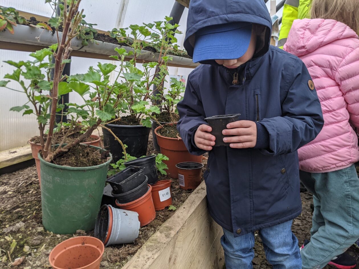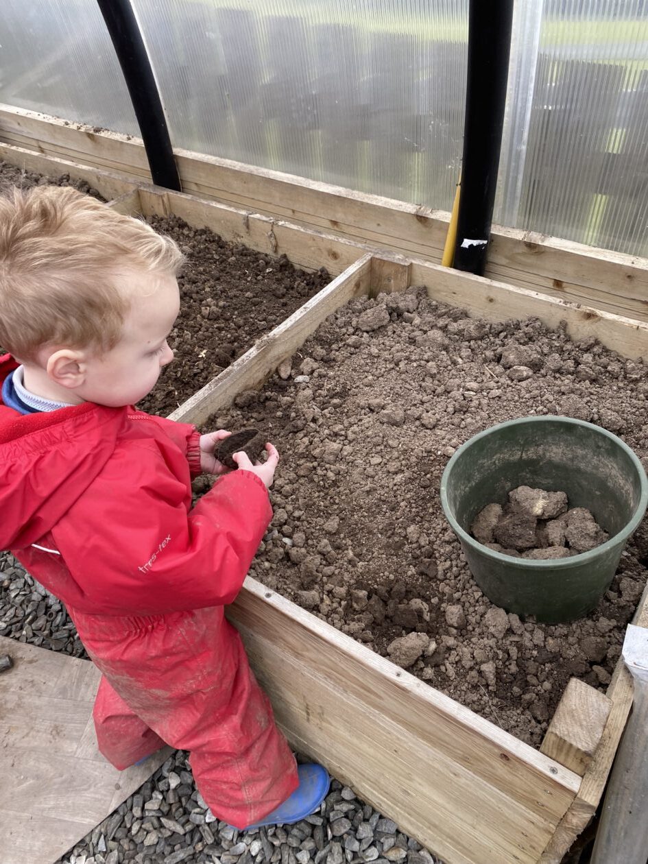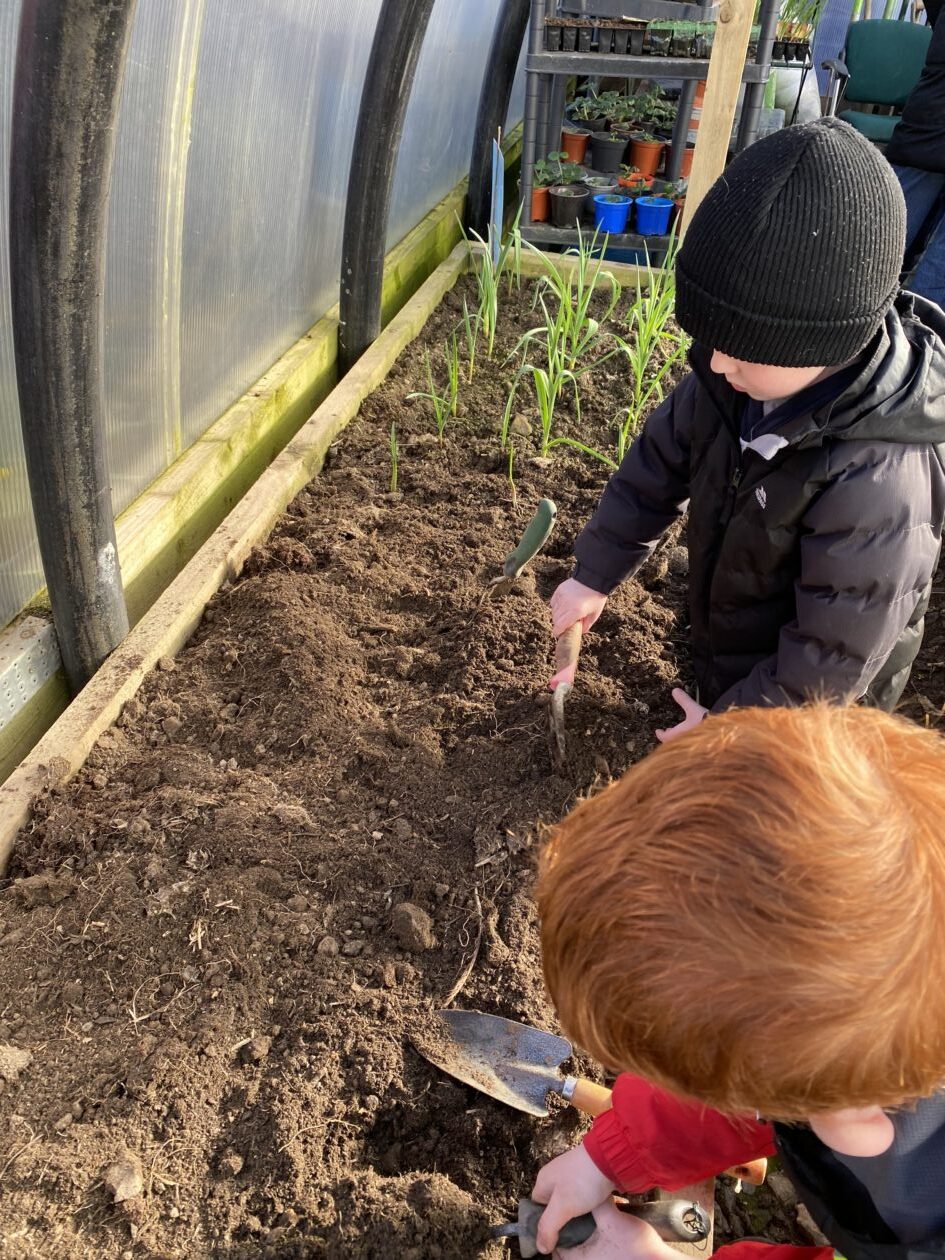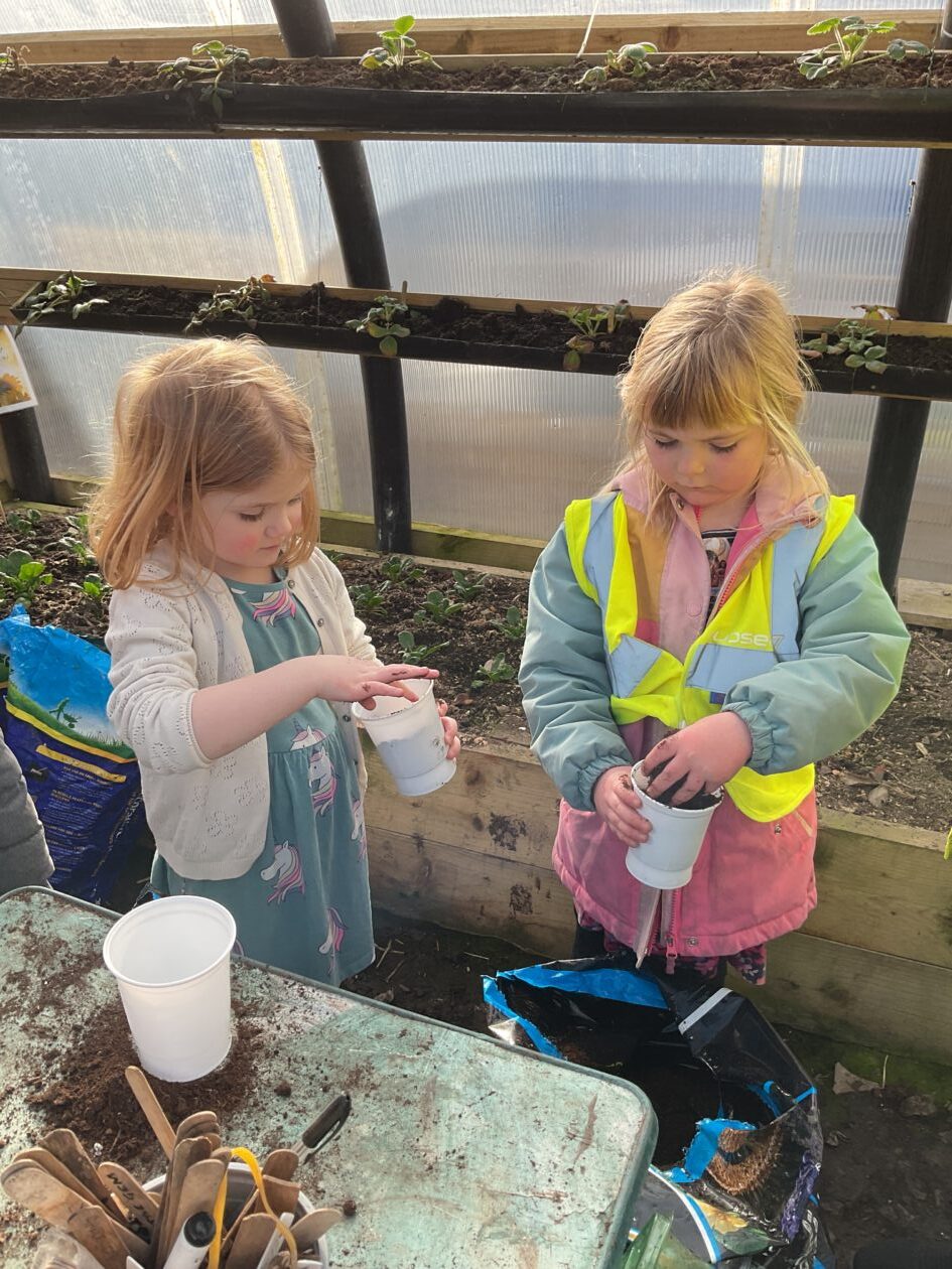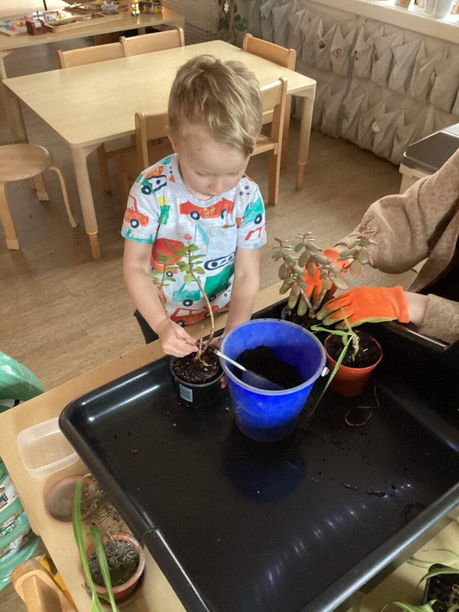 We noticed that some of the nursery plants had grown too big for their pots. The bairns put fresh soil into bigger pots and carefully repotted the plants. They gave them a big drink too.