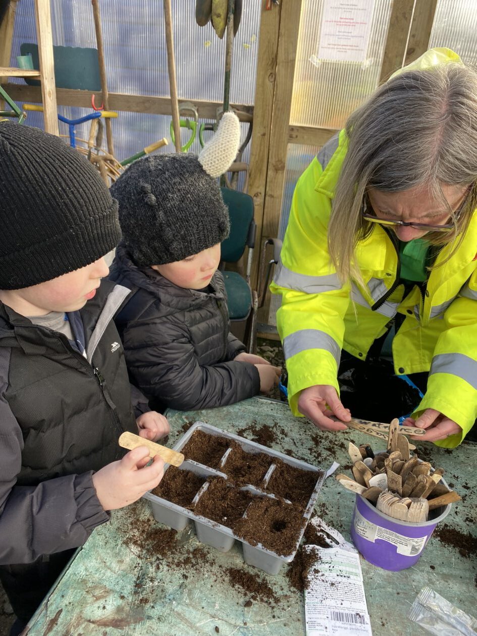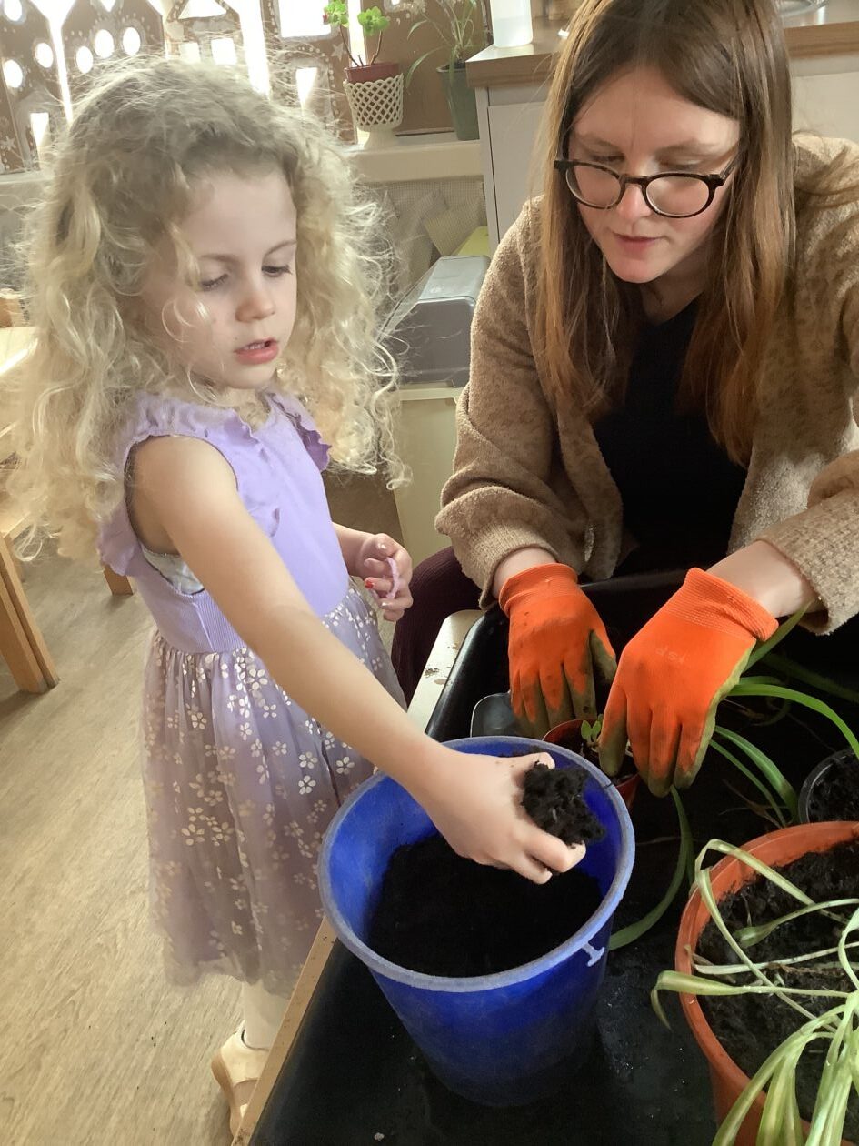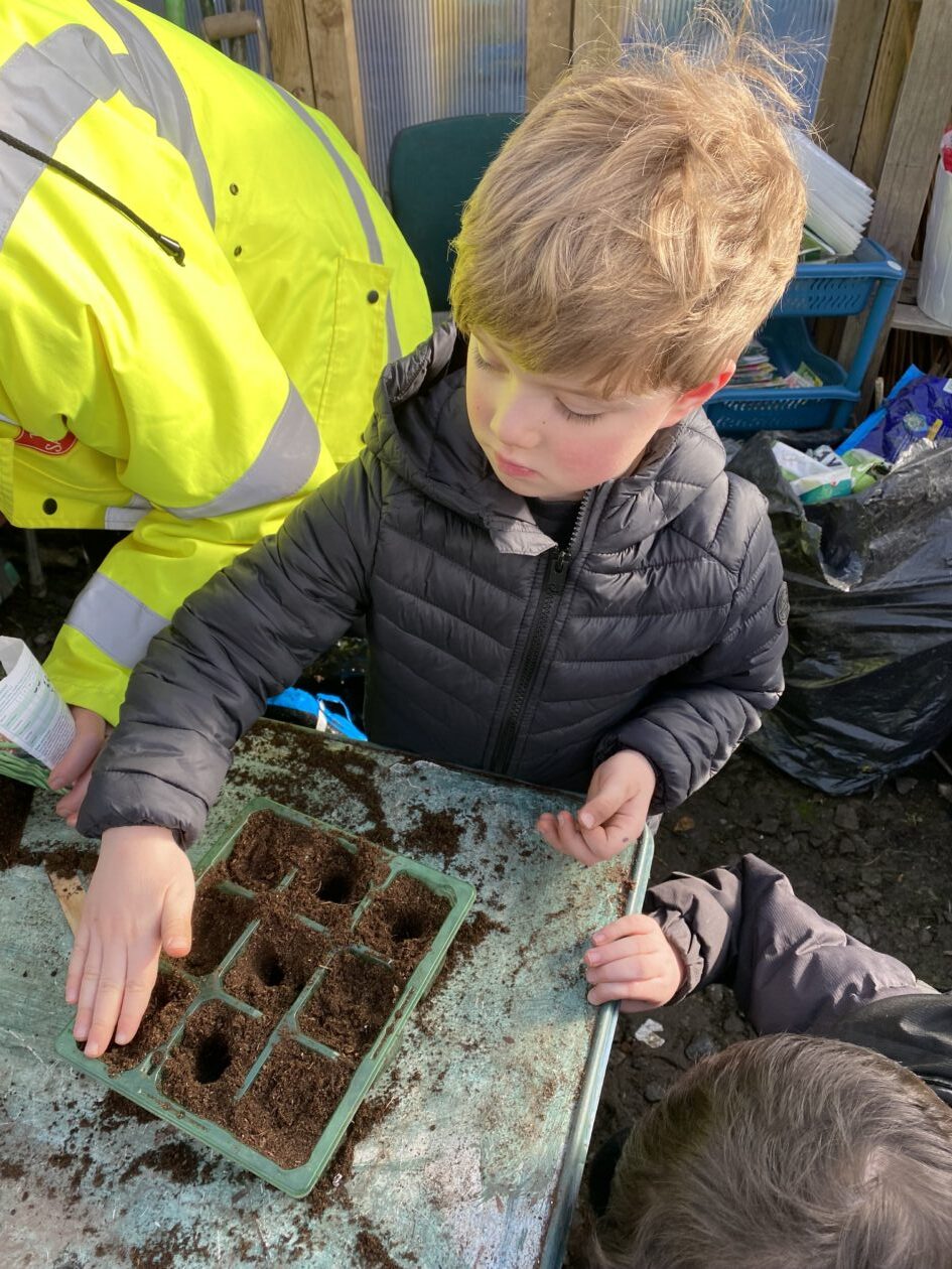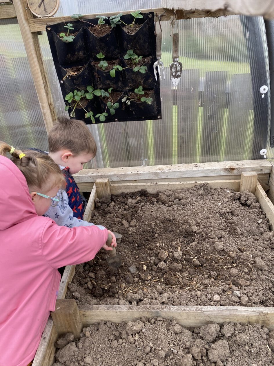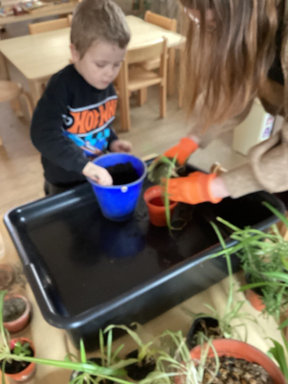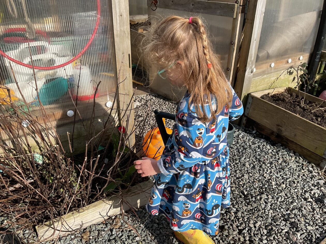 We noticed that some of the nursery plants had grown too big for their pots. The bairns put fresh soil into bigger pots and carefully repotted the plants. They gave them a big drink too.