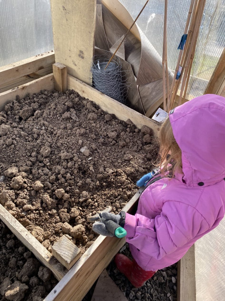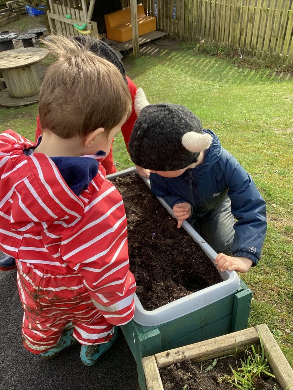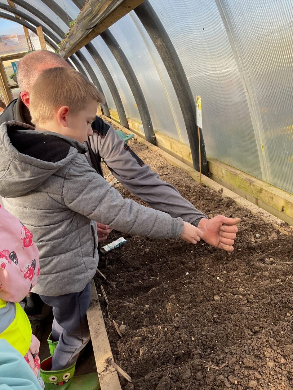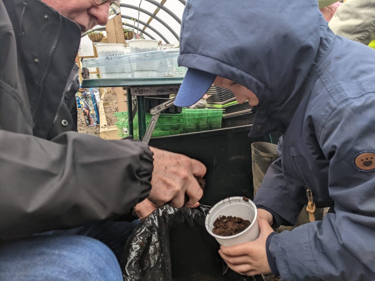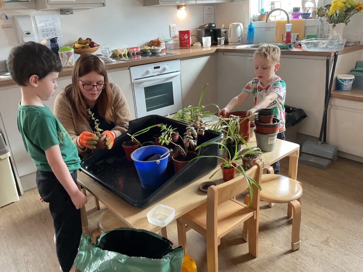We noticed that some of the nursery plants had grown too big for their pots. The bairns put fresh soil into bigger pots and carefully repotted the plants. They gave them a big drink too.