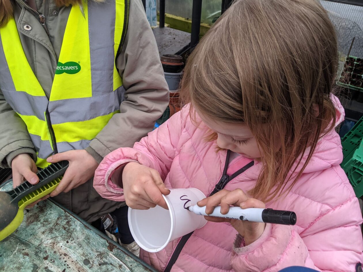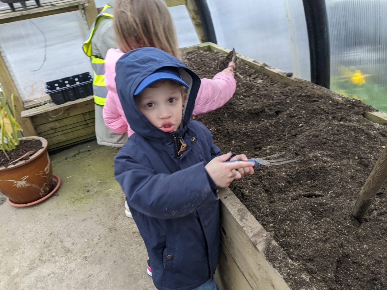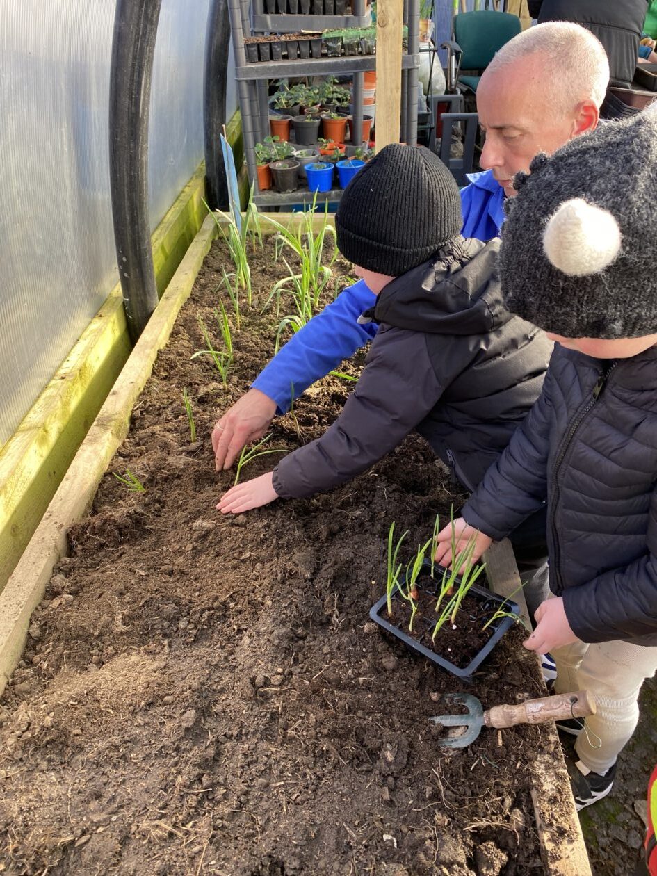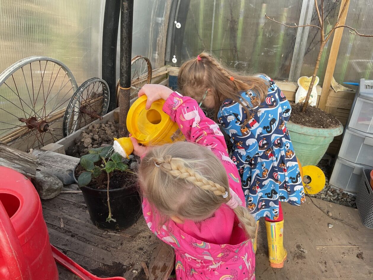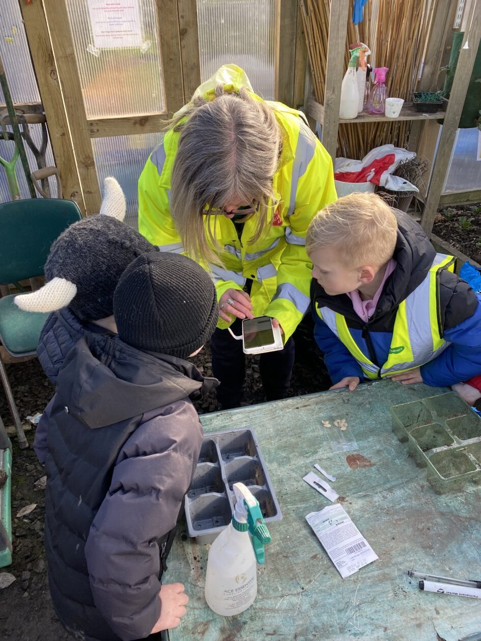 We noticed that some of the nursery plants had grown too big for their pots. The bairns put fresh soil into bigger pots and carefully repotted the plants. They gave them a big drink too.