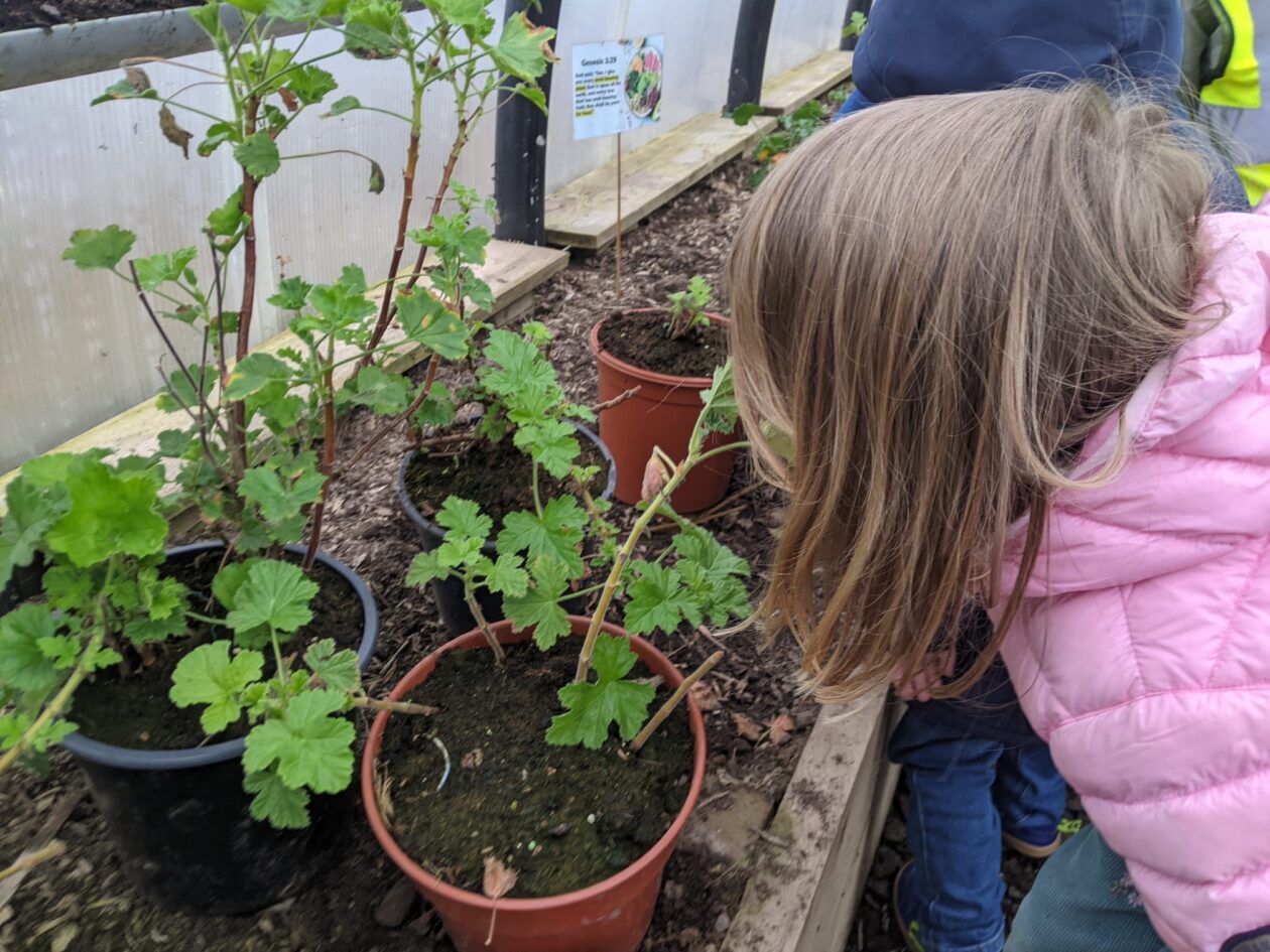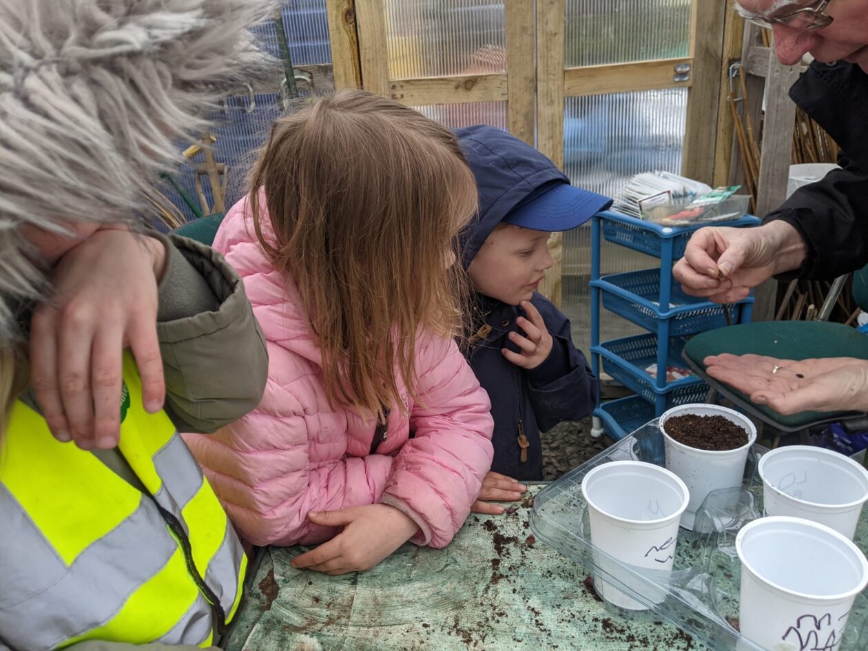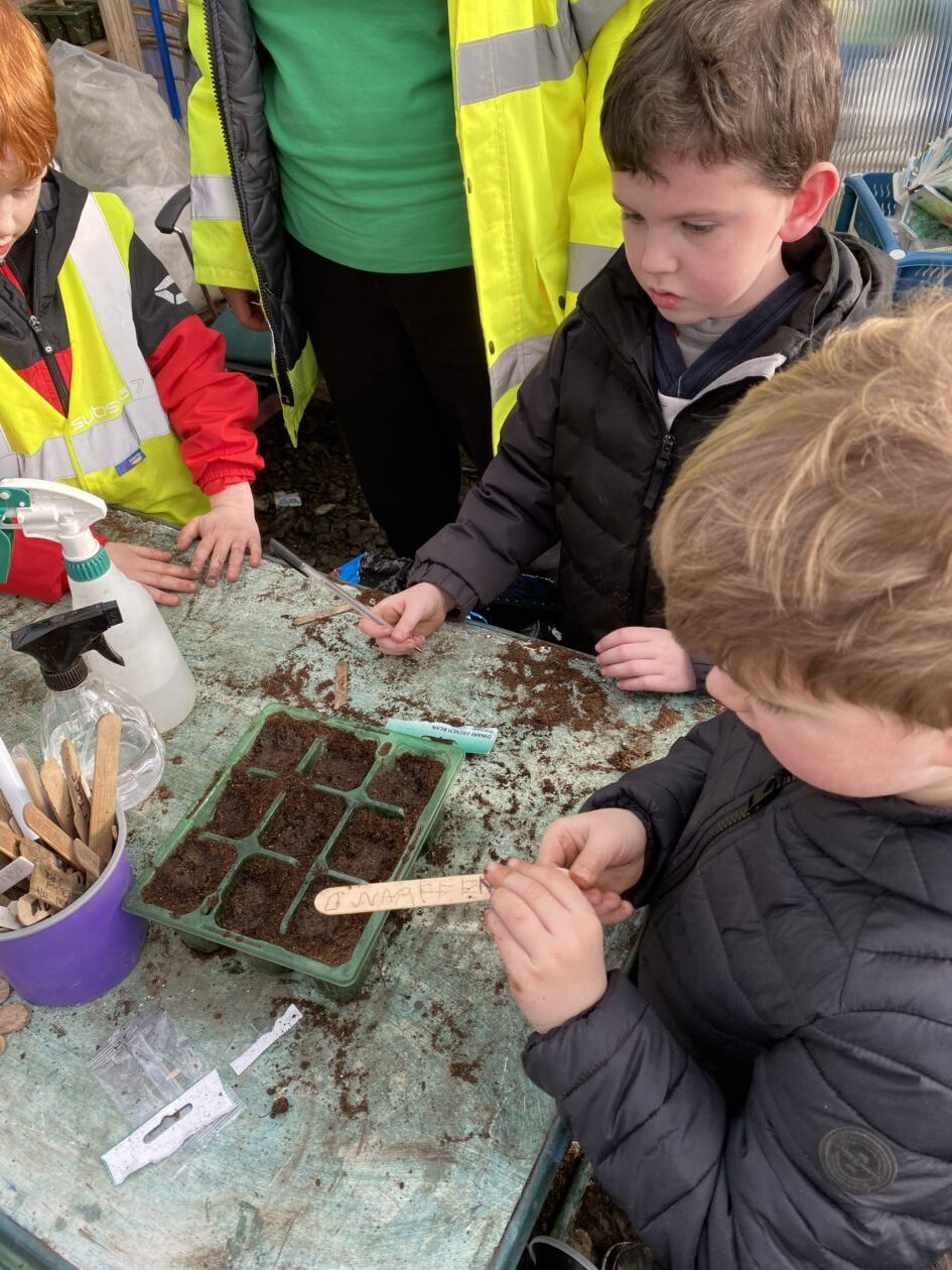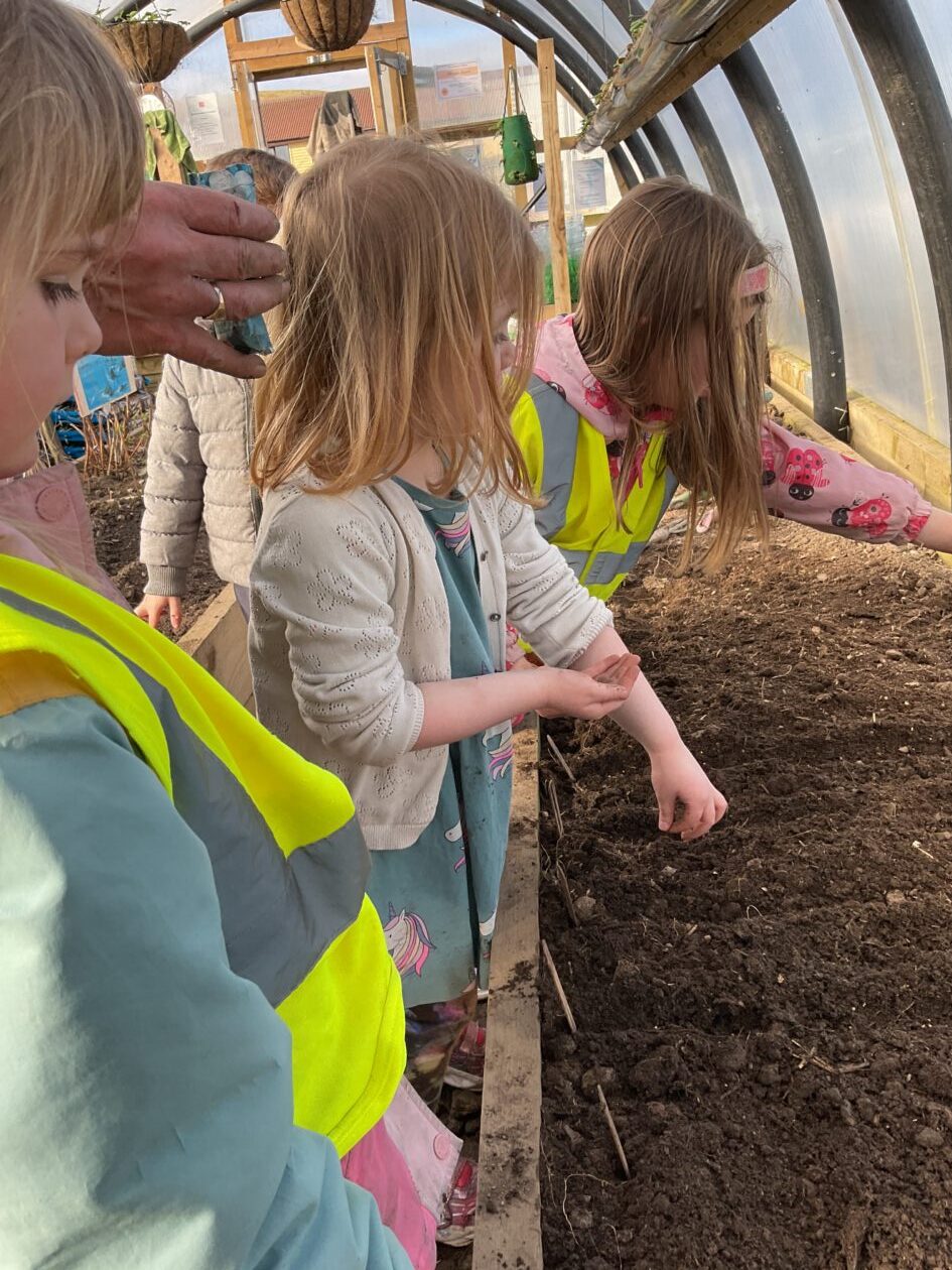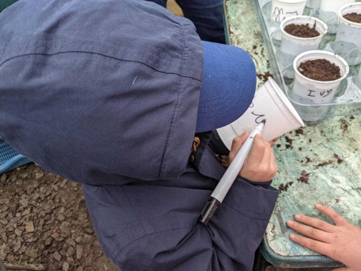 We noticed that some of the nursery plants had grown too big for their pots. The bairns put fresh soil into bigger pots and carefully repotted the plants. They gave them a big drink too.