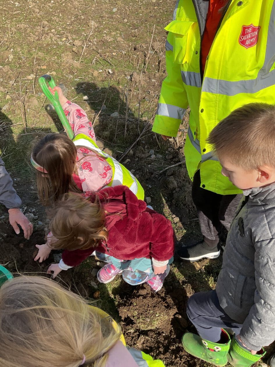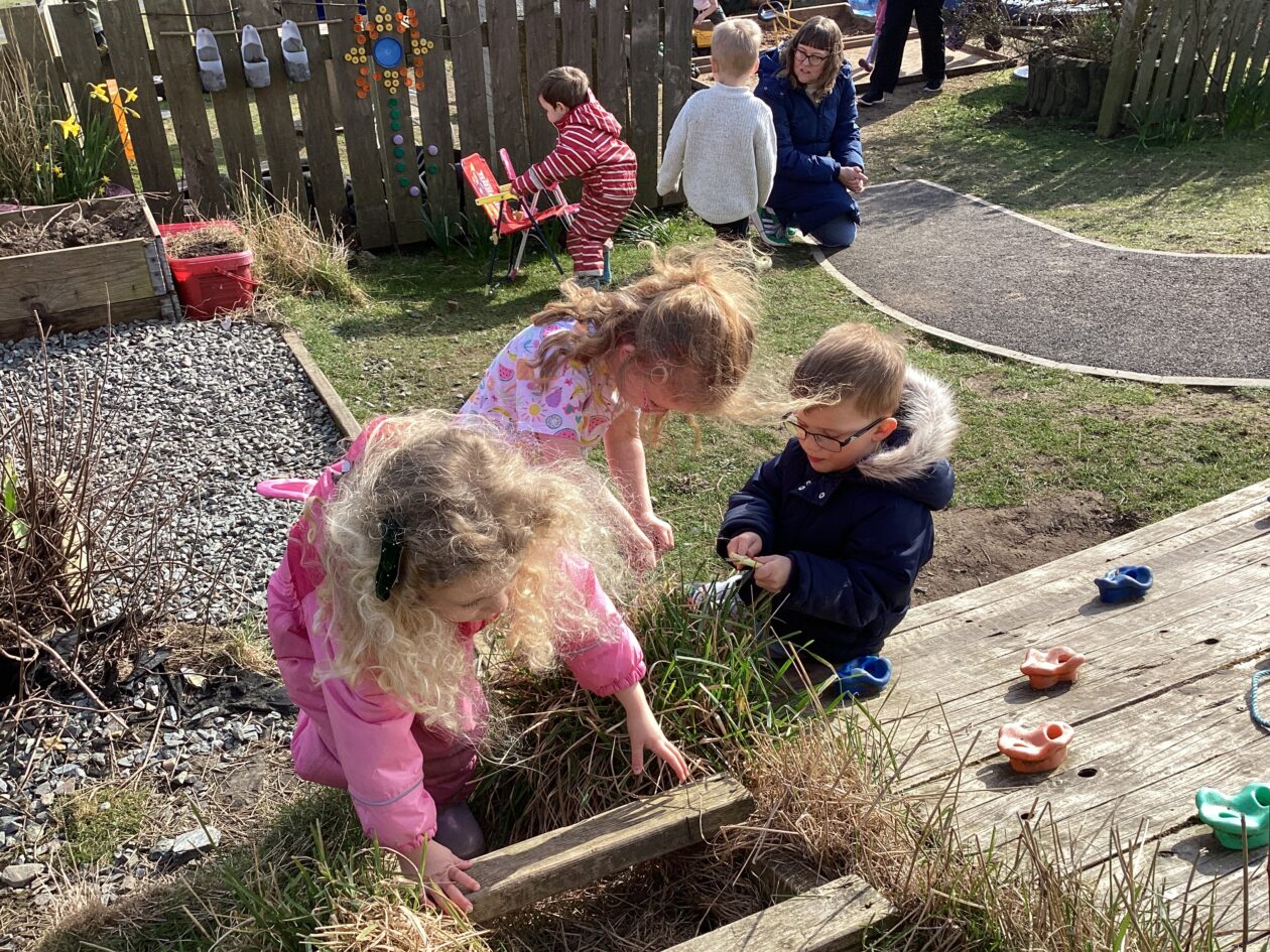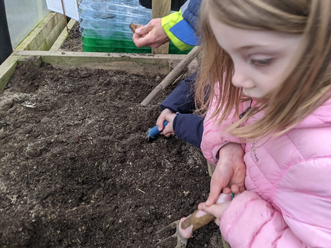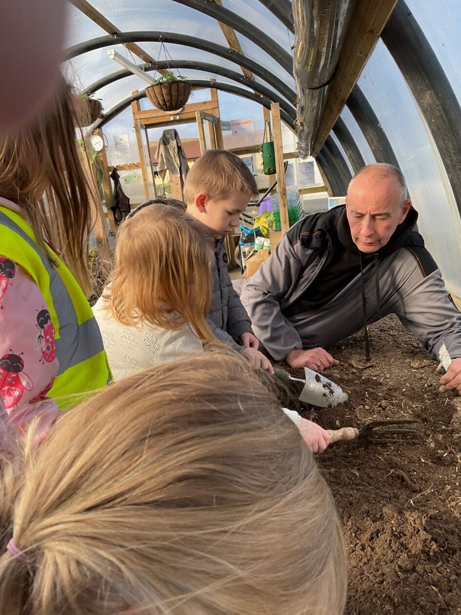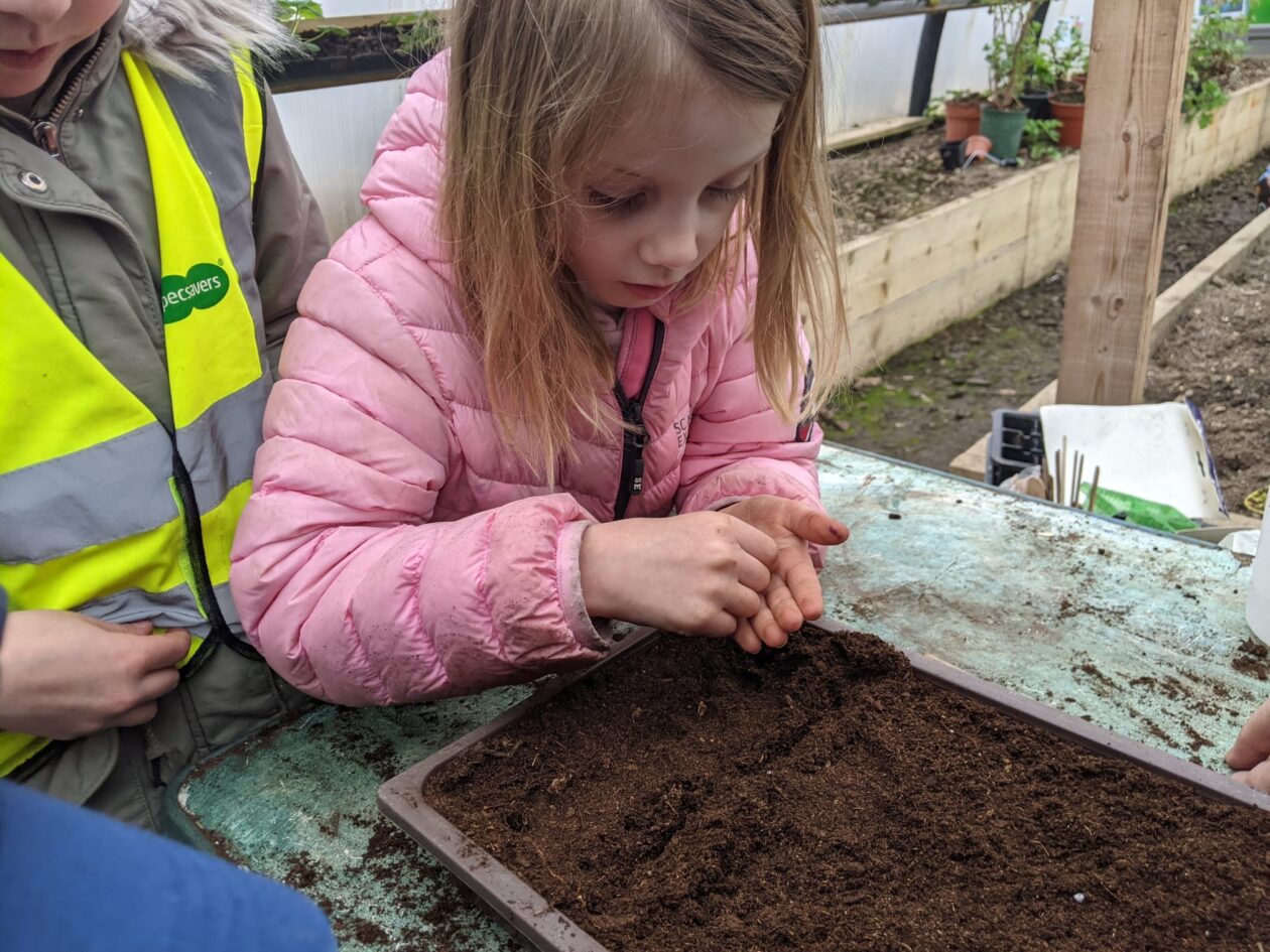 We noticed that some of the nursery plants had grown too big for their pots. The bairns put fresh soil into bigger pots and carefully repotted the plants. They gave them a big drink too.