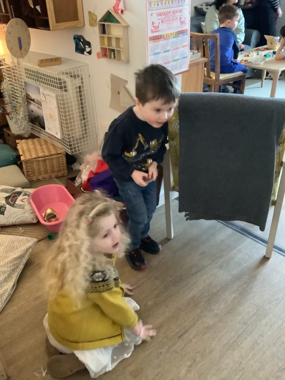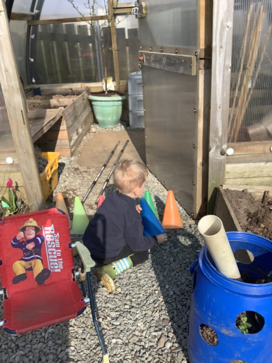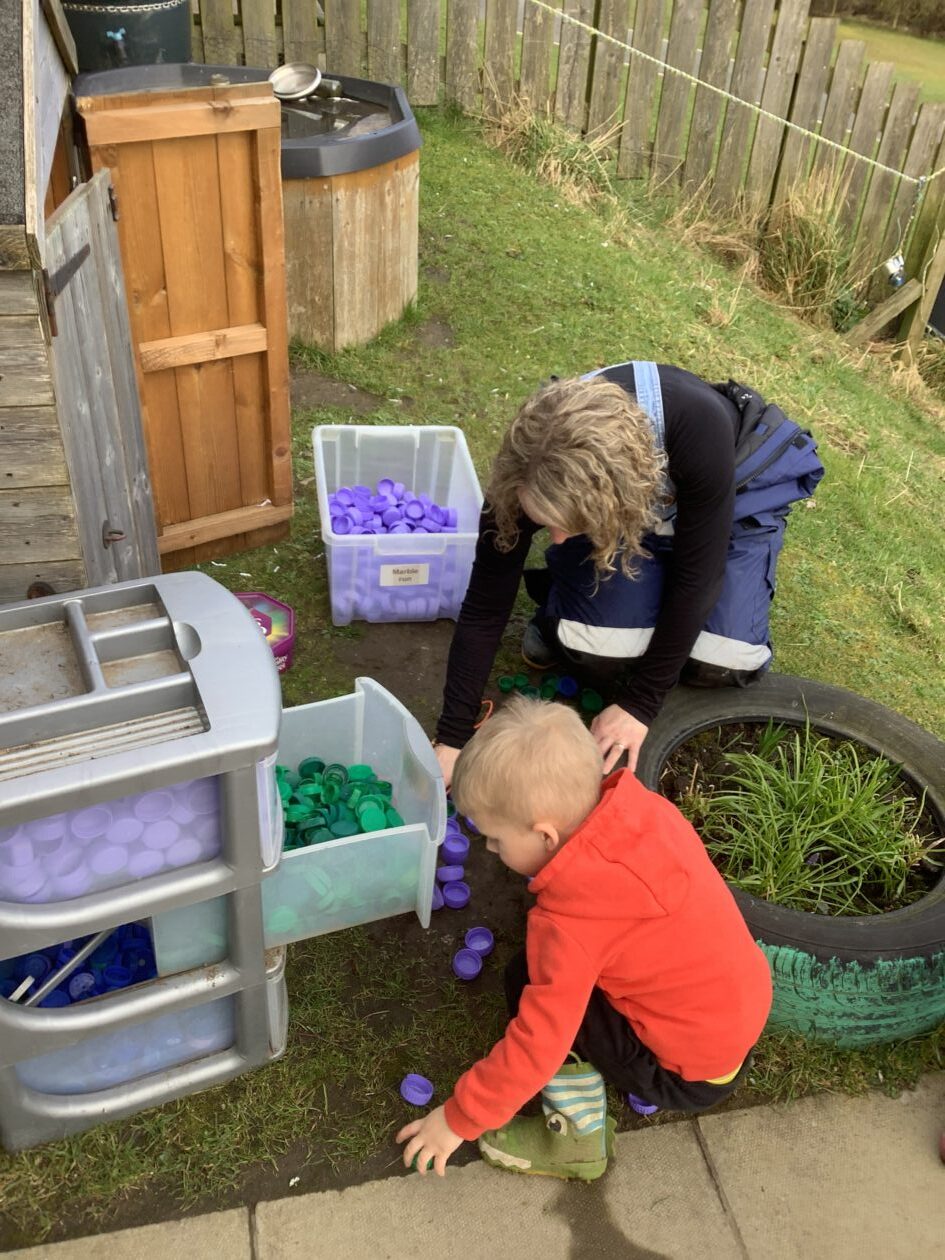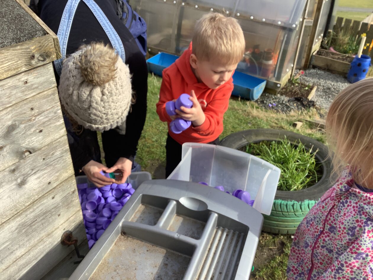 Here is a snippet of our outdoor play this week. The bairns created their own chasing game involving dragons, ghosts and zombies. We also had a cupboard clear out and sorted through hundreds of bottle tops, finding them a new home in the polycrub drawers.