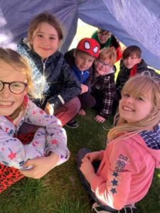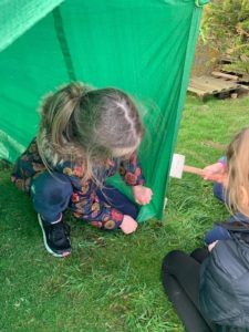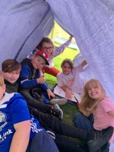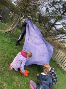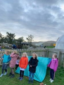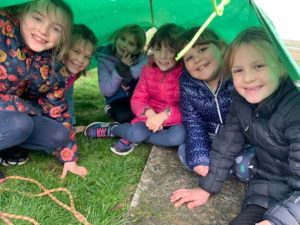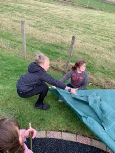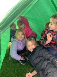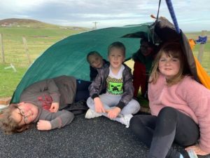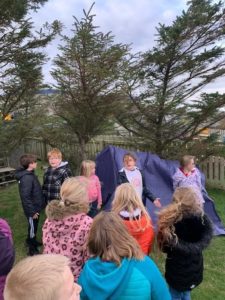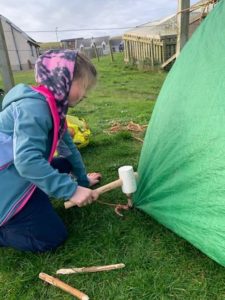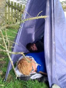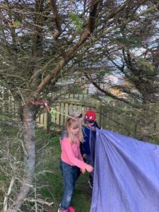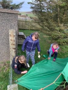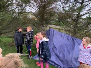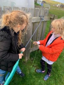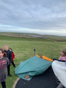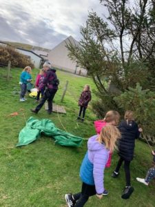 Kate Hookham was in Shetland delivering training on outdoor learning, and on Thursday she came to our school to spend some time with us!  The class headed outside for some den-building fun.  This was awesome as not only did we learn about tarp designs and hitches, we also developed our teamwork and problem solving skills.  It was loads of fun!