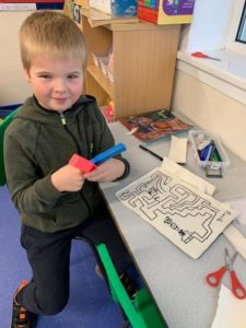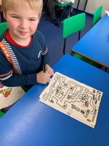 In week 4 we learned about magnets and magnetism.  This was the basis of our Discovery Club project for the week – to design and make a game that can be played with a magnet! The class really embraced this challenge, and came up with such fun and imaginative takes on the theme.  We had exciting mazes, race course tracks, board games and fishing games!