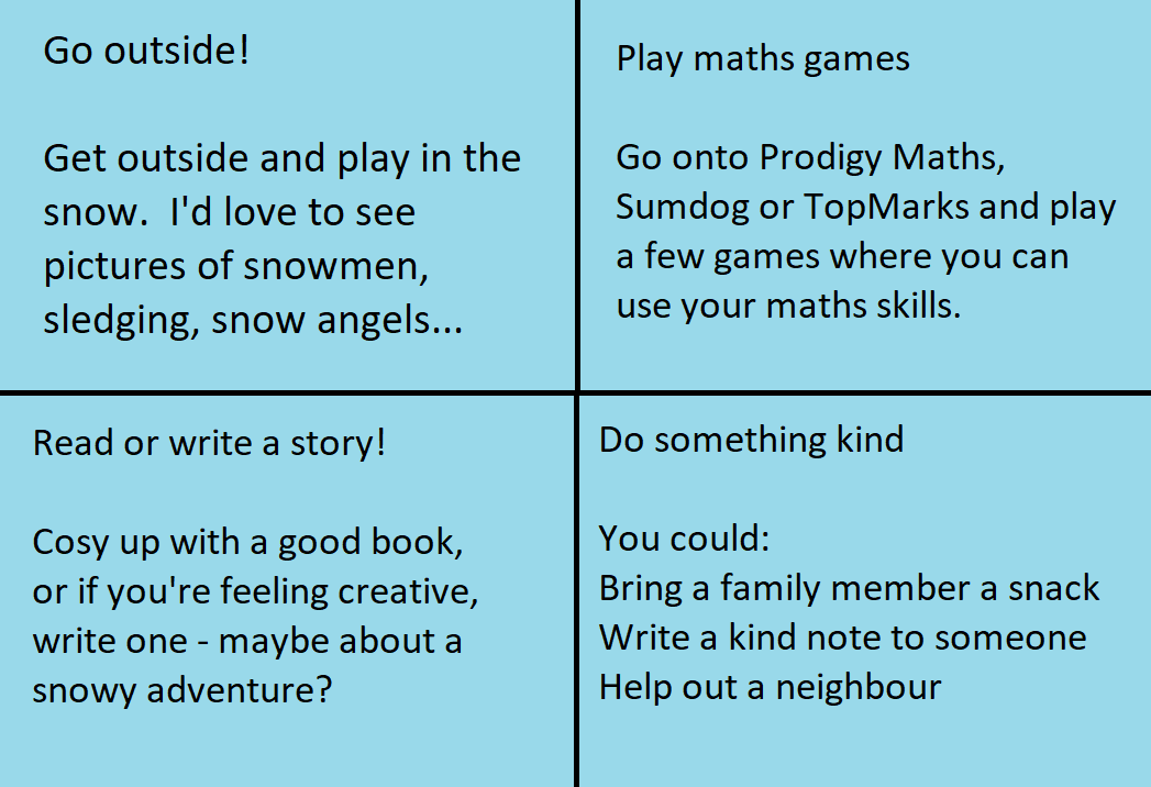 Click below to see a learning grid for today – try to have a go at these activities throughout the day, but I really hope you also manage to get outside and enjoy the snow!