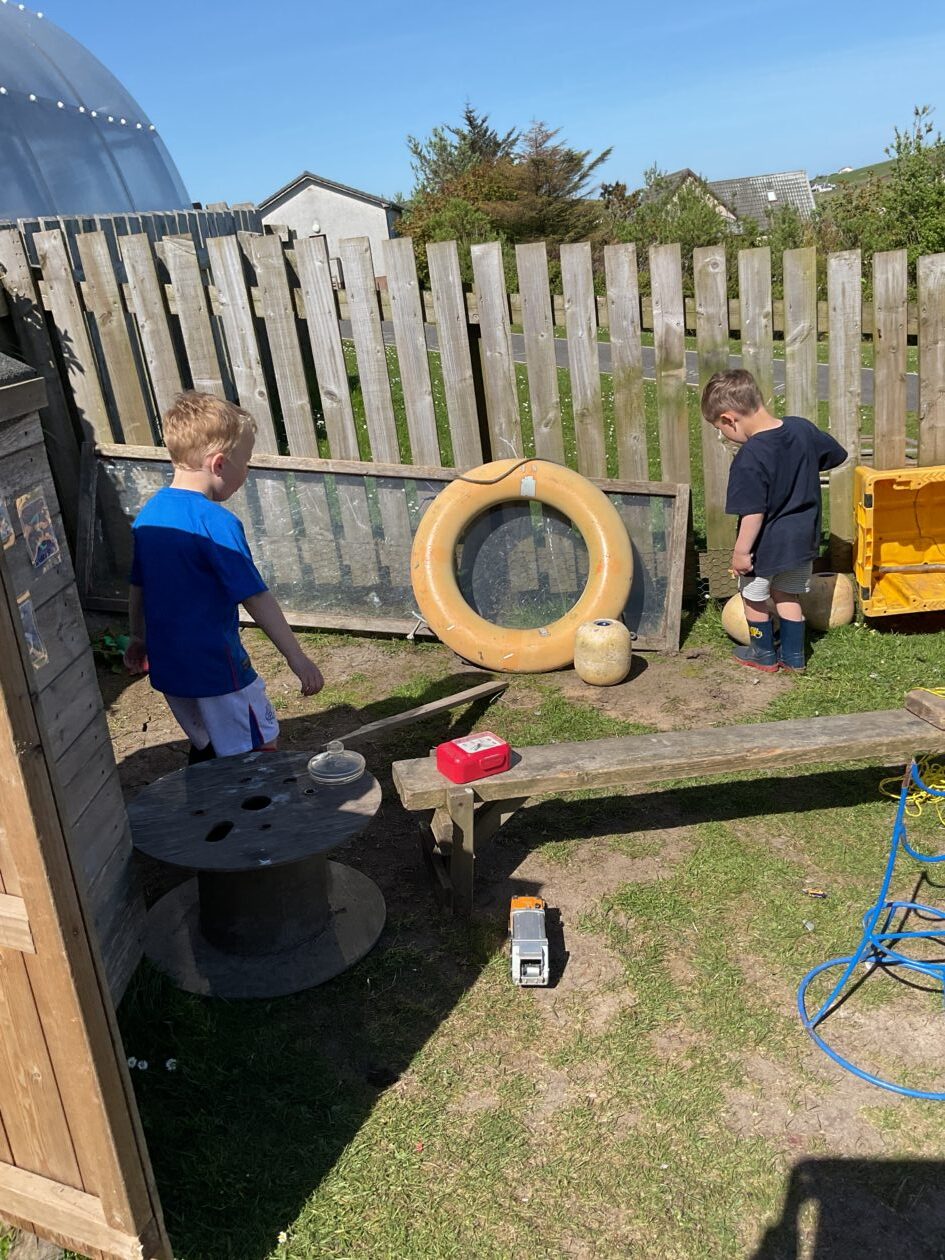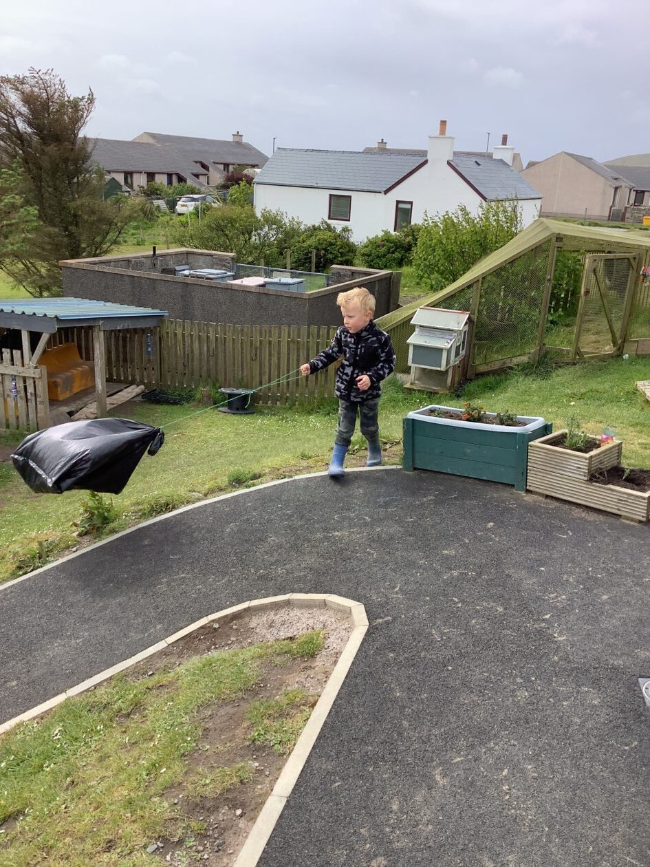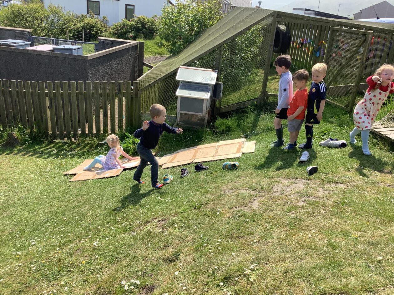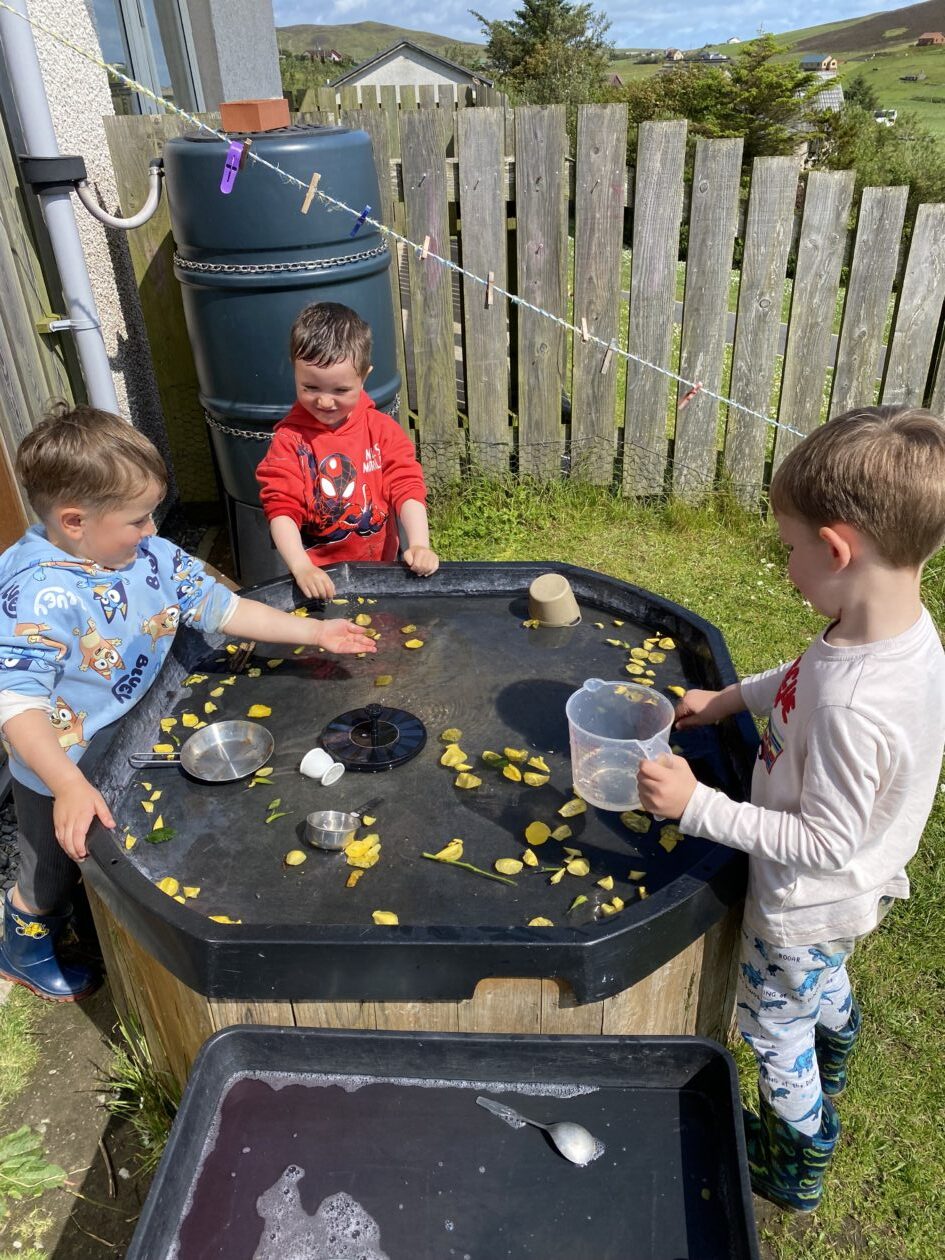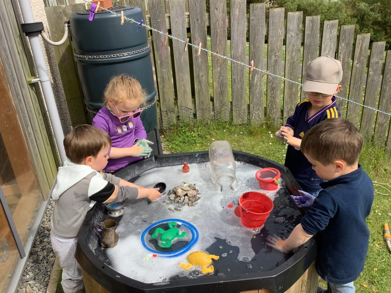 The bairns have been experimenting with different ways to slide down the steep hill in the garden. They have used cardboard, cushions, carpet tiles and slithery breeks! We have also seen lots of engagement with water play and managed to get the solar fountain working as the sun made a bit of a reappearance. We headed to the playpark one afternoon too and the bairns played chasing games, spun on the swings, tried to walk up the slide and got wobbly as jelly on a plate.