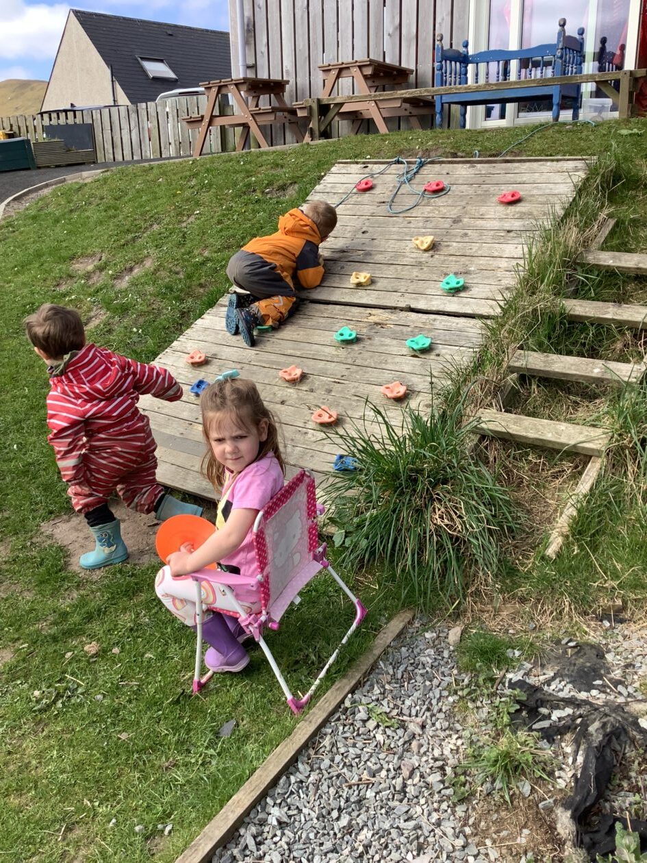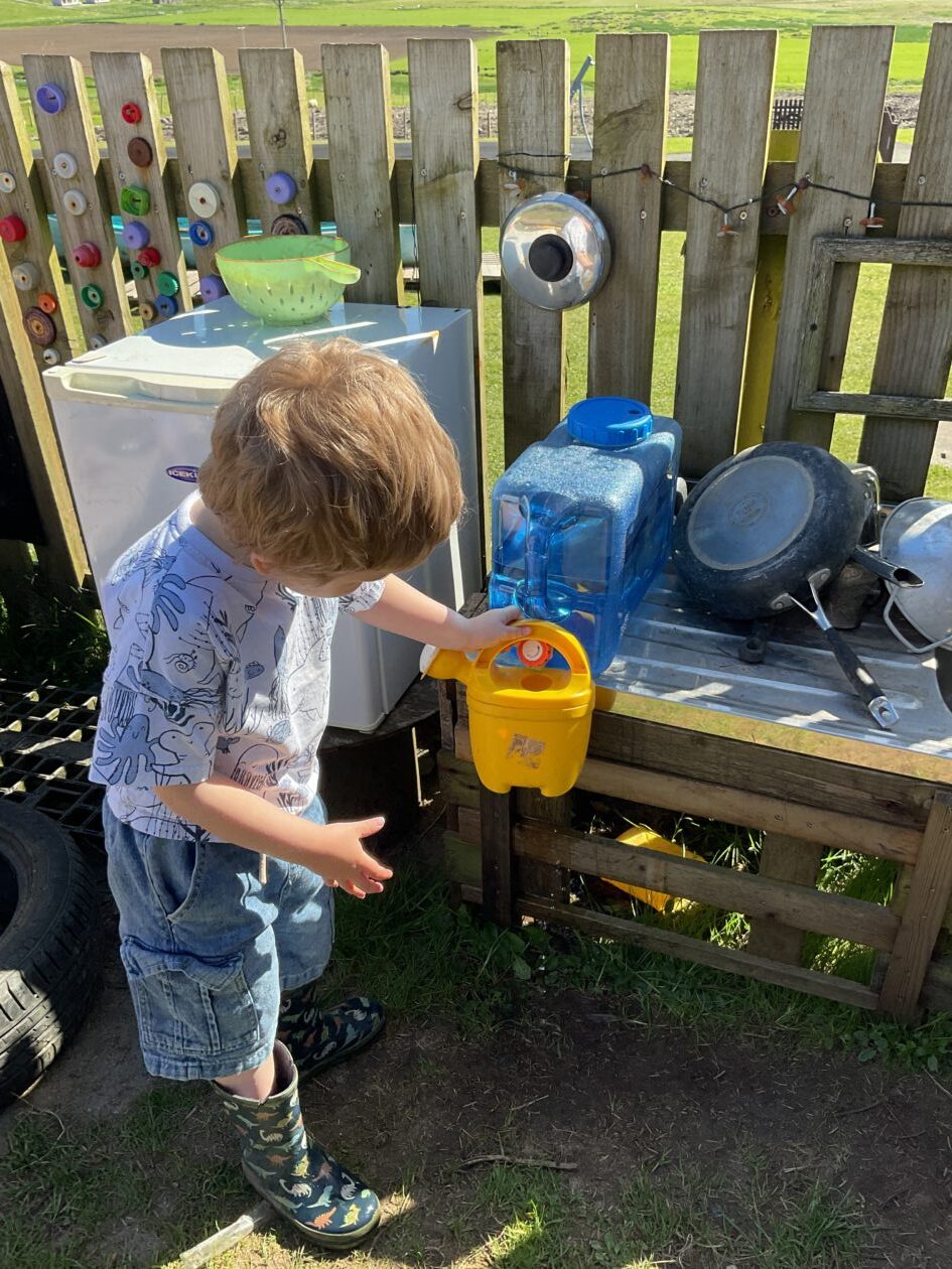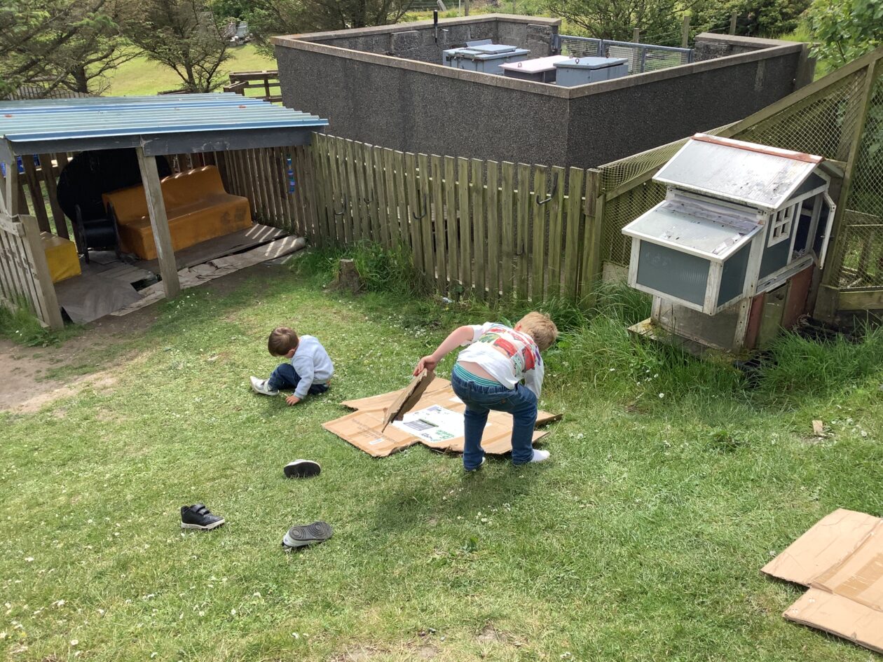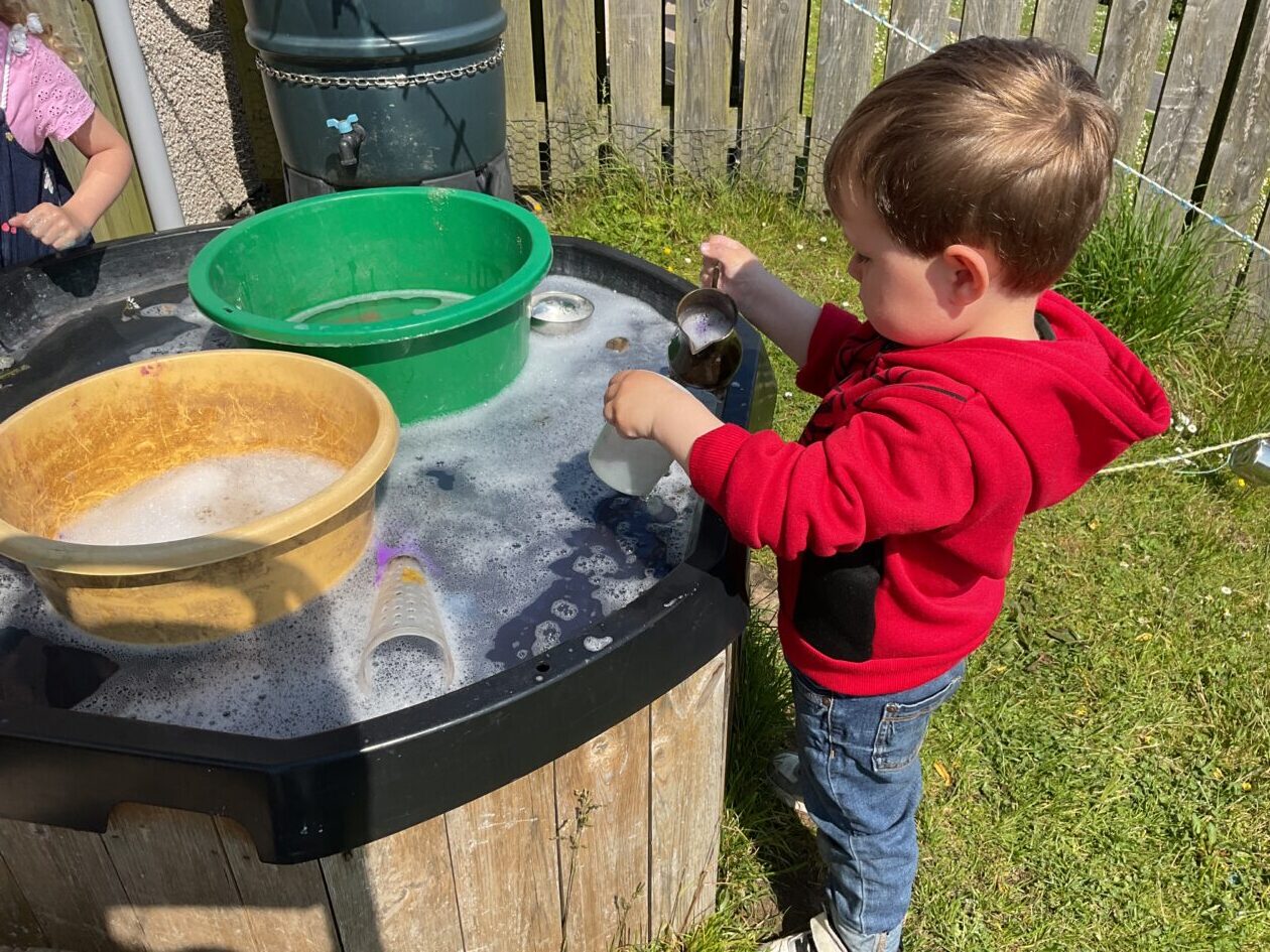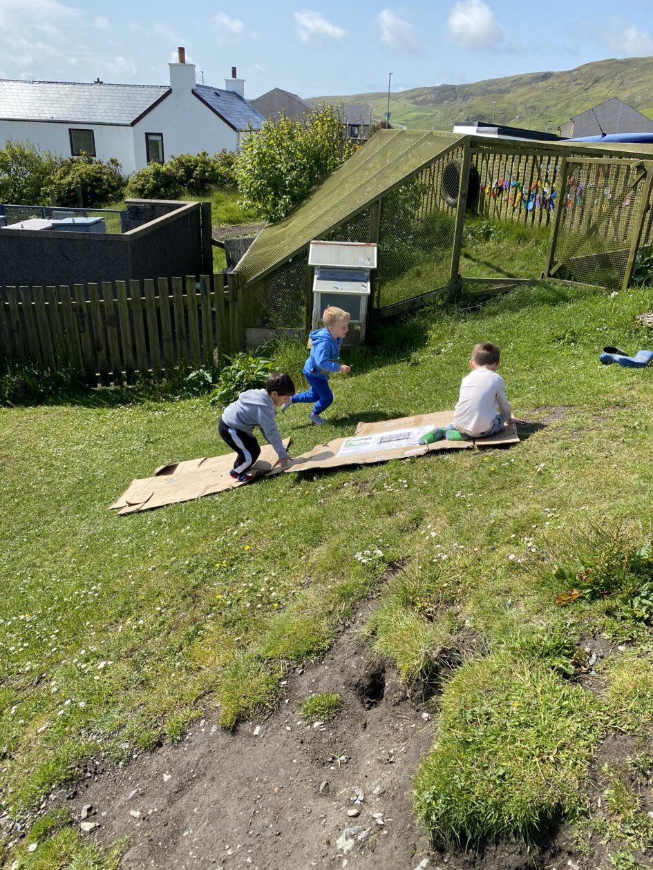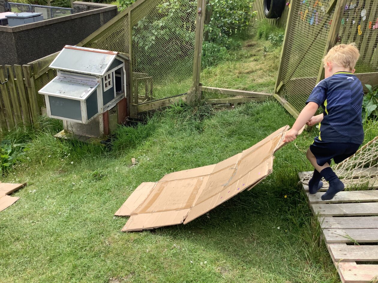 The bairns have been experimenting with different ways to slide down the steep hill in the garden. They have used cardboard, cushions, carpet tiles and slithery breeks! We have also seen lots of engagement with water play and managed to get the solar fountain working as the sun made a bit of a reappearance. We headed to the playpark one afternoon too and the bairns played chasing games, spun on the swings, tried to walk up the slide and got wobbly as jelly on a plate.