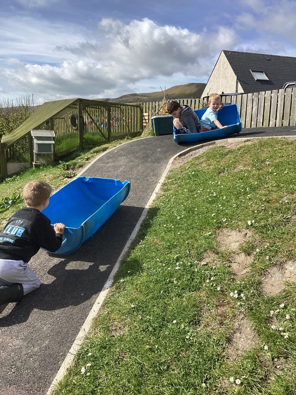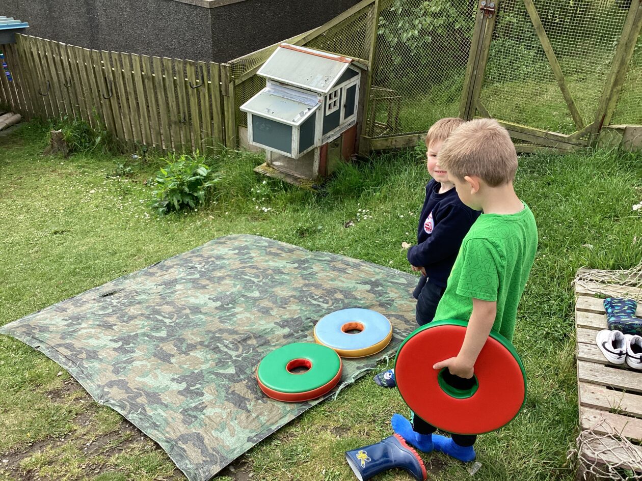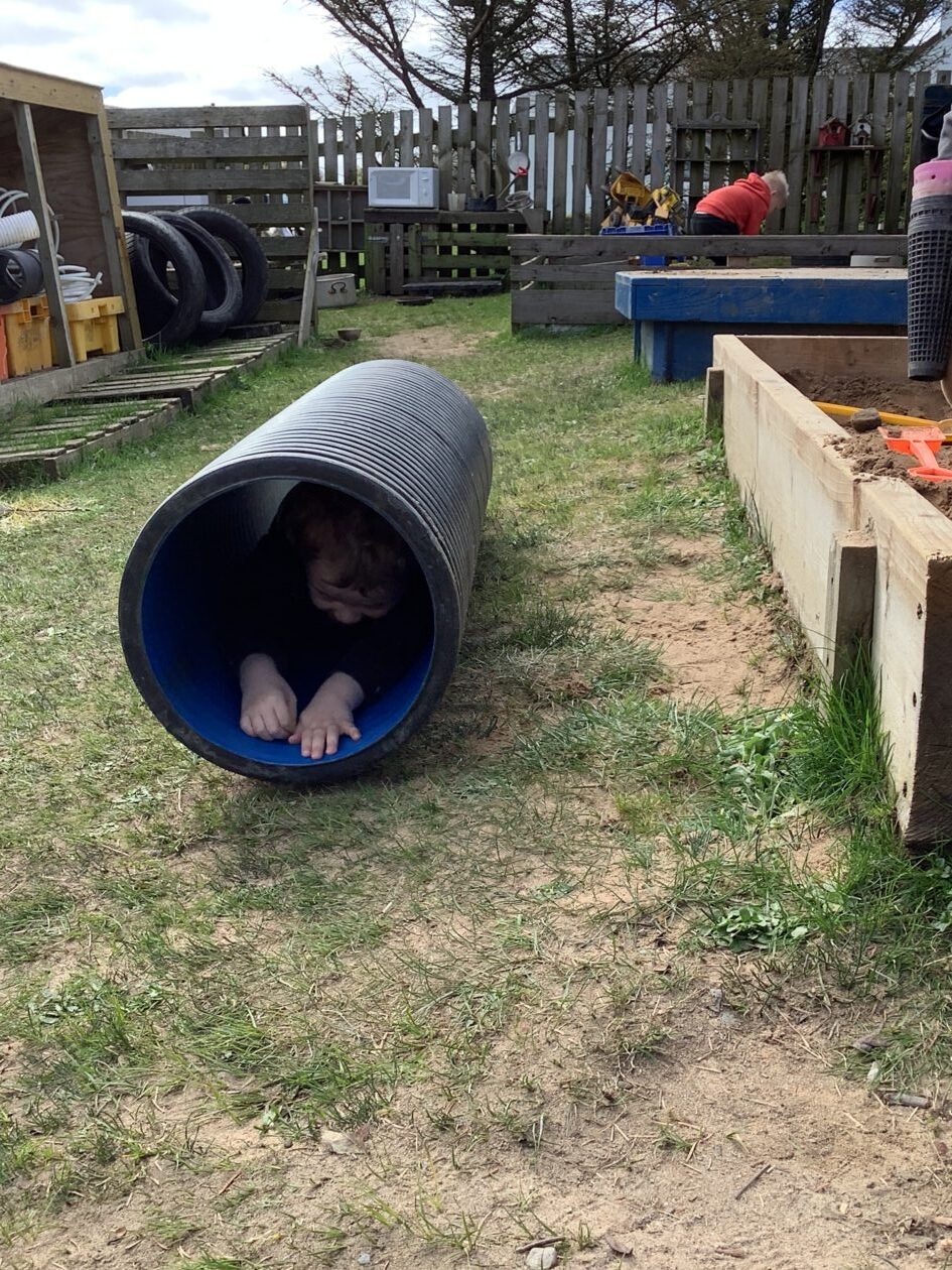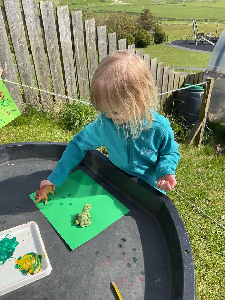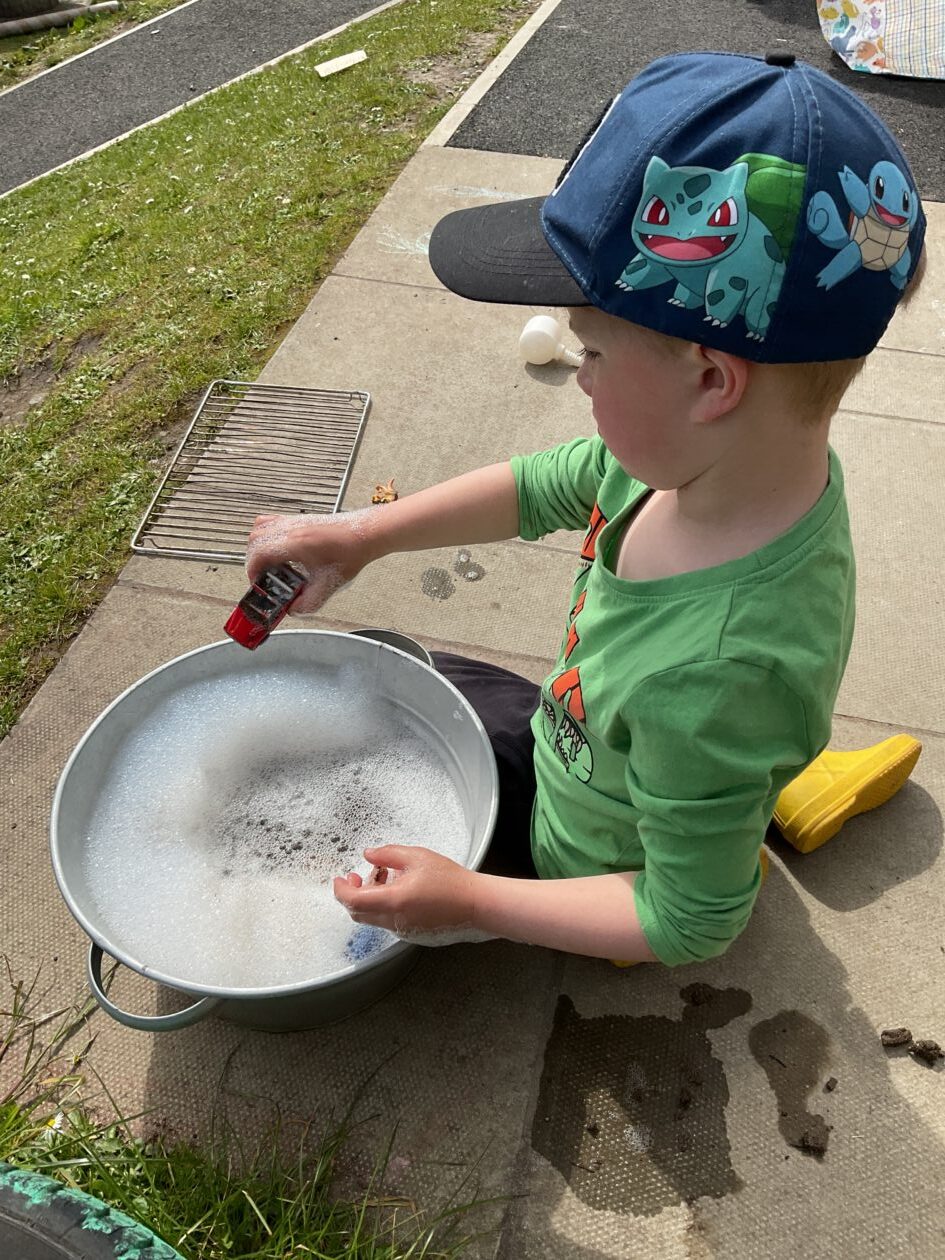 The bairns have been experimenting with different ways to slide down the steep hill in the garden. They have used cardboard, cushions, carpet tiles and slithery breeks! We have also seen lots of engagement with water play and managed to get the solar fountain working as the sun made a bit of a reappearance. We headed to the playpark one afternoon too and the bairns played chasing games, spun on the swings, tried to walk up the slide and got wobbly as jelly on a plate.