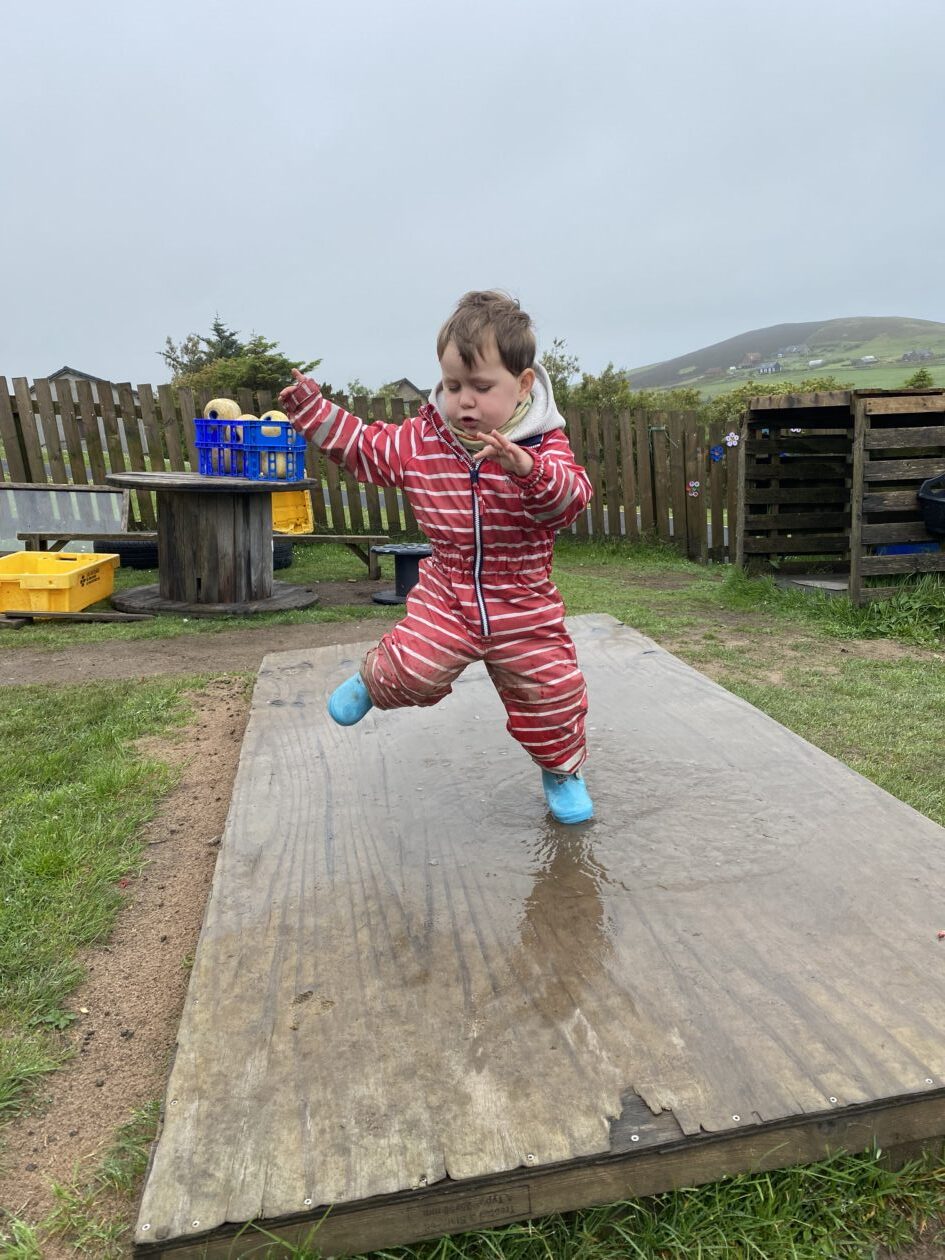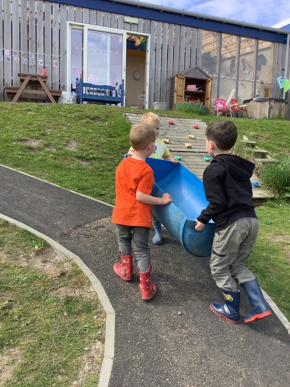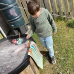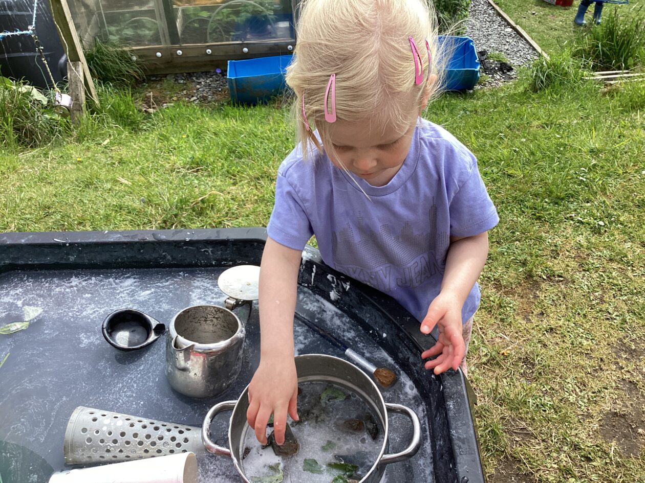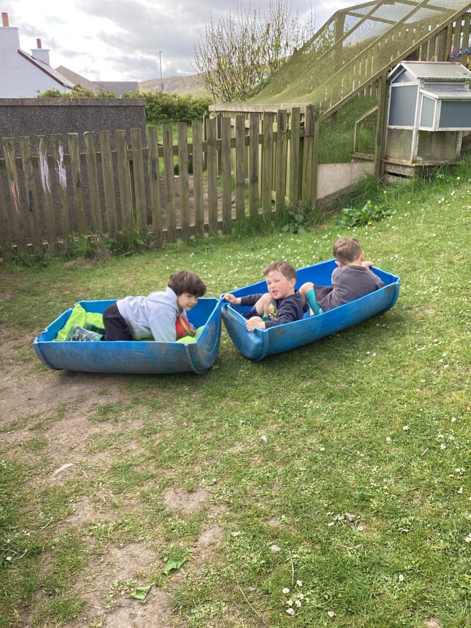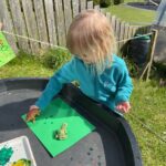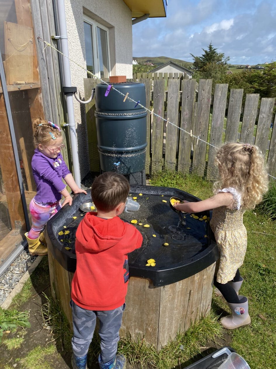 The bairns have been experimenting with different ways to slide down the steep hill in the garden. They have used cardboard, cushions, carpet tiles and slithery breeks! We have also seen lots of engagement with water play and managed to get the solar fountain working as the sun made a bit of a reappearance. We headed to the playpark one afternoon too and the bairns played chasing games, spun on the swings, tried to walk up the slide and got wobbly as jelly on a plate.