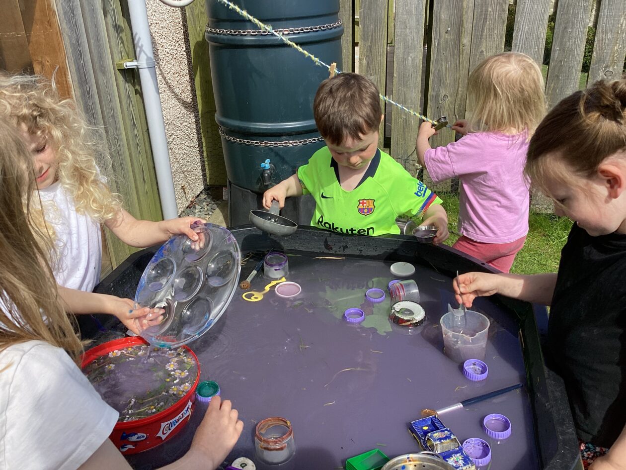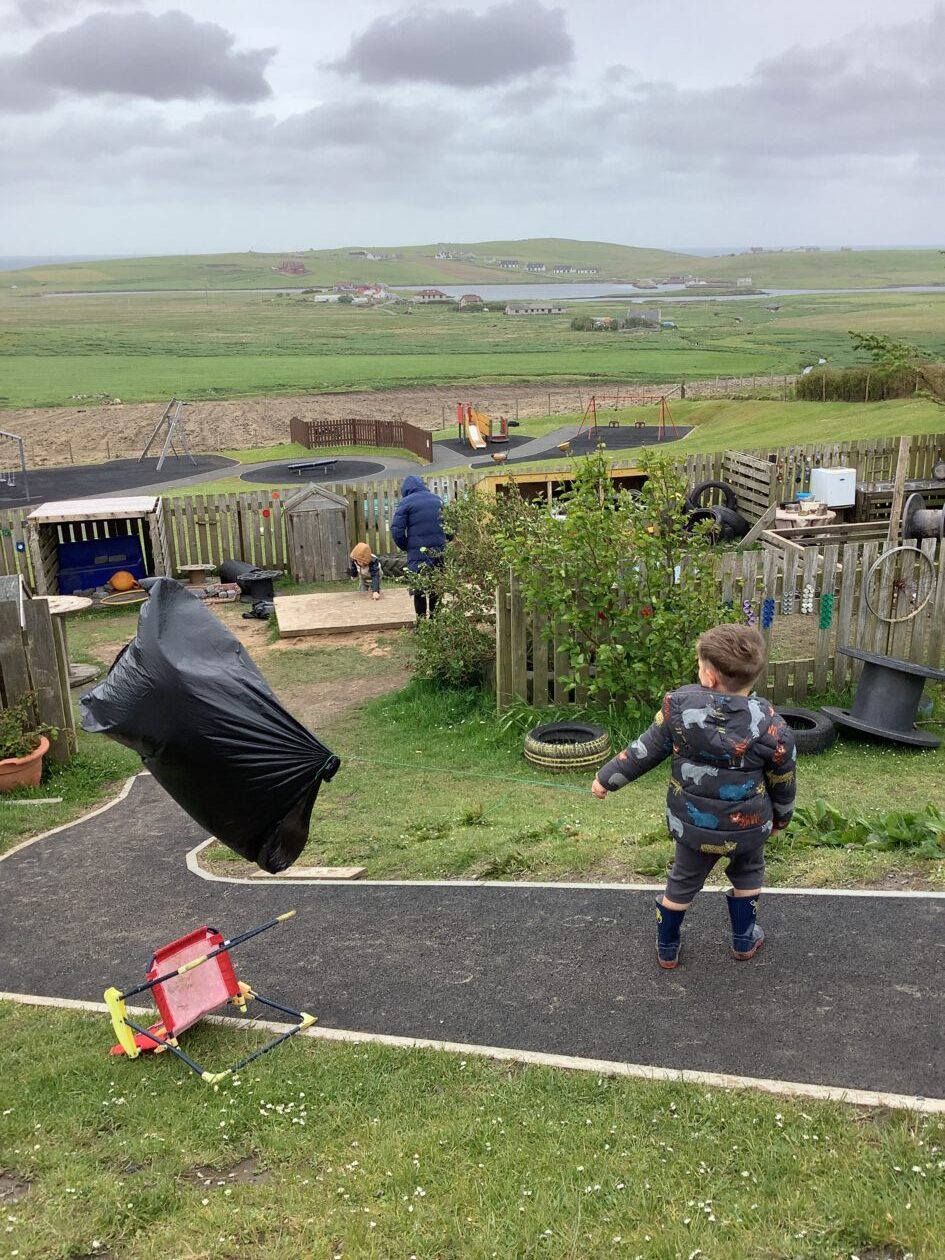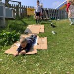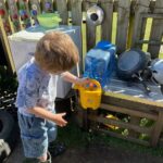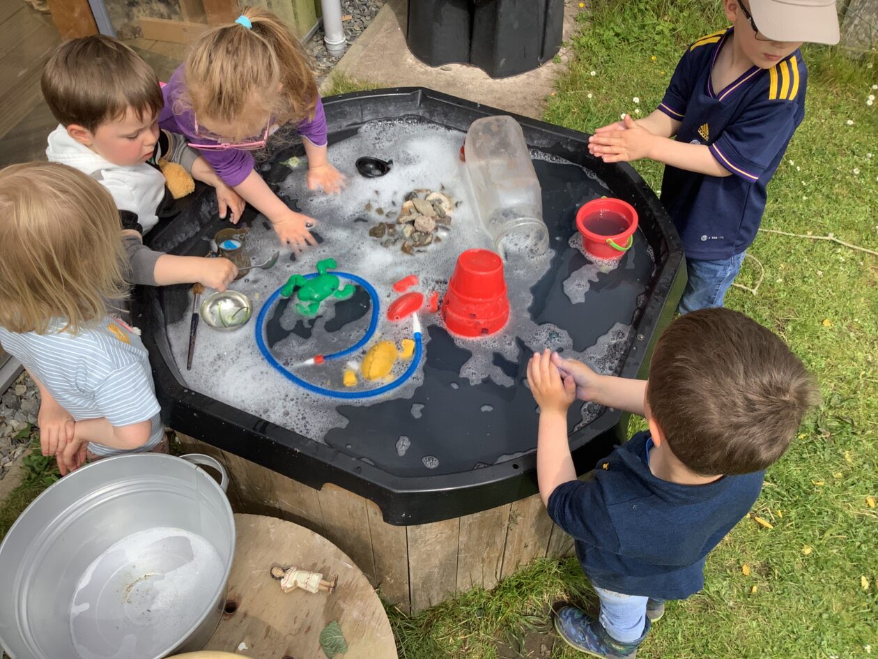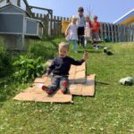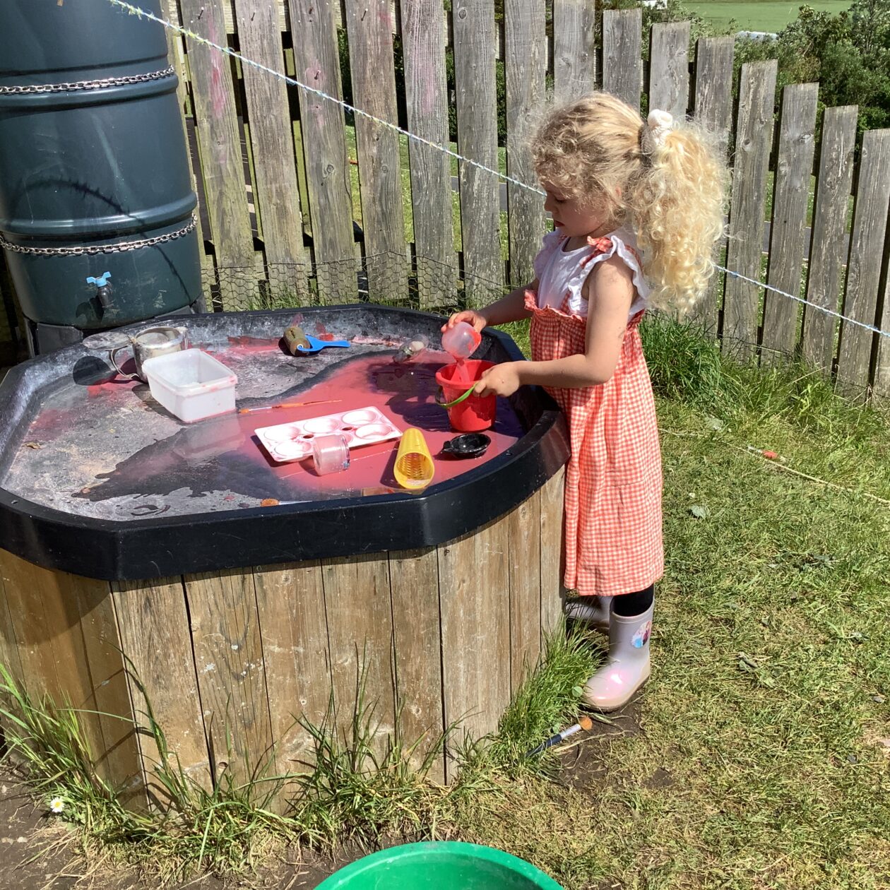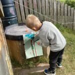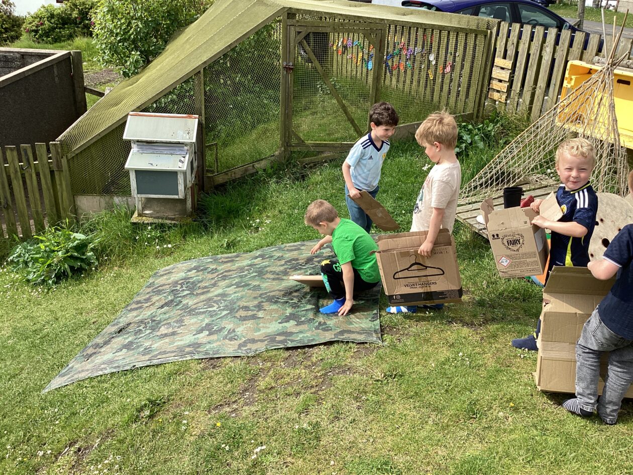 The bairns have been experimenting with different ways to slide down the steep hill in the garden. They have used cardboard, cushions, carpet tiles and slithery breeks! We have also seen lots of engagement with water play and managed to get the solar fountain working as the sun made a bit of a reappearance. We headed to the playpark one afternoon too and the bairns played chasing games, spun on the swings, tried to walk up the slide and got wobbly as jelly on a plate.