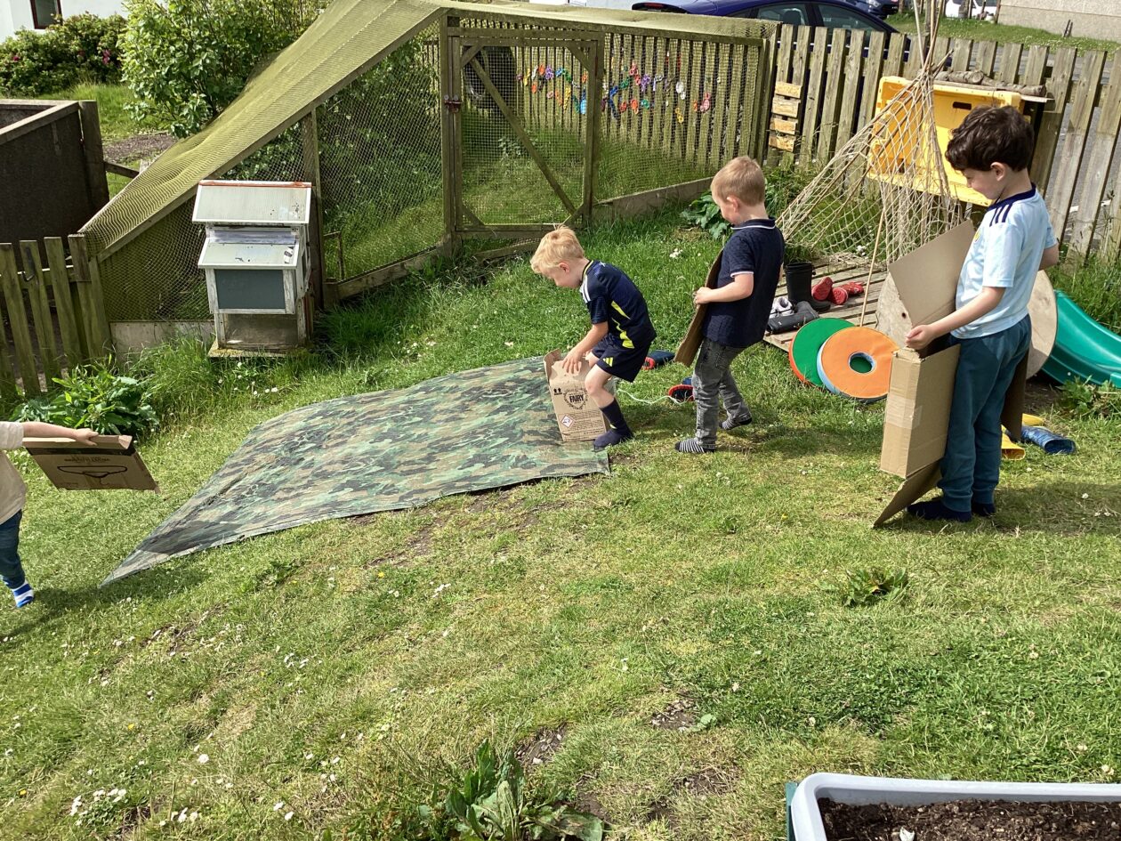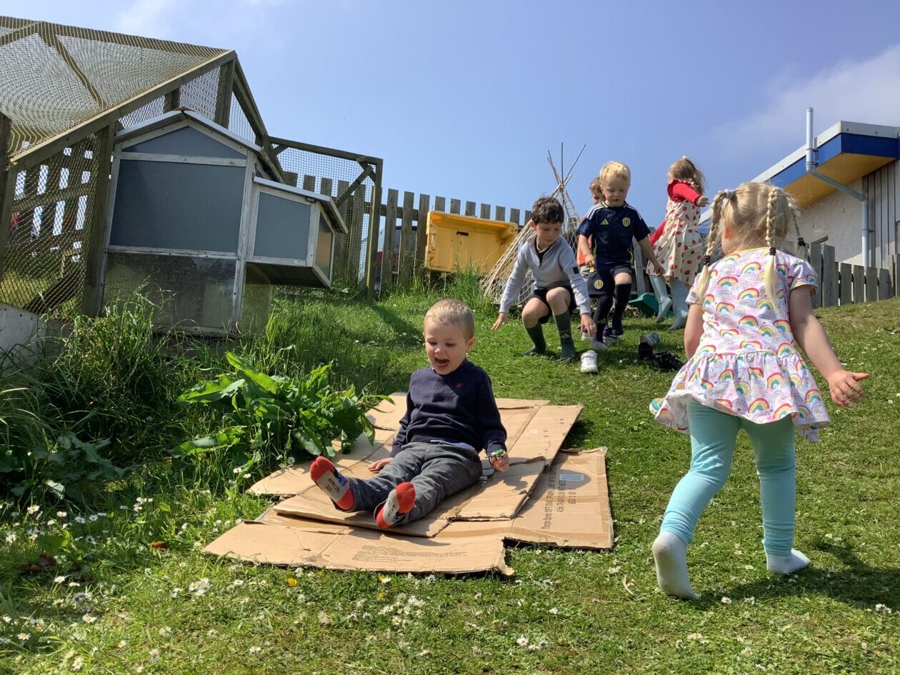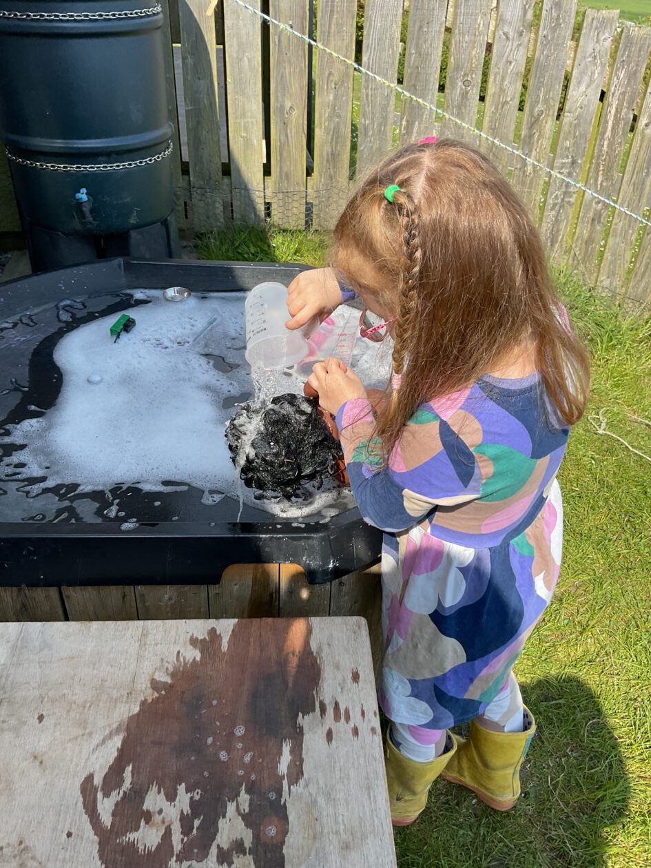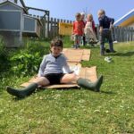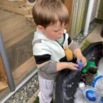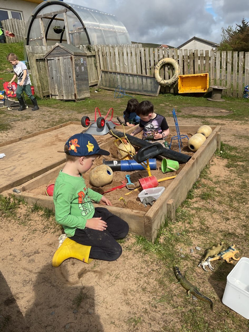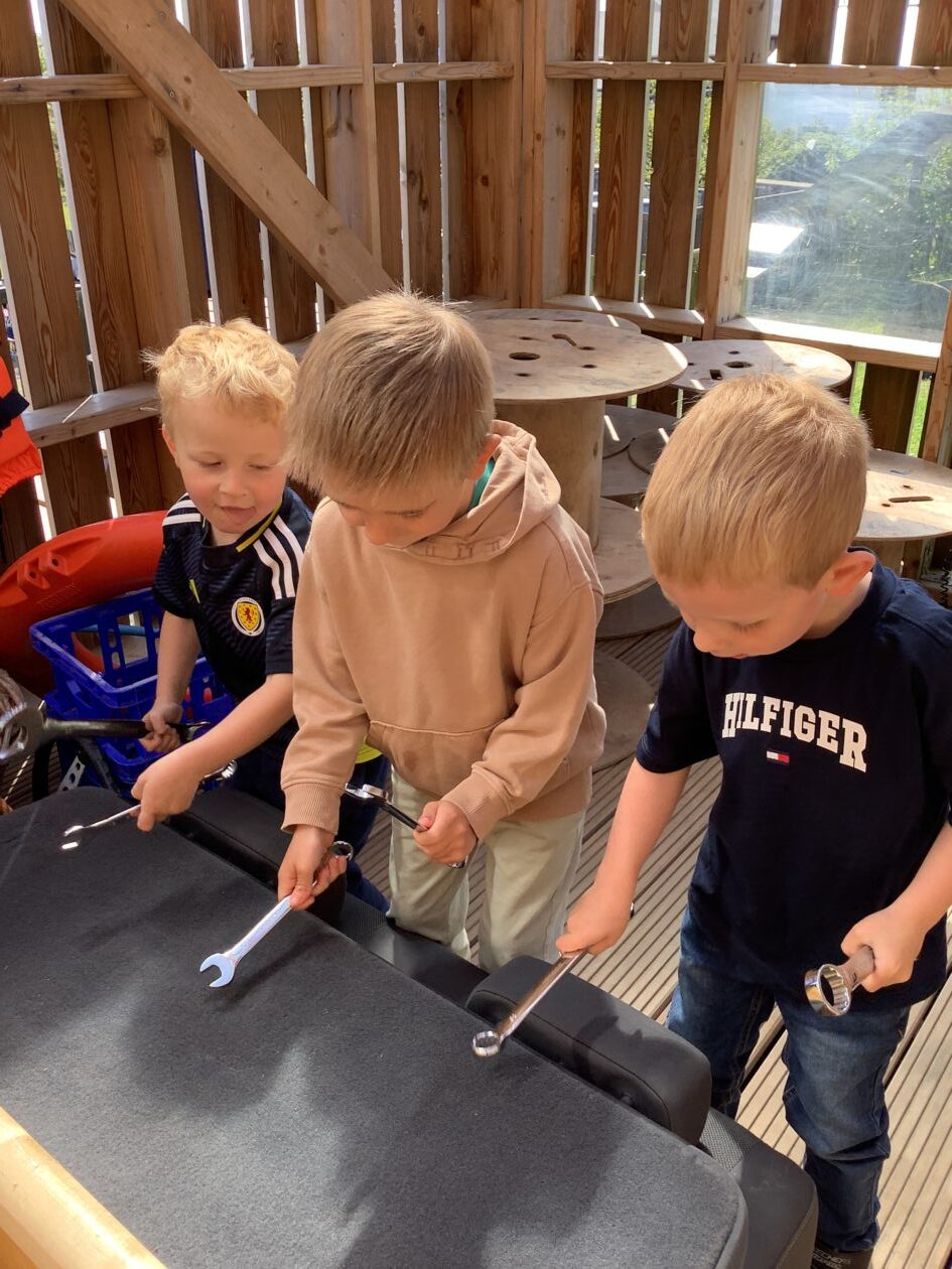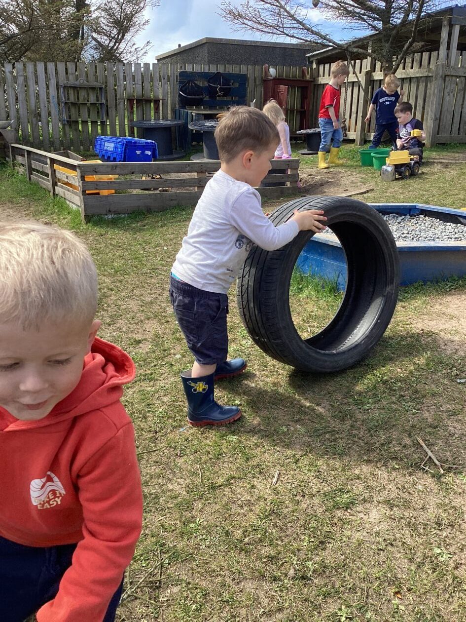 The bairns have been experimenting with different ways to slide down the steep hill in the garden. They have used cardboard, cushions, carpet tiles and slithery breeks! We have also seen lots of engagement with water play and managed to get the solar fountain working as the sun made a bit of a reappearance. We headed to the playpark one afternoon too and the bairns played chasing games, spun on the swings, tried to walk up the slide and got wobbly as jelly on a plate.