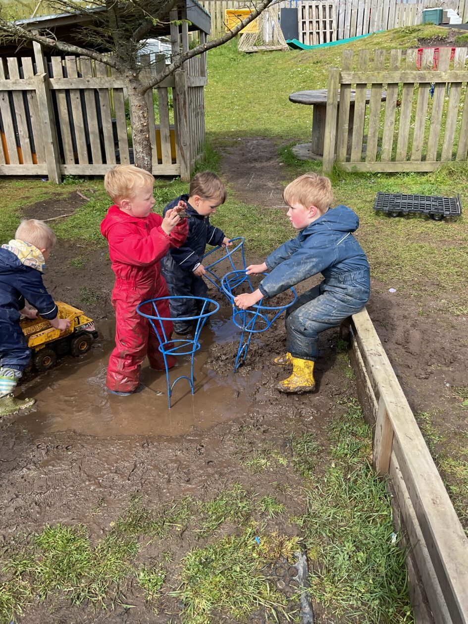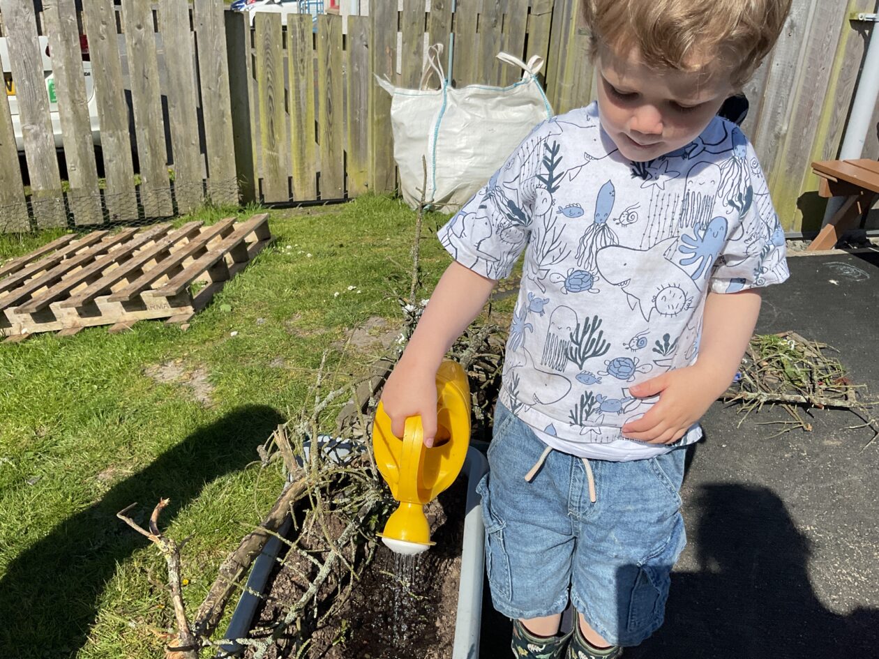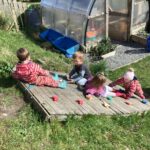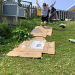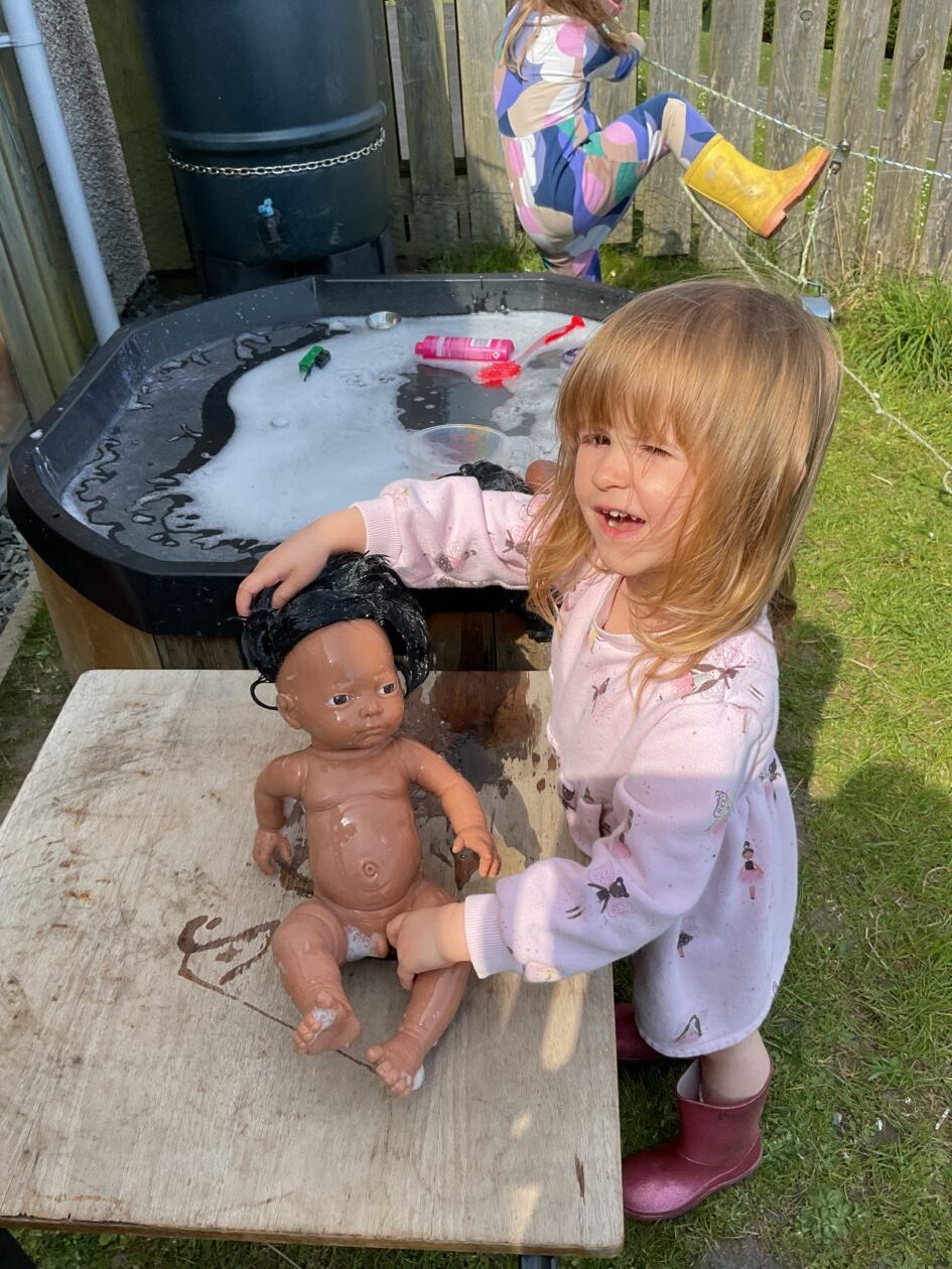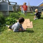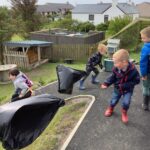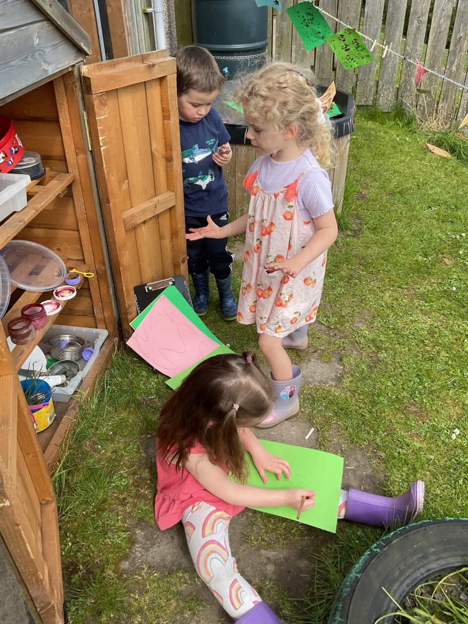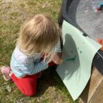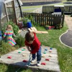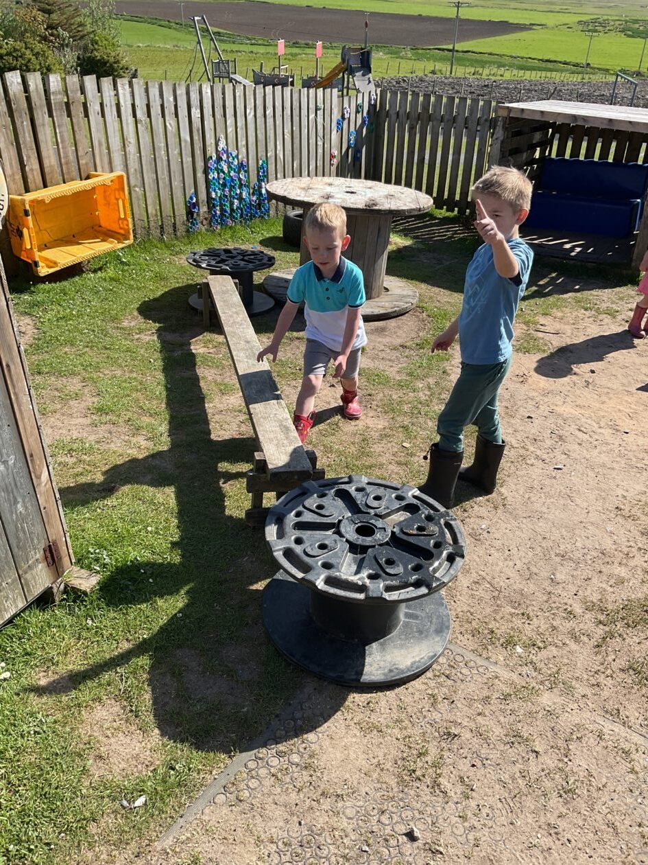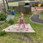 The bairns have been experimenting with different ways to slide down the steep hill in the garden. They have used cardboard, cushions, carpet tiles and slithery breeks! We have also seen lots of engagement with water play and managed to get the solar fountain working as the sun made a bit of a reappearance. We headed to the playpark one afternoon too and the bairns played chasing games, spun on the swings, tried to walk up the slide and got wobbly as jelly on a plate.