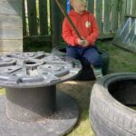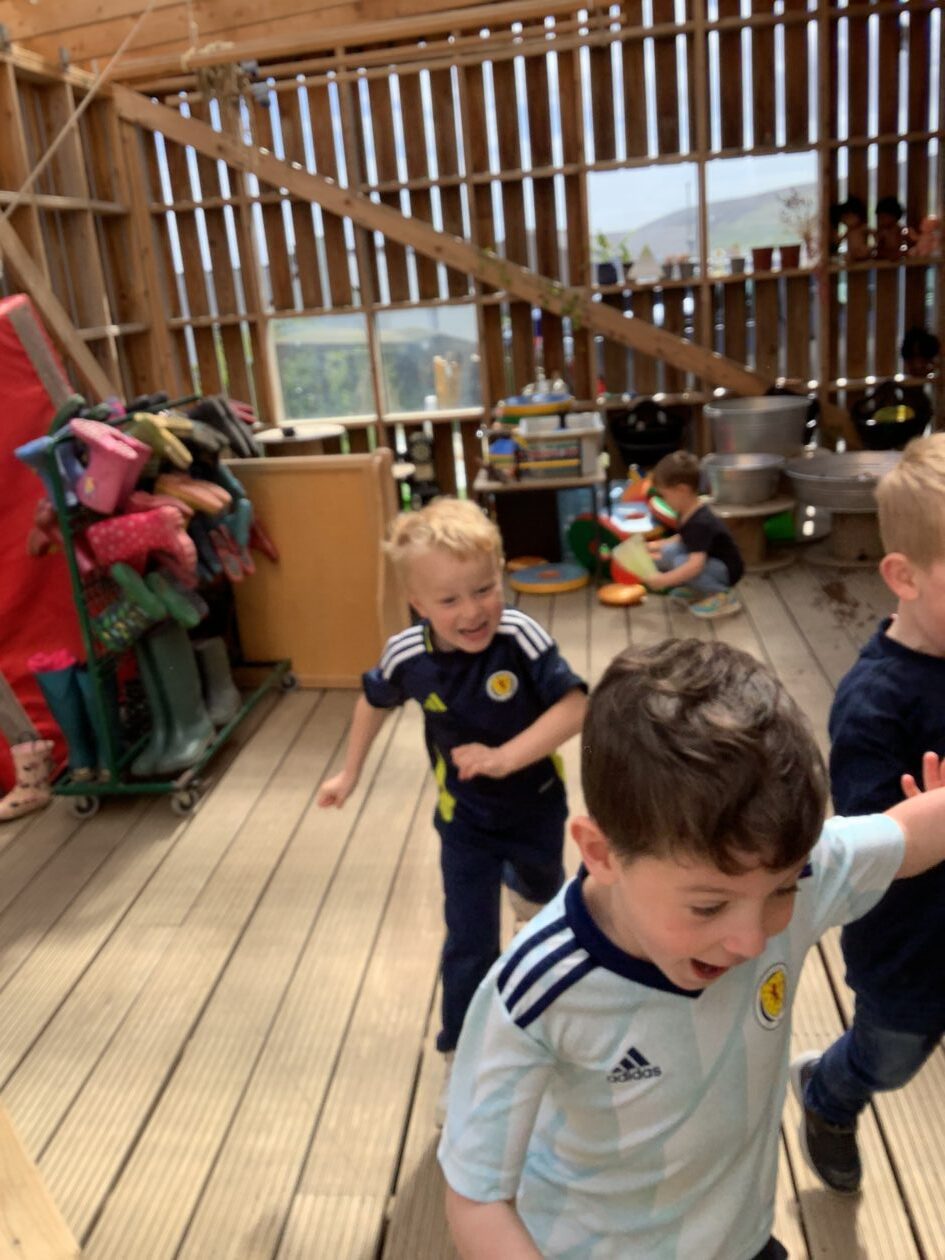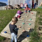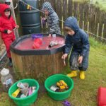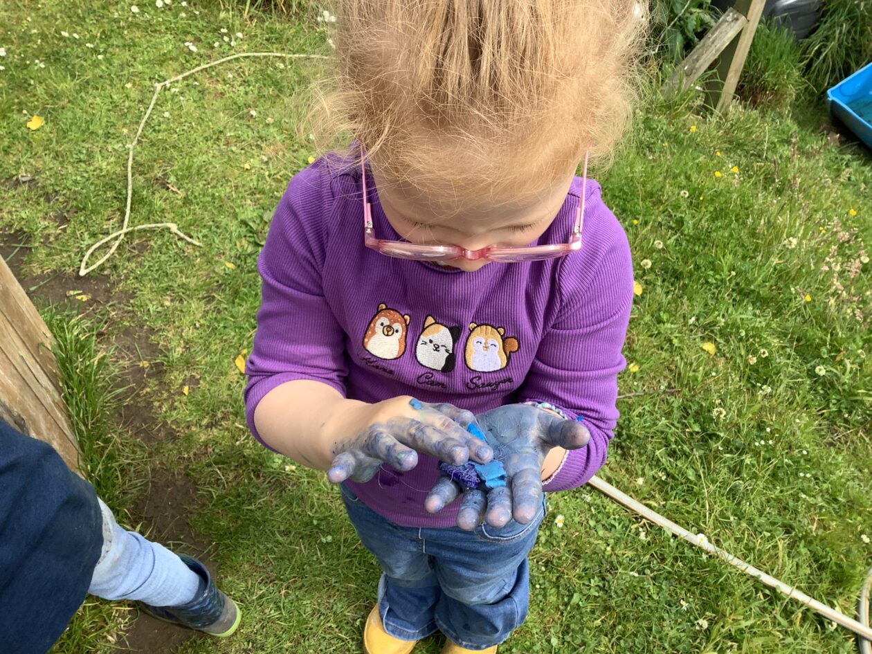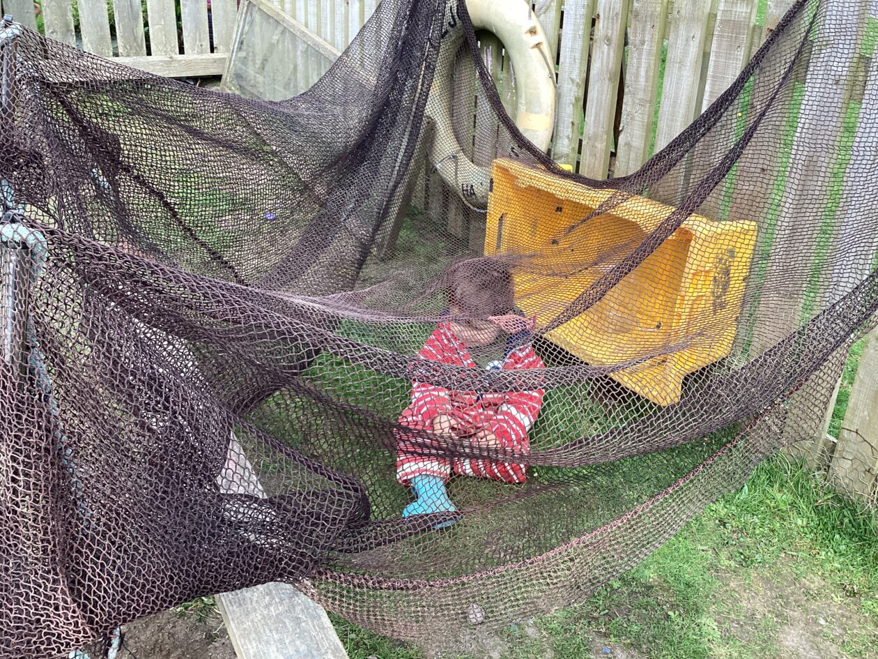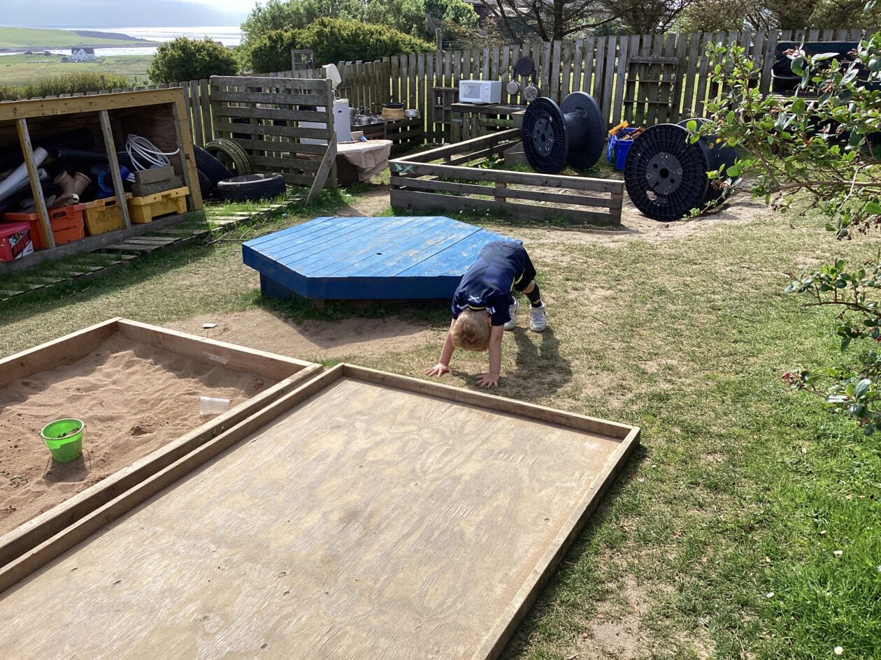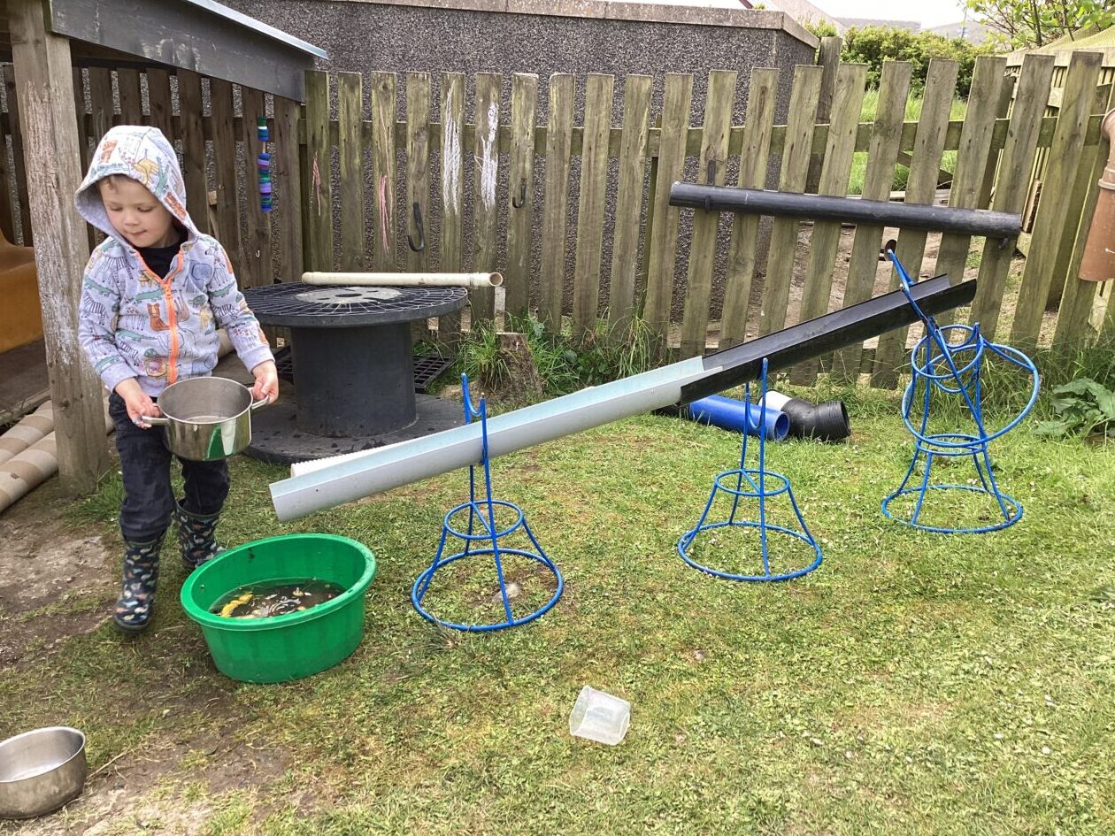 The bairns have been experimenting with different ways to slide down the steep hill in the garden. They have used cardboard, cushions, carpet tiles and slithery breeks! We have also seen lots of engagement with water play and managed to get the solar fountain working as the sun made a bit of a reappearance. We headed to the playpark one afternoon too and the bairns played chasing games, spun on the swings, tried to walk up the slide and got wobbly as jelly on a plate.