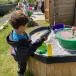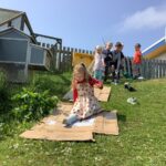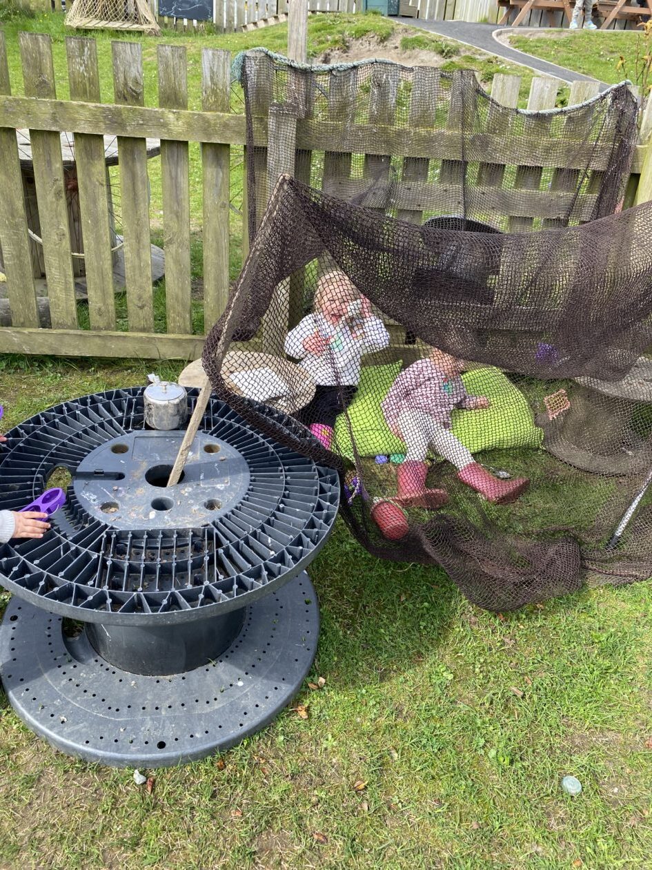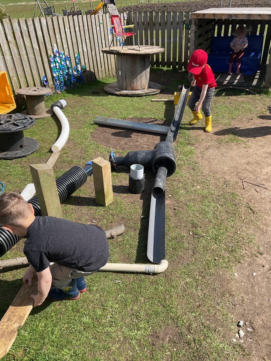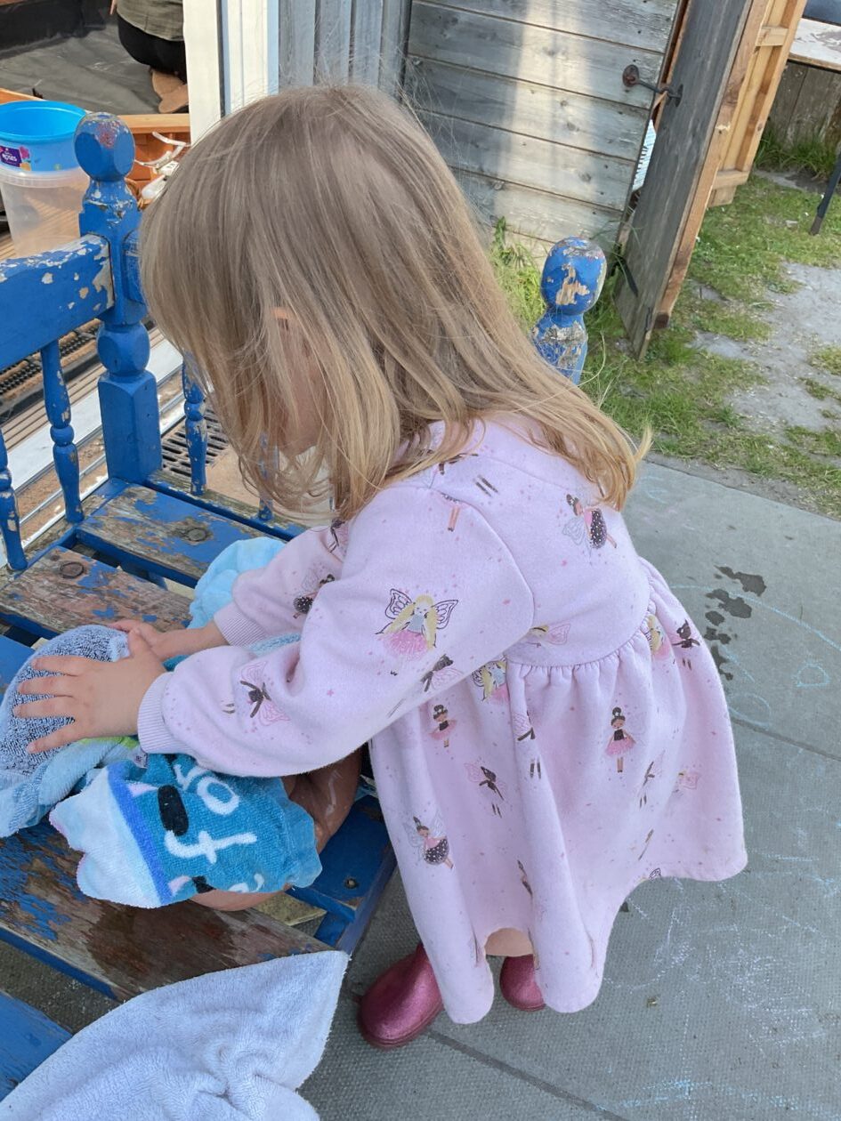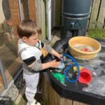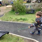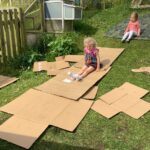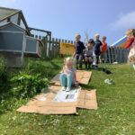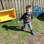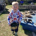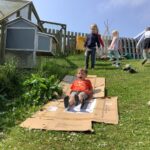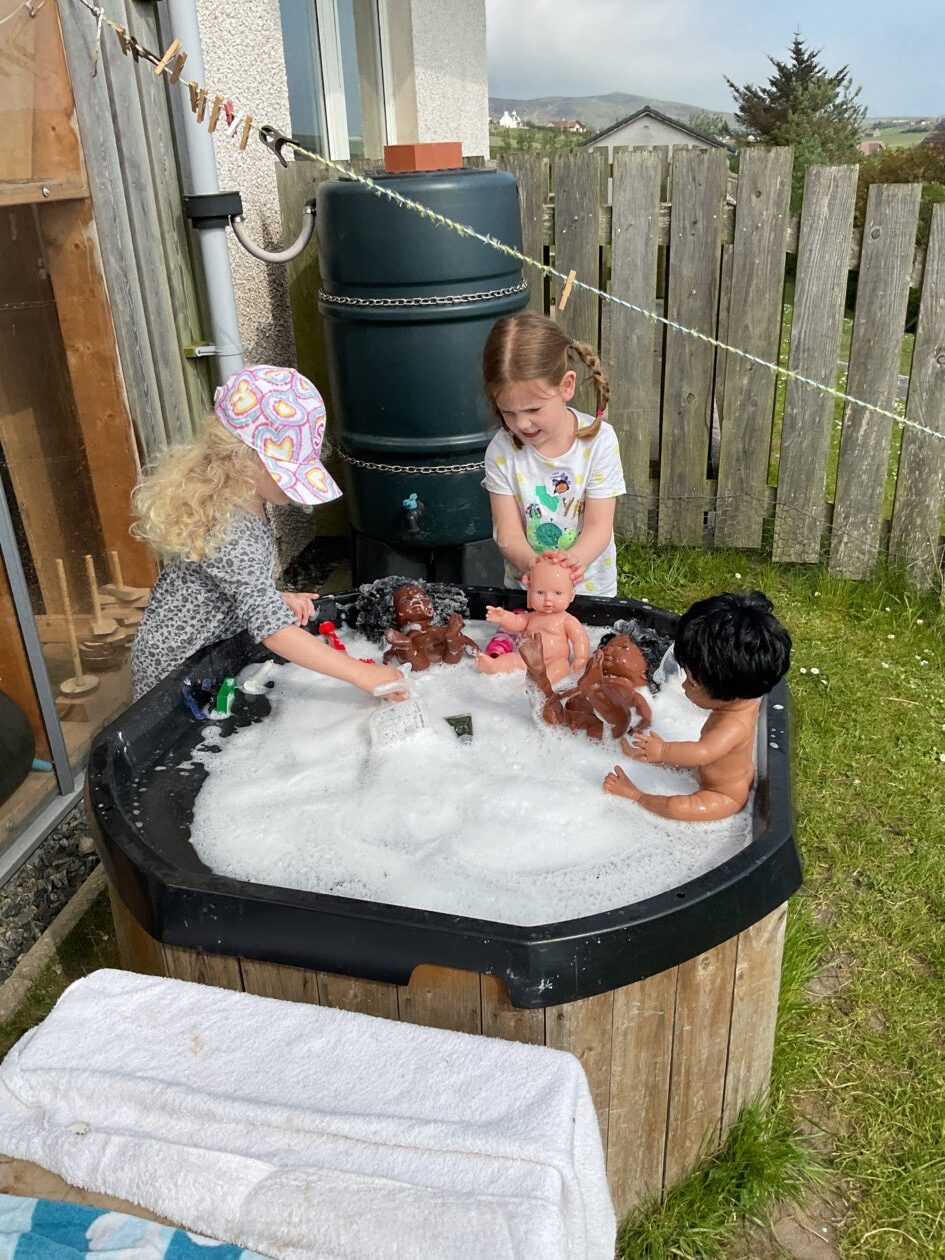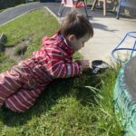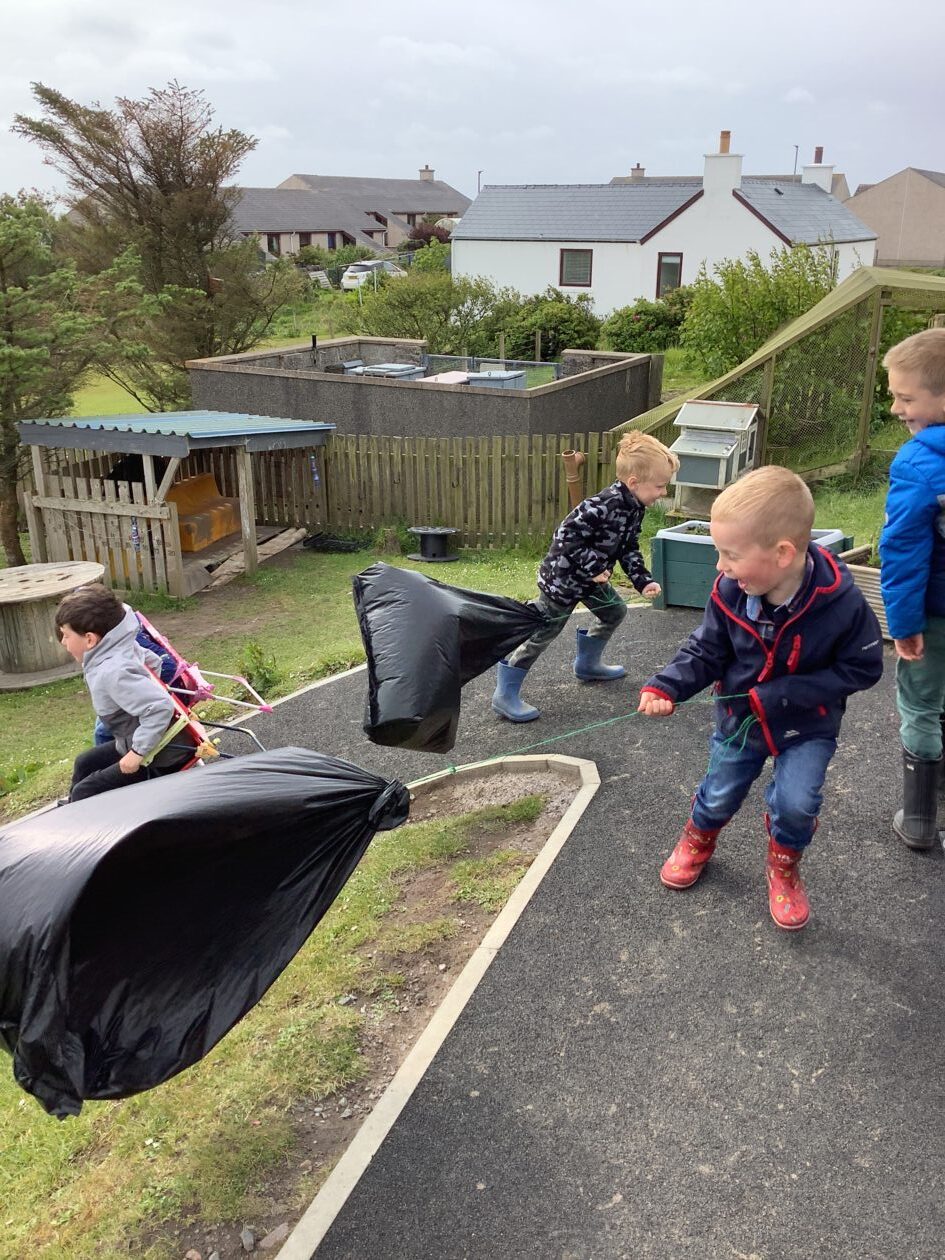 The bairns have been experimenting with different ways to slide down the steep hill in the garden. They have used cardboard, cushions, carpet tiles and slithery breeks! We have also seen lots of engagement with water play and managed to get the solar fountain working as the sun made a bit of a reappearance. We headed to the playpark one afternoon too and the bairns played chasing games, spun on the swings, tried to walk up the slide and got wobbly as jelly on a plate.