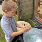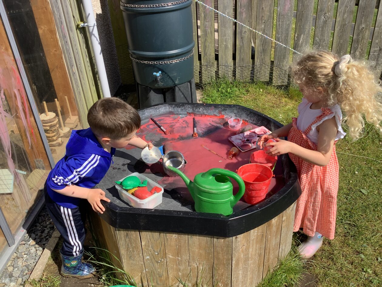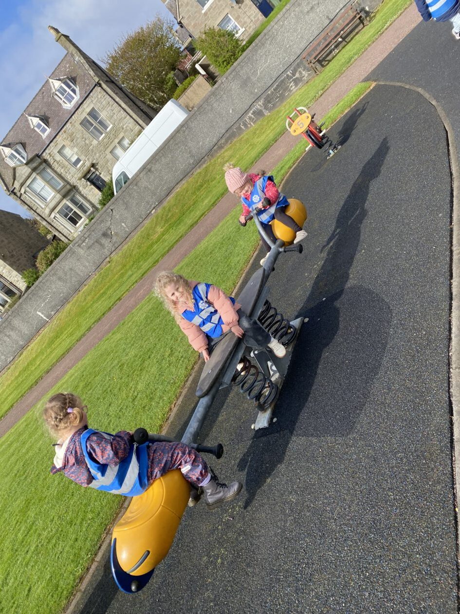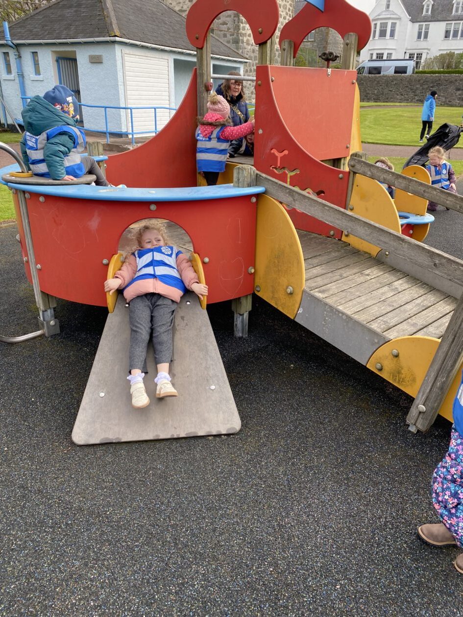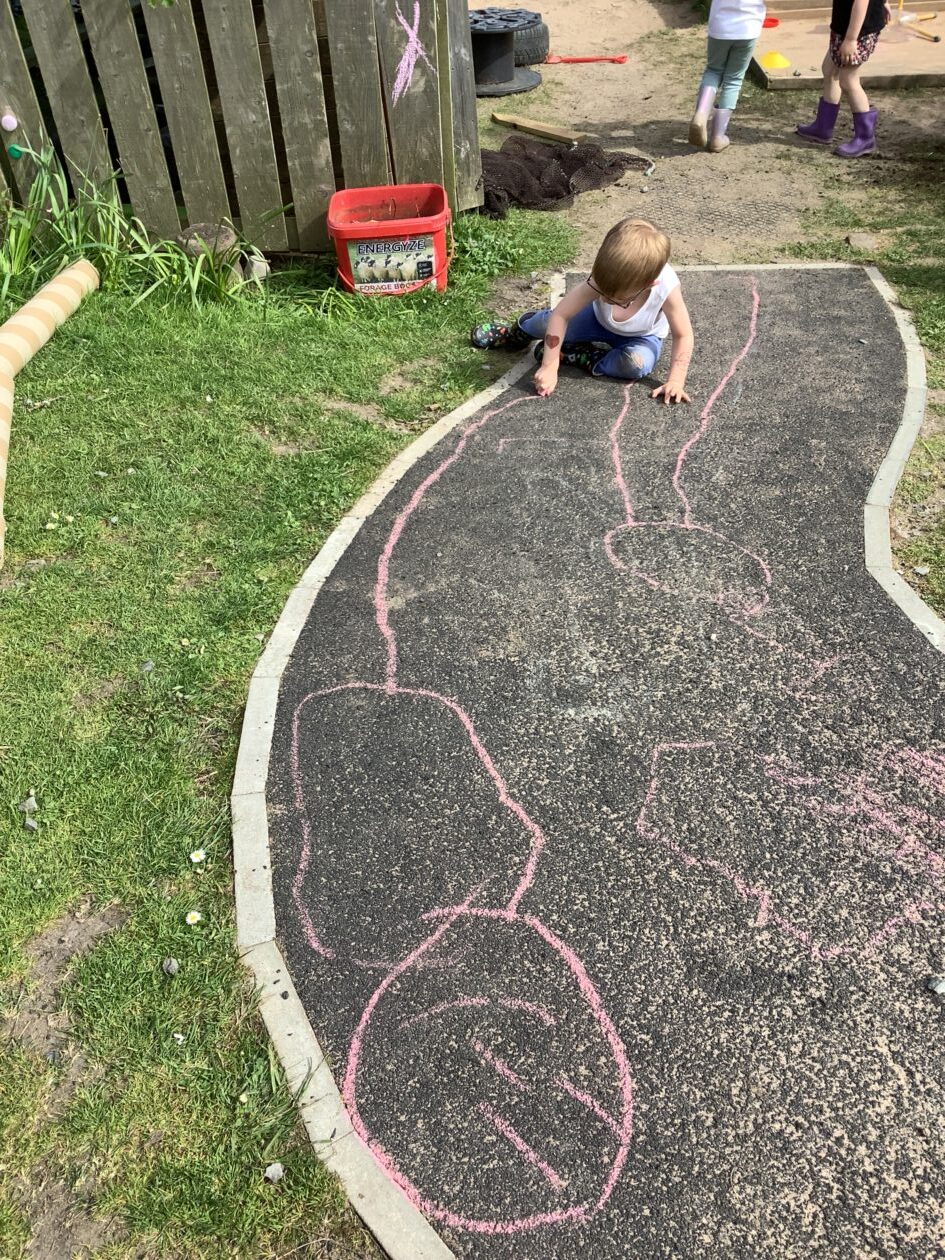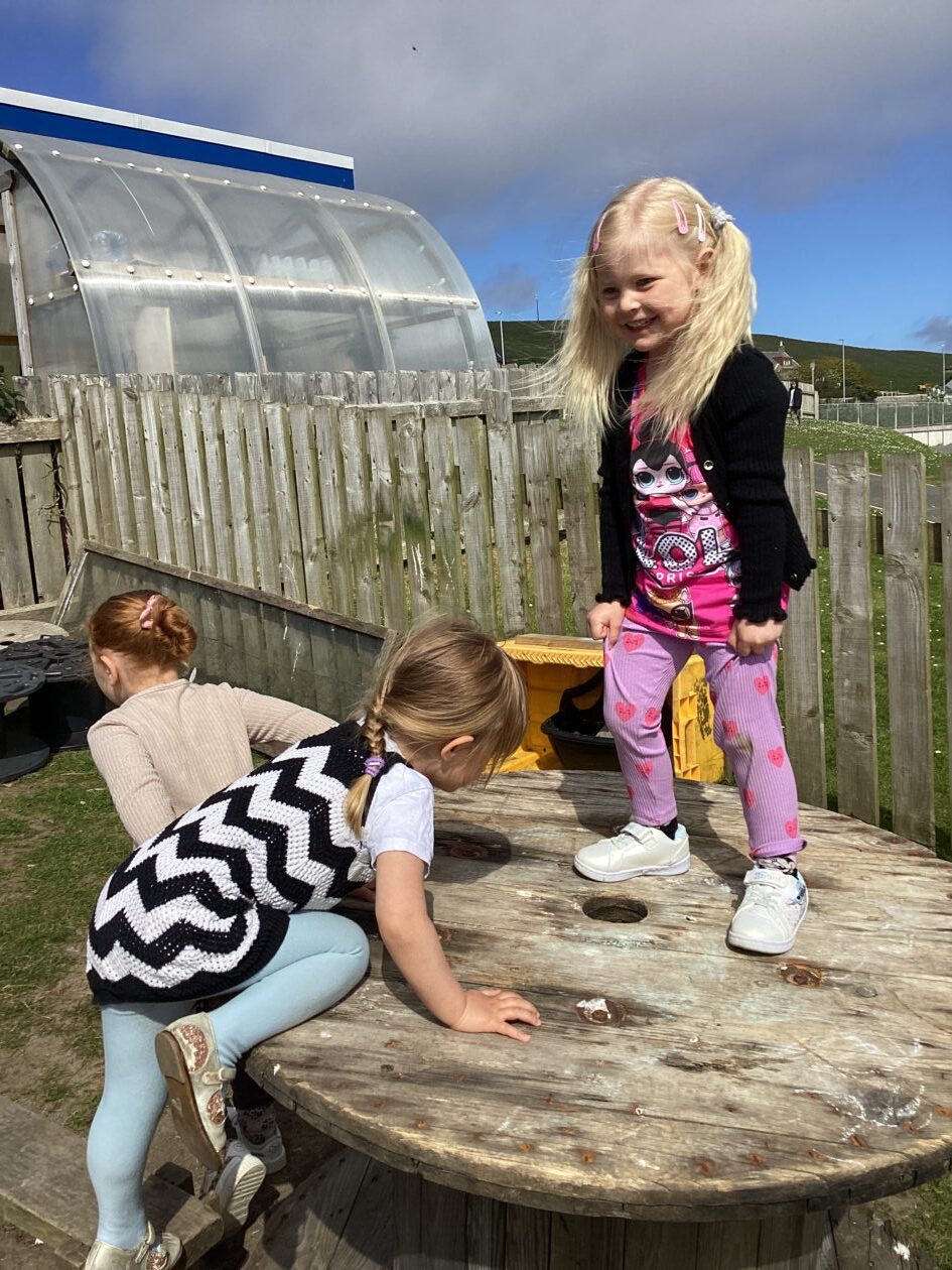 The bairns have been experimenting with different ways to slide down the steep hill in the garden. They have used cardboard, cushions, carpet tiles and slithery breeks! We have also seen lots of engagement with water play and managed to get the solar fountain working as the sun made a bit of a reappearance. We headed to the playpark one afternoon too and the bairns played chasing games, spun on the swings, tried to walk up the slide and got wobbly as jelly on a plate.