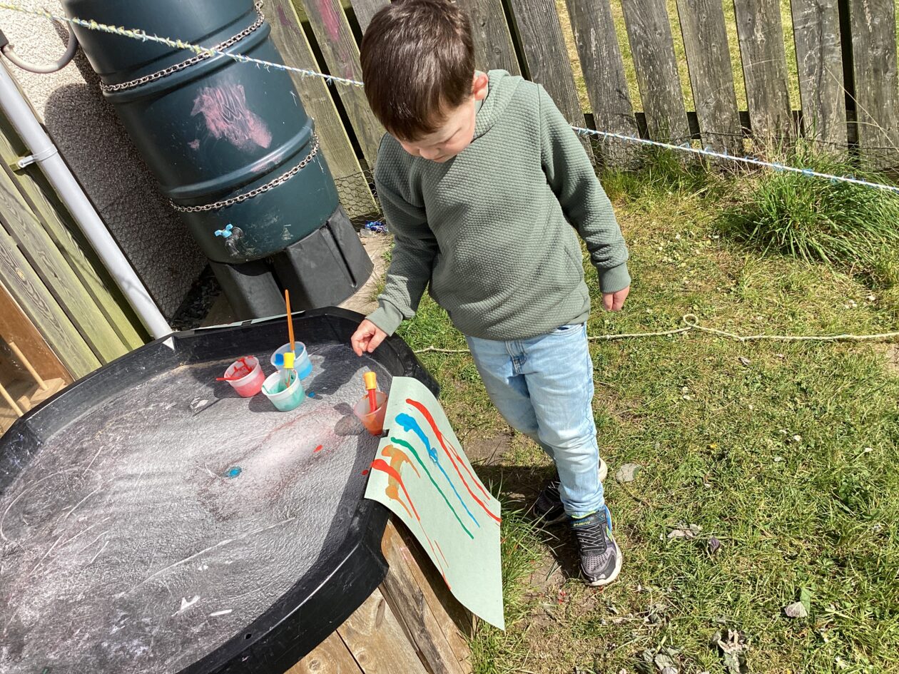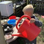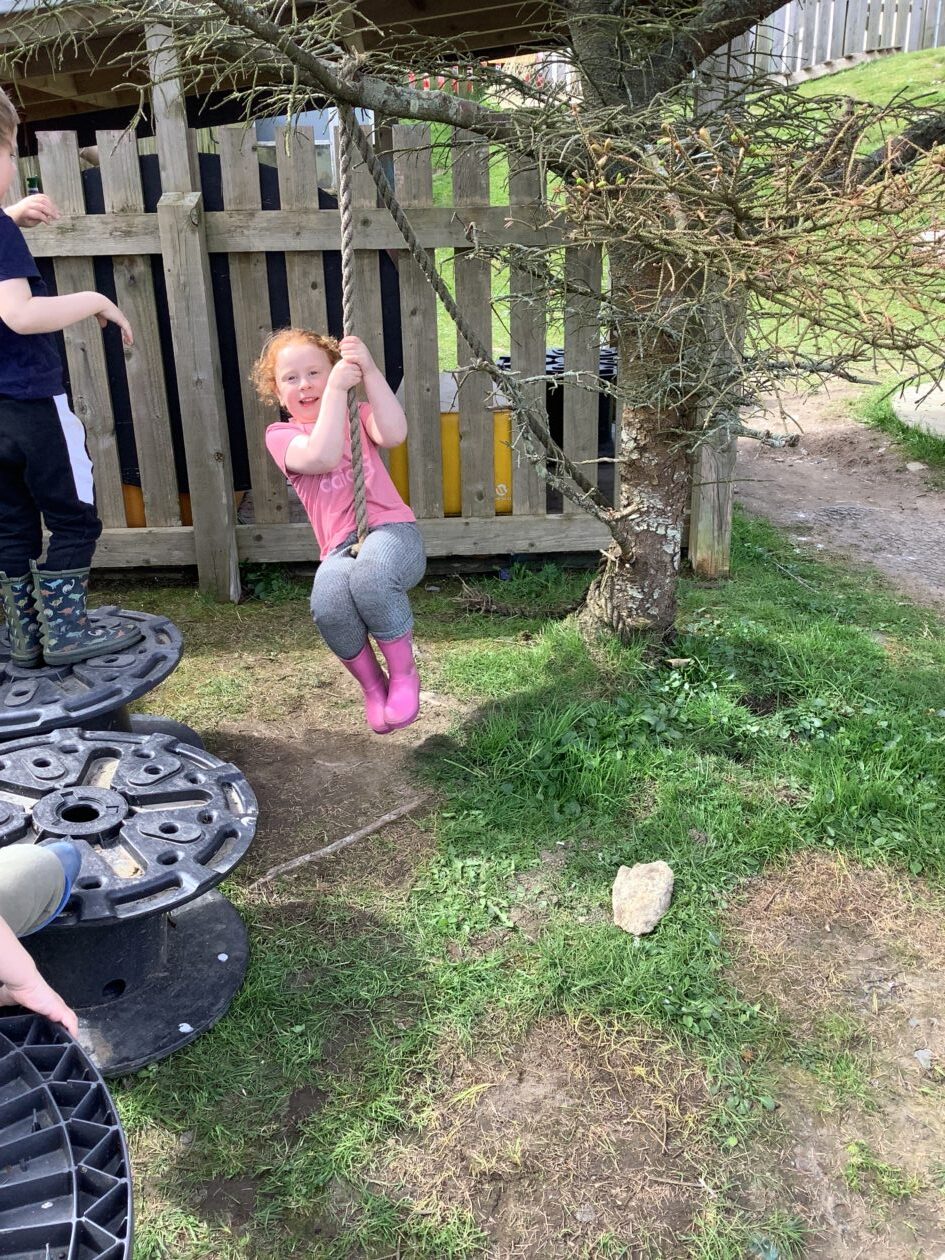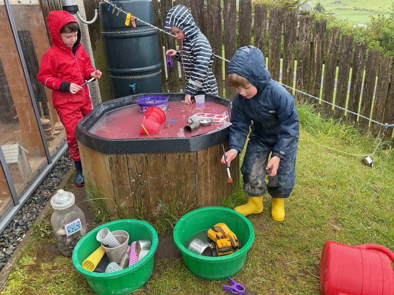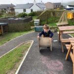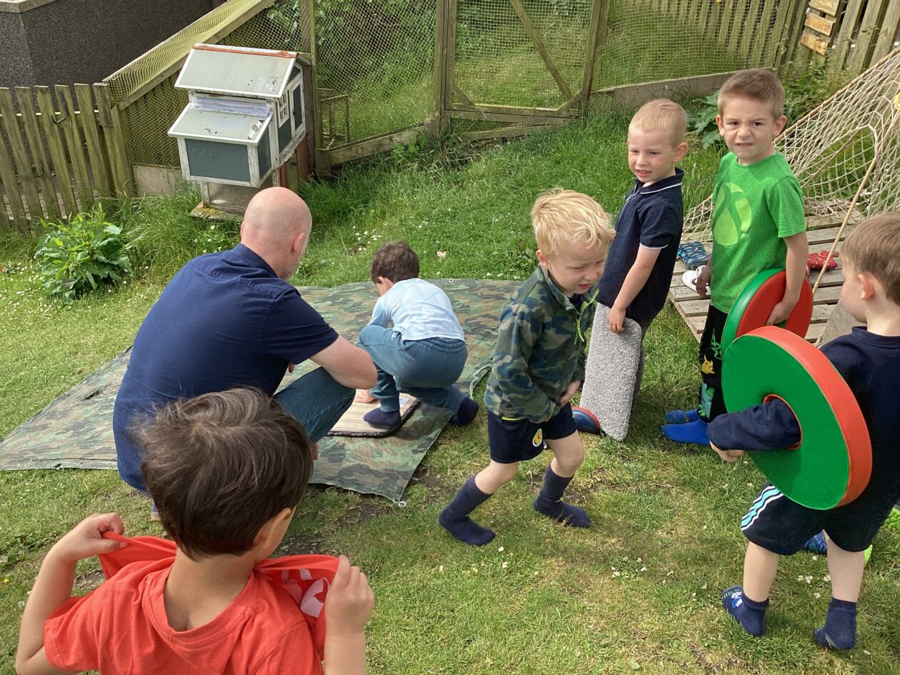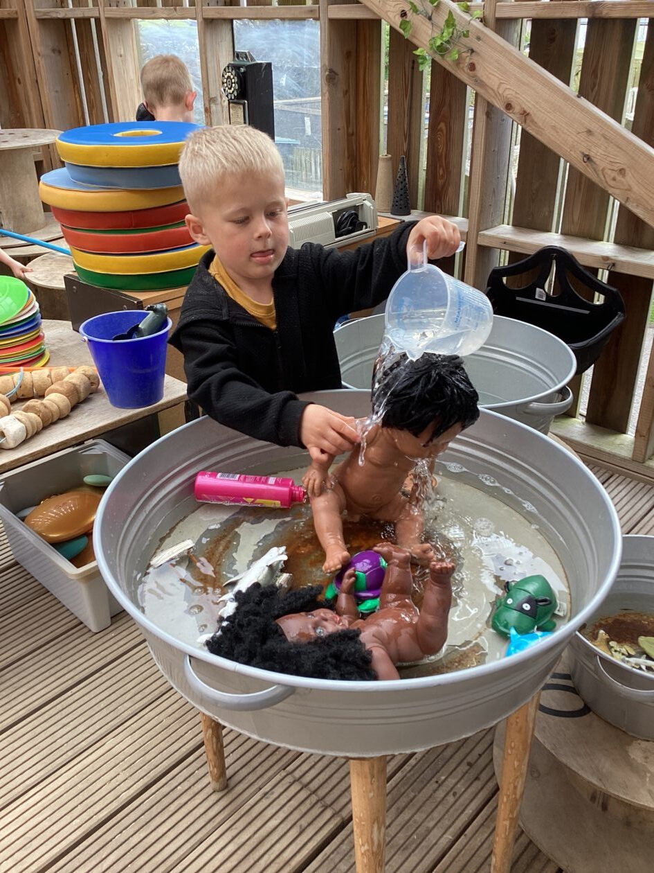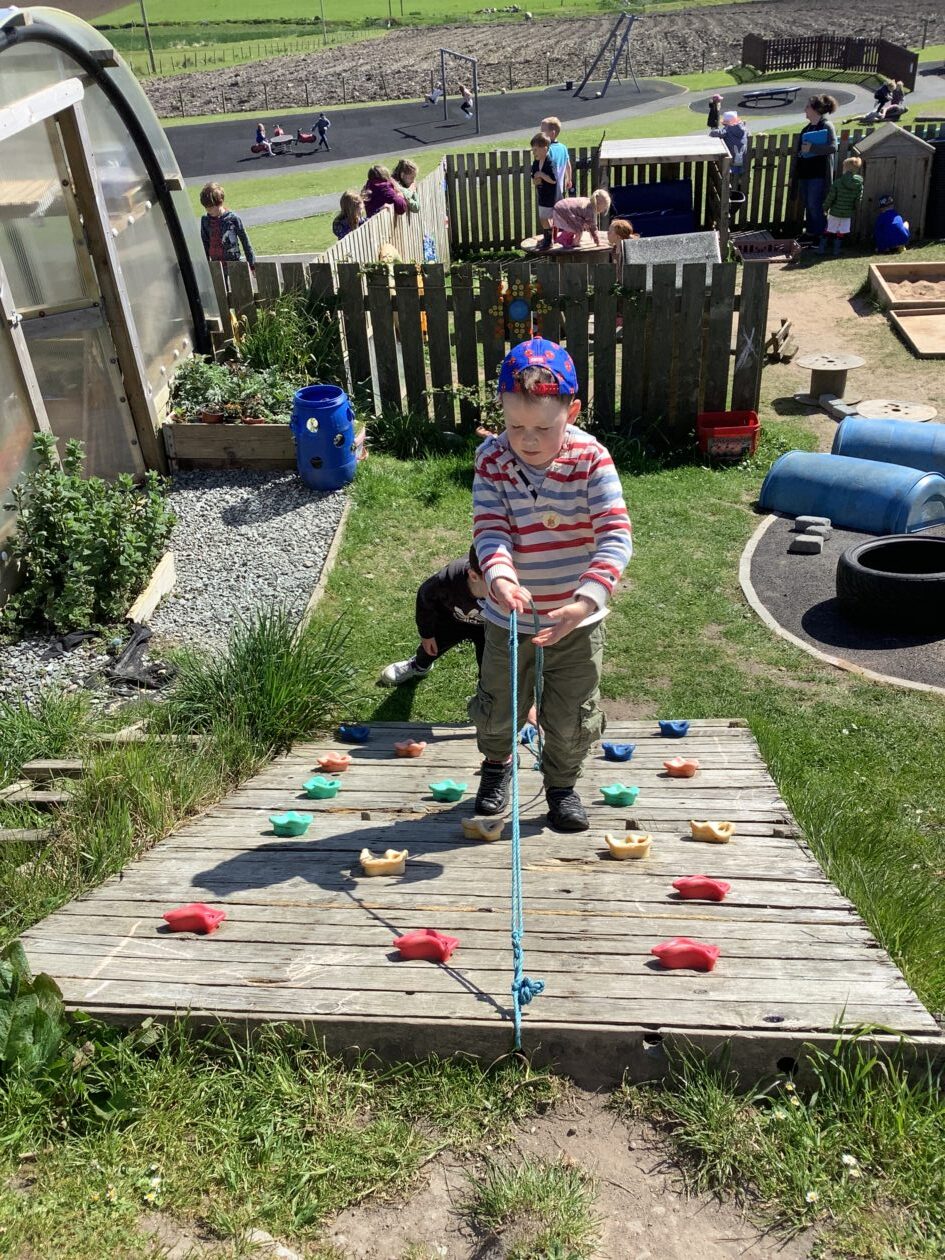 The bairns have been experimenting with different ways to slide down the steep hill in the garden. They have used cardboard, cushions, carpet tiles and slithery breeks! We have also seen lots of engagement with water play and managed to get the solar fountain working as the sun made a bit of a reappearance. We headed to the playpark one afternoon too and the bairns played chasing games, spun on the swings, tried to walk up the slide and got wobbly as jelly on a plate.