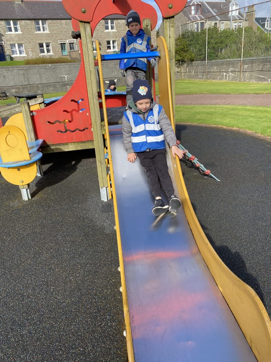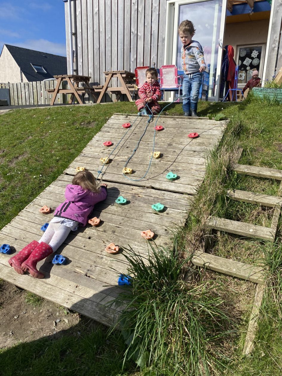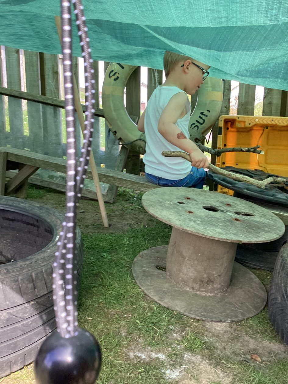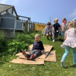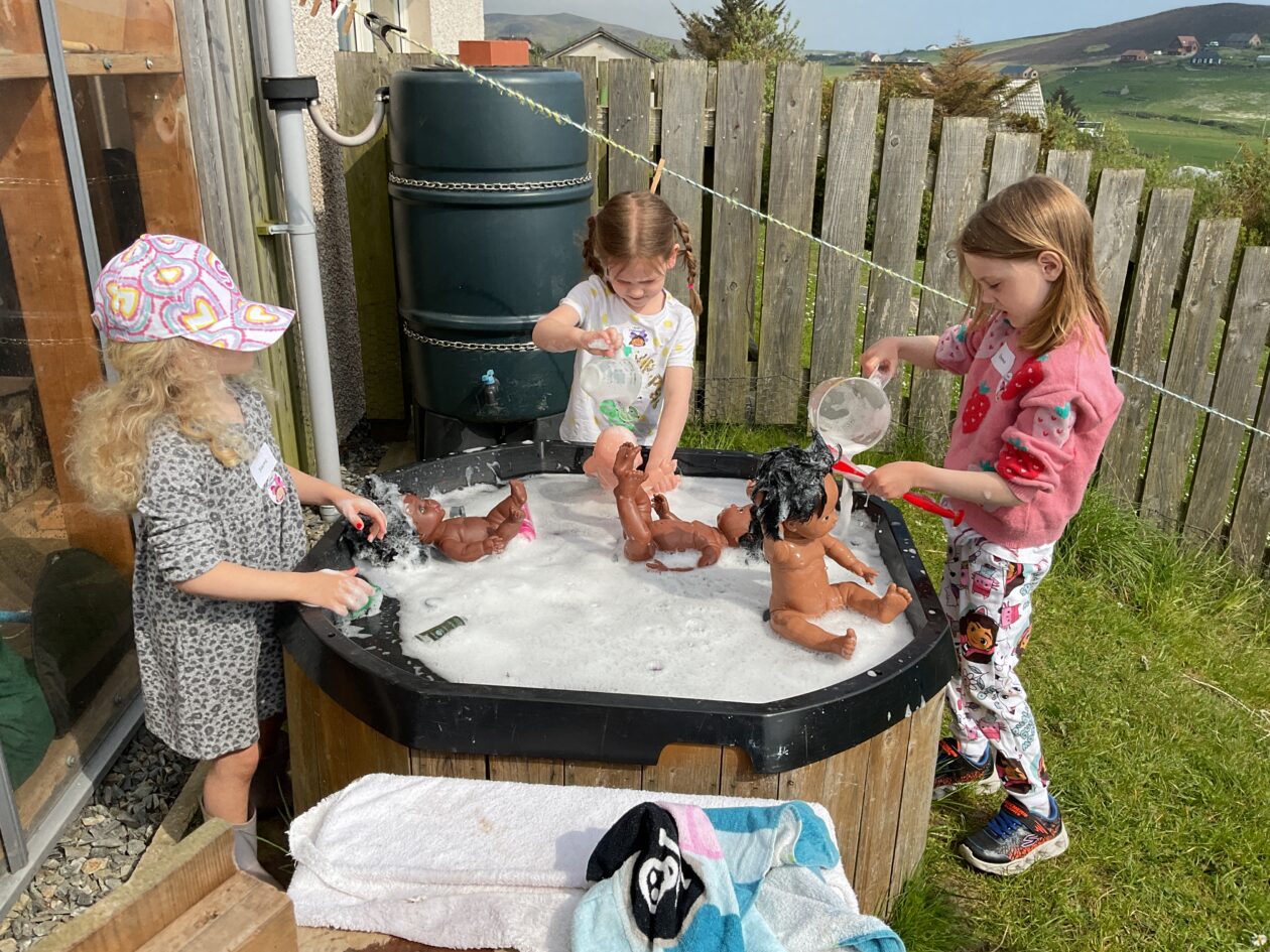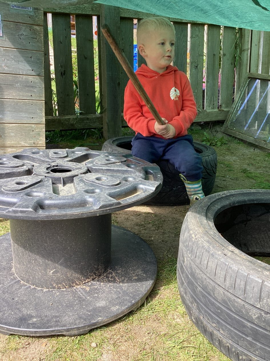 The bairns have been experimenting with different ways to slide down the steep hill in the garden. They have used cardboard, cushions, carpet tiles and slithery breeks! We have also seen lots of engagement with water play and managed to get the solar fountain working as the sun made a bit of a reappearance. We headed to the playpark one afternoon too and the bairns played chasing games, spun on the swings, tried to walk up the slide and got wobbly as jelly on a plate.