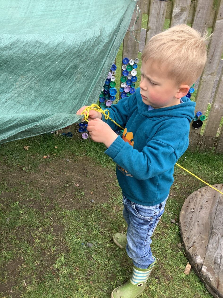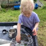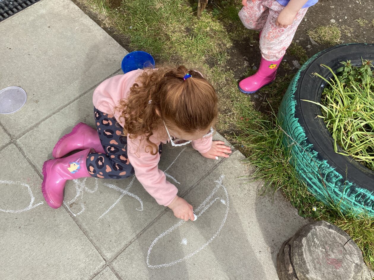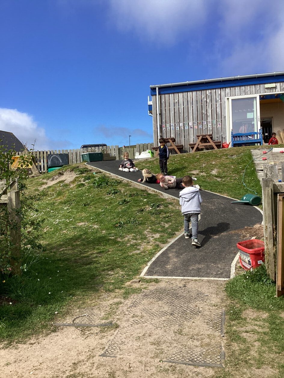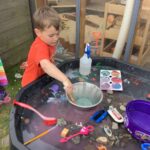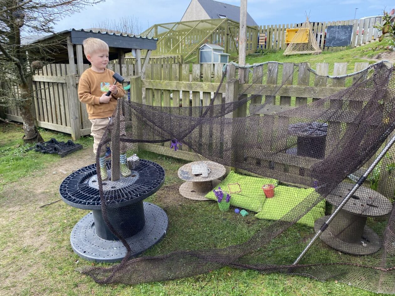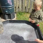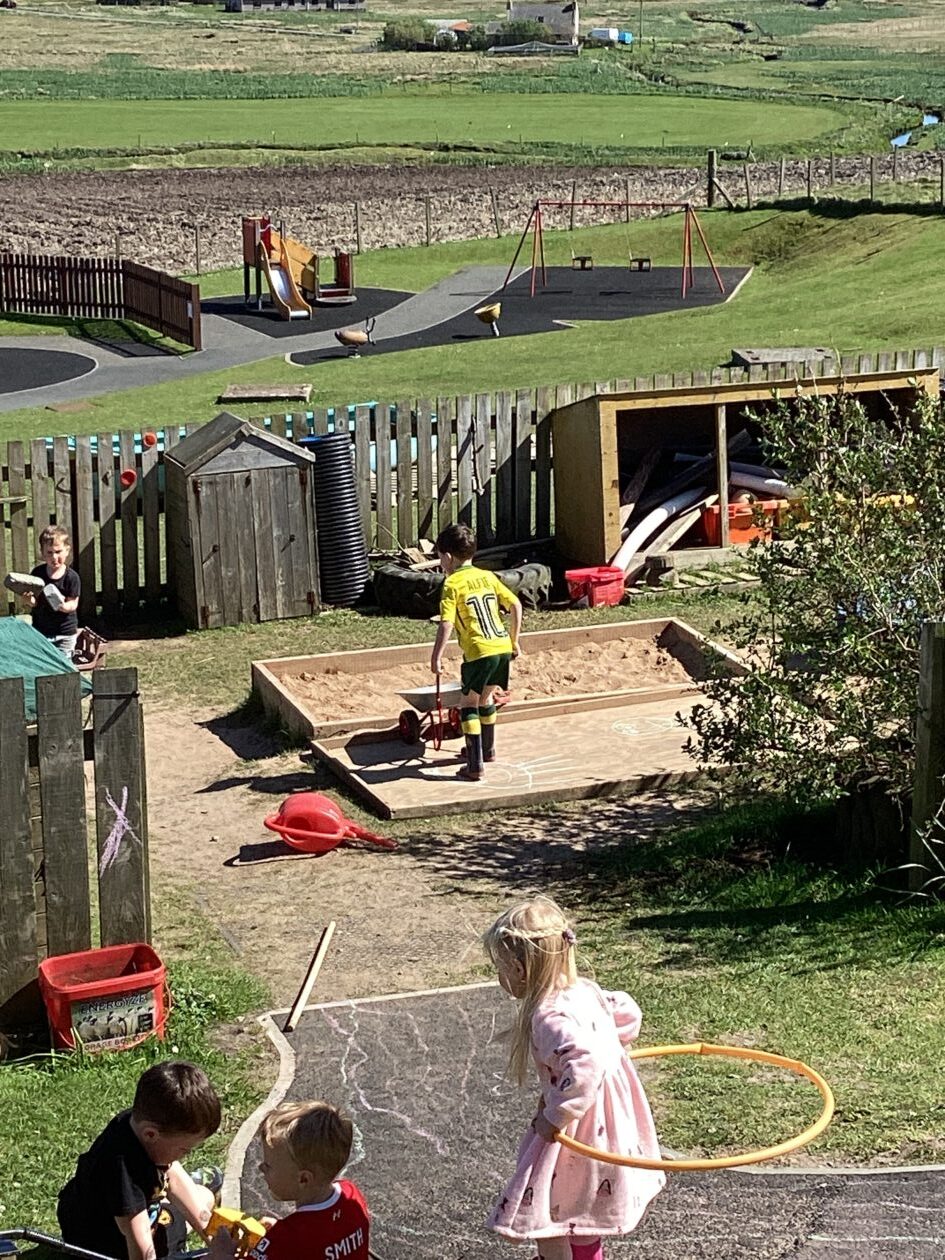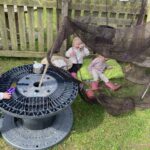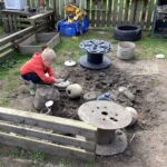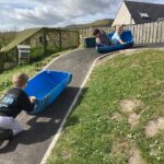 The bairns have been experimenting with different ways to slide down the steep hill in the garden. They have used cardboard, cushions, carpet tiles and slithery breeks! We have also seen lots of engagement with water play and managed to get the solar fountain working as the sun made a bit of a reappearance. We headed to the playpark one afternoon too and the bairns played chasing games, spun on the swings, tried to walk up the slide and got wobbly as jelly on a plate.