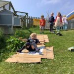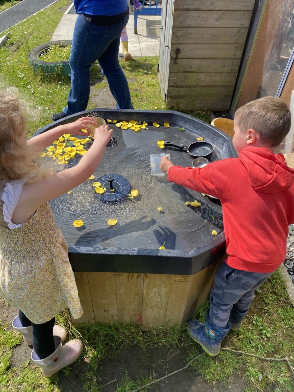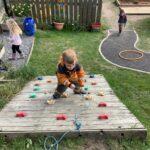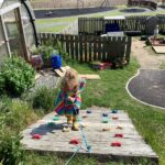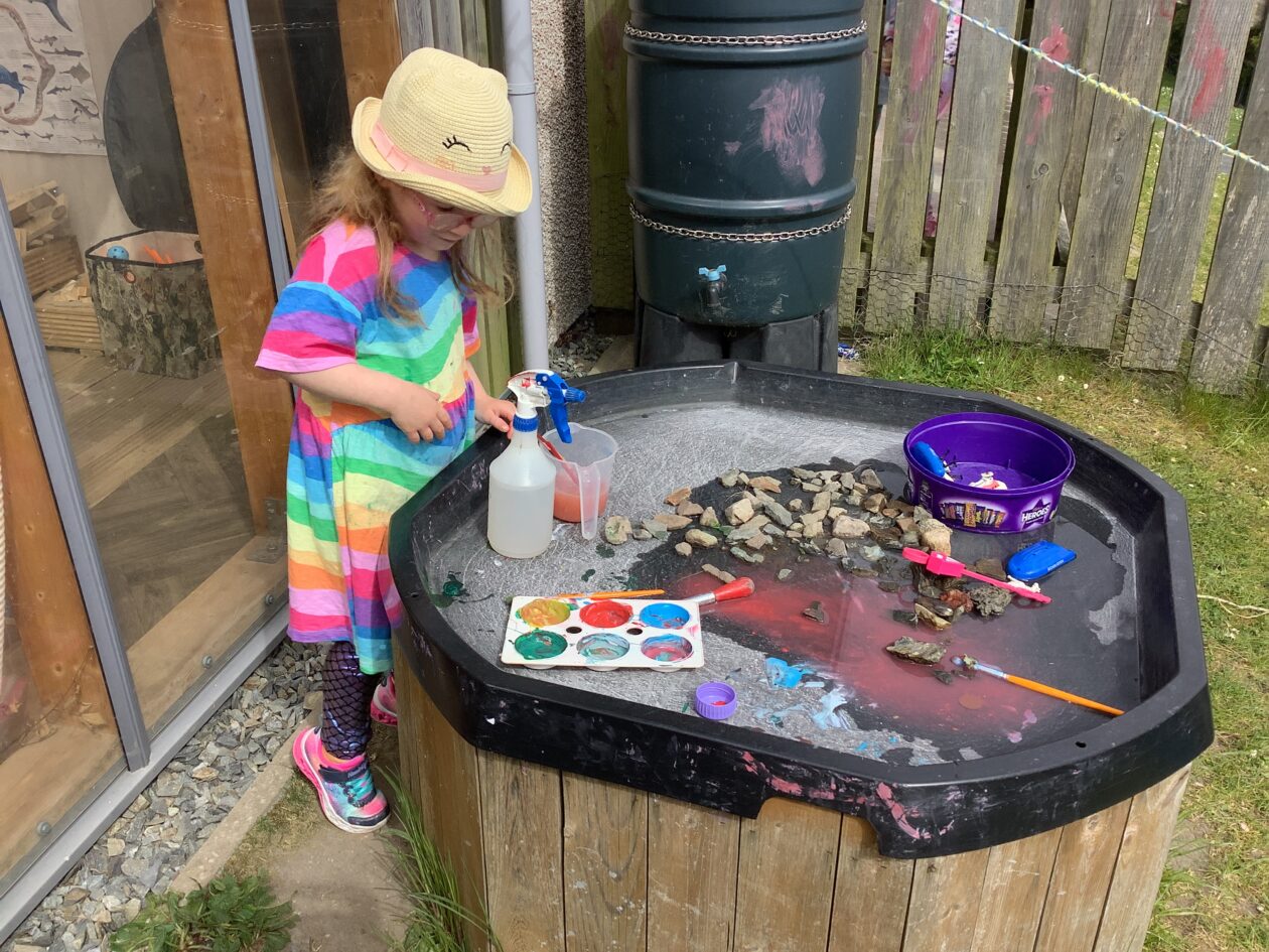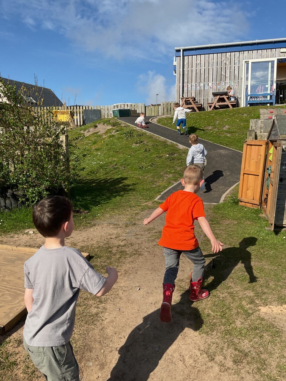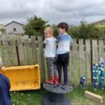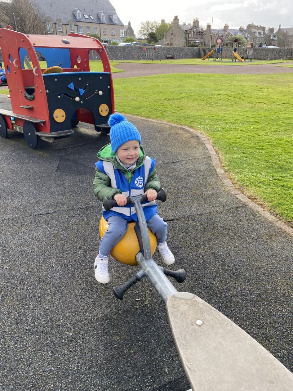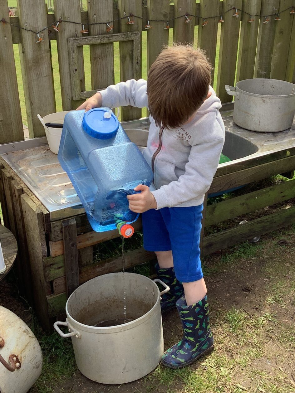 The bairns have been experimenting with different ways to slide down the steep hill in the garden. They have used cardboard, cushions, carpet tiles and slithery breeks! We have also seen lots of engagement with water play and managed to get the solar fountain working as the sun made a bit of a reappearance. We headed to the playpark one afternoon too and the bairns played chasing games, spun on the swings, tried to walk up the slide and got wobbly as jelly on a plate.