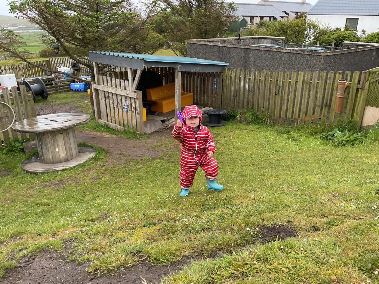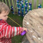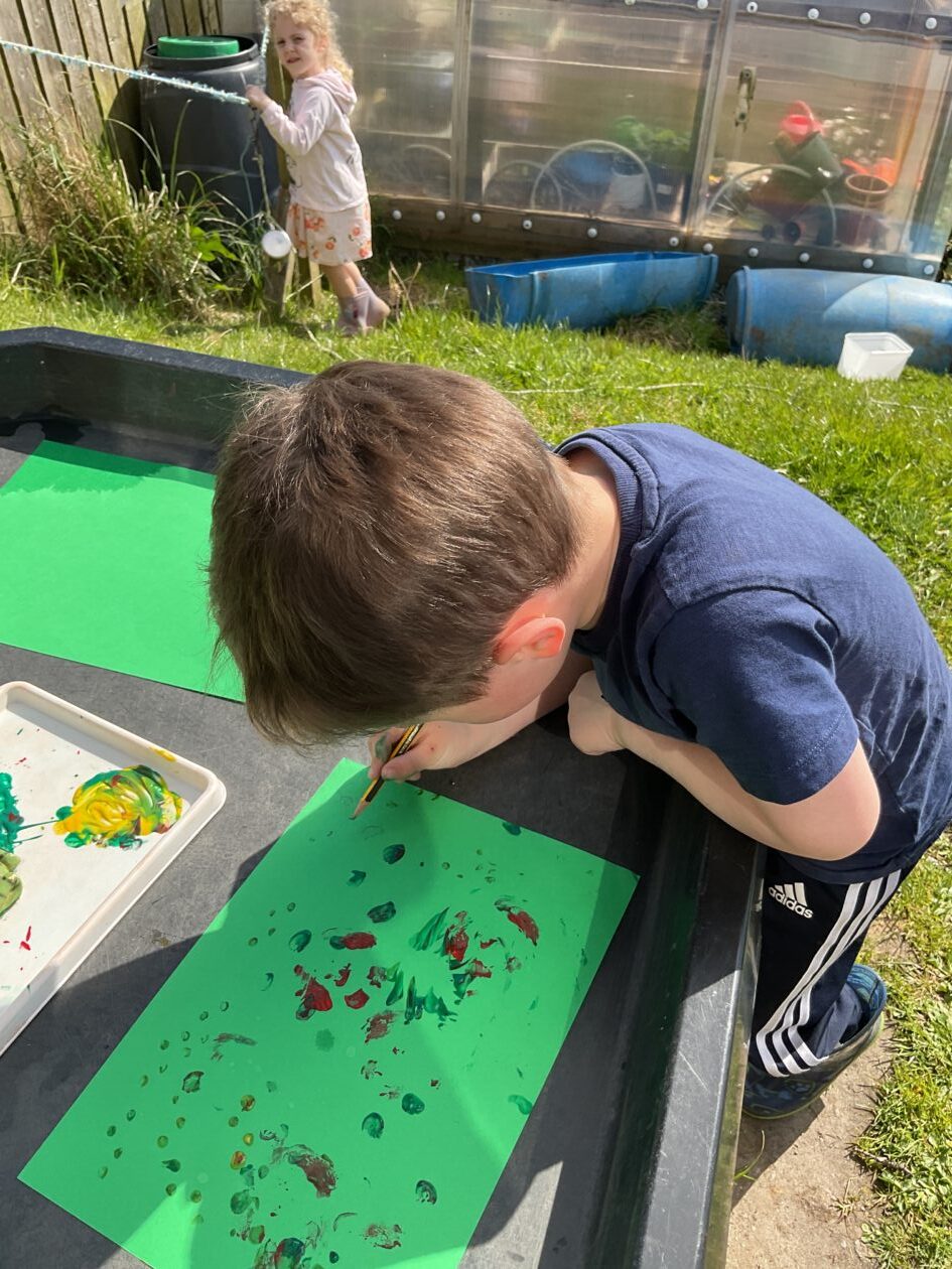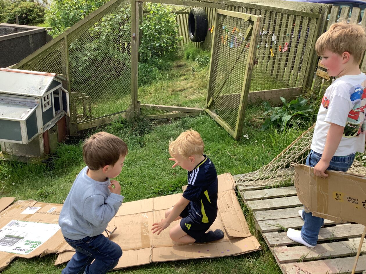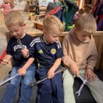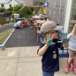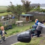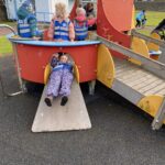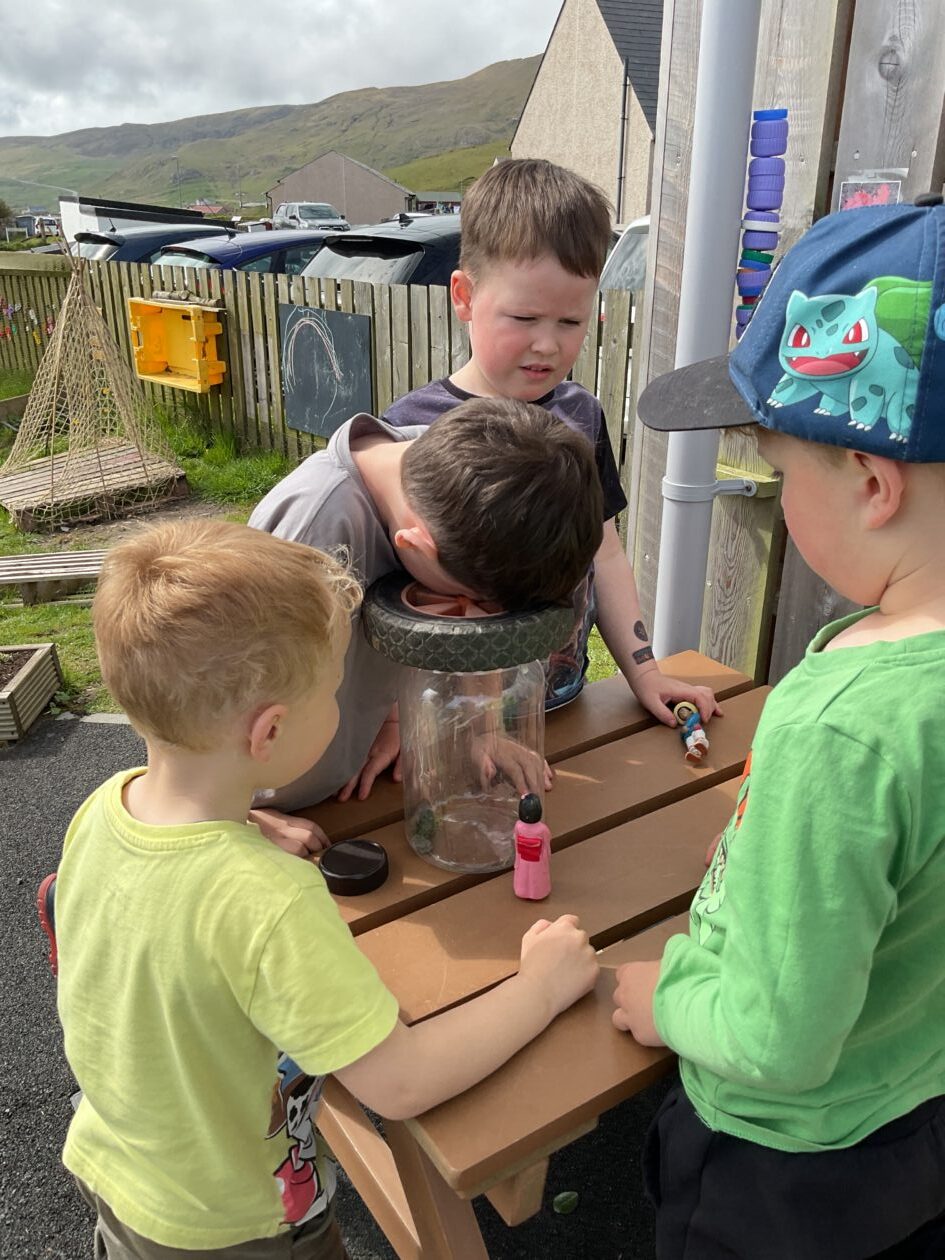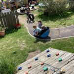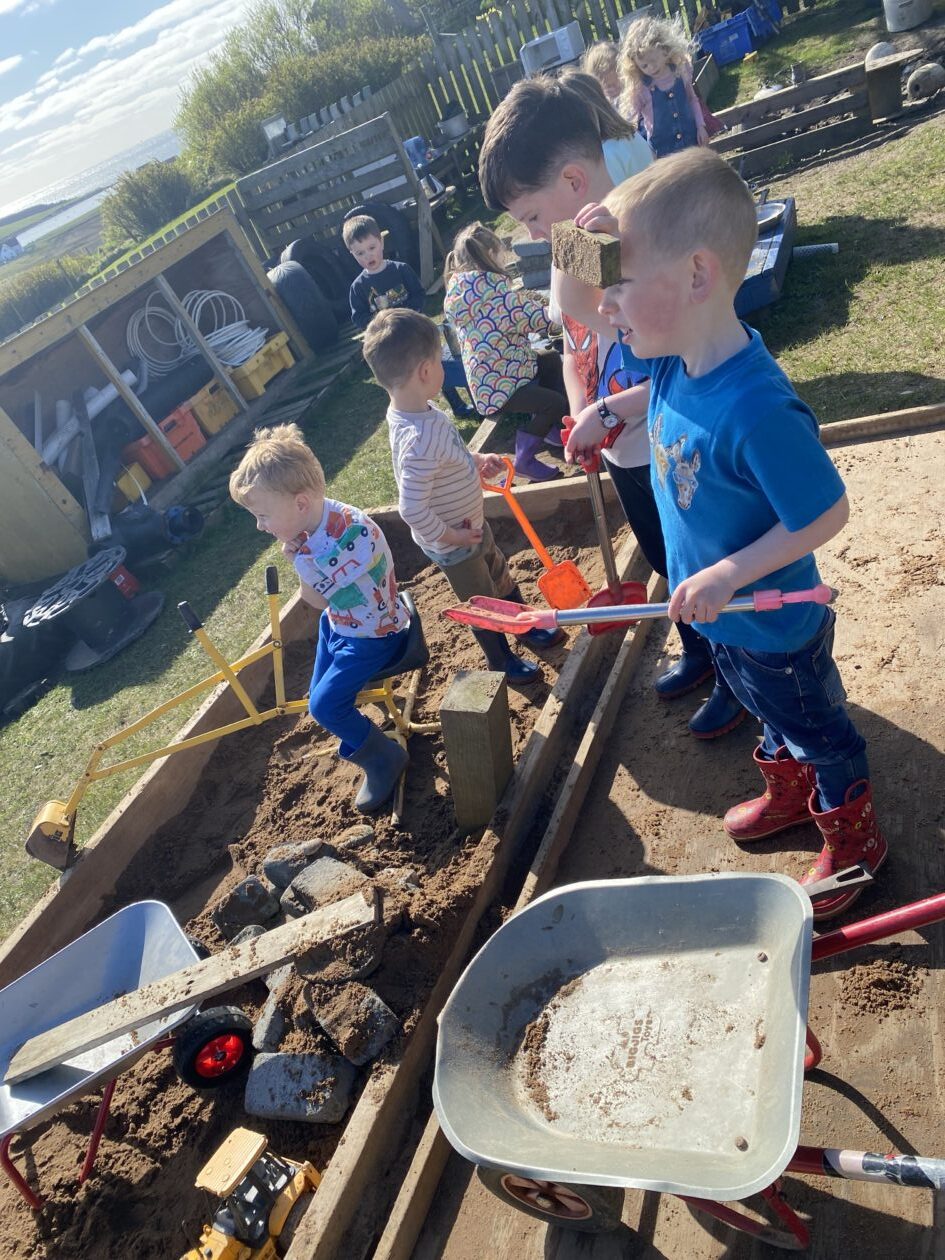 The bairns have been experimenting with different ways to slide down the steep hill in the garden. They have used cardboard, cushions, carpet tiles and slithery breeks! We have also seen lots of engagement with water play and managed to get the solar fountain working as the sun made a bit of a reappearance. We headed to the playpark one afternoon too and the bairns played chasing games, spun on the swings, tried to walk up the slide and got wobbly as jelly on a plate.