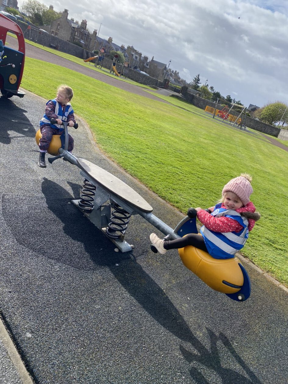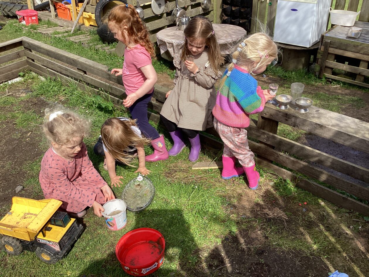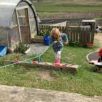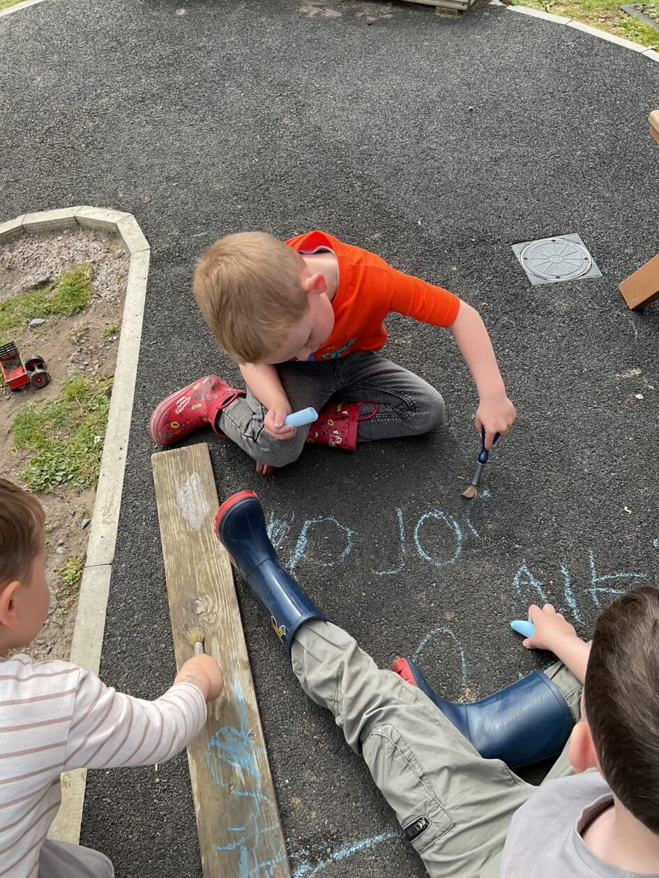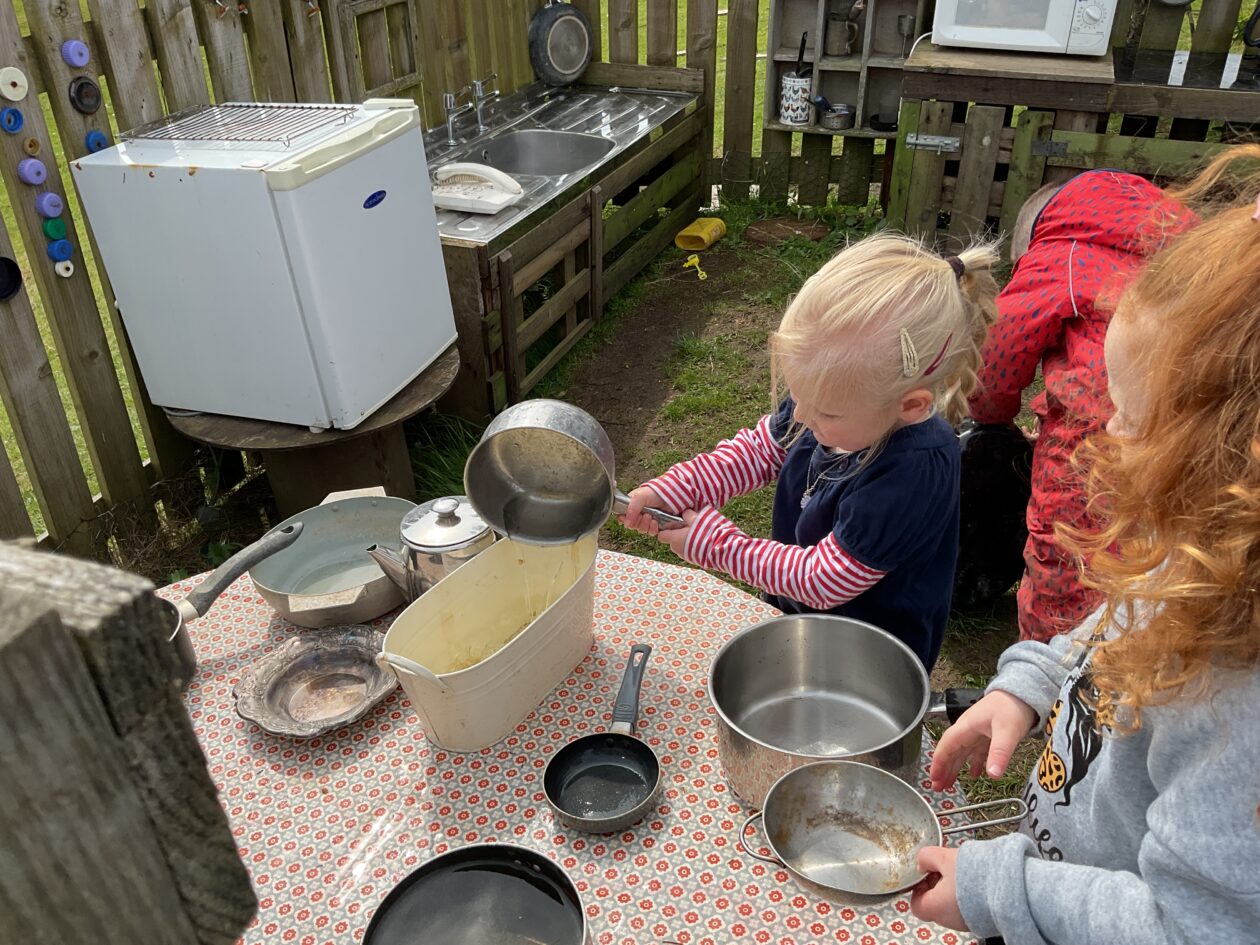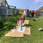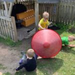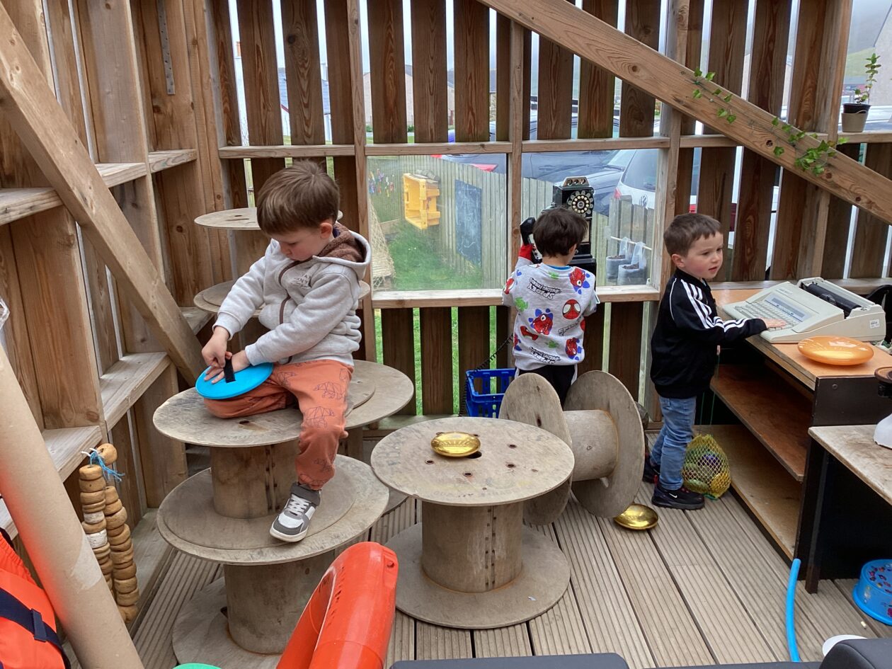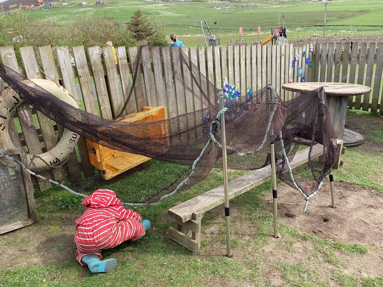 The bairns have been experimenting with different ways to slide down the steep hill in the garden. They have used cardboard, cushions, carpet tiles and slithery breeks! We have also seen lots of engagement with water play and managed to get the solar fountain working as the sun made a bit of a reappearance. We headed to the playpark one afternoon too and the bairns played chasing games, spun on the swings, tried to walk up the slide and got wobbly as jelly on a plate.