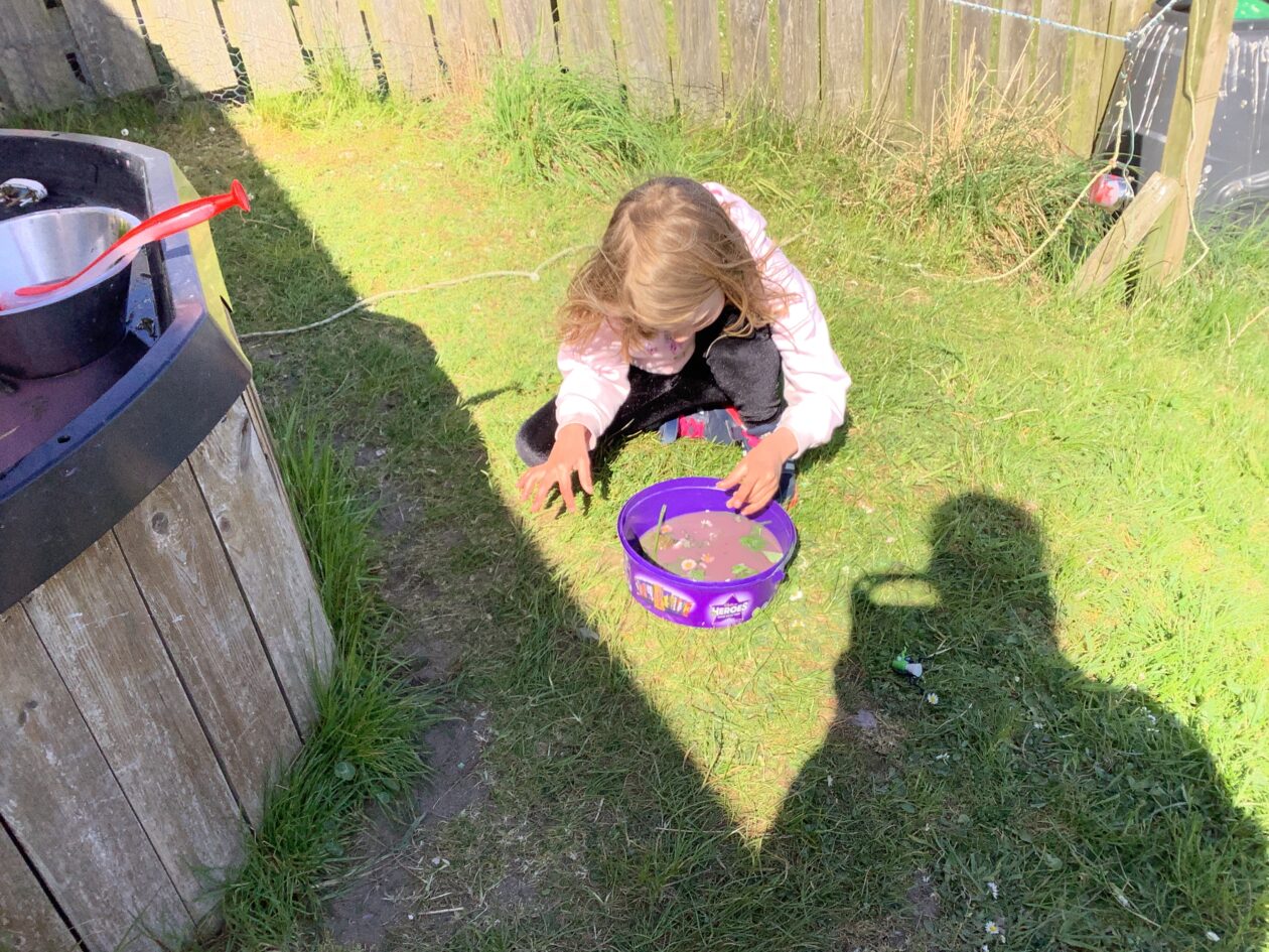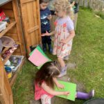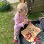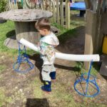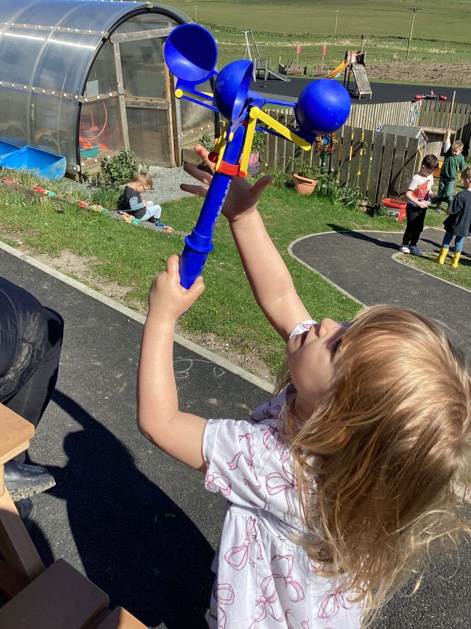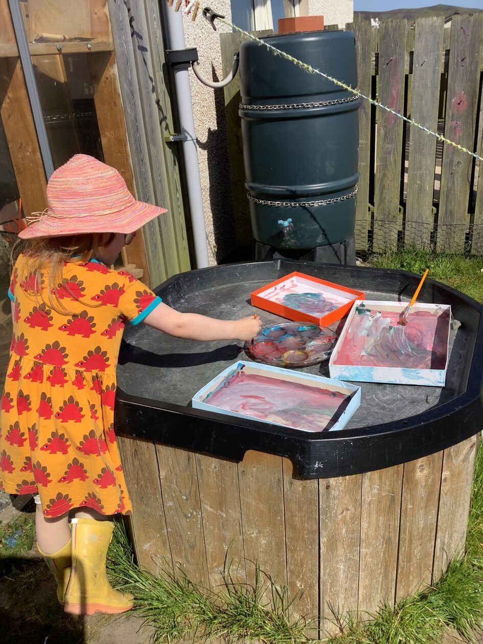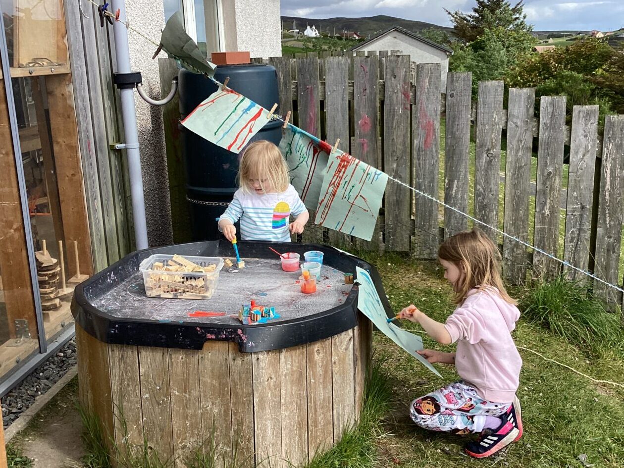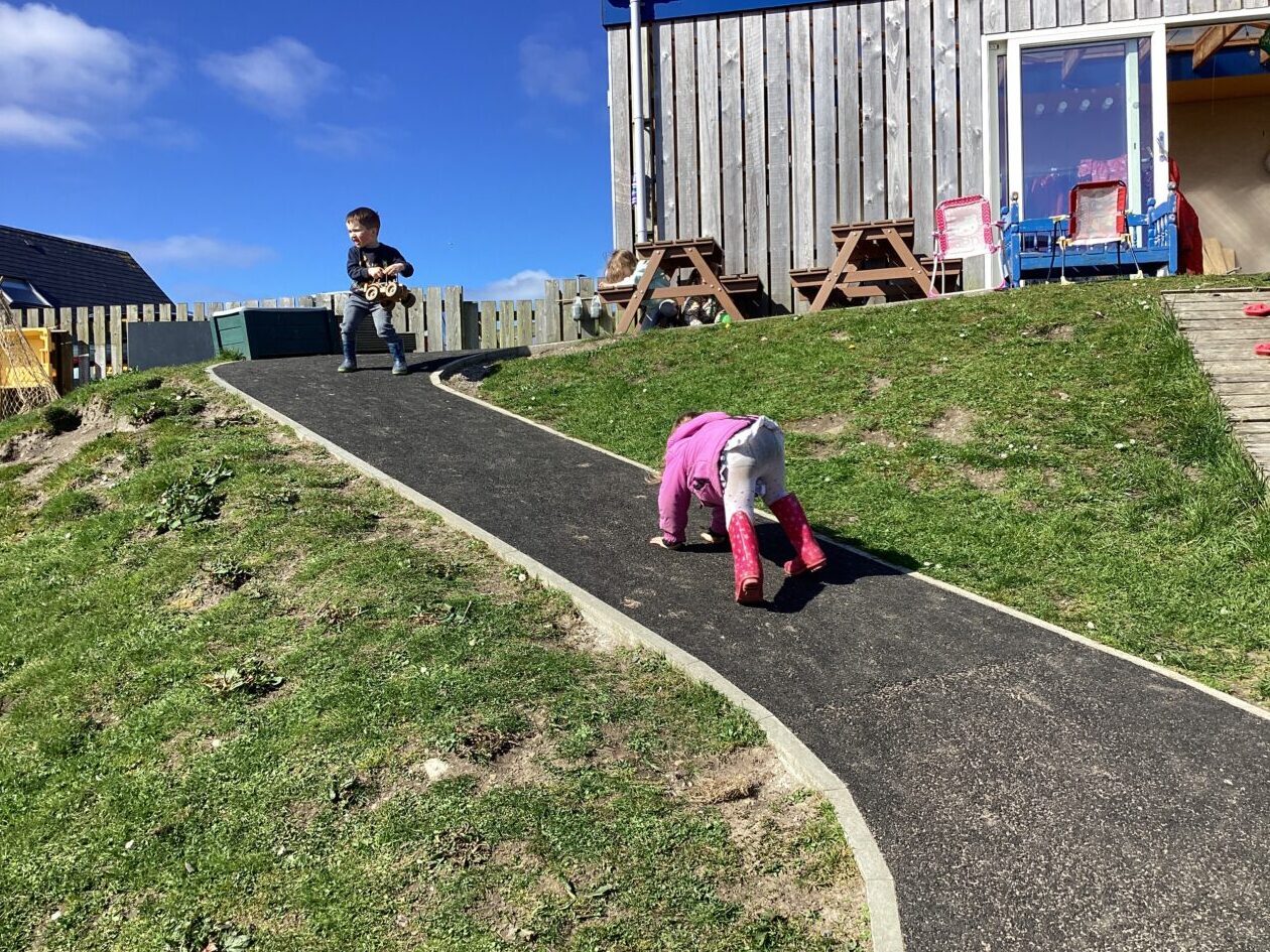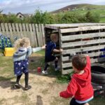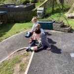 The bairns have been experimenting with different ways to slide down the steep hill in the garden. They have used cardboard, cushions, carpet tiles and slithery breeks! We have also seen lots of engagement with water play and managed to get the solar fountain working as the sun made a bit of a reappearance. We headed to the playpark one afternoon too and the bairns played chasing games, spun on the swings, tried to walk up the slide and got wobbly as jelly on a plate.