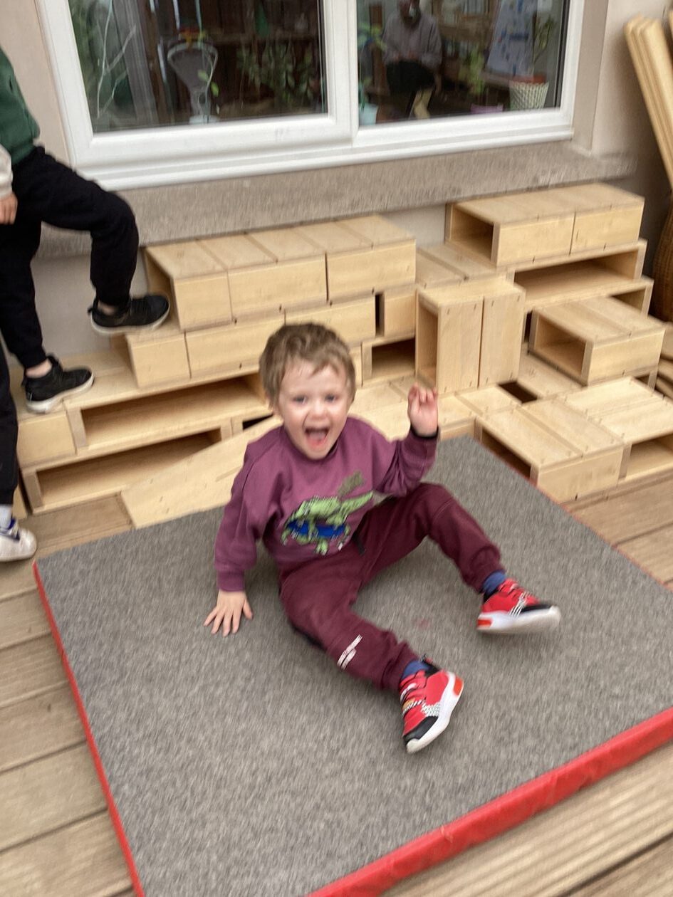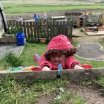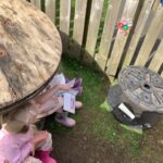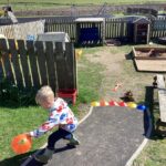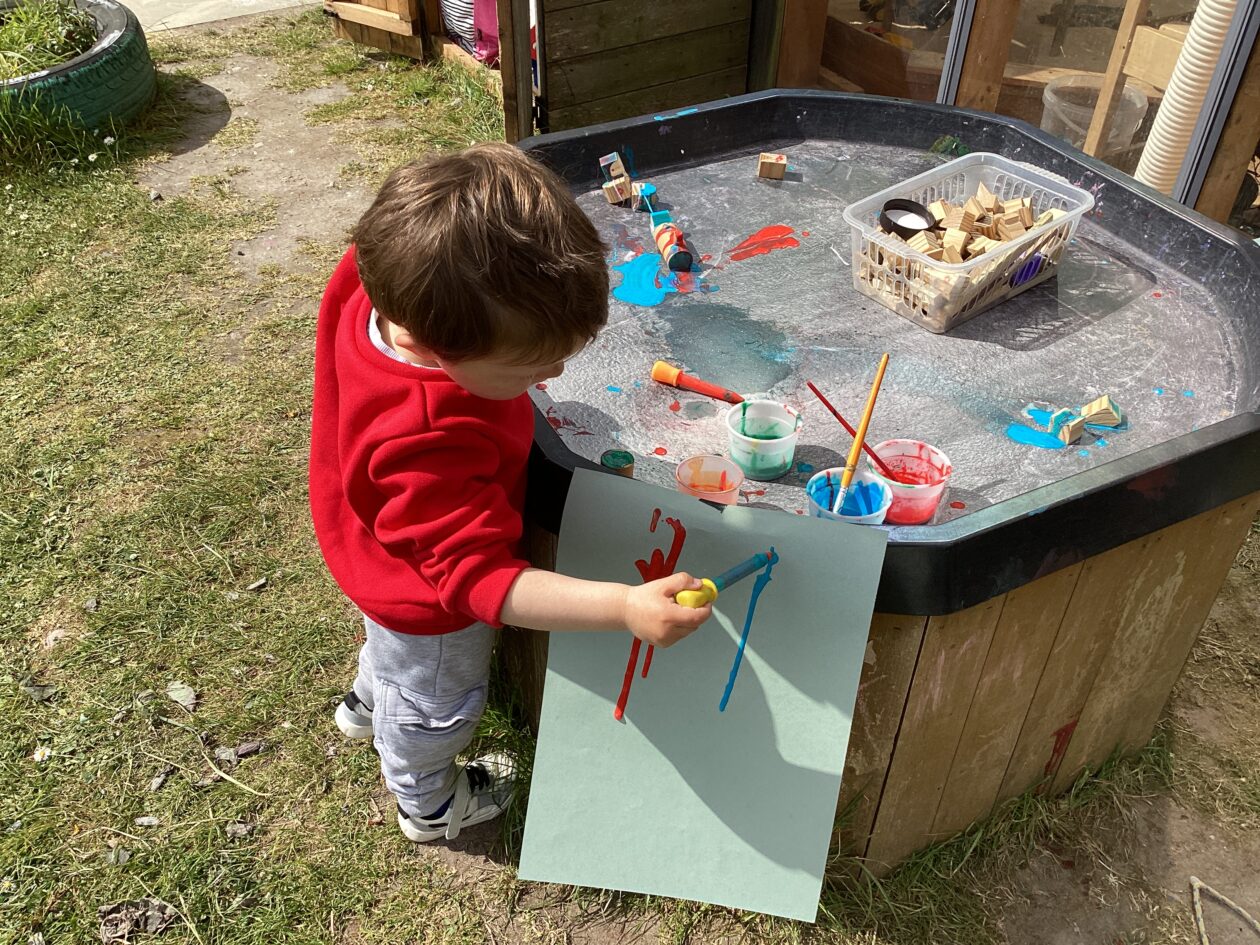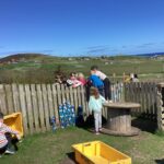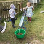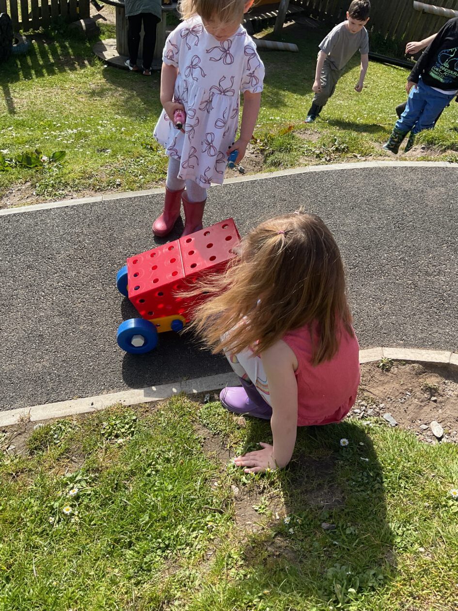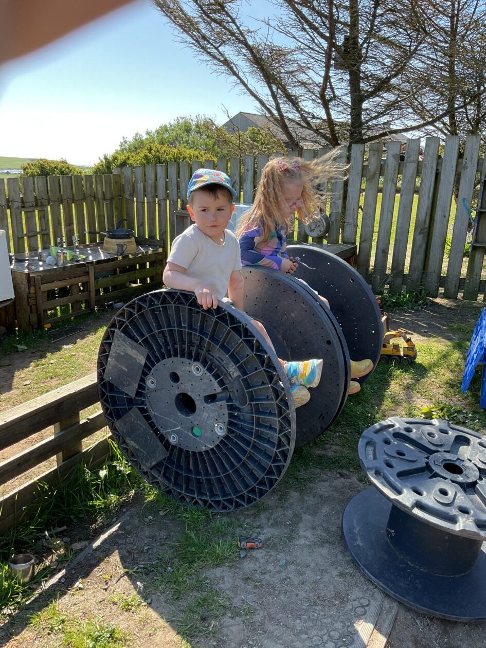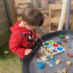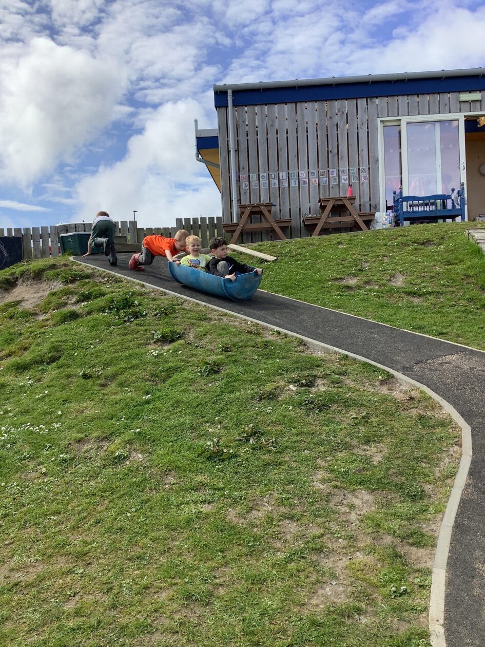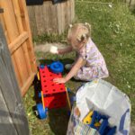 The bairns have been experimenting with different ways to slide down the steep hill in the garden. They have used cardboard, cushions, carpet tiles and slithery breeks! We have also seen lots of engagement with water play and managed to get the solar fountain working as the sun made a bit of a reappearance. We headed to the playpark one afternoon too and the bairns played chasing games, spun on the swings, tried to walk up the slide and got wobbly as jelly on a plate.