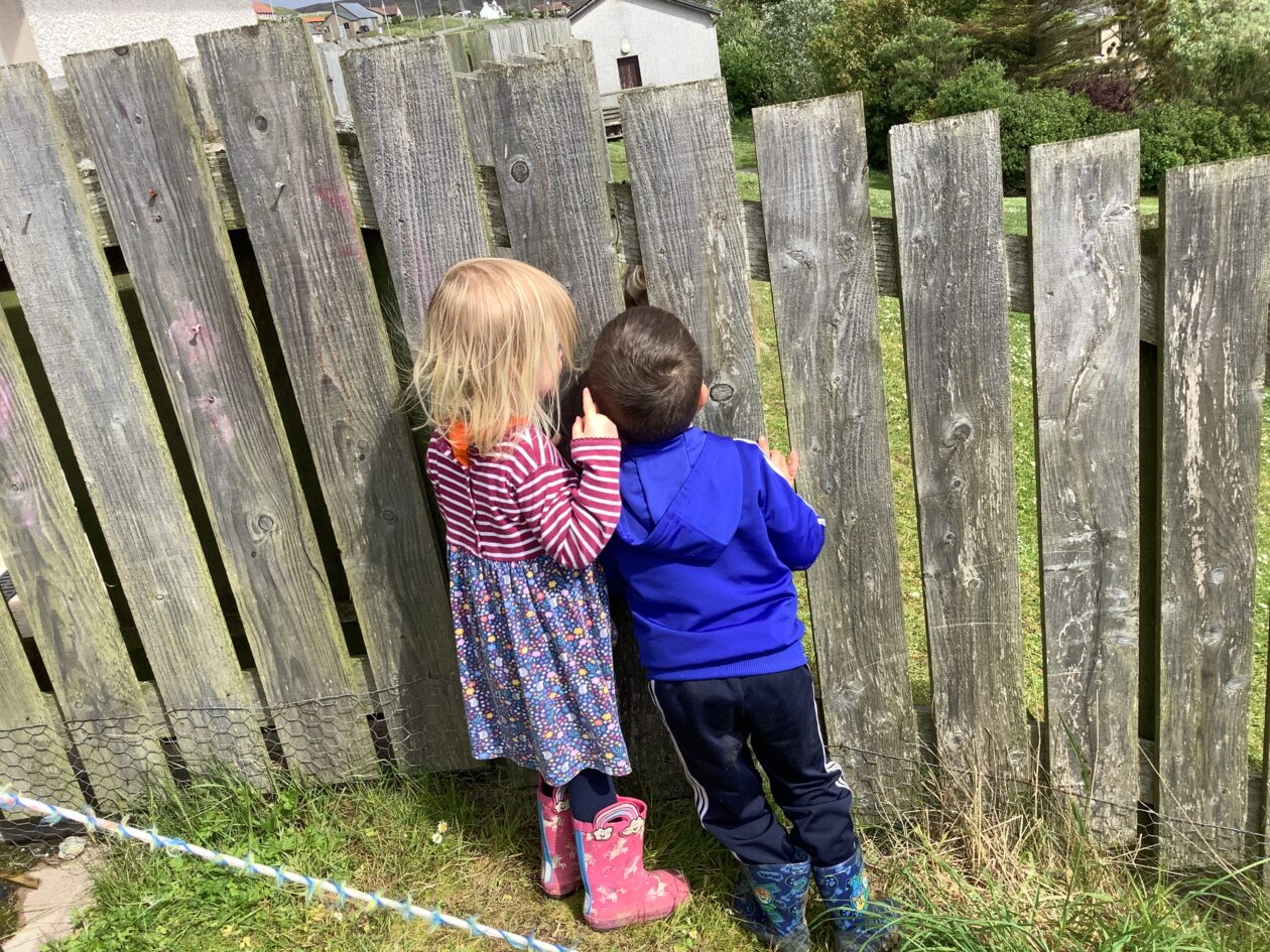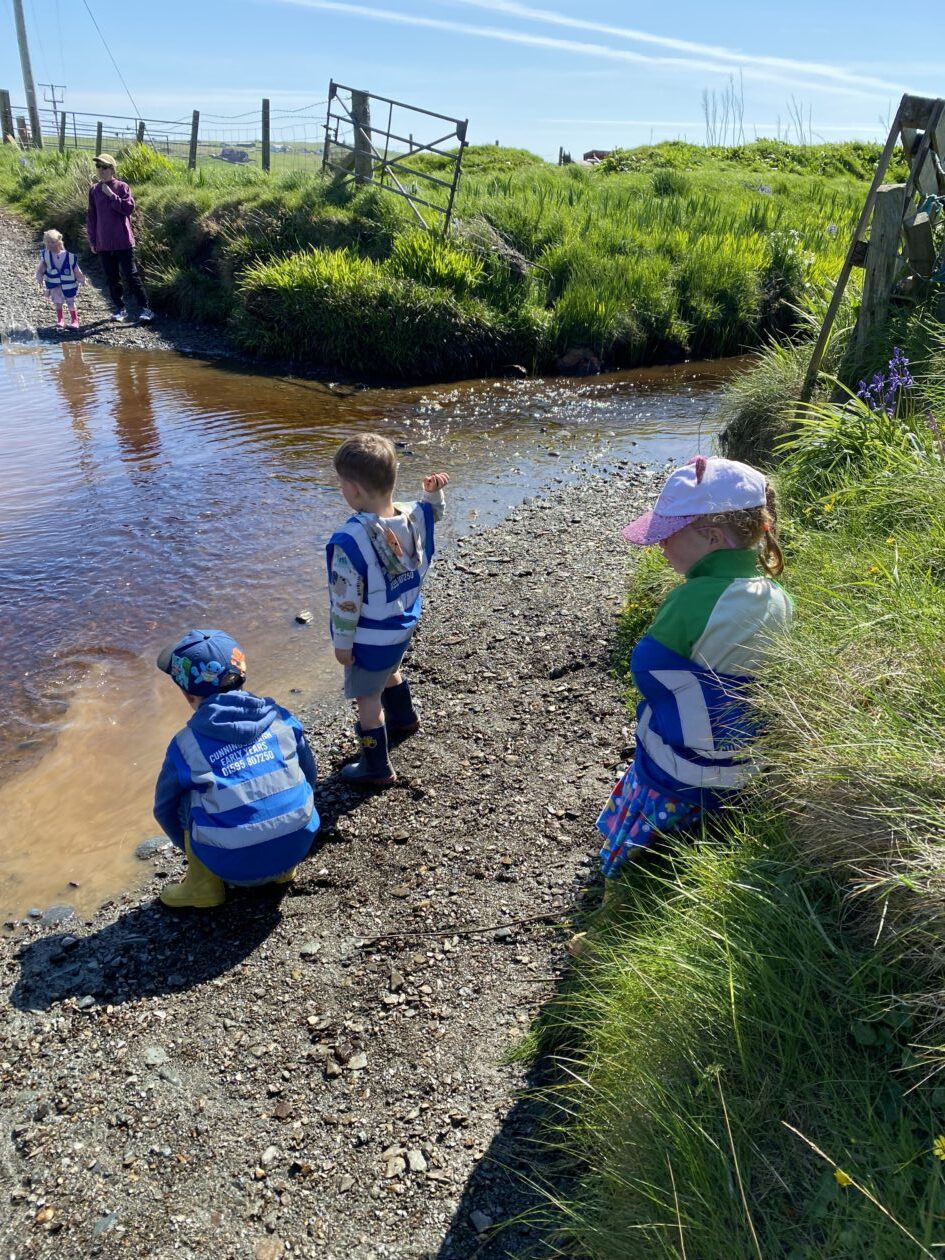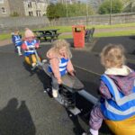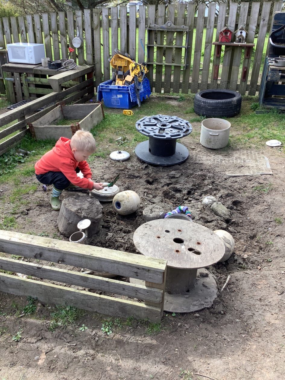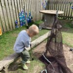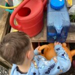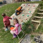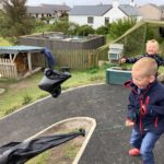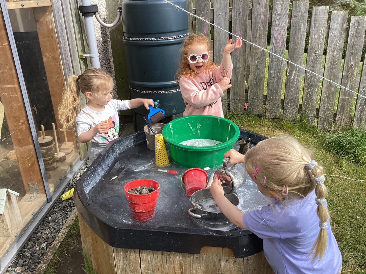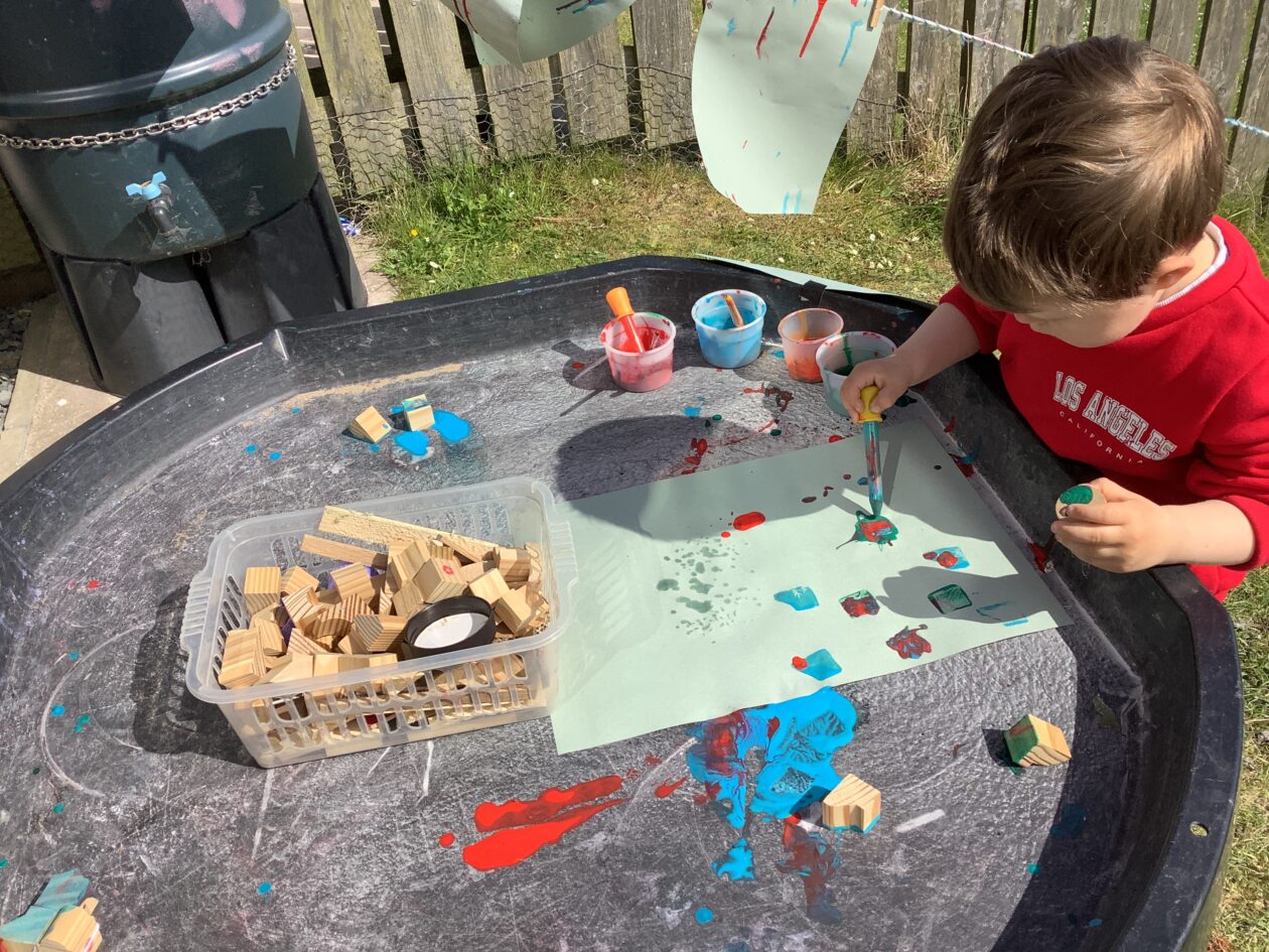The bairns have been experimenting with different ways to slide down the steep hill in the garden. They have used cardboard, cushions, carpet tiles and slithery breeks! We have also seen lots of engagement with water play and managed to get the solar fountain working as the sun made a bit of a reappearance. We headed to the playpark one afternoon too and the bairns played chasing games, spun on the swings, tried to walk up the slide and got wobbly as jelly on a plate.