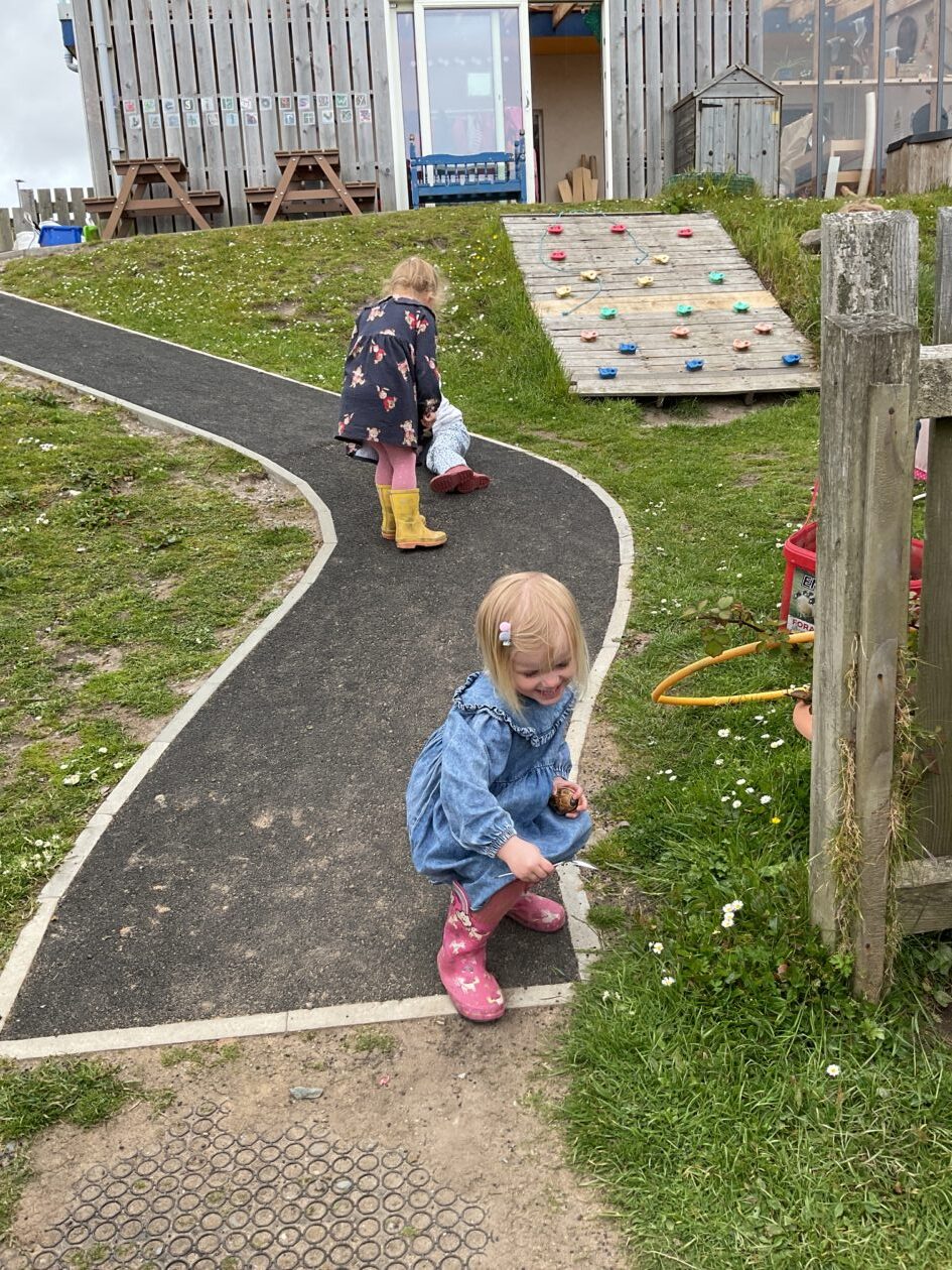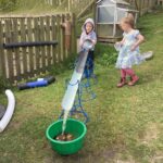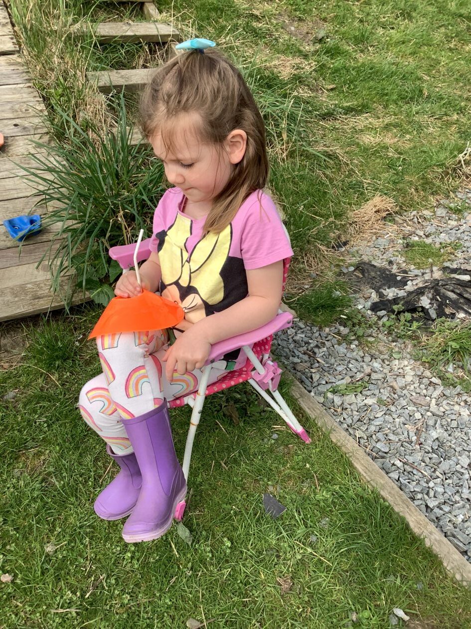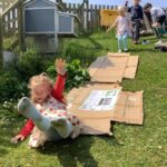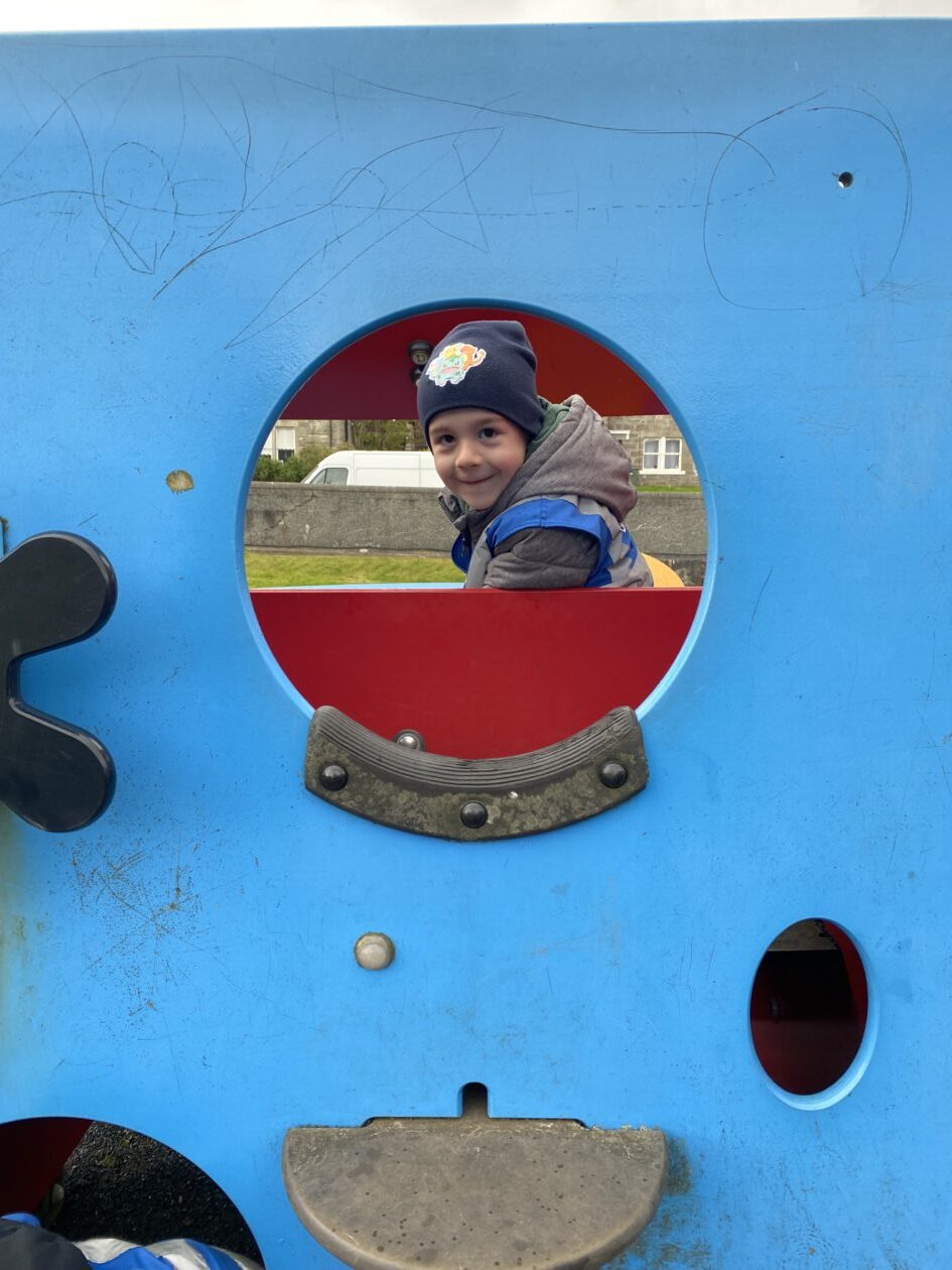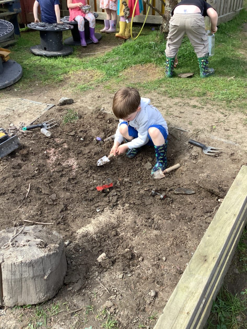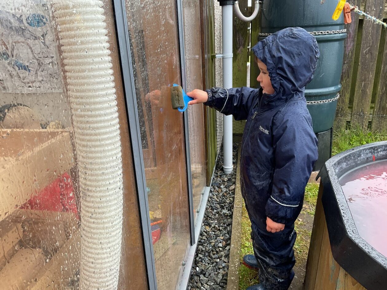 The bairns have been experimenting with different ways to slide down the steep hill in the garden. They have used cardboard, cushions, carpet tiles and slithery breeks! We have also seen lots of engagement with water play and managed to get the solar fountain working as the sun made a bit of a reappearance. We headed to the playpark one afternoon too and the bairns played chasing games, spun on the swings, tried to walk up the slide and got wobbly as jelly on a plate.