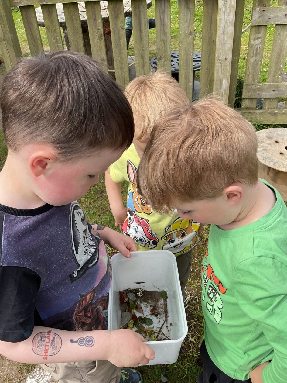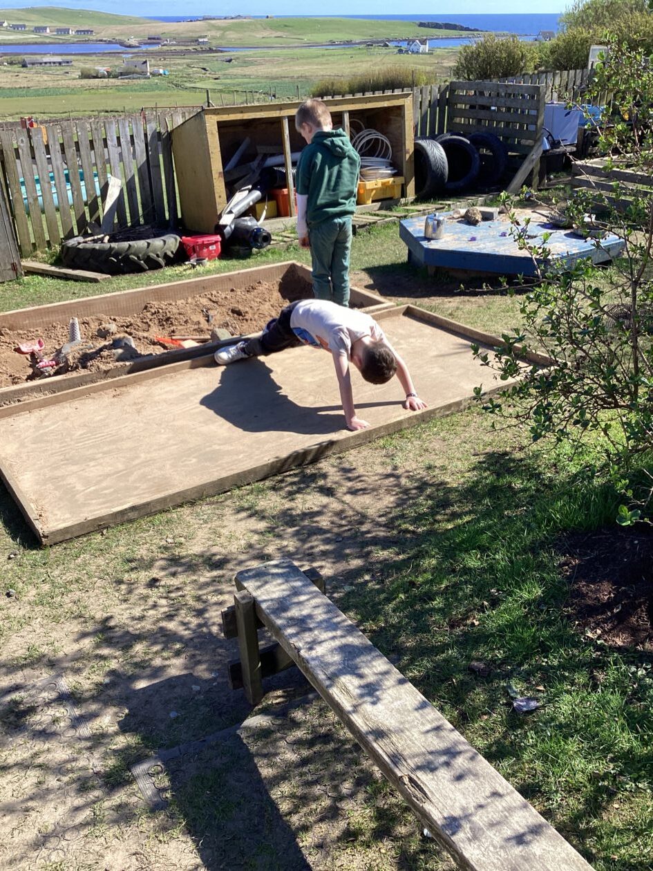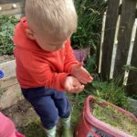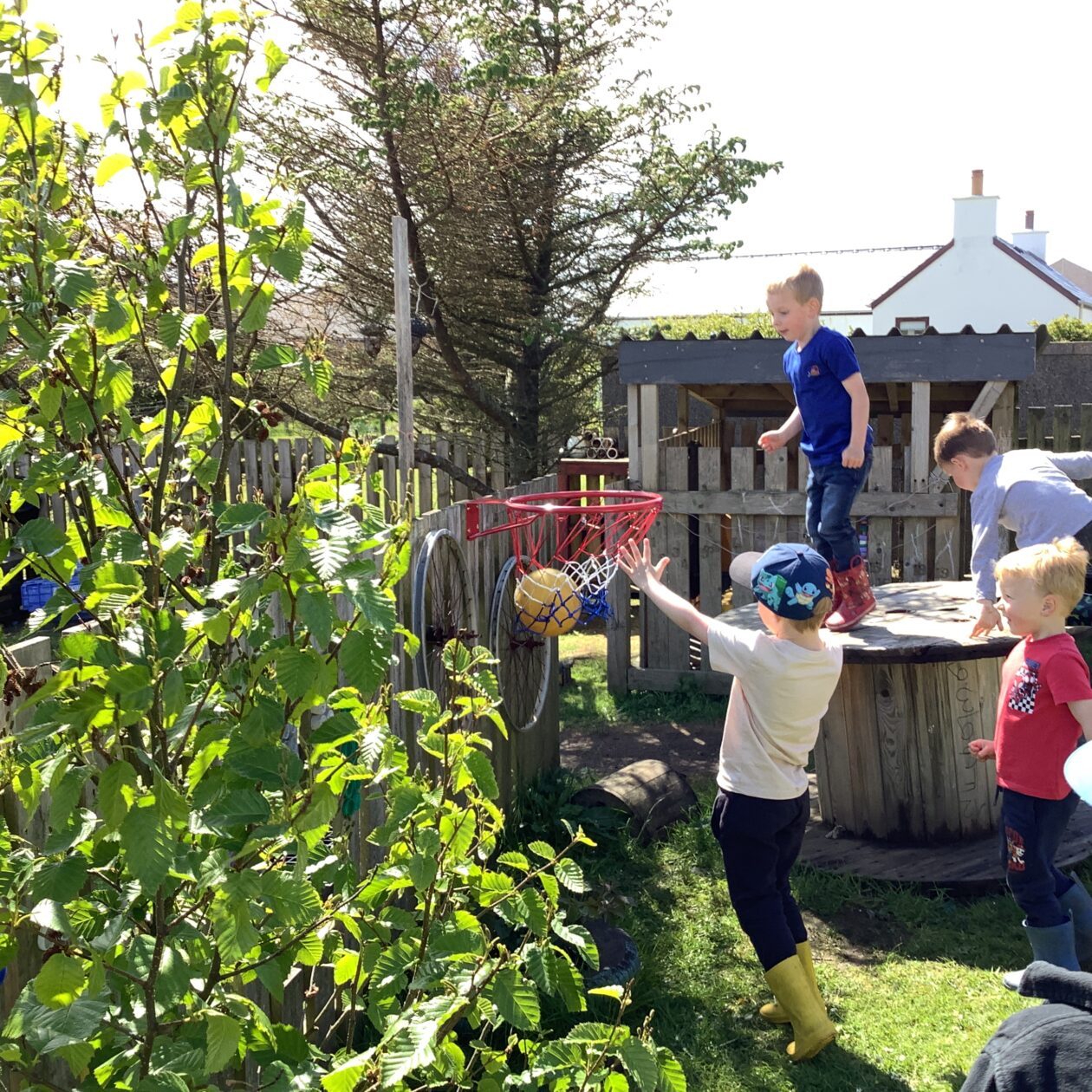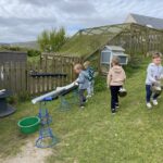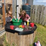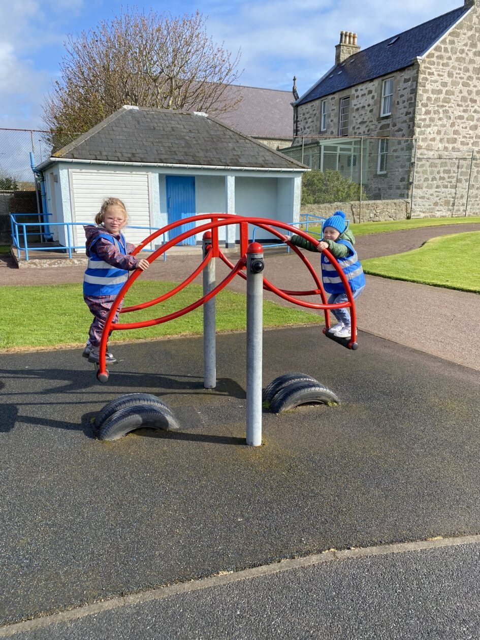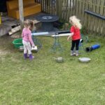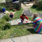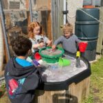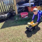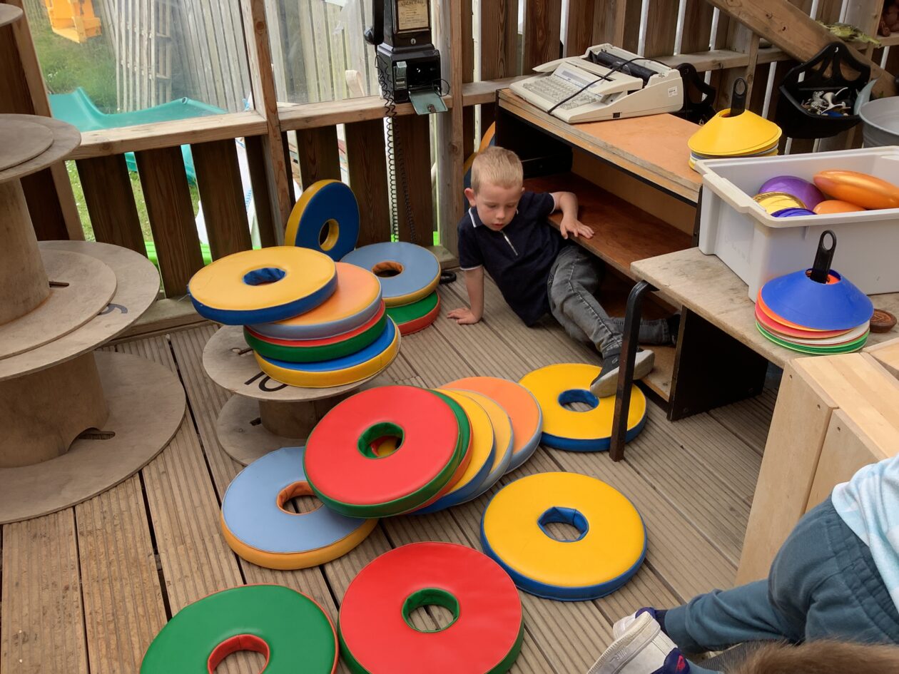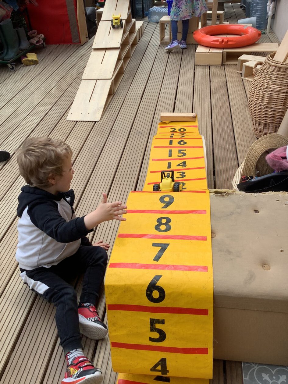 The bairns have been experimenting with different ways to slide down the steep hill in the garden. They have used cardboard, cushions, carpet tiles and slithery breeks! We have also seen lots of engagement with water play and managed to get the solar fountain working as the sun made a bit of a reappearance. We headed to the playpark one afternoon too and the bairns played chasing games, spun on the swings, tried to walk up the slide and got wobbly as jelly on a plate.