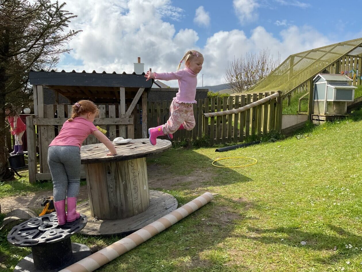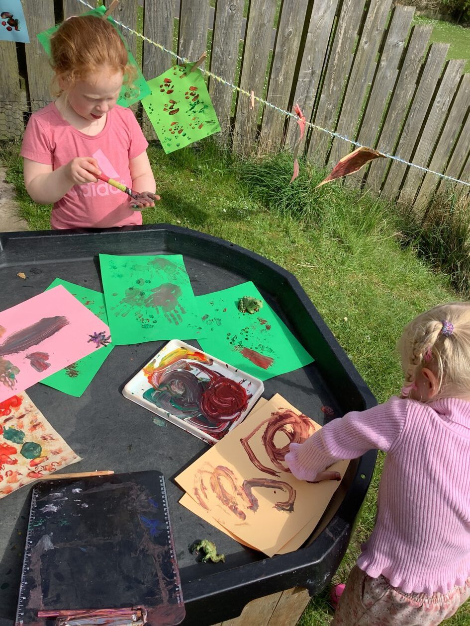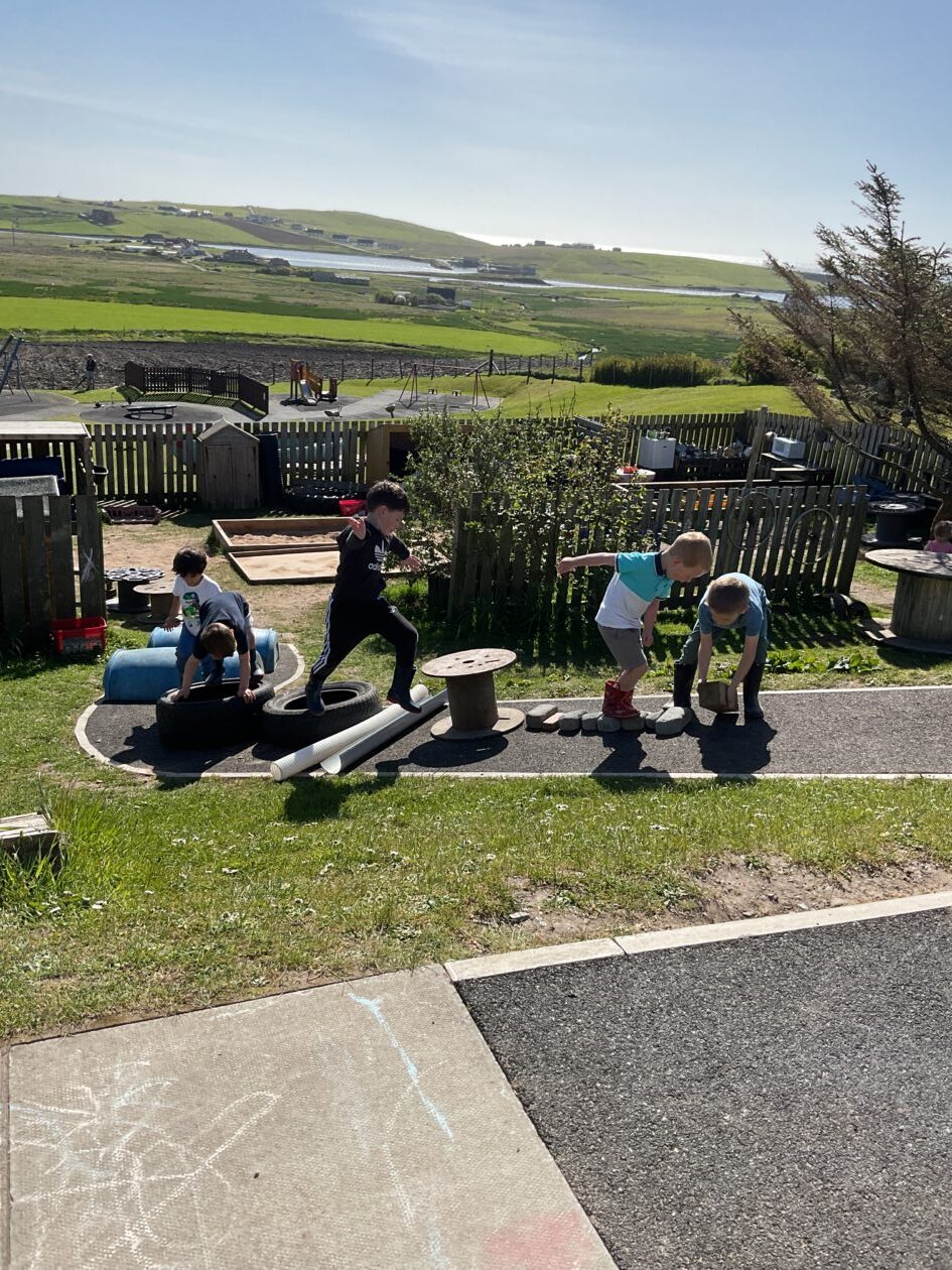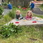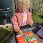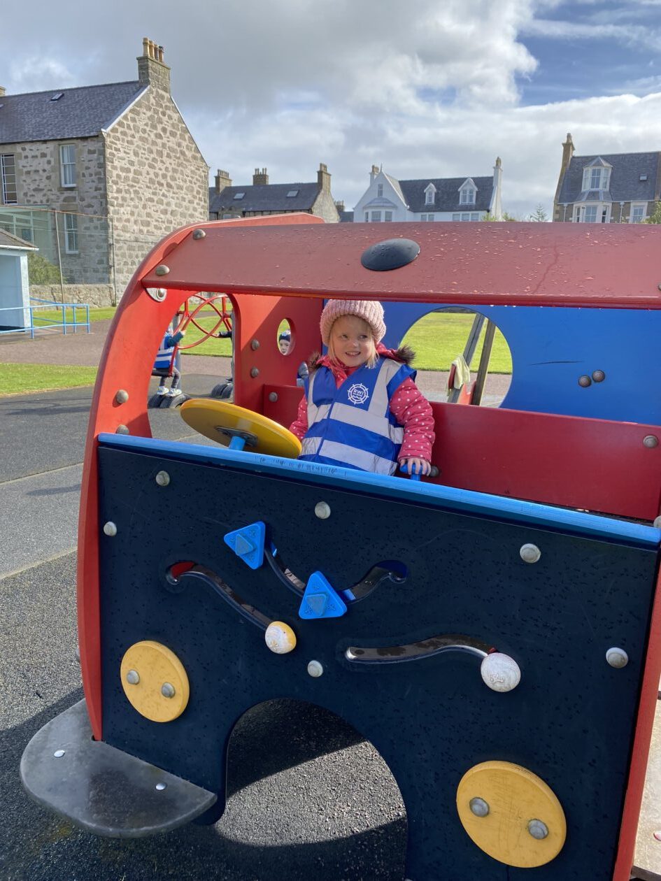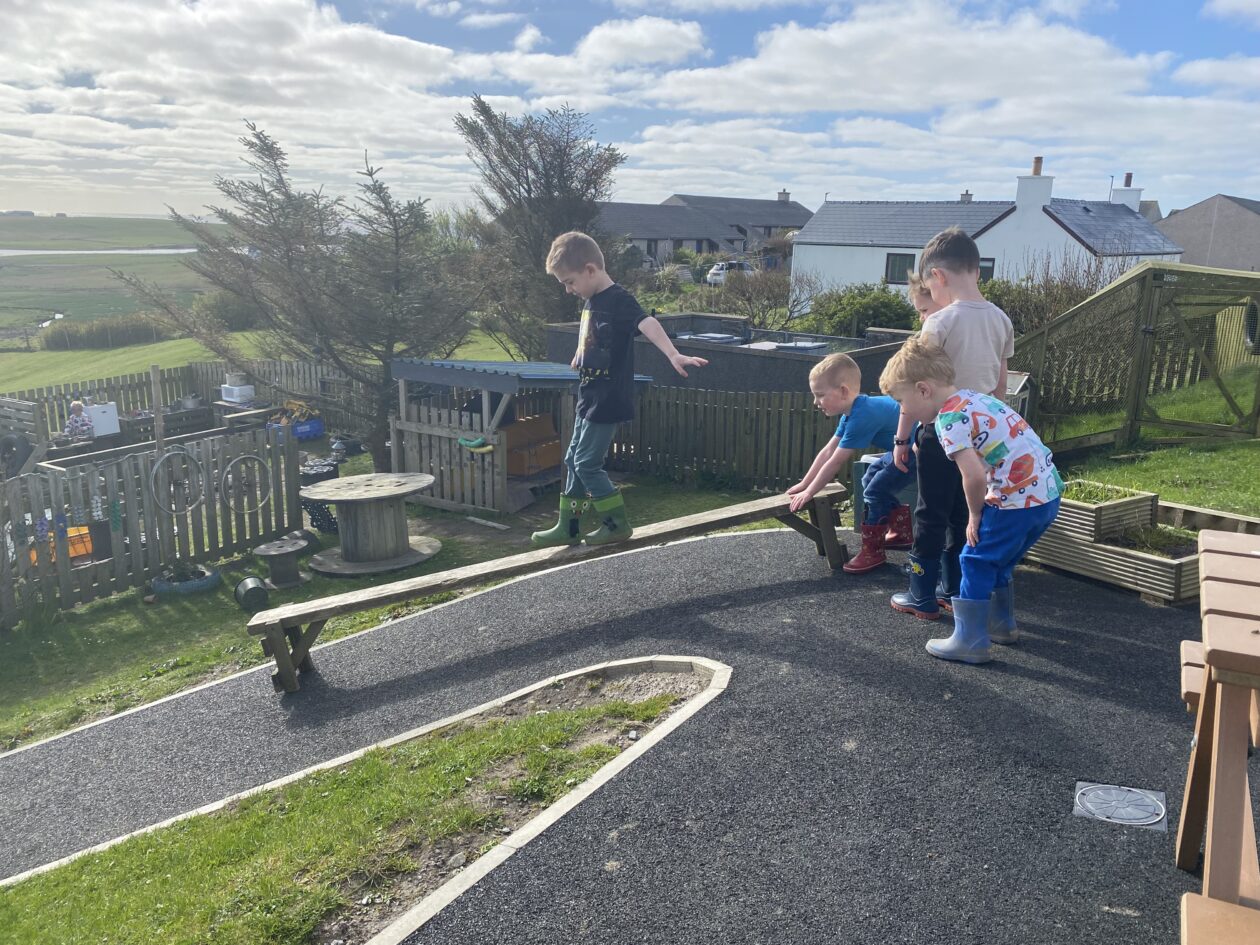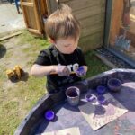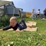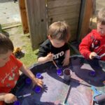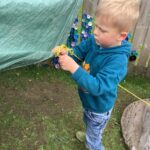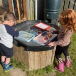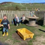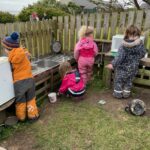 The bairns have been experimenting with different ways to slide down the steep hill in the garden. They have used cardboard, cushions, carpet tiles and slithery breeks! We have also seen lots of engagement with water play and managed to get the solar fountain working as the sun made a bit of a reappearance. We headed to the playpark one afternoon too and the bairns played chasing games, spun on the swings, tried to walk up the slide and got wobbly as jelly on a plate.