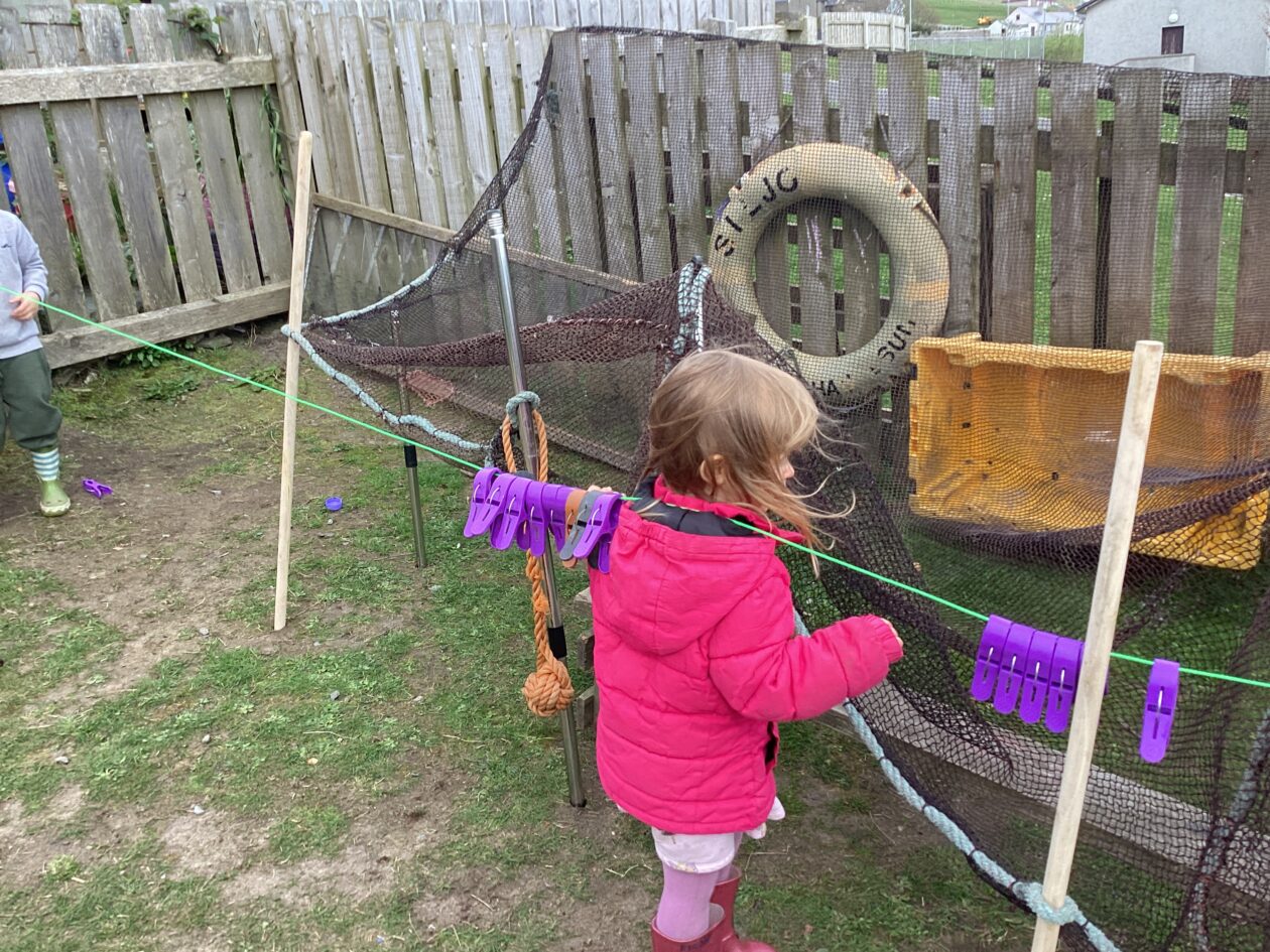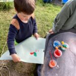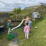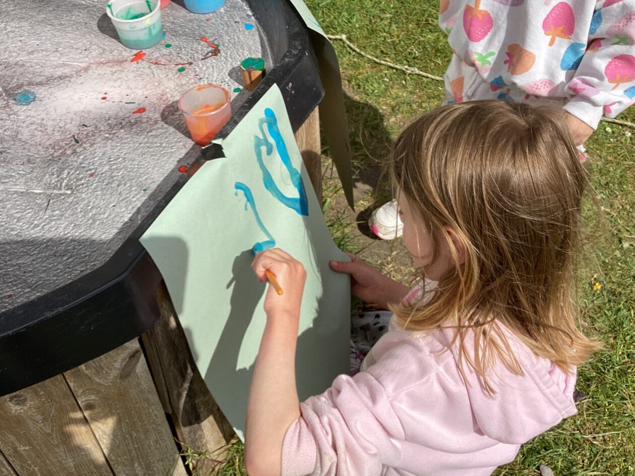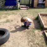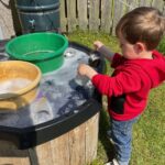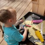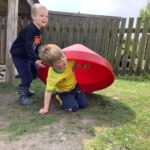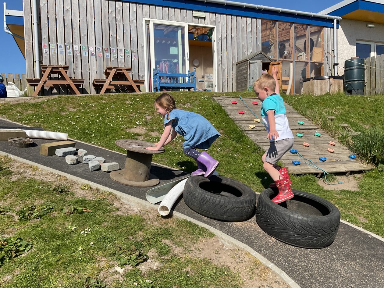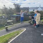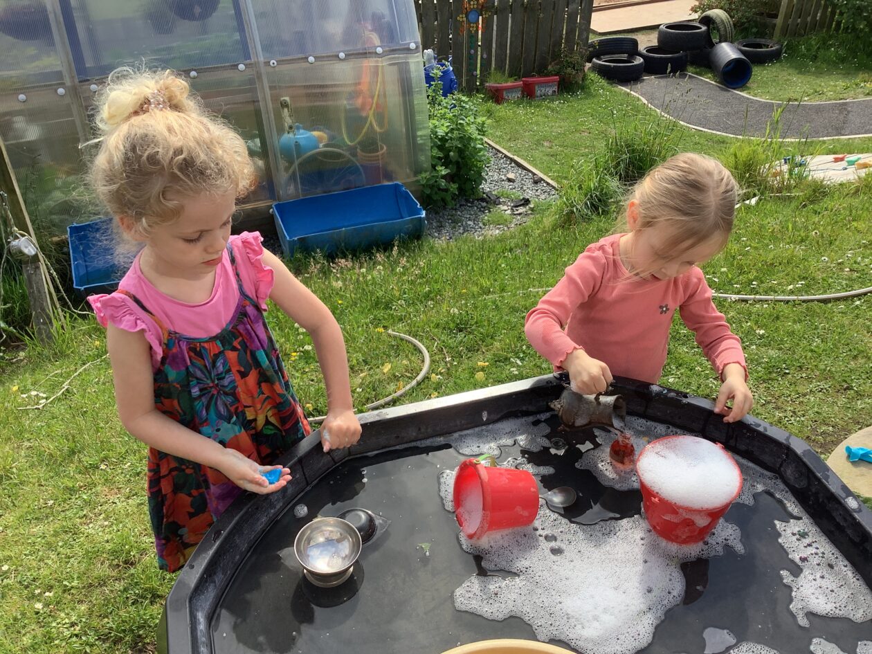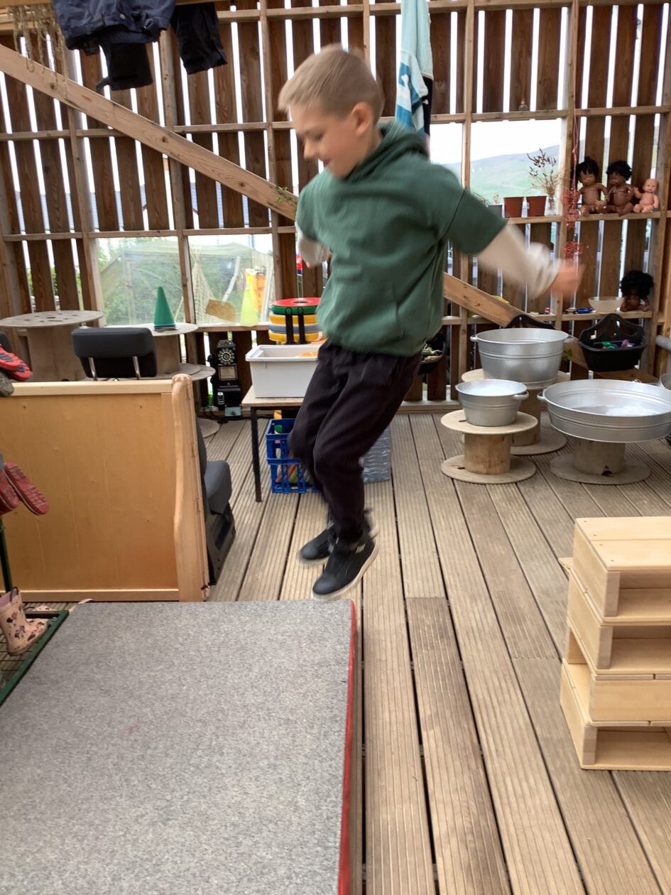 The bairns have been experimenting with different ways to slide down the steep hill in the garden. They have used cardboard, cushions, carpet tiles and slithery breeks! We have also seen lots of engagement with water play and managed to get the solar fountain working as the sun made a bit of a reappearance. We headed to the playpark one afternoon too and the bairns played chasing games, spun on the swings, tried to walk up the slide and got wobbly as jelly on a plate.