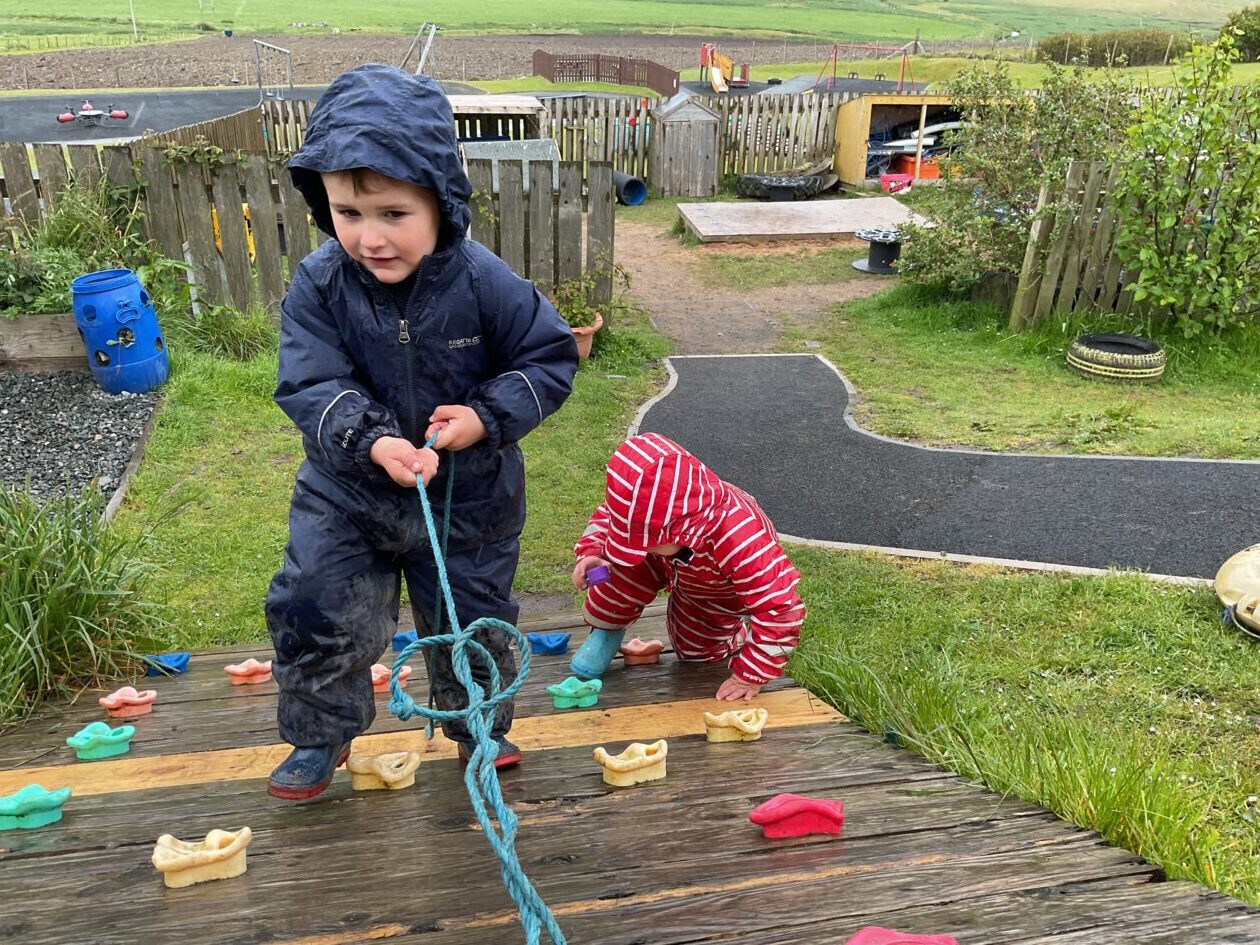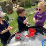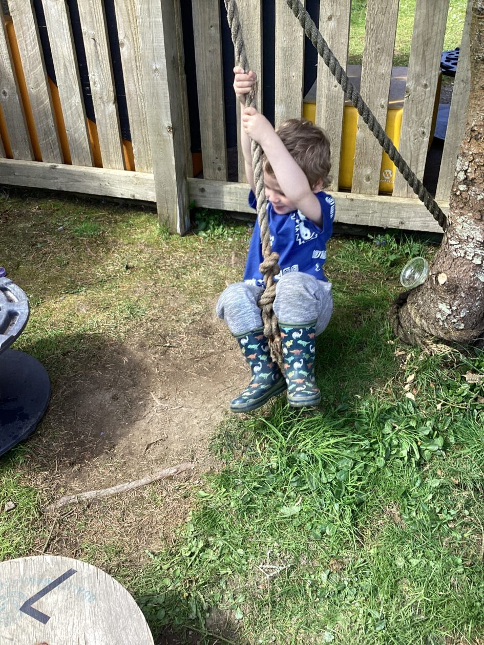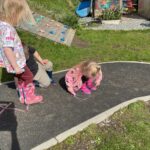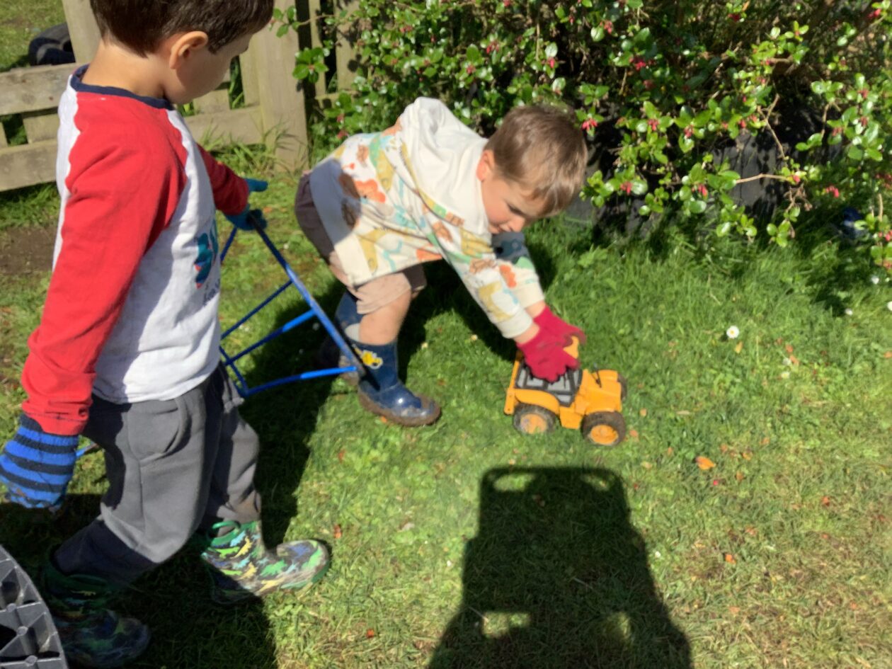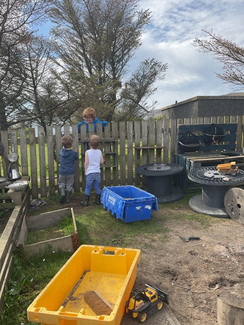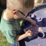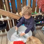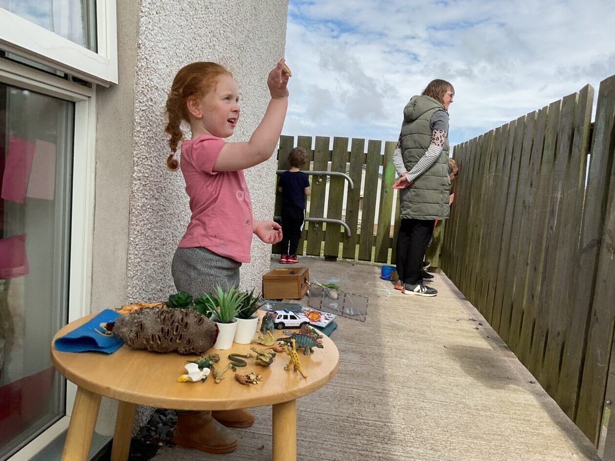 The bairns have been experimenting with different ways to slide down the steep hill in the garden. They have used cardboard, cushions, carpet tiles and slithery breeks! We have also seen lots of engagement with water play and managed to get the solar fountain working as the sun made a bit of a reappearance. We headed to the playpark one afternoon too and the bairns played chasing games, spun on the swings, tried to walk up the slide and got wobbly as jelly on a plate.